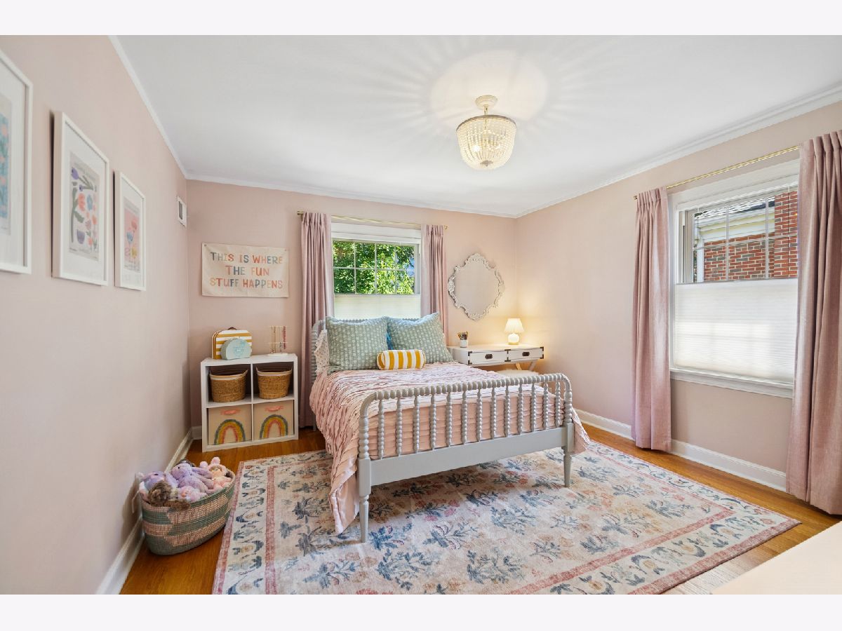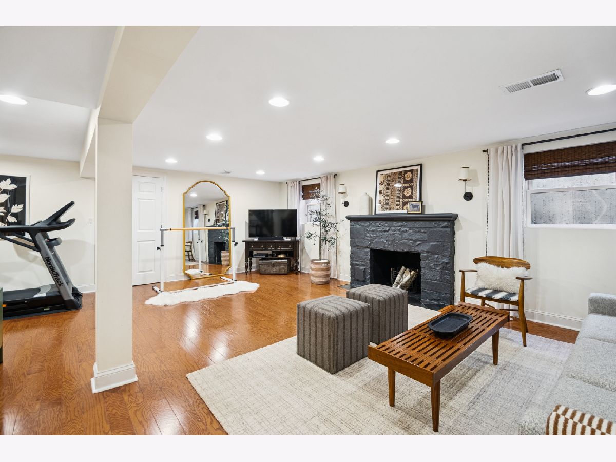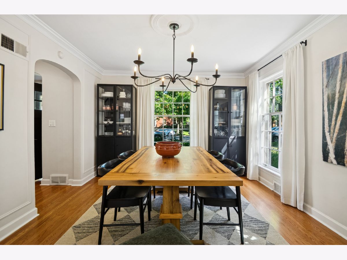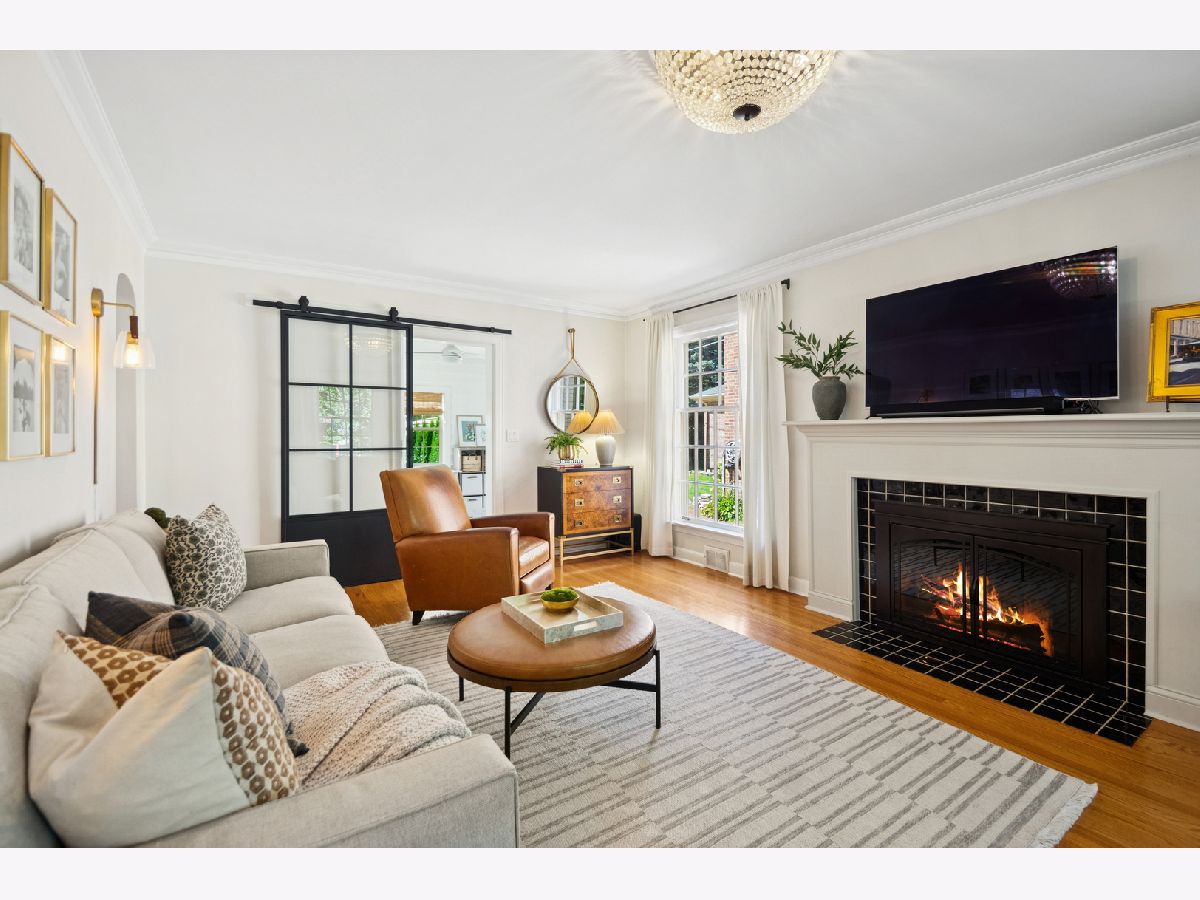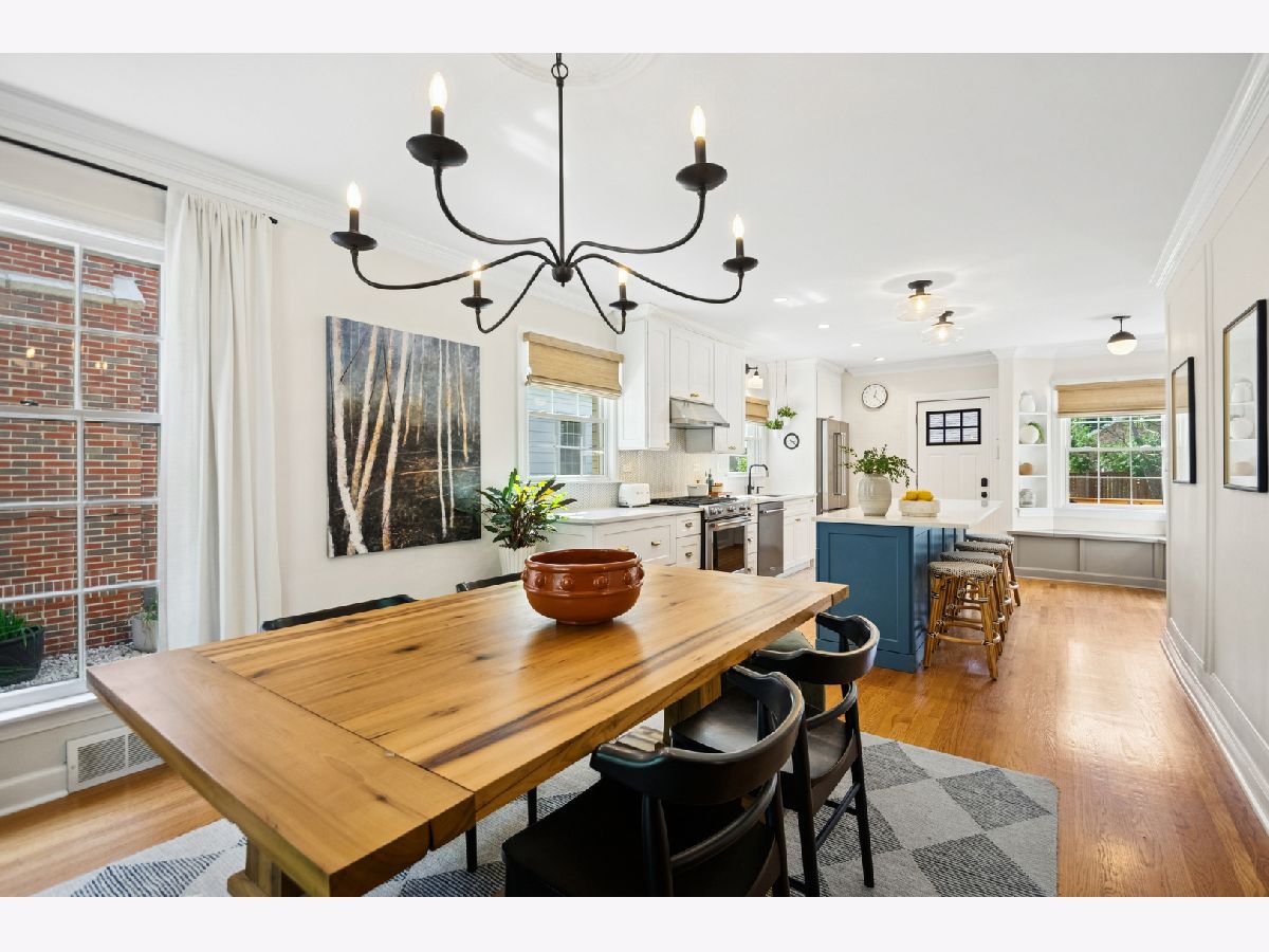 This Stately 1940s Brick Colonial tastefully combines vintage charm with a fresh and sophisticated interior for a contemporary lifestyle. The entire first floor has warm hardwood floors, oversized windows with elegant crown molding and arched doorways. The inviting LR is centered by a WB fireplace. A unique glass barn style door separates a light filled space perfect for an office. There is a large and sophisticated open concept kitchen and dining area. The kitchen has been tastefully updated and includes a unique and cozy corner seating area with views of the lovely backyard. There is also a convenient half bath on the first floor. A classic staircase takes you upstairs to the primary bedroom and 2 good sized bedrooms all light-filled from oversized windows. The beautifully updated bathroom has double sinks and a relaxing soaking tub. The finished basement has a welcoming and comfy family room, complete with a second WB fireplace and a second full bath with a walk-in shower. The oversized lot has large grassy area and brick paver patio with italian lights for outdoor entertaining plus a new 2-car garage. Recent updates: 2025 New 2-car garage, new basement ejector pump, 2024 Fireplace flue and firebox repaired & relined, 2022 New energy efficient furnace and humidifier installed, 2021 perimeter cedar fence installed, 2018 full kitchen remodel and expansion, touch screen, whole house security system installed, 2014 updated main floor half-bath. Fabulous location on a tree-lined street, just walking distance to everything Edgebrook, including the Edgebrook School, Metra, shops, and restaurants with easy access to 90/94, downtown and O'Hare. Stunning home in the heart of Edgebrook.