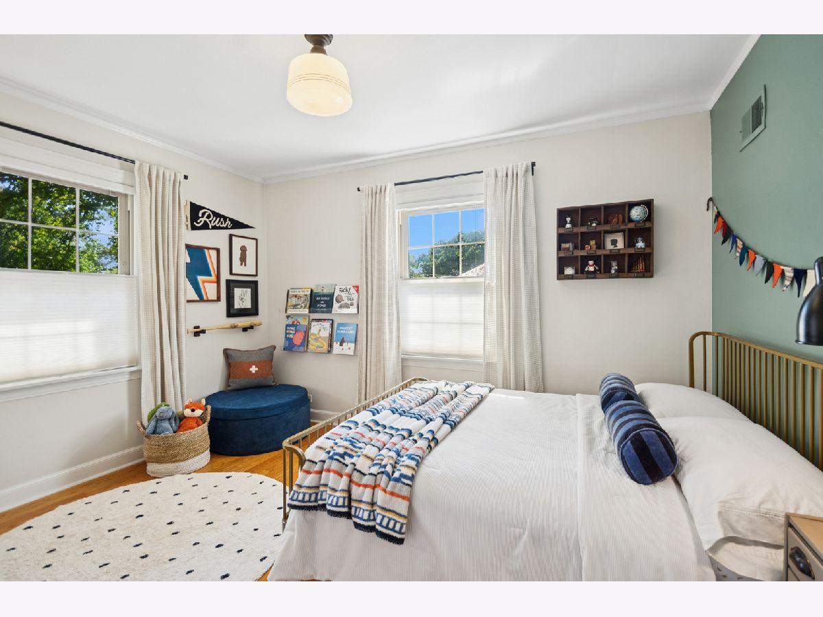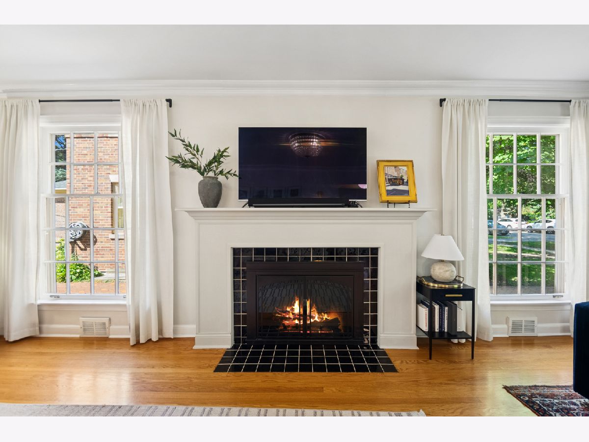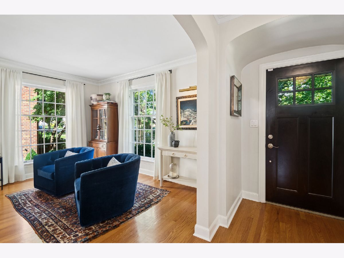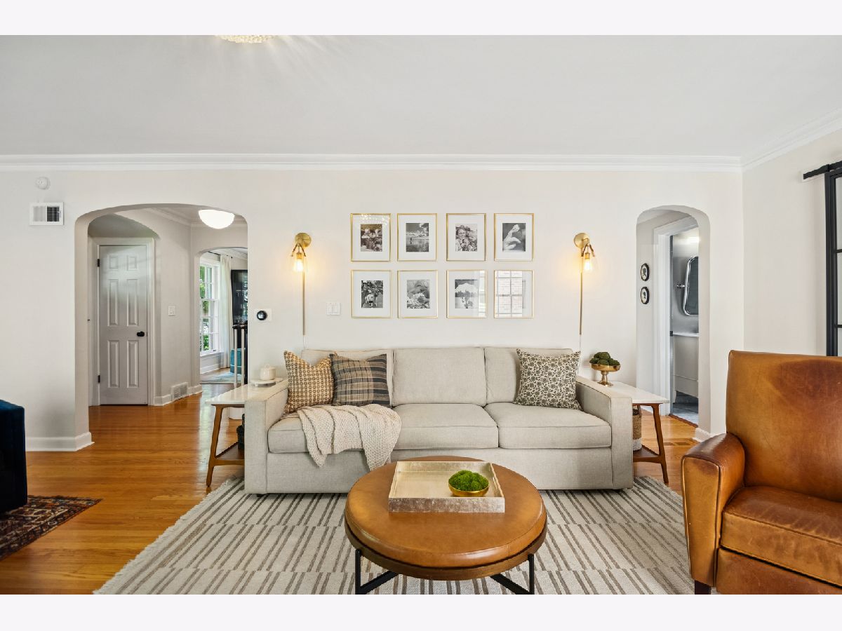 This Stately 1940s Brick Colonial tastefully combines vintage charm with a fresh and sophisticated interior for a contemporary lifestyle. The entire first floor has warm hardwood floors, oversized windows with elegant crown molding and arched doorways. The inviting LR is centered by a WB fireplace. A unique glass barn style door separates a light filled space perfect for an office. There is a large and sophisticated open concept kitchen and dining area. The kitchen has been tastefully updated and includes a unique and cozy corner seating area with views of the lovely backyard. There is also a convenient half bath on the first floor. A classic staircase takes you upstairs to the primary bedroom and 2 good sized bedrooms all light-filled from oversized windows. The beautifully updated bathroom has double sinks and a relaxing soaking tub. The finished basement has a welcoming and comfy family room, complete with a second WB fireplace and a second full bath with a walk-in shower. The oversized lot has large grassy area and brick paver patio with italian lights for outdoor entertaining plus a new 2-car garage. Recent updates: 2025 New 2-car garage, new basement ejector pump, 2024 Fireplace flue and firebox repaired & relined, 2022 New energy efficient furnace and humidifier installed, 2021 perimeter cedar fence installed, 2018 full kitchen remodel and expansion, touch screen, whole house security system installed, 2014 updated main floor half-bath. Fabulous location on a tree-lined street, just walking distance to everything Edgebrook, including the Edgebrook School, Metra, shops, and restaurants with easy access to 90/94, downtown and O'Hare. Stunning home in the heart of Edgebrook.
