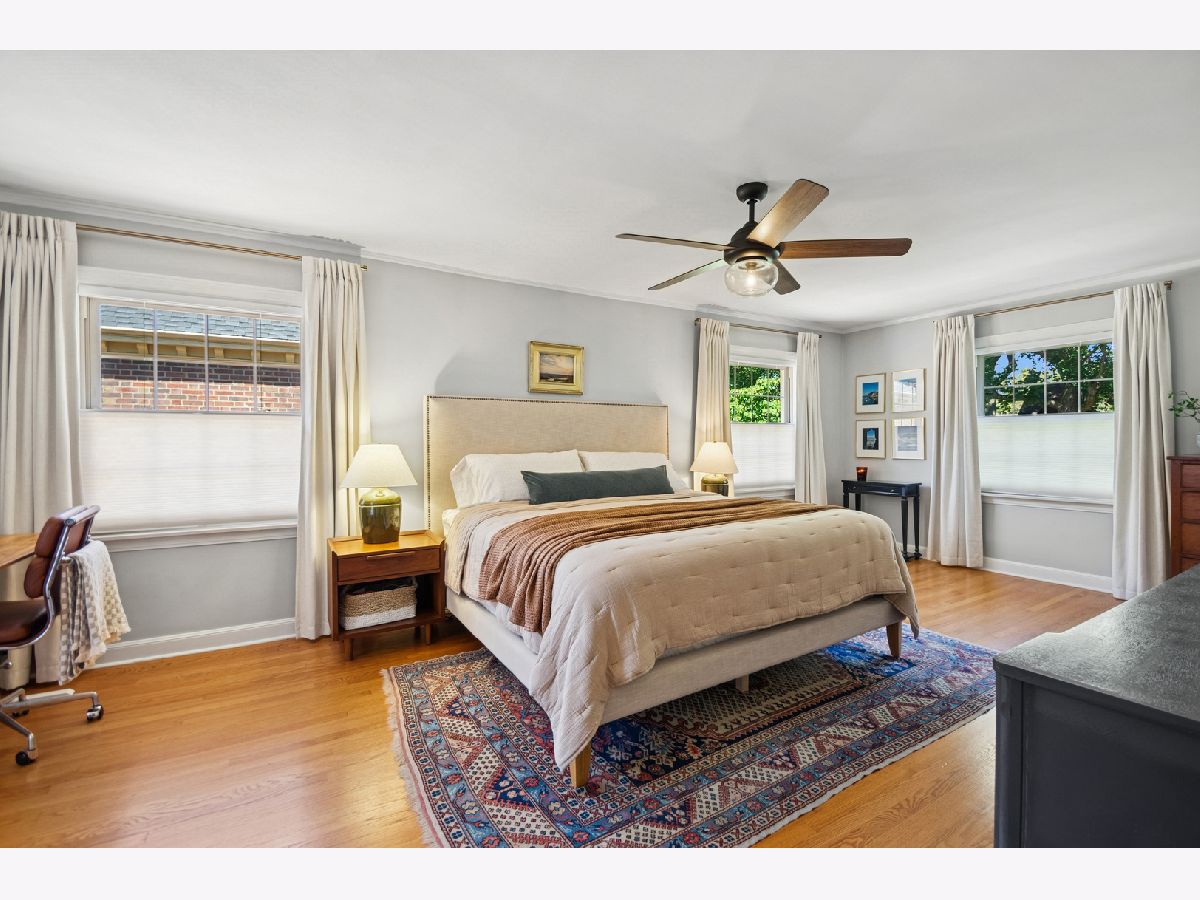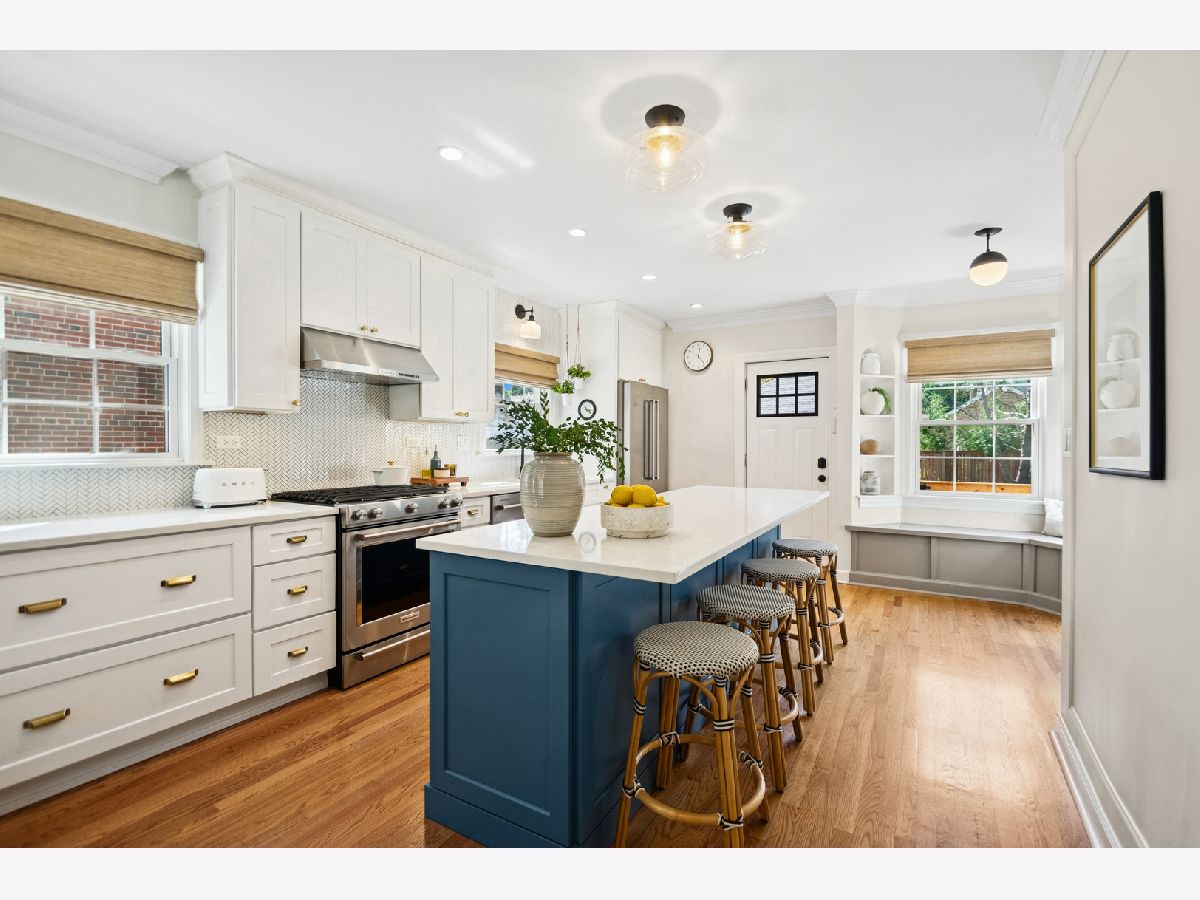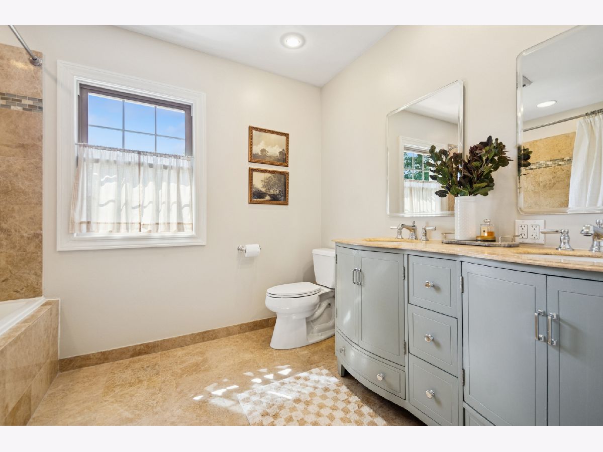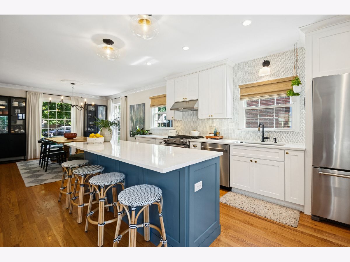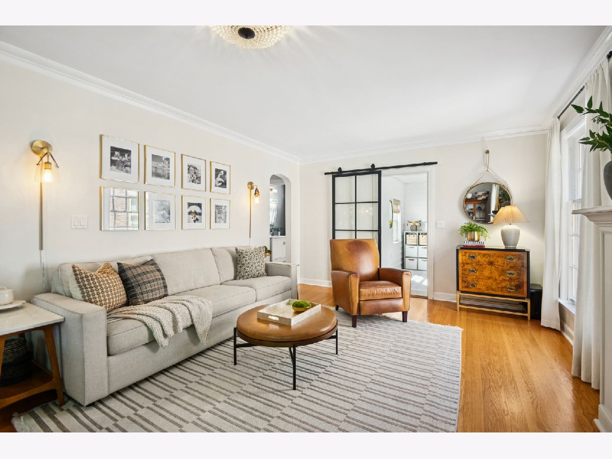 This Stately 1940s Brick Colonial tastefully combines vintage charm with a fresh and sophisticated interior for a contemporary lifestyle. The entire first floor has warm hardwood floors, oversized windows with elegant crown molding and arched doorways. The inviting LR is centered by a WB fireplace. A unique glass barn style door separates a light filled space perfect for an office. There is a large and sophisticated open concept kitchen and dining area. The kitchen has been tastefully updated and includes a unique and cozy corner seating area with views of the lovely backyard. There is also a convenient half bath on the first floor. A classic staircase takes you upstairs to the primary bedroom and 2 good sized bedrooms all light-filled from oversized windows. The beautifully updated bathroom has double sinks and a relaxing soaking tub. The finished basement has a welcoming and comfy family room, complete with a second WB fireplace and a second full bath with a walk-in shower. The oversized lot has large grassy area and brick paver patio with italian lights for outdoor entertaining plus a new 2-car garage. Recent updates: 2025 New 2-car garage, new basement ejector pump, 2024 Fireplace flue and firebox repaired & relined, 2022 New energy efficient furnace and humidifier installed, 2021 perimeter cedar fence installed, 2018 full kitchen remodel and expansion, touch screen, whole house security system installed, 2014 updated main floor half-bath. Fabulous location on a tree-lined street, just walking distance to everything Edgebrook, including the Edgebrook School, Metra, shops, and restaurants with easy access to 90/94, downtown and O'Hare. Stunning home in the heart of Edgebrook.