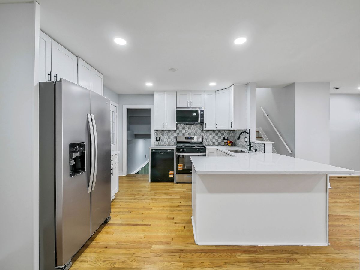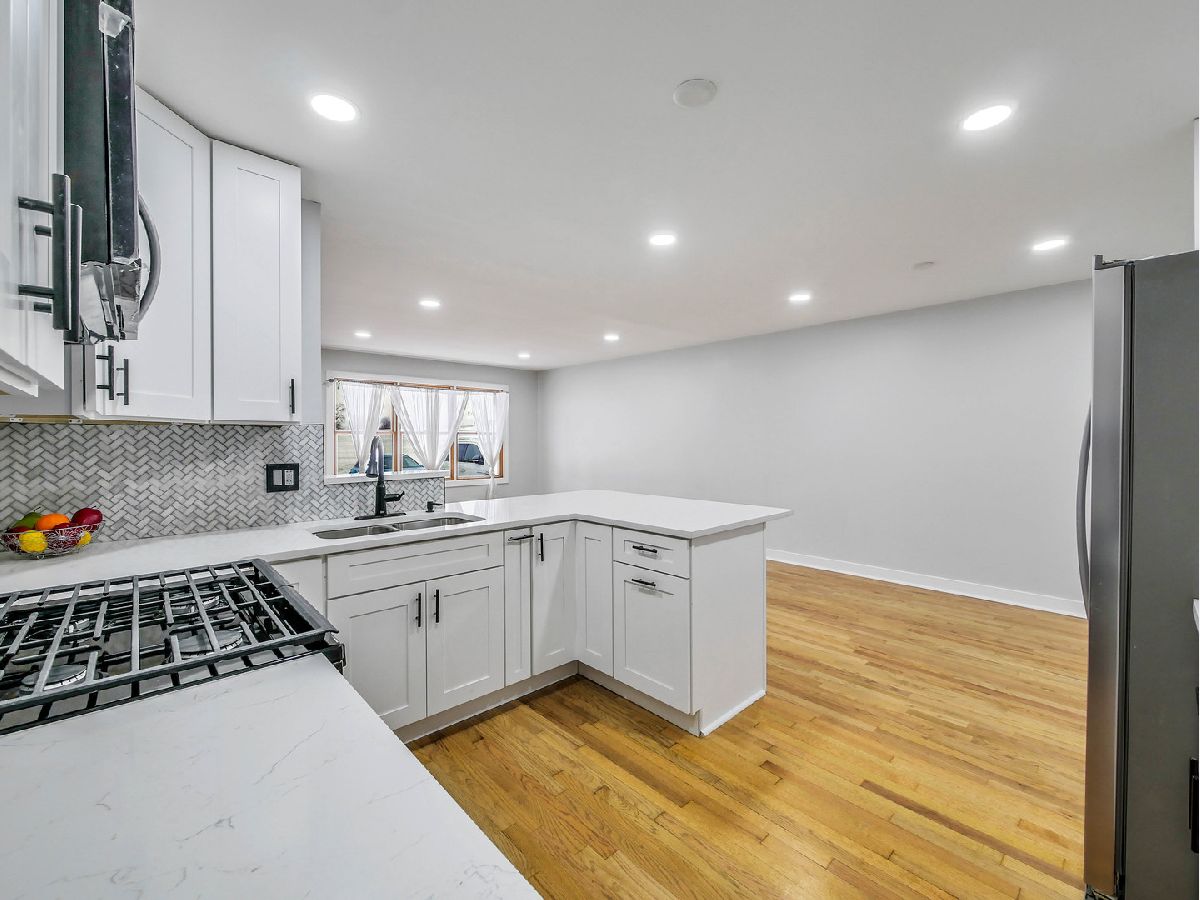 Move right in and enjoy this completely remodeled home in an excellent location directly across from the Hanover Park Recreation Center. Step into a bright, welcoming open-concept living space featuring gleaming new flooring, fresh neutral paint, and recessed ceiling lights throughout. The spacious family room flows seamlessly into the combined dining area and stunning new kitchen, equipped with white shaker-style cabinets, durable quartz countertops, stainless steel appliances, a large peninsula with seating, an undermount sink, and a stylish herringbone-pattern tile backsplash. Both bathrooms are brand new, including a dual vanity in the upstairs bath. Upstairs you'll find three generous bedrooms, with potential for a fourth bedroom in the lower level. Huge backyard with storage shed/concrete foundation. Come take a look today!