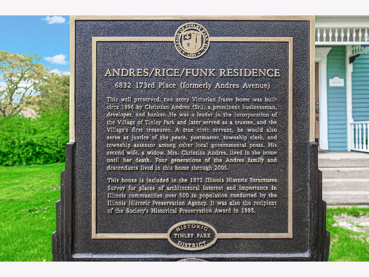 Own a piece of history in heart of downtown Tinley Park! Walk to it all from this charming and notable 4 bedroom / 2 bath home, which was built in 1896 and is recognized as a Historic Home by Tinley Park. From the quaint curb appeal to the hard-to-replicate interior detail, this rarely-available home is one of a kind. Enter through the front door into the inviting living room, which boasts hardwood floors, high ceilings and original millwork. The separate dining room and den are both full of natural light, and are generously sized for entertaining. Large eat-in kitchen boasts granite counter tops, and access to the large side porch. Main floor bedroom and full bath offer tons of options and versatility. Upstairs, you'll find 3 nice-sized bedrooms, all featuring large closets. 2nd floor full bath with original-style tub adds to the character of the home. Large hall closet could offer an option to expand the 2nd floor bath or relocate laundry. Large cellar-style full basement is great for storage. This home sits on a double lot, so offers the option to expand or add a garage. Located just blocks from all that Oak Park Avenue has to offer - Harmony Square, restaurants, bars, shopping & Metra Rock Island. All Exterior painted 2021, New furnace 2024, newer hot water tank in basement will stay for new owner. An added plus is that this home is zoned for Multi-use.