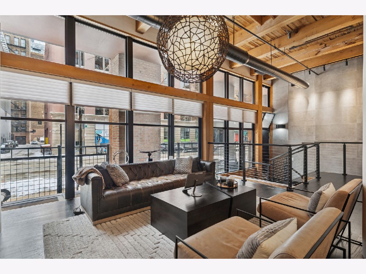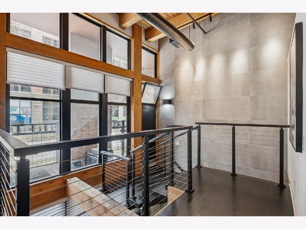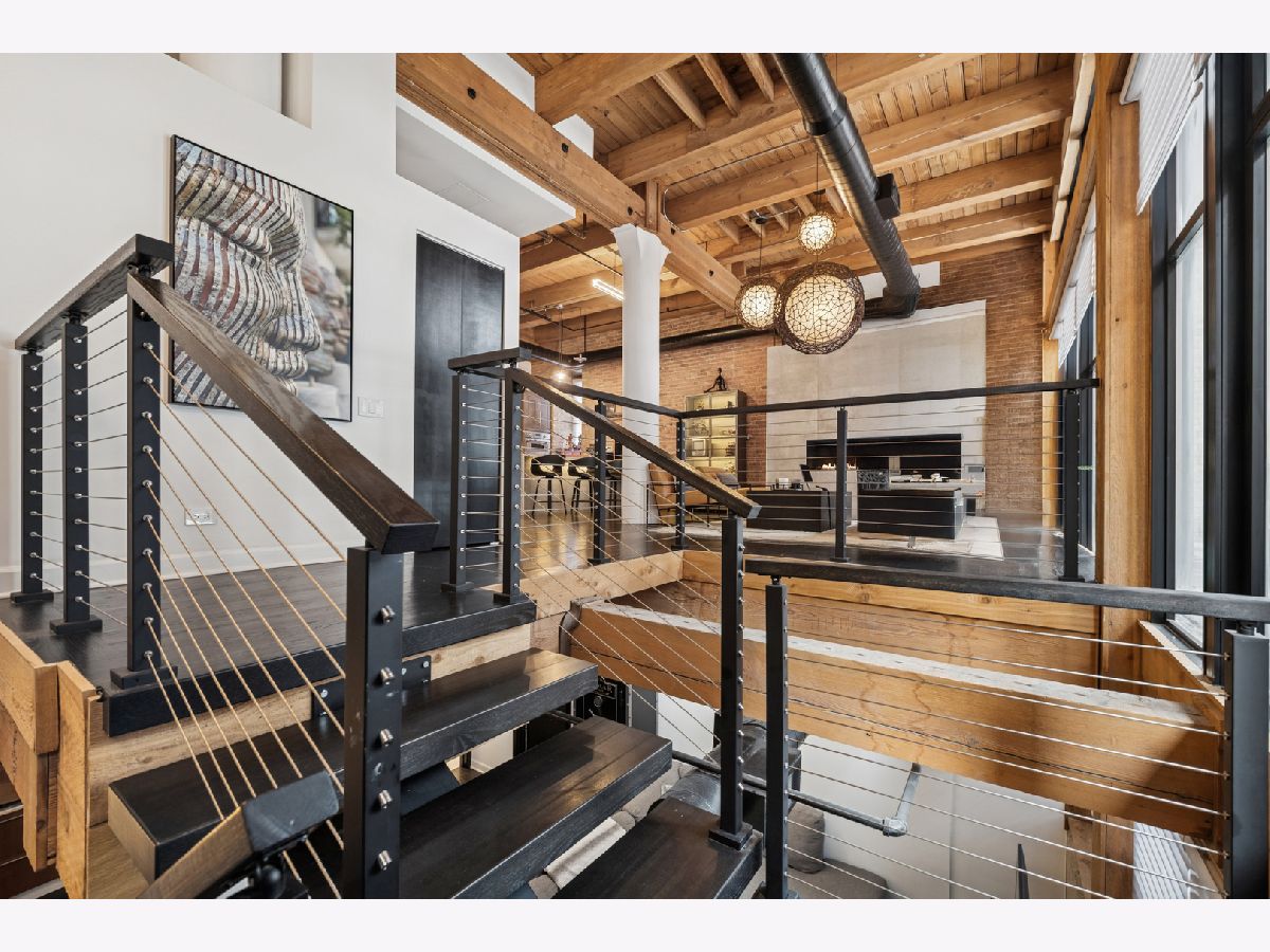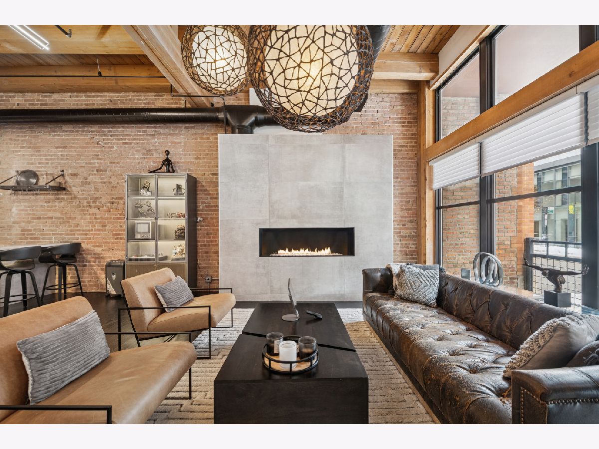 Extremely rare find and obscurer availability at famed Haberdasher Square Lofts in the West Loop. Authentic Loft Conversion comprised of former Hart, Schaffner & Marx Clothier and Wurlitzer Jukebox Factory, Residence 107 is one of the few duplex, heavy timber residences with its own private entrance and outdoor space for grilling. 2022 renovation by Twenty9, Inc, this split 2 bedroom and 2.1 bathroom features no wasted hallway space, a re-designed contemporary staircase of the finest contemporary design bringing together thick, floating wood treads, metal and steel cables. Highly upgraded kitchen features top of the line stainless steel appliances including French Door refrigerator/freezer drawer, high output, gas cooktop, cooking fan, double oven with combination microwave and dishwasher. All hand crafted, custom wood cabinetry, dovetailed joints, cylinder linear hardware, built in trash/recycle bins, deep, single under mount sink, disposal, Swan faucet with spray feature, hot water dispenser. Large peninsula with waterfall edge. 1.25" straight edge white quartz counters with grey veining reminiscent of Statuary marble. Powder room on first level with niche for accoutrements. Real tongue and groove oak hardwood floors throughout Residence 107. Sumptuous living and dining spaces featuring most contemporary rectangular gas, ventless fireplace surrounded by a wall structured covered in grey stone in large format tiles for substantial design aesthetic impact. Floor to ceiling windows. Primary suite on first level accommodates king bed, a pair of bedside tables, dresser and armoire, walk-in closet with finest built-ins. Exquisite ensuite primary bathroom with spa features including a walkthrough steam shower, frameless glass, heated towel bars, Infinity drain, freestanding soaking tub with floor mounted plumbing, bench, two rain shower heads and handheld sprays, floor to ceiling stone basin, ceiling stone, impressive large format porcelain with grey veining wall tiling, raised dual, all wood vanity, extra long with plenty of counter space in between both rectangular under mount sinks and recessed medicine cabinets. White quartz, 1.25" straight edge quartz counter with waterfall edge, wall hung Toto commode. Second level of entertaining space also features wet bar with sink, beverage center and wine refrigerator. Family room space, large windows and "cut away" from main floor for additional light descend. Second full bathroom dressed in grey/white marble, vanity with Statuary marble edged counter. Laundry room with additional storage, side by side front load washer/dryer with storage drawers underneath. Bedroom with storage console cabinet built in underneath flat screen. Two storage lockers included in the list price. Haberdasher Square is a full amenity building including 24 hour doorman, onsite management, maintenance and engineer, half court basketball court, grilling station, roof top deck with 360 degree views, complete gym, excellent and new community room for parties and celebrations for all occasions. Mostly assessment includes heat, air conditioning, water, gas, cable and internet. Parking available for $35,000.