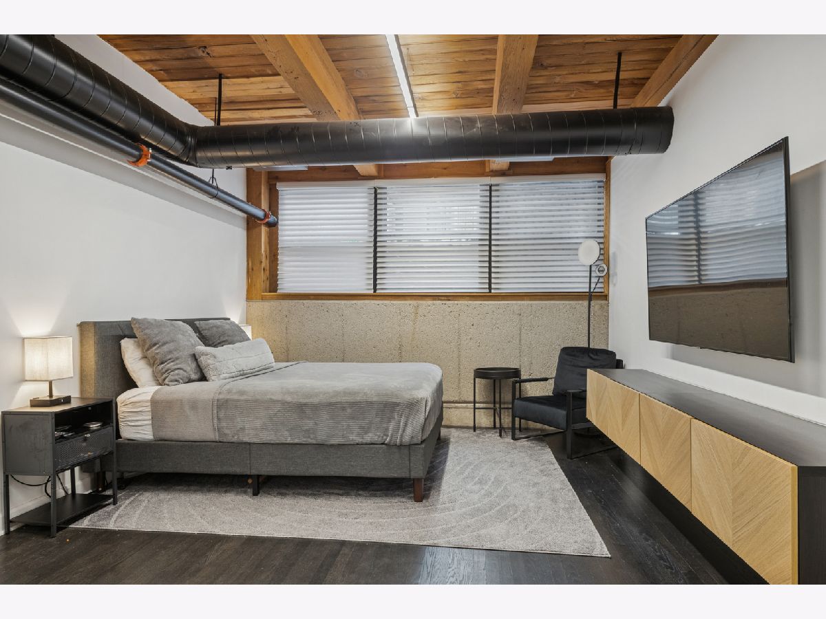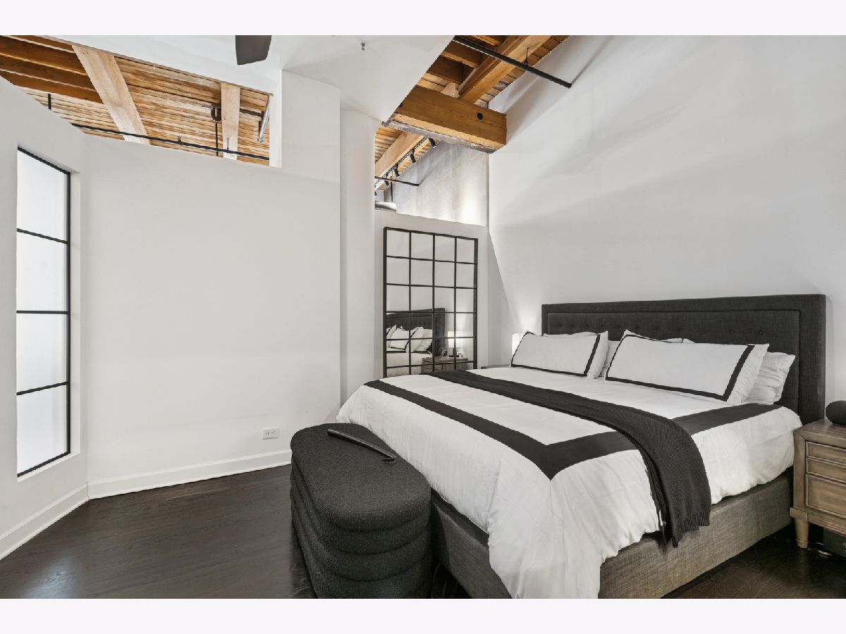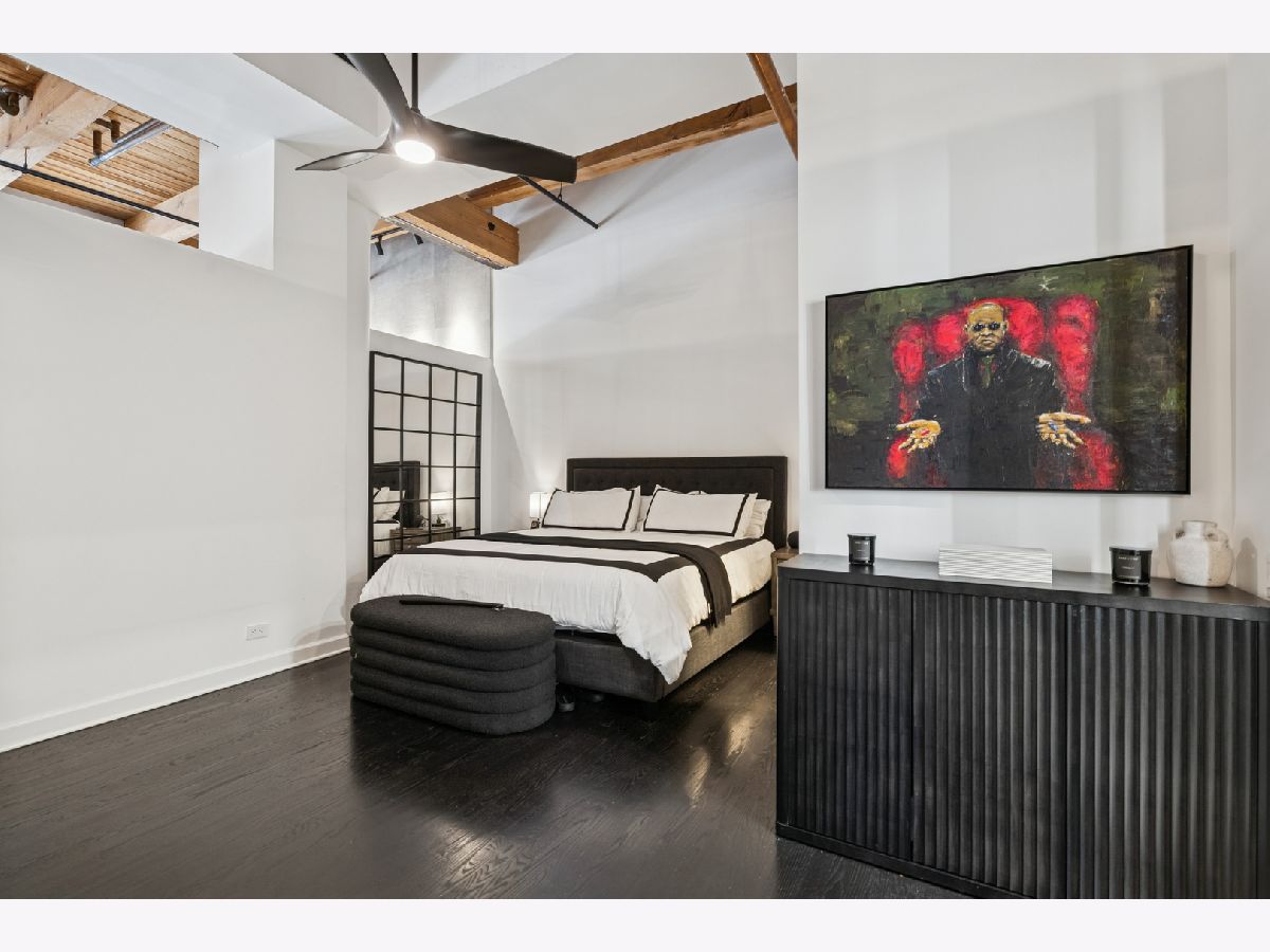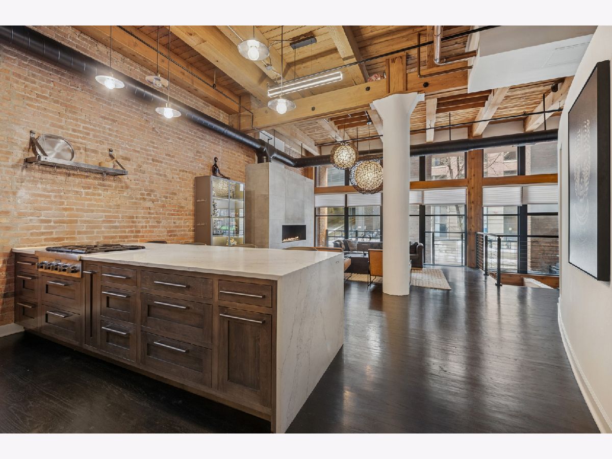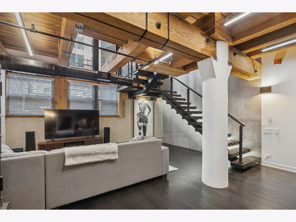 Extremely rare find and obscurer availability at famed Haberdasher Square Lofts in the West Loop. Authentic Loft Conversion comprised of former Hart, Schaffner & Marx Clothier and Wurlitzer Jukebox Factory, Residence 107 is one of the few duplex, heavy timber residences with its own private entrance and outdoor space for grilling. 2022 renovation by Twenty9, Inc, this split 2 bedroom and 2.1 bathroom features no wasted hallway space, a re-designed contemporary staircase of the finest contemporary design bringing together thick, floating wood treads, metal and steel cables. Highly upgraded kitchen features top of the line stainless steel appliances including French Door refrigerator/freezer drawer, high output, gas cooktop, cooking fan, double oven with combination microwave and dishwasher. All hand crafted, custom wood cabinetry, dovetailed joints, cylinder linear hardware, built in trash/recycle bins, deep, single under mount sink, disposal, Swan faucet with spray feature, hot water dispenser. Large peninsula with waterfall edge. 1.25" straight edge white quartz counters with grey veining reminiscent of Statuary marble. Powder room on first level with niche for accoutrements. Real tongue and groove oak hardwood floors throughout Residence 107. Sumptuous living and dining spaces featuring most contemporary rectangular gas, ventless fireplace surrounded by a wall structured covered in grey stone in large format tiles for substantial design aesthetic impact. Floor to ceiling windows. Primary suite on first level accommodates king bed, a pair of bedside tables, dresser and armoire, walk-in closet with finest built-ins. Exquisite ensuite primary bathroom with spa features including a walkthrough steam shower, frameless glass, heated towel bars, Infinity drain, freestanding soaking tub with floor mounted plumbing, bench, two rain shower heads and handheld sprays, floor to ceiling stone basin, ceiling stone, impressive large format porcelain with grey veining wall tiling, raised dual, all wood vanity, extra long with plenty of counter space in between both rectangular under mount sinks and recessed medicine cabinets. White quartz, 1.25" straight edge quartz counter with waterfall edge, wall hung Toto commode. Second level of entertaining space also features wet bar with sink, beverage center and wine refrigerator. Family room space, large windows and "cut away" from main floor for additional light descend. Second full bathroom dressed in grey/white marble, vanity with Statuary marble edged counter. Laundry room with additional storage, side by side front load washer/dryer with storage drawers underneath. Bedroom with storage console cabinet built in underneath flat screen. Two storage lockers included in the list price. Haberdasher Square is a full amenity building including 24 hour doorman, onsite management, maintenance and engineer, half court basketball court, grilling station, roof top deck with 360 degree views, complete gym, excellent and new community room for parties and celebrations for all occasions. Mostly assessment includes heat, air conditioning, water, gas, cable and internet. Parking available for $35,000.