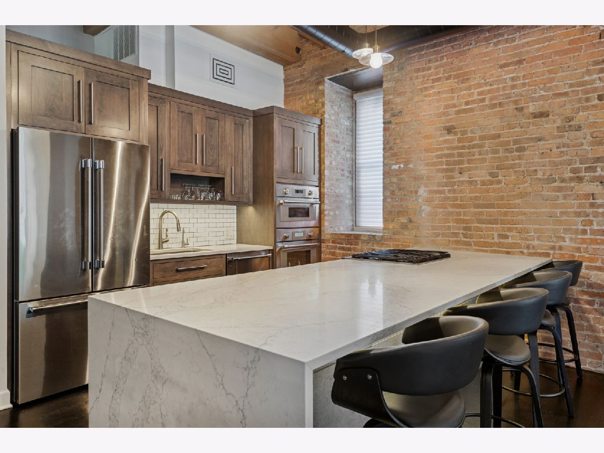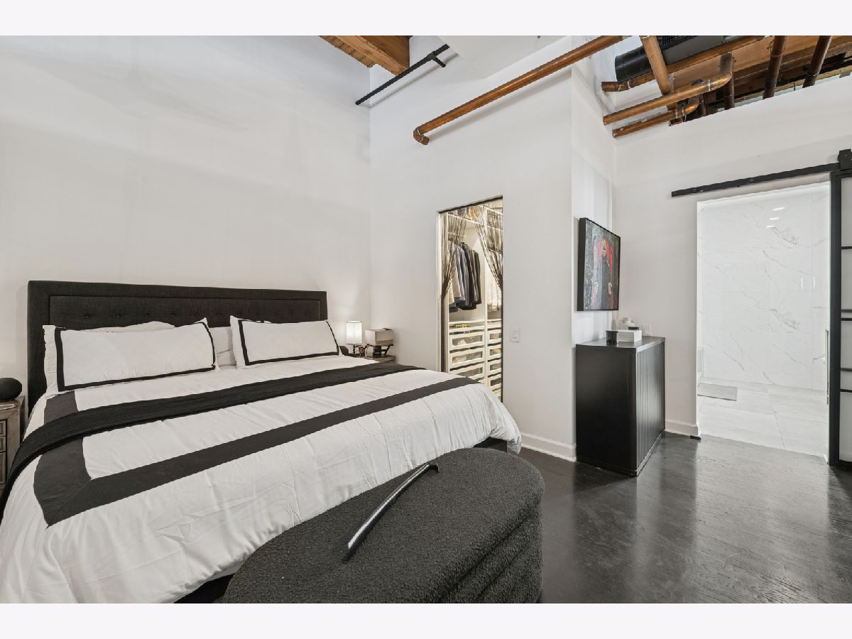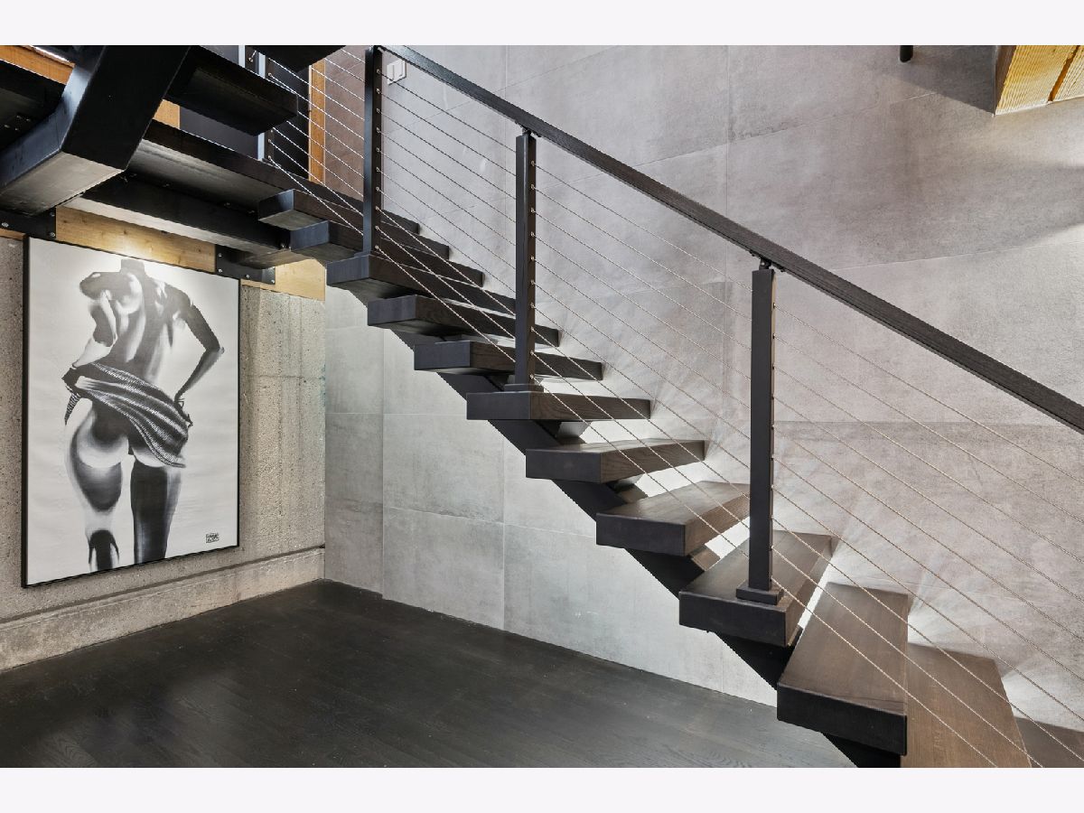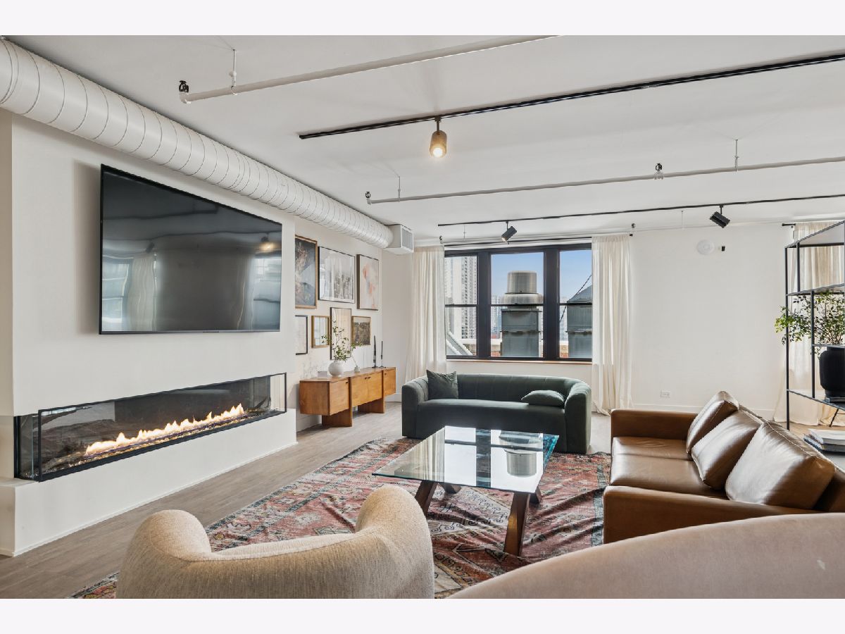 Extremely rare find and obscurer availability at famed Haberdasher Square Lofts in the West Loop. Authentic Loft Conversion comprised of former Hart, Schaffner & Marx Clothier and Wurlitzer Jukebox Factory, Residence 107 is one of the few duplex, heavy timber residences with its own private entrance and outdoor space for grilling. 2022 renovation by Twenty9, Inc, this split 2 bedroom and 2.1 bathroom features no wasted hallway space, a re-designed contemporary staircase of the finest contemporary design bringing together thick, floating wood treads, metal and steel cables. Highly upgraded kitchen features top of the line stainless steel appliances including French Door refrigerator/freezer drawer, high output, gas cooktop, cooking fan, double oven with combination microwave and dishwasher. All hand crafted, custom wood cabinetry, dovetailed joints, cylinder linear hardware, built in trash/recycle bins, deep, single under mount sink, disposal, Swan faucet with spray feature, hot water dispenser. Large peninsula with waterfall edge. 1.25" straight edge white quartz counters with grey veining reminiscent of Statuary marble. Powder room on first level with niche for accoutrements. Real tongue and groove oak hardwood floors throughout Residence 107. Sumptuous living and dining spaces featuring most contemporary rectangular gas, ventless fireplace surrounded by a wall structured covered in grey stone in large format tiles for substantial design aesthetic impact. Floor to ceiling windows. Primary suite on first level accommodates king bed, a pair of bedside tables, dresser and armoire, walk-in closet with finest built-ins. Exquisite ensuite primary bathroom with spa features including a walkthrough steam shower, frameless glass, heated towel bars, Infinity drain, freestanding soaking tub with floor mounted plumbing, bench, two rain shower heads and handheld sprays, floor to ceiling stone basin, ceiling stone, impressive large format porcelain with grey veining wall tiling, raised dual, all wood vanity, extra long with plenty of counter space in between both rectangular under mount sinks and recessed medicine cabinets. White quartz, 1.25" straight edge quartz counter with waterfall edge, wall hung Toto commode. Second level of entertaining space also features wet bar with sink, beverage center and wine refrigerator. Family room space, large windows and "cut away" from main floor for additional light descend. Second full bathroom dressed in grey/white marble, vanity with Statuary marble edged counter. Laundry room with additional storage, side by side front load washer/dryer with storage drawers underneath. Bedroom with storage console cabinet built in underneath flat screen. Two storage lockers included in the list price. Haberdasher Square is a full amenity building including 24 hour doorman, onsite management, maintenance and engineer, half court basketball court, grilling station, roof top deck with 360 degree views, complete gym, excellent and new community room for parties and celebrations for all occasions. Mostly assessment includes heat, air conditioning, water, gas, cable and internet. Parking available for $35,000.