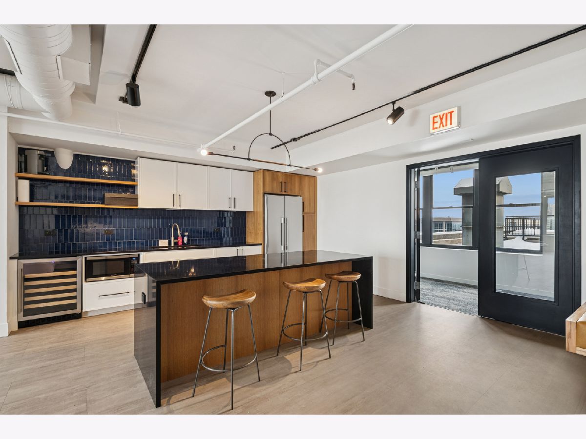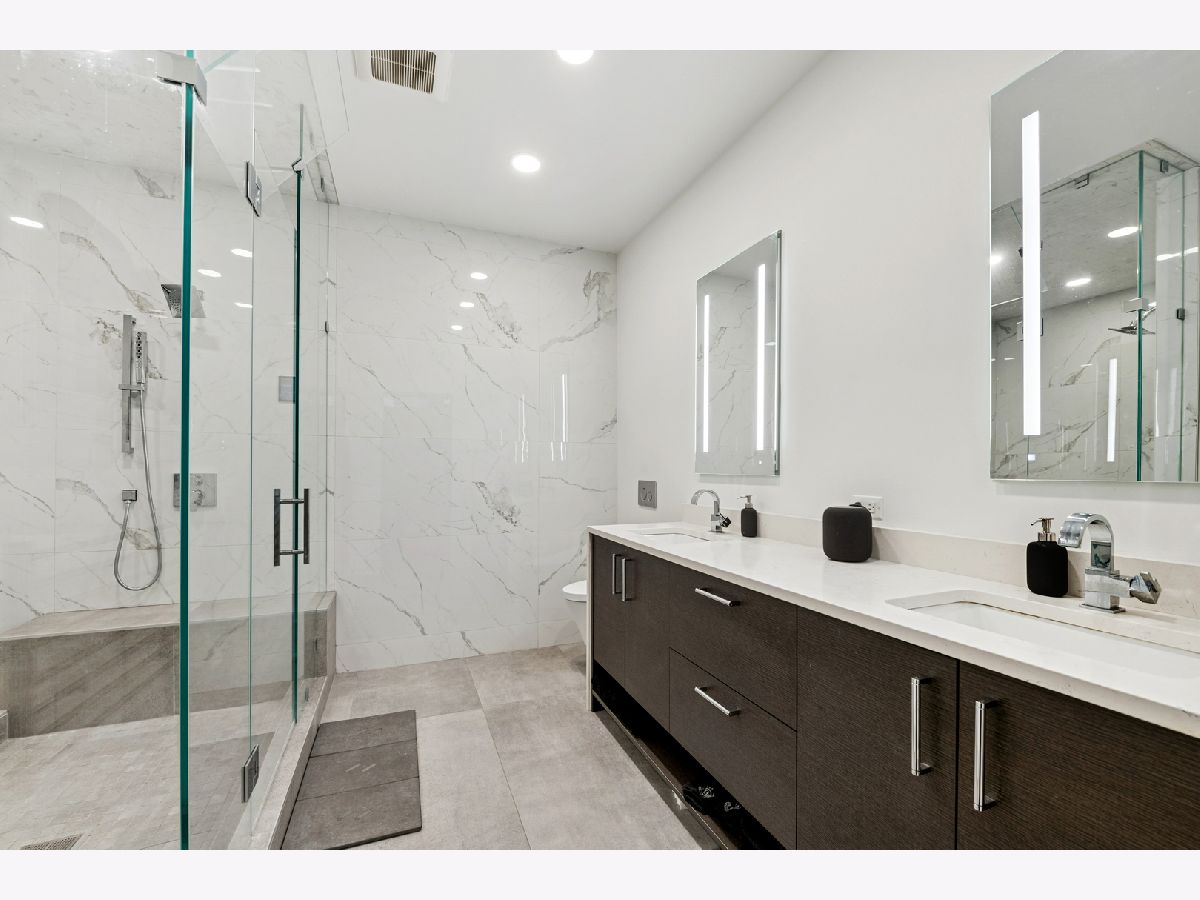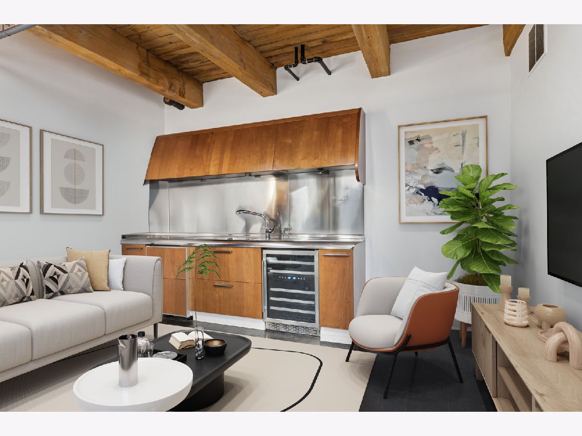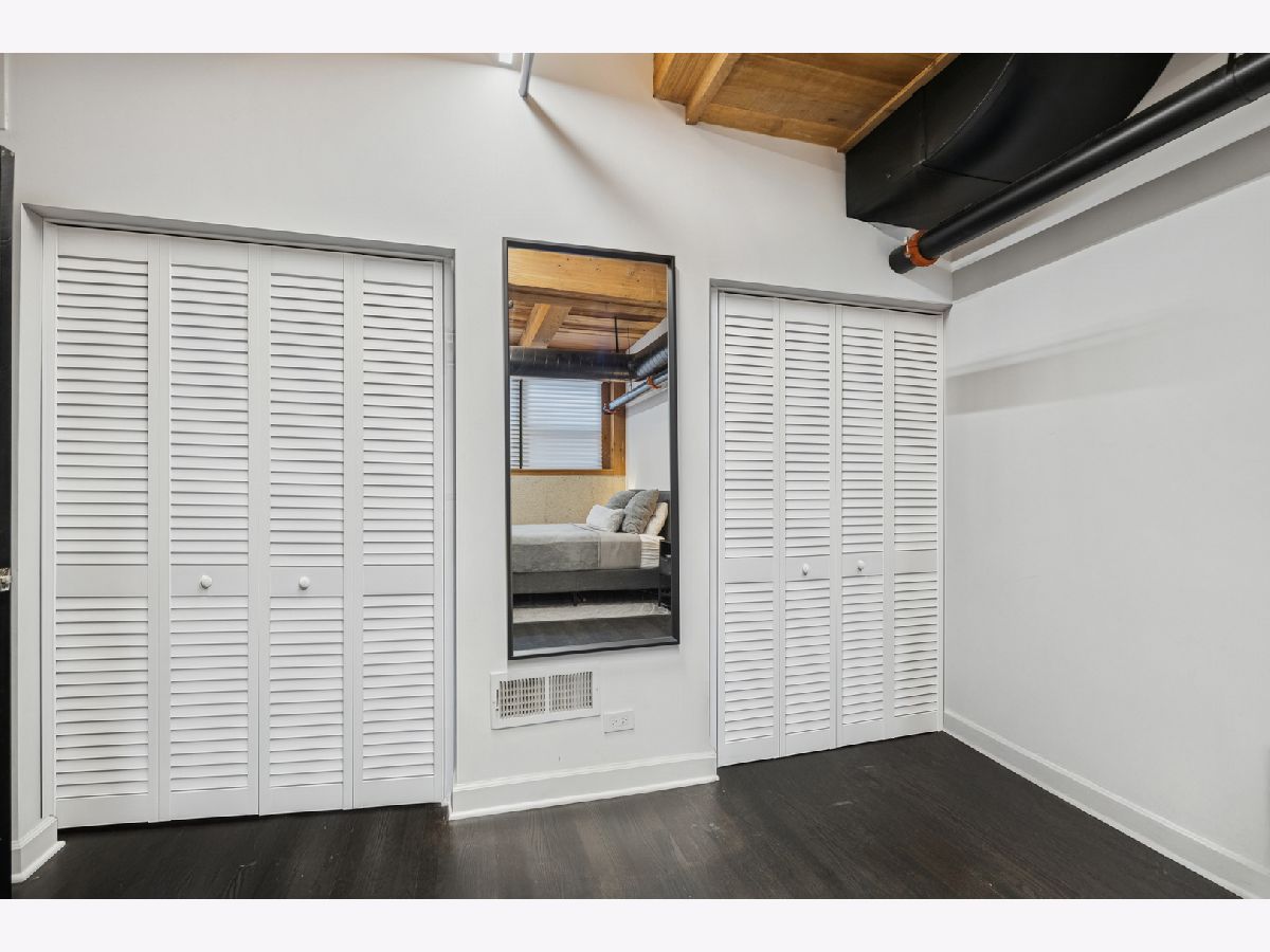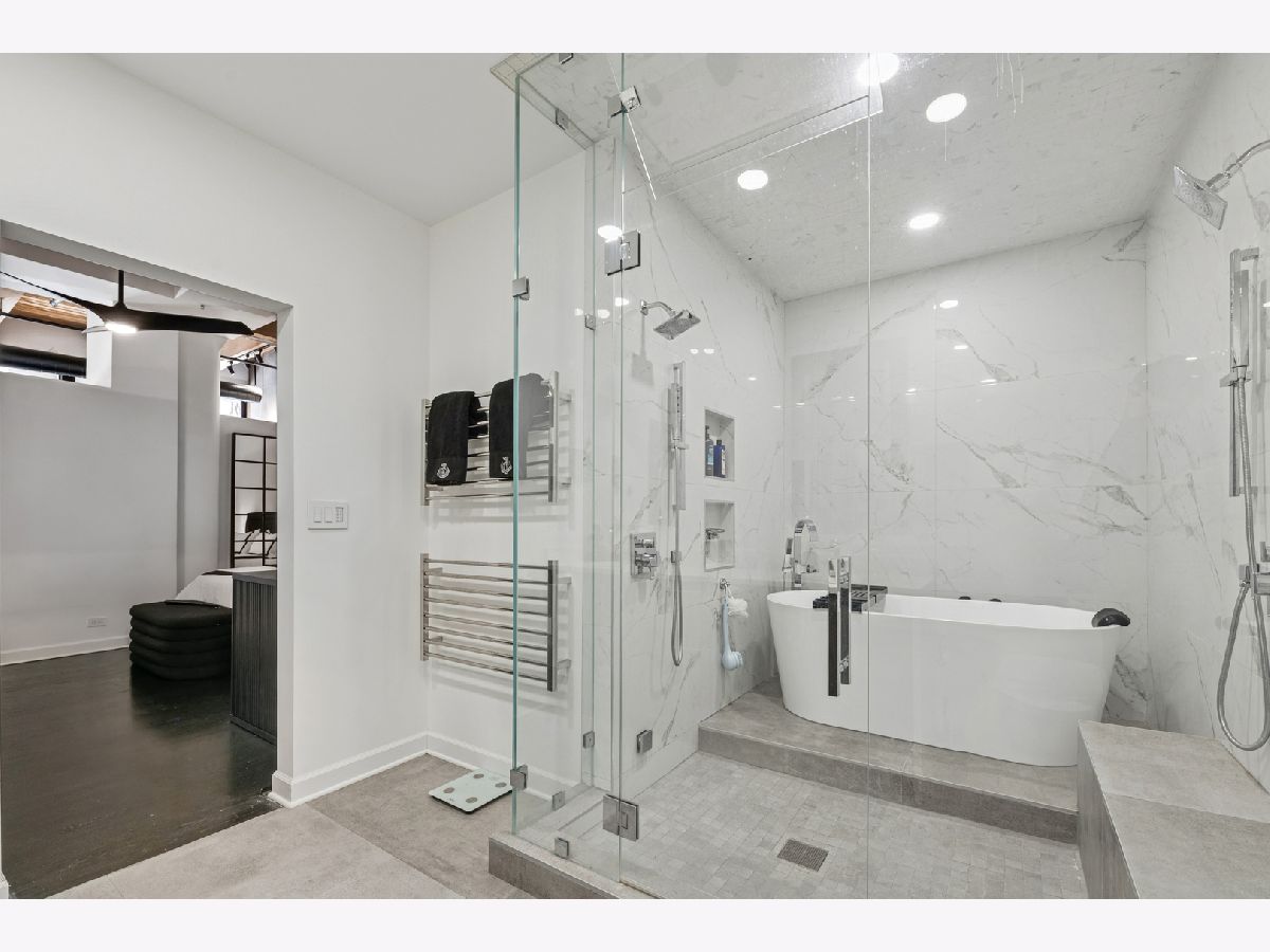Extremely rare find and obscurer availability at famed Haberdasher Square Lofts in the West Loop. Authentic Loft Conversion comprised of former Hart, Schaffner & Marx Clothier and Wurlitzer Jukebox Factory, Residence 107 is one of the few duplex, heavy timber residences with its own private entrance and outdoor space for grilling. 2022 renovation by Twenty9, Inc, this split 2 bedroom and 2.1 bathroom features no wasted hallway space, a re-designed contemporary staircase of the finest contemporary design bringing together thick, floating wood treads, metal and steel cables. Highly upgraded kitchen features top of the line stainless steel appliances including French Door refrigerator/freezer drawer, high output, gas cooktop, cooking fan, double oven with combination microwave and dishwasher. All hand crafted, custom wood cabinetry, dovetailed joints, cylinder linear hardware, built in trash/recycle bins, deep, single under mount sink, disposal, Swan faucet with spray feature, hot water dispenser. Large peninsula with waterfall edge. 1.25" straight edge white quartz counters with grey veining reminiscent of Statuary marble. Powder room on first level with niche for accoutrements. Real tongue and groove oak hardwood floors throughout Residence 107. Sumptuous living and dining spaces featuring most contemporary rectangular gas, ventless fireplace surrounded by a wall structured covered in grey stone in large format tiles for substantial design aesthetic impact. Floor to ceiling windows. Primary suite on first level accommodates king bed, a pair of bedside tables, dresser and armoire, walk-in closet with finest built-ins. Exquisite ensuite primary bathroom with spa features including a walkthrough steam shower, frameless glass, heated towel bars, Infinity drain, freestanding soaking tub with floor mounted plumbing, bench, two rain shower heads and handheld sprays, floor to ceiling stone basin, ceiling stone, impressive large format porcelain with grey veining wall tiling, raised dual, all wood vanity, extra long with plenty of counter space in between both rectangular under mount sinks and recessed medicine cabinets. White quartz, 1.25" straight edge quartz counter with waterfall edge, wall hung Toto commode. Second level of entertaining space also features wet bar with sink, beverage center and wine refrigerator. Family room space, large windows and "cut away" from main floor for additional light descend. Second full bathroom dressed in grey/white marble, vanity with Statuary marble edged counter. Laundry room with additional storage, side by side front load washer/dryer with storage drawers underneath. Bedroom with storage console cabinet built in underneath flat screen. Two storage lockers included in the list price. Haberdasher Square is a full amenity building including 24 hour doorman, onsite management, maintenance and engineer, half court basketball court, grilling station, roof top deck with 360 degree views, complete gym, excellent and new community room for parties and celebrations for all occasions. Mostly assessment includes heat, air conditioning, water, gas, cable and internet. Parking available for $35,000.