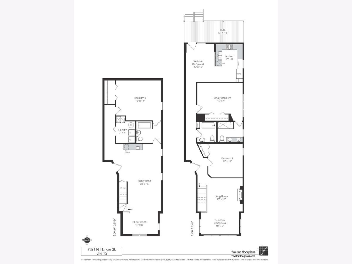 Experience the best of Rogers Park in this beautifully updated brick vintage building. This over-sized duplex-down condo offers over 2,000 square feet, 3 bedrooms, and 3 full baths-delivering the space, flexibility, and feel of a single-family home. The large, sun-filled main level is anchored by a spacious living room with pretty gas fireplace and an adjacent sunroom perfect for formal dining or creating a bright, airy atmosphere ideal for a additional living space, piano, work from home space. North, west and south-facing exposures provide charming neighborhood views along a quiet, tree-lined street. Gleaming oak hardwood floors run throughout the upper level. The expansive kitchen is both functional and inviting, featuring granite countertops, stainless steel appliances, excellent storage, a breakfast bar, and a charming little window seat. A large, dedicated eat-in area just off the kitchen opens directly to the fantastic rear deck-perfect for relaxing, entertaining and grilling.The upper level is completed by a generous primary suite with a luxurious en-suite steam shower, along with a second bedroom and full bath. The huge lower level offers an impressive open-concept family room with new luxury vinyl plank flooring, a custom wet bar, and beverage fridge-providing outstanding flex space for relaxing, entertaining, or working from home. A third large bedroom suite features a walk-in closet and dual-access bath. Laundry room, additional flex space, and additional storage complete the lower level. This beautiful home also offers an abundance of closet space, central a/c and one-car parking. Additional highlights include huge basement storage, a flood control system added in 2023, a new water heater (2024), in-unit ejector pump and roof improvements completed in 2019 and 2025. Easy street parking and quick access to the Howard, Jarvis and Morse stations. Ideally located just steps from Pottawattomie and Touhy Parks, restaurants, bars and grocery. Don't miss this rare condo offering space, light, updates, and layout flexibility in an outstanding neighborhood.