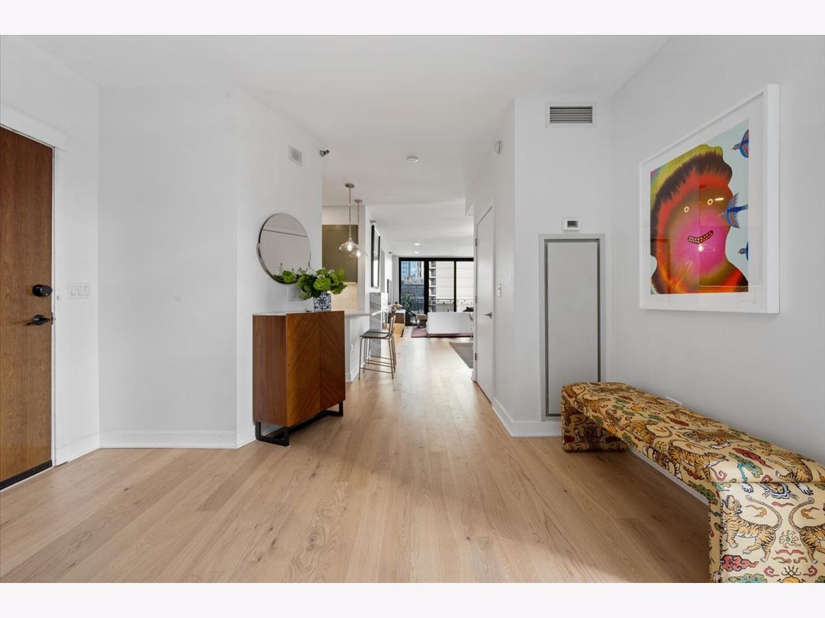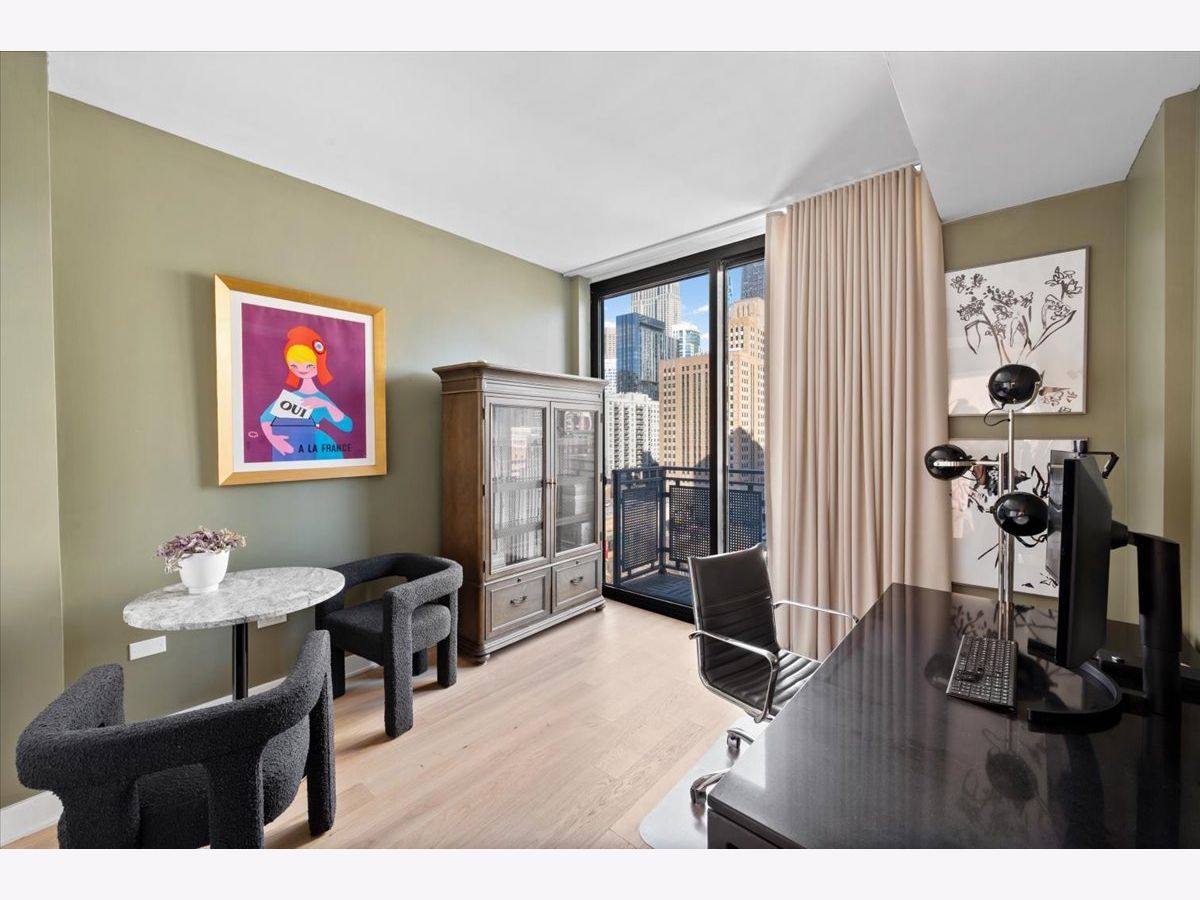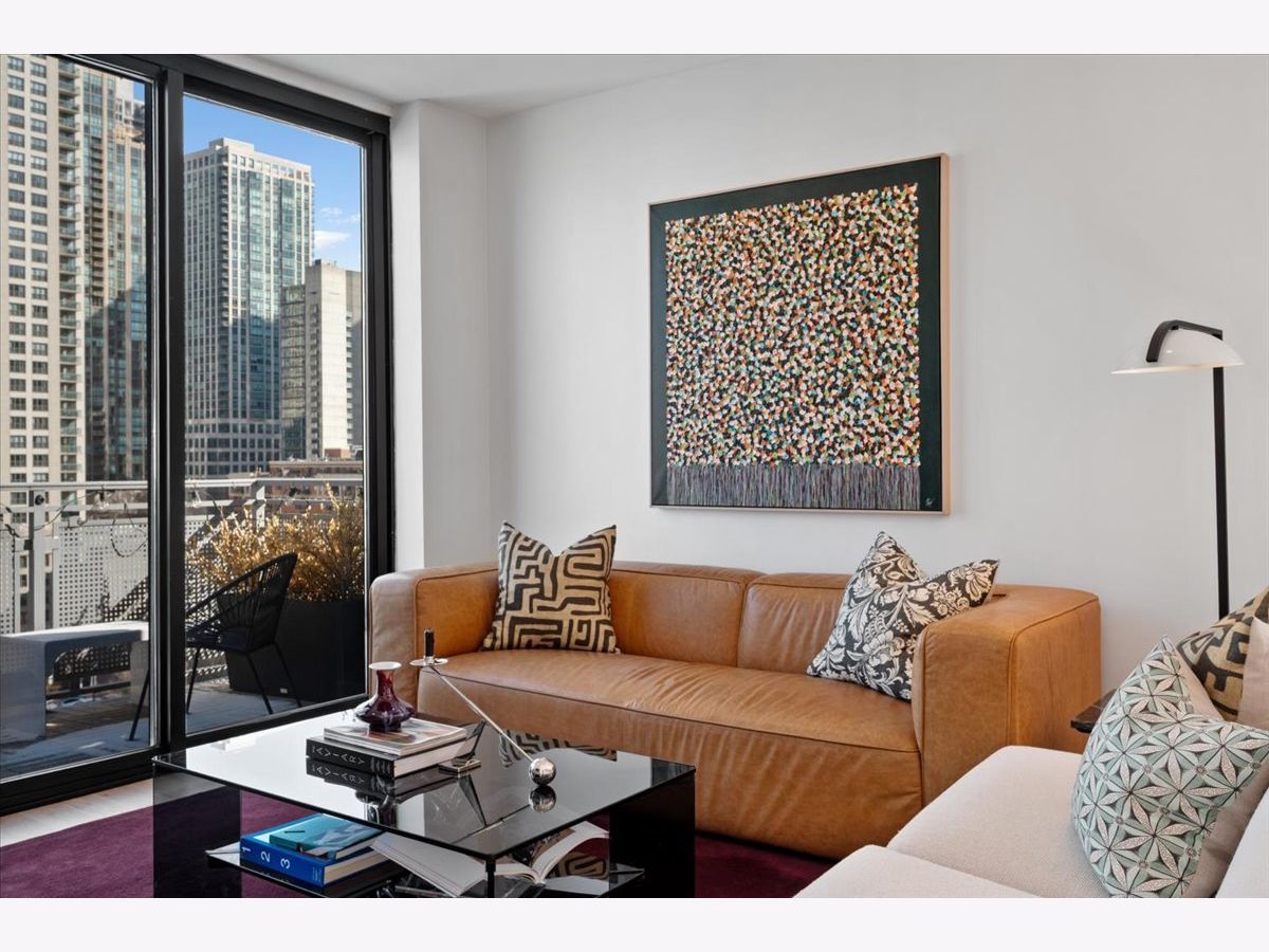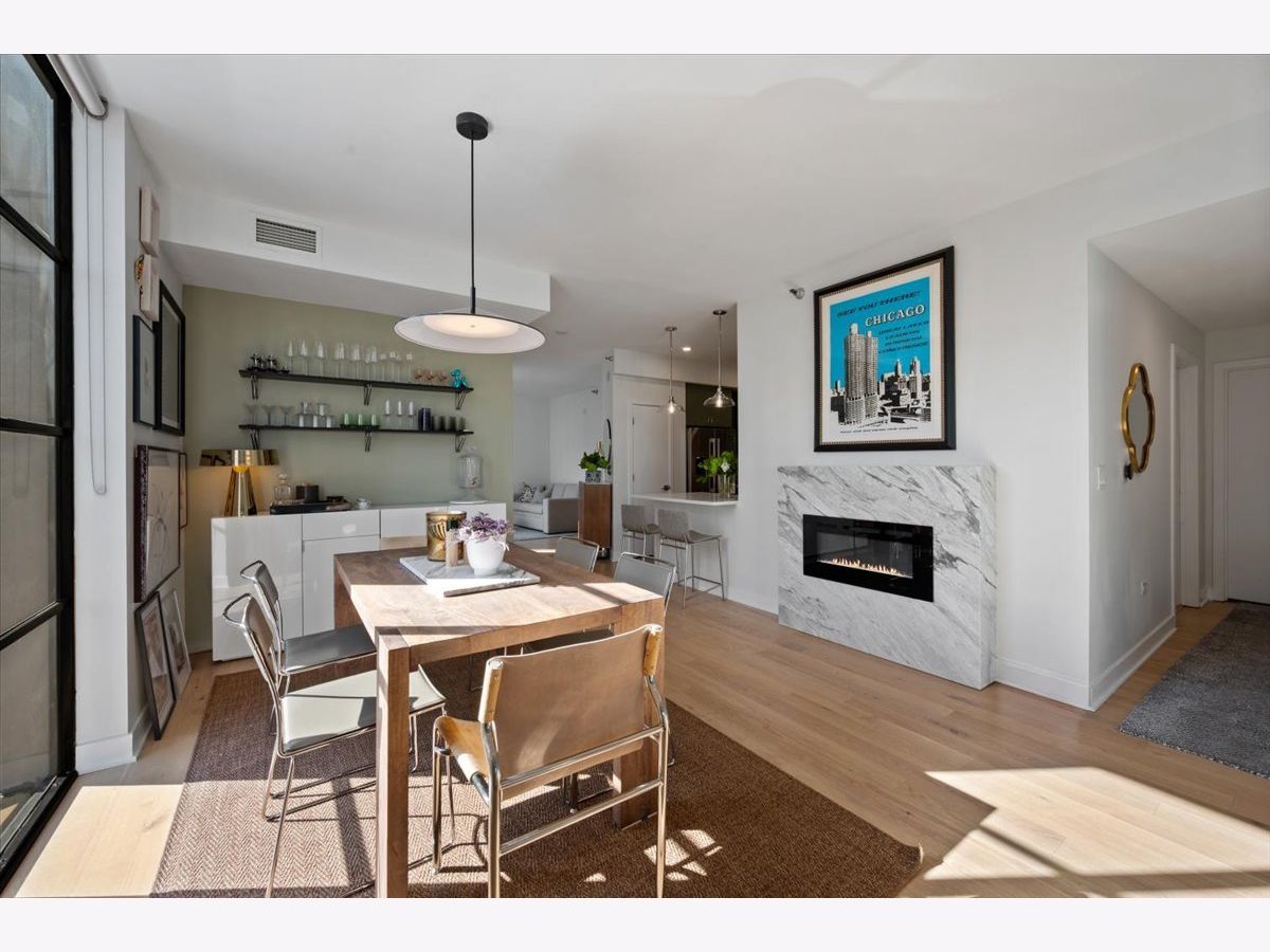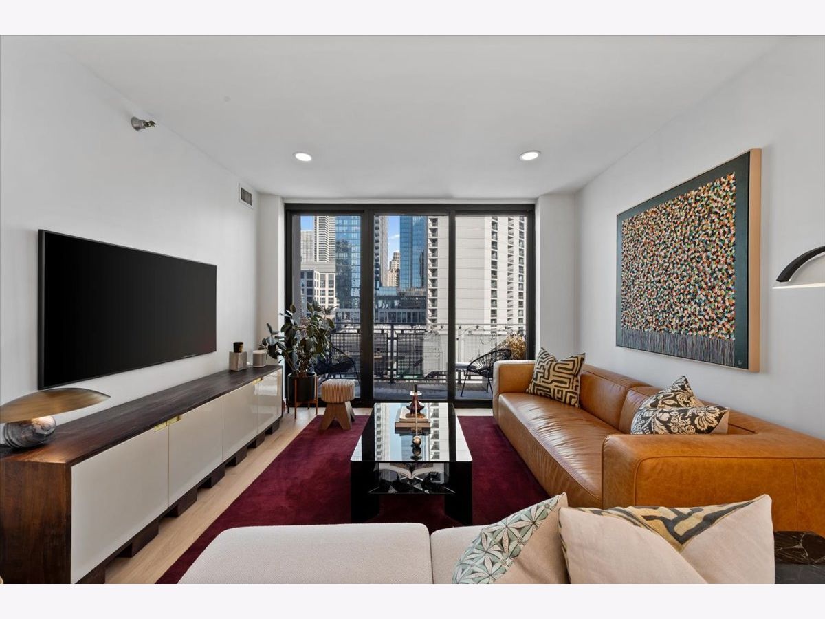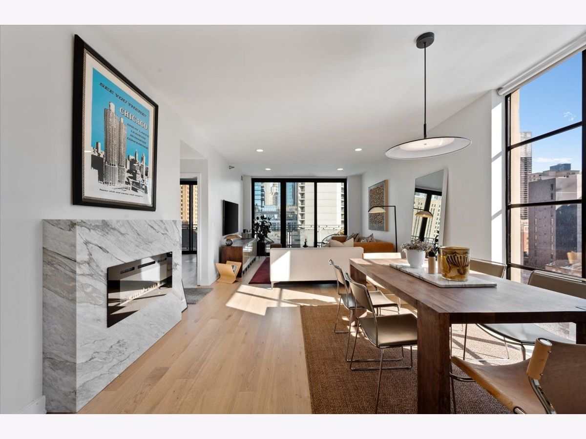 Experience elevated sophistication in this extraordinary, expansive penthouse sanctuary, a designer-renovated 2-bedroom plus den, corner residence perched high above the vibrant streets of River North. Many units in this highly desired tier have converted this 2-bedroom into a 3-bedroom. Wrapped in walls of glass and graced with three private terraces, this home offers breathtaking skyline vistas and abundant natural light from every angle. Completely reimagined in a 2025 full-scale renovation, the open-concept living and entertaining space is a masterclass in modern elegance. White oak flooring flows seamlessly throughout, complemented by curated designer lighting and a striking Calacatta Bluette marble fireplace - a sculptural focal point that anchors the room in refined luxury. The chef's kitchen is equally impressive, outfitted with premium 2022 Bosch appliances, sleek quartz countertops, and custom cabinetry designed for both beauty and function - an exquisite backdrop for intimate dinners or sophisticated gatherings. Indulge in spa-caliber serenity within the fully gut-renovated baths: guest bathroom adorned with a dramatic Calacatta Viola marble vanity. The oversized primary suite is a private retreat in the sky, showcasing sweeping skyline views, custom floor-to-ceiling drapery, designer sconces, and a tranquil, spa-inspired bath featuring a glass walk-in shower and elegant quartz vanity. Every detail has been elevated-from bespoke custom floor-to-ceiling window treatments to thoughtfully upgraded lighting throughout. Step outside to three newly updated private terraces, finished with modern tile flooring and offering panoramic city views. Perfectly positioned just steps from the prestigious Gold Coast and moments from Whole Foods Market, Life Time, and River North's finest dining, boutiques, and nightlife, this penthouse is perfection!
