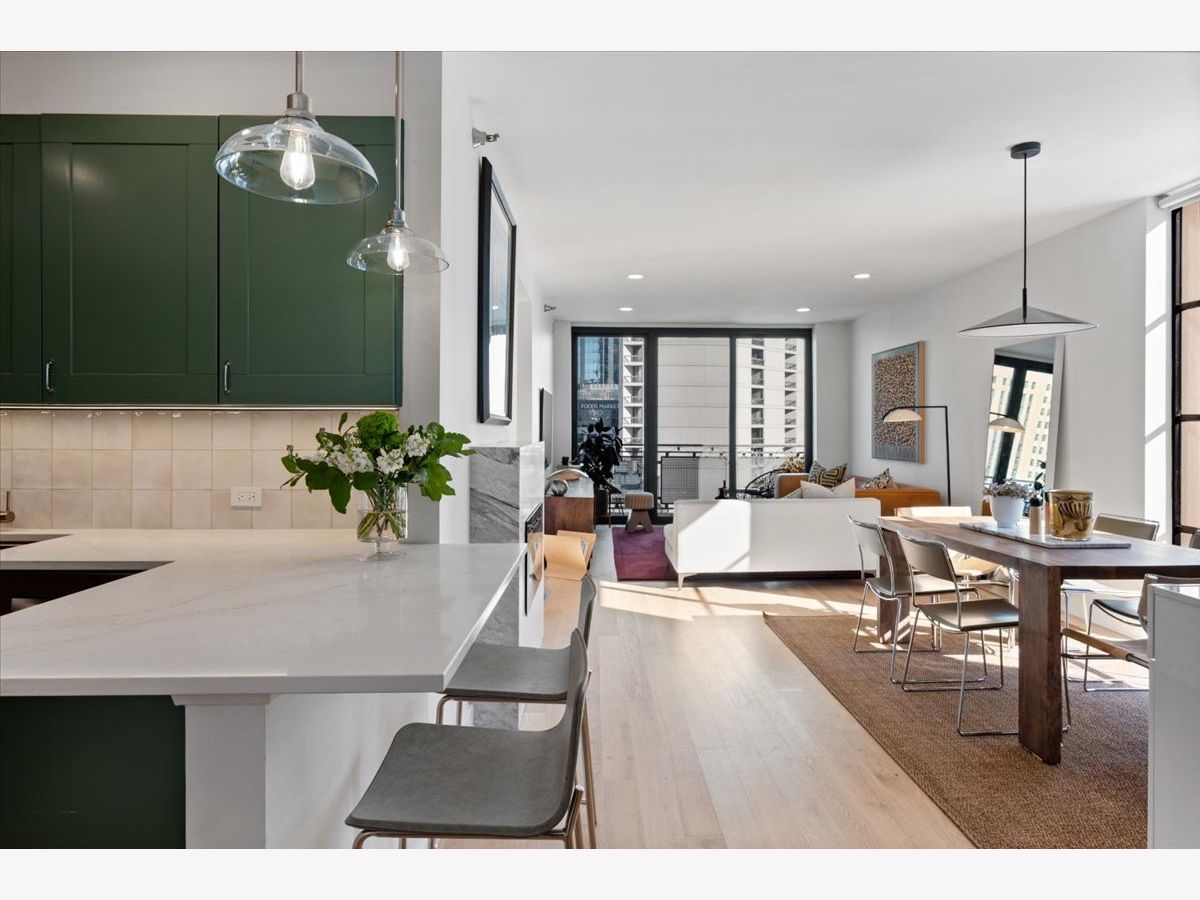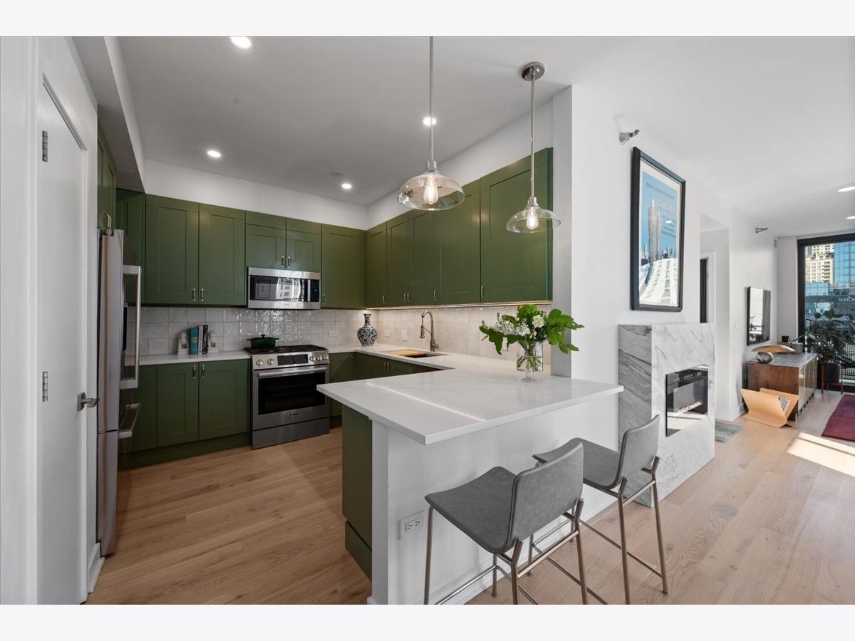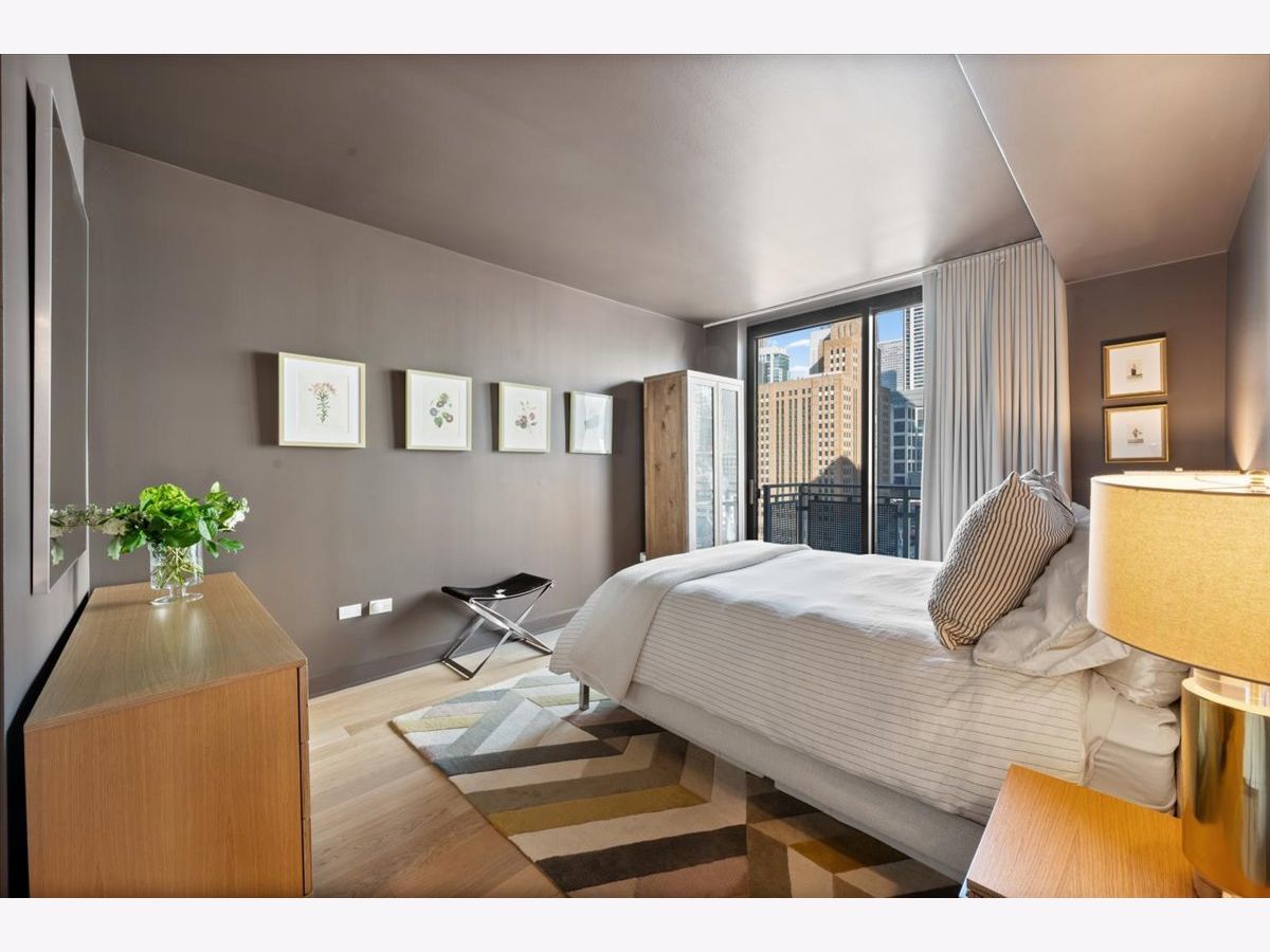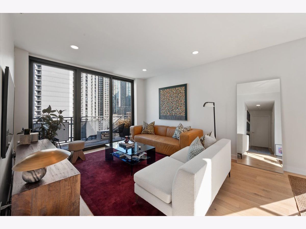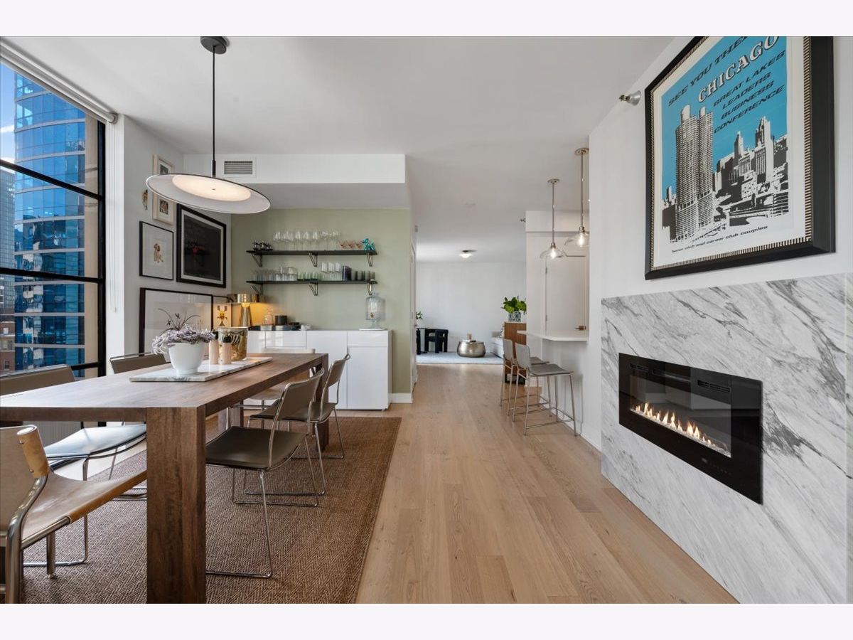 Experience elevated sophistication in this extraordinary, expansive penthouse sanctuary, a designer-renovated 2-bedroom plus den, corner residence perched high above the vibrant streets of River North. Many units in this highly desired tier have converted this 2-bedroom into a 3-bedroom. Wrapped in walls of glass and graced with three private terraces, this home offers breathtaking skyline vistas and abundant natural light from every angle. Completely reimagined in a 2025 full-scale renovation, the open-concept living and entertaining space is a masterclass in modern elegance. White oak flooring flows seamlessly throughout, complemented by curated designer lighting and a striking Calacatta Bluette marble fireplace - a sculptural focal point that anchors the room in refined luxury. The chef's kitchen is equally impressive, outfitted with premium 2022 Bosch appliances, sleek quartz countertops, and custom cabinetry designed for both beauty and function - an exquisite backdrop for intimate dinners or sophisticated gatherings. Indulge in spa-caliber serenity within the fully gut-renovated baths: guest bathroom adorned with a dramatic Calacatta Viola marble vanity. The oversized primary suite is a private retreat in the sky, showcasing sweeping skyline views, custom floor-to-ceiling drapery, designer sconces, and a tranquil, spa-inspired bath featuring a glass walk-in shower and elegant quartz vanity. Every detail has been elevated-from bespoke custom floor-to-ceiling window treatments to thoughtfully upgraded lighting throughout. Step outside to three newly updated private terraces, finished with modern tile flooring and offering panoramic city views. Perfectly positioned just steps from the prestigious Gold Coast and moments from Whole Foods Market, Life Time, and River North's finest dining, boutiques, and nightlife, this penthouse is perfection!