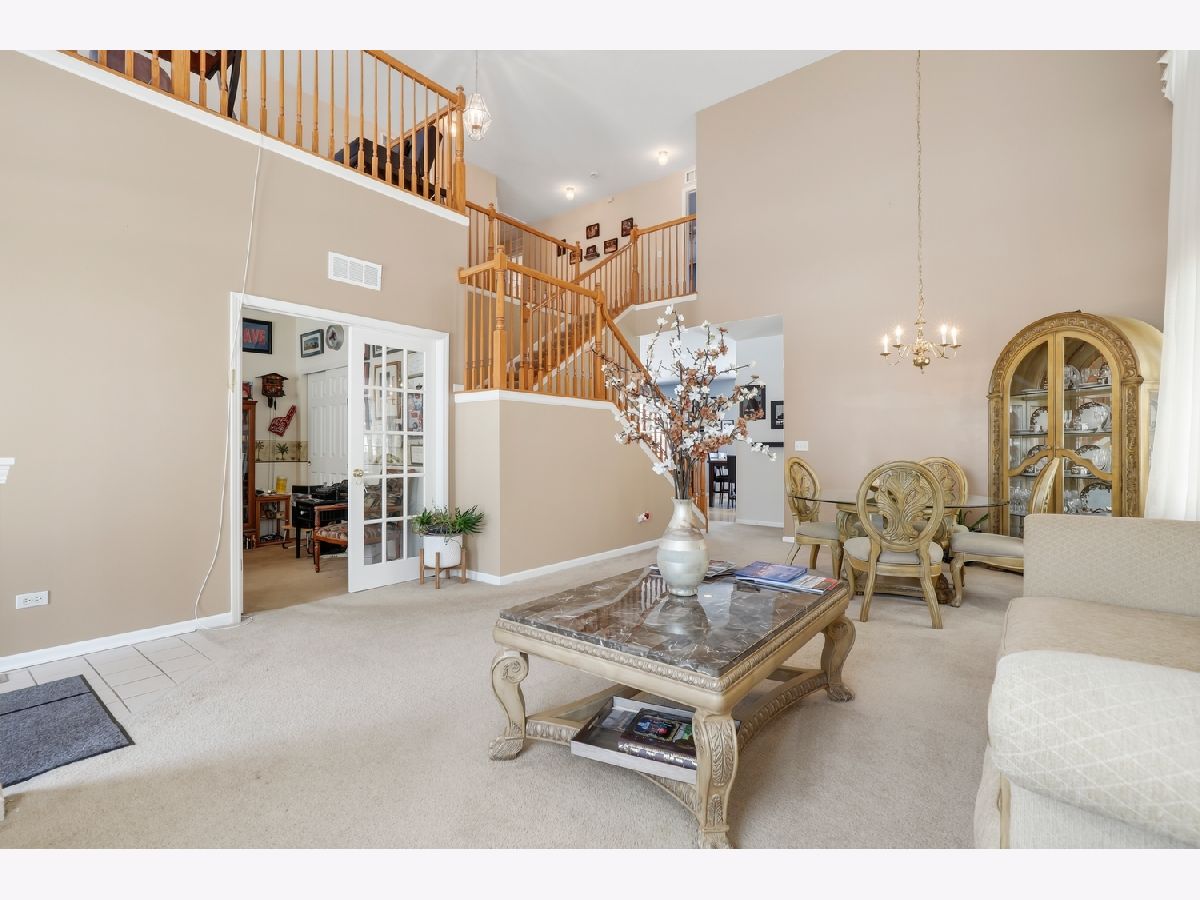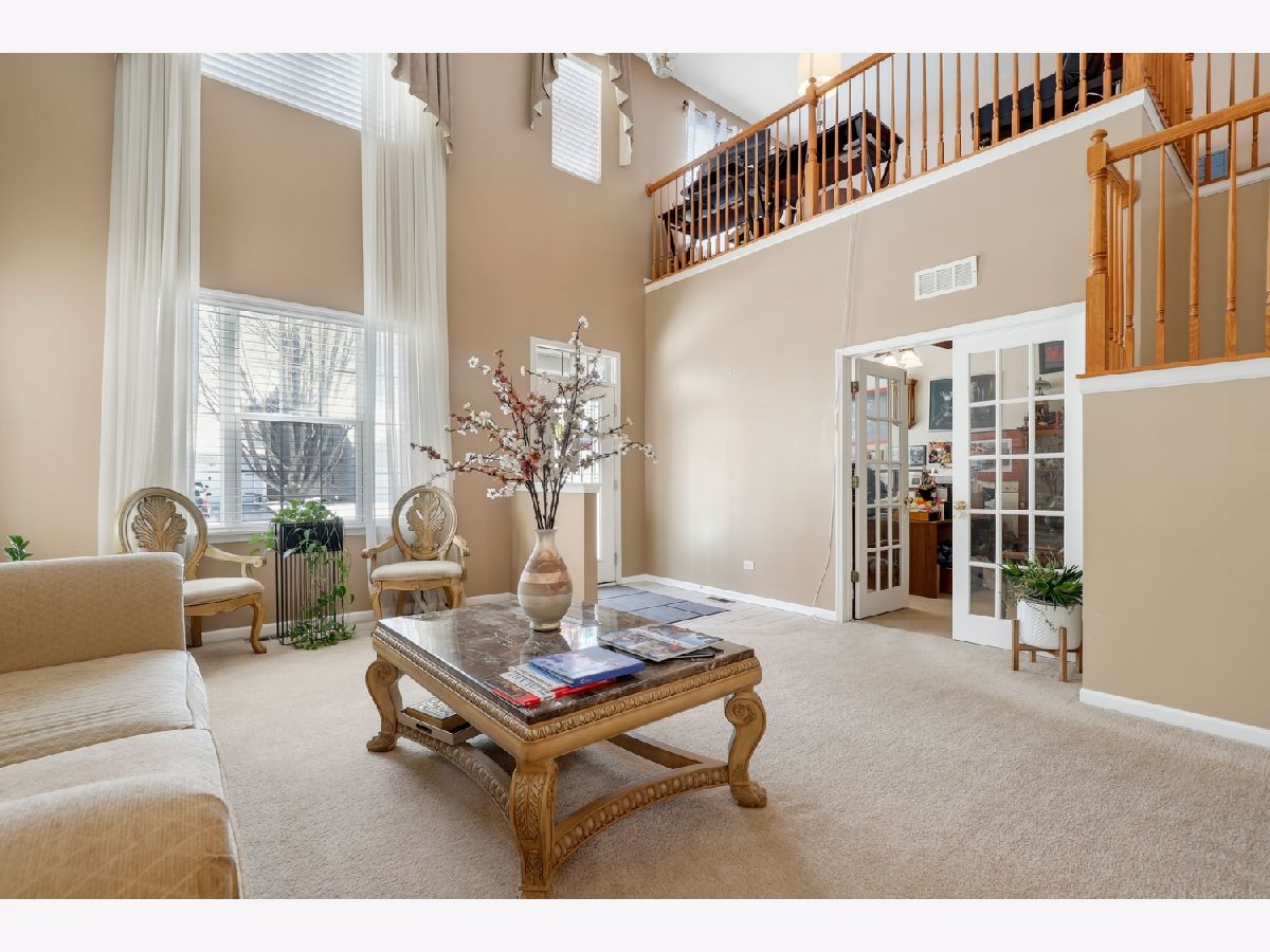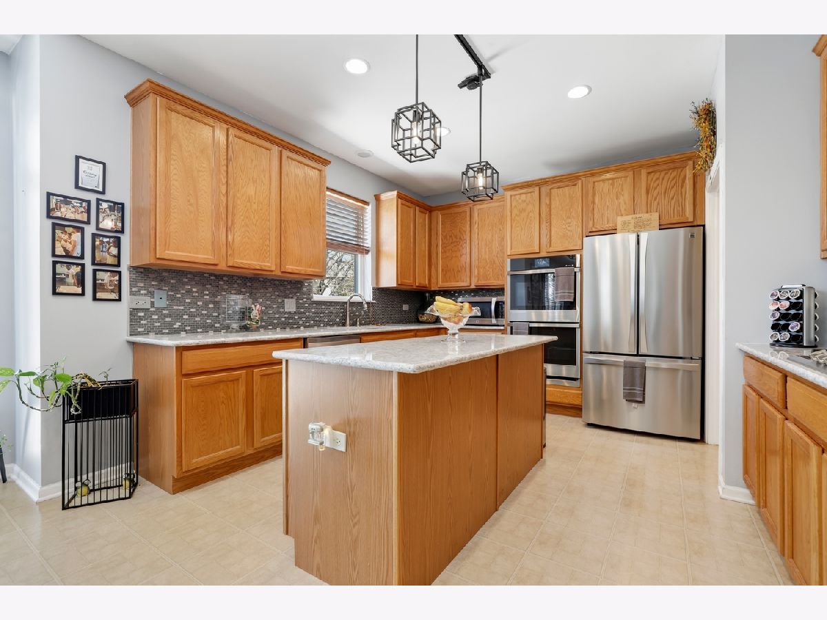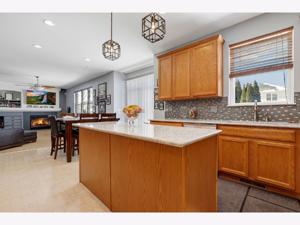 Spacious 4 bed, 2.5 bath home with an unfinished basement and 3-car attached garage! Soaring 20-foot ceilings greet you in the living, and dining room, creating a bright and open feel. The eat in kitchen has been updated with 43" cabinets, quartz countertops, tile backsplash, double oven, and a walk-in pantry, all flowing seamlessly into the family room with a cozy gas fireplace. A convenient first-floor bedroom with French doors - perfect for a home office - along with a laundry room and half bath complete the main level. Upstairs, the spacious primary suite includes a large walk-in closet and a private en suite bath with soaking tub and separate shower. Two additional bedrooms share a hall bath with an extra-long vanity, and a versatile second-floor loft provides additional living space. The unfinished basement offers endless potential with a workshop area and bathroom rough-ins already in place. Enjoy outdoor living in the backyard with a large patio. Additional features include a radon mitigation system. Zoned to highly rated District 202 schools and located just blocks from multiple parks with easy access to I-55, shopping, and dining - This is the perfect place to start your next chapter.