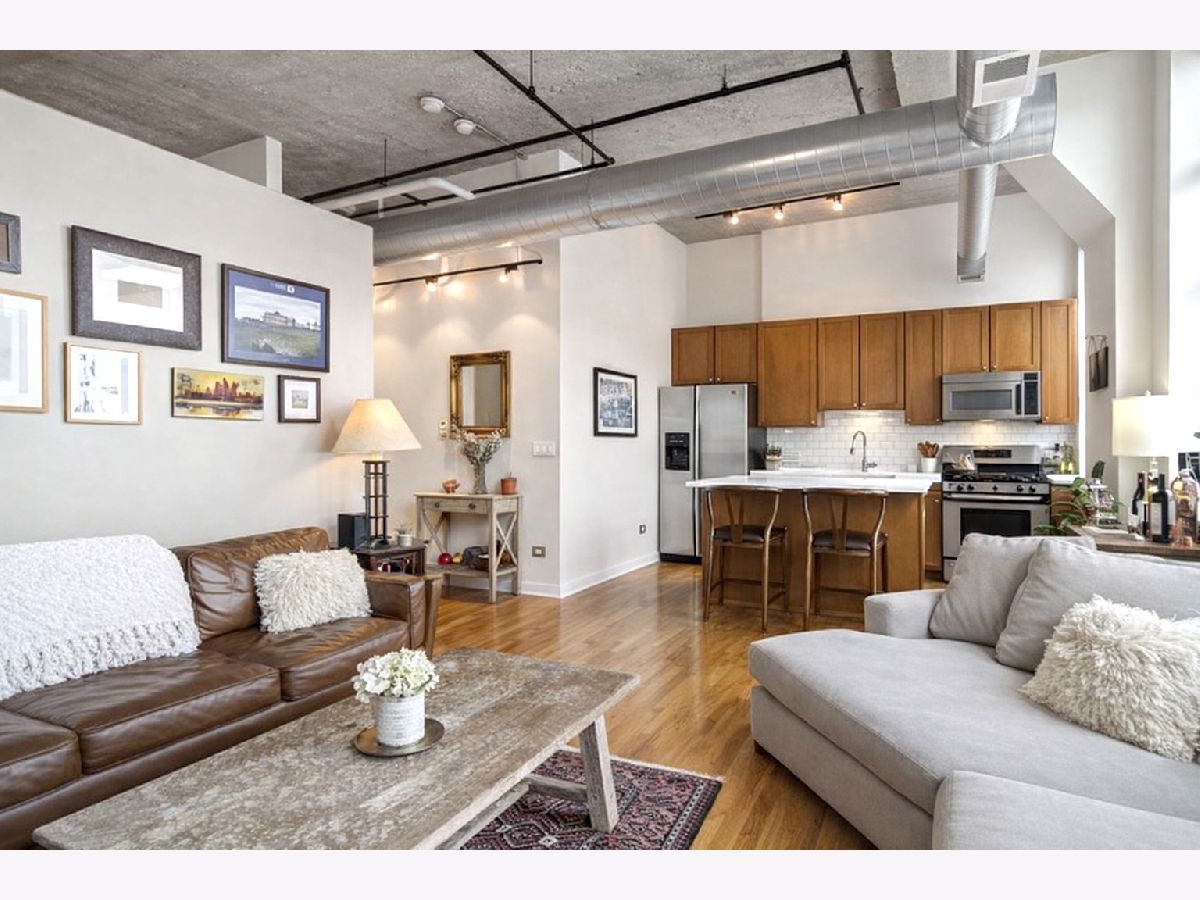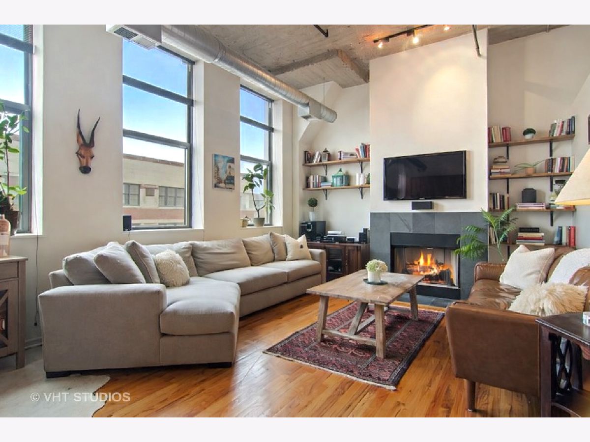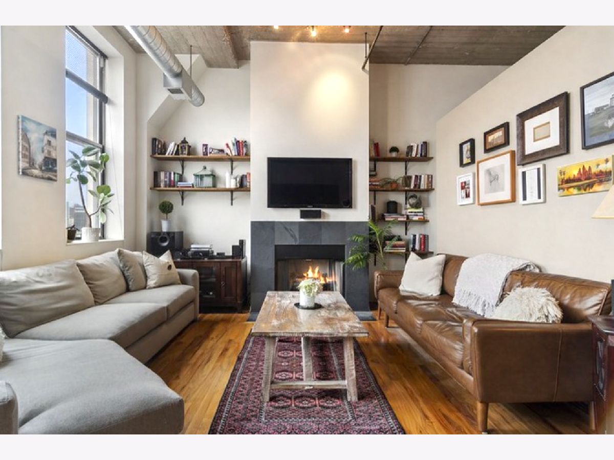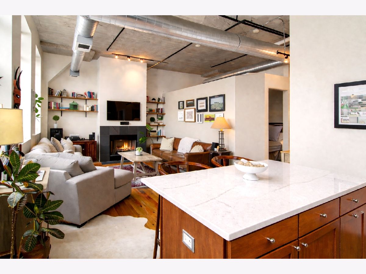 Stunning River North loft offering breathtaking river views and dramatic 12' concrete ceilings in a full-amenity building. This light-filled one-bedroom home features an open, airy layout with oversized windows that perfectly frame the Chicago River. The kitchen is designed for both function and style, with quartz counters, a generous island, stainless steel appliances, and 42" cabinetry. The living area is warm and inviting, complete with a gas fireplace, ample space for seating, and custom industrial shelving. King-size bedroom with organized Elfa closets plus a refreshed bathroom with new vanity, mirror, lighting and a soaking tub. Hardwood floors run throughout, in-unit laundry plus a private storage cage and access to exceptional building amenities, including 24-hour door staff, fitness center, dry cleaning services, and a spectacular rooftop deck with panoramic skyline views, grilling stations, and multiple lounge and dining areas. Pet-friendly with a covered Riverwalk area and just two blocks to the dog park. Monthly assessments include AT&T expanded cable with HBO, high-speed internet, water, and trash. Heated, attached garage parking available for $35,000. Unbeatable River North location just steps East Bank Club, Starbucks, and convenient access to the Brown Line.
