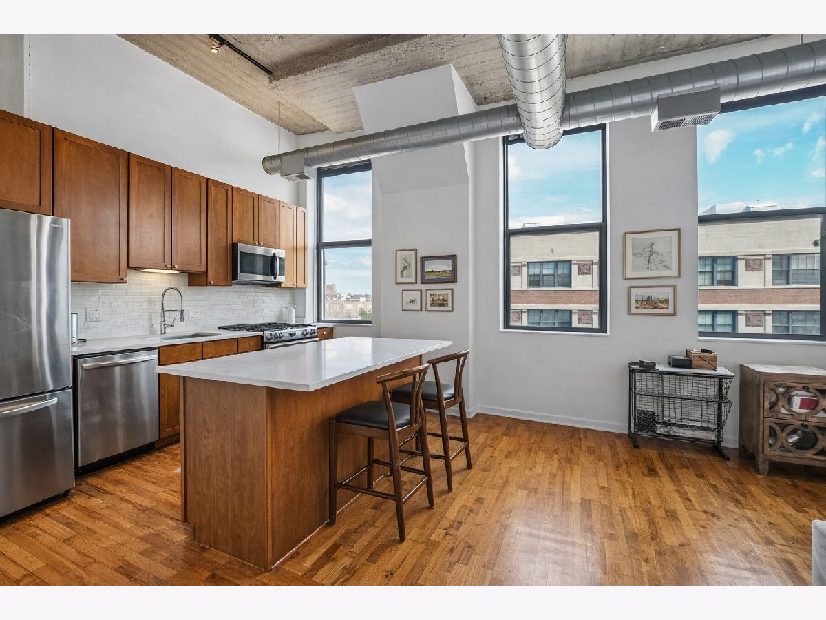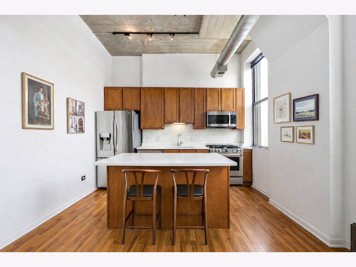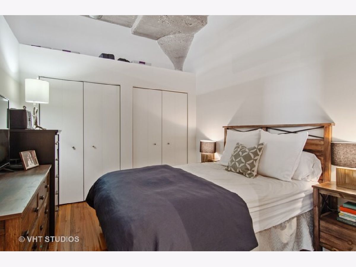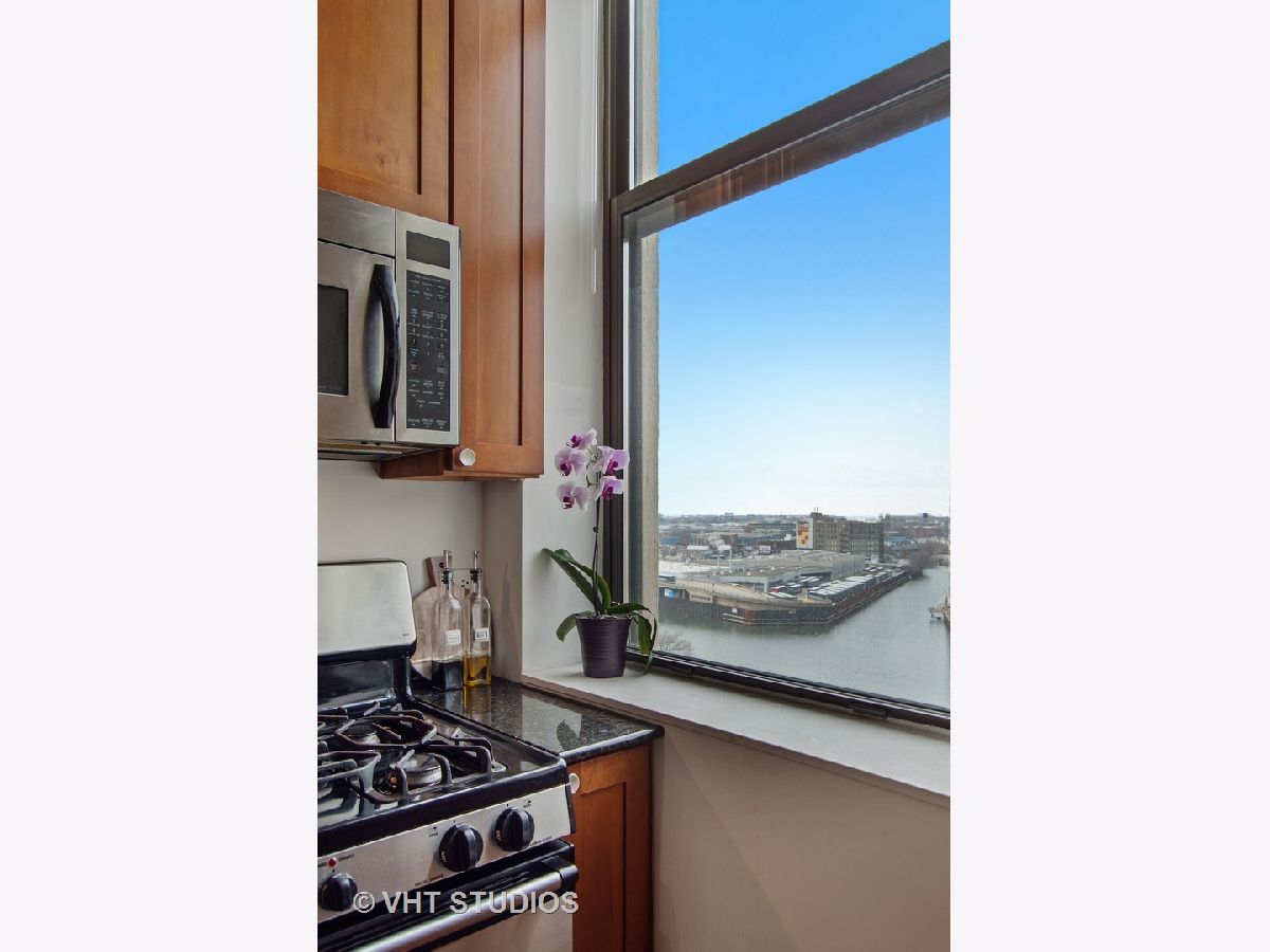 Stunning River North loft offering breathtaking river views and dramatic 12' concrete ceilings in a full-amenity building. This light-filled one-bedroom home features an open, airy layout with oversized windows that perfectly frame the Chicago River. The kitchen is designed for both function and style, with quartz counters, a generous island, stainless steel appliances, and 42" cabinetry. The living area is warm and inviting, complete with a gas fireplace, ample space for seating, and custom industrial shelving. King-size bedroom with organized Elfa closets plus a refreshed bathroom with new vanity, mirror, lighting and a soaking tub. Hardwood floors run throughout, in-unit laundry plus a private storage cage and access to exceptional building amenities, including 24-hour door staff, fitness center, dry cleaning services, and a spectacular rooftop deck with panoramic skyline views, grilling stations, and multiple lounge and dining areas. Pet-friendly with a covered Riverwalk area and just two blocks to the dog park. Monthly assessments include AT&T expanded cable with HBO, high-speed internet, water, and trash. Heated, attached garage parking available for $35,000. Unbeatable River North location just steps East Bank Club, Starbucks, and convenient access to the Brown Line.