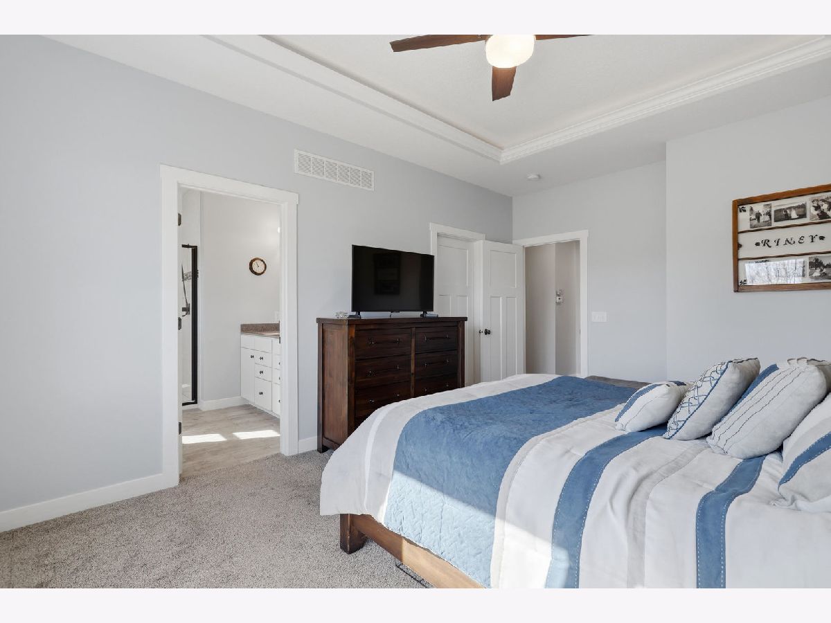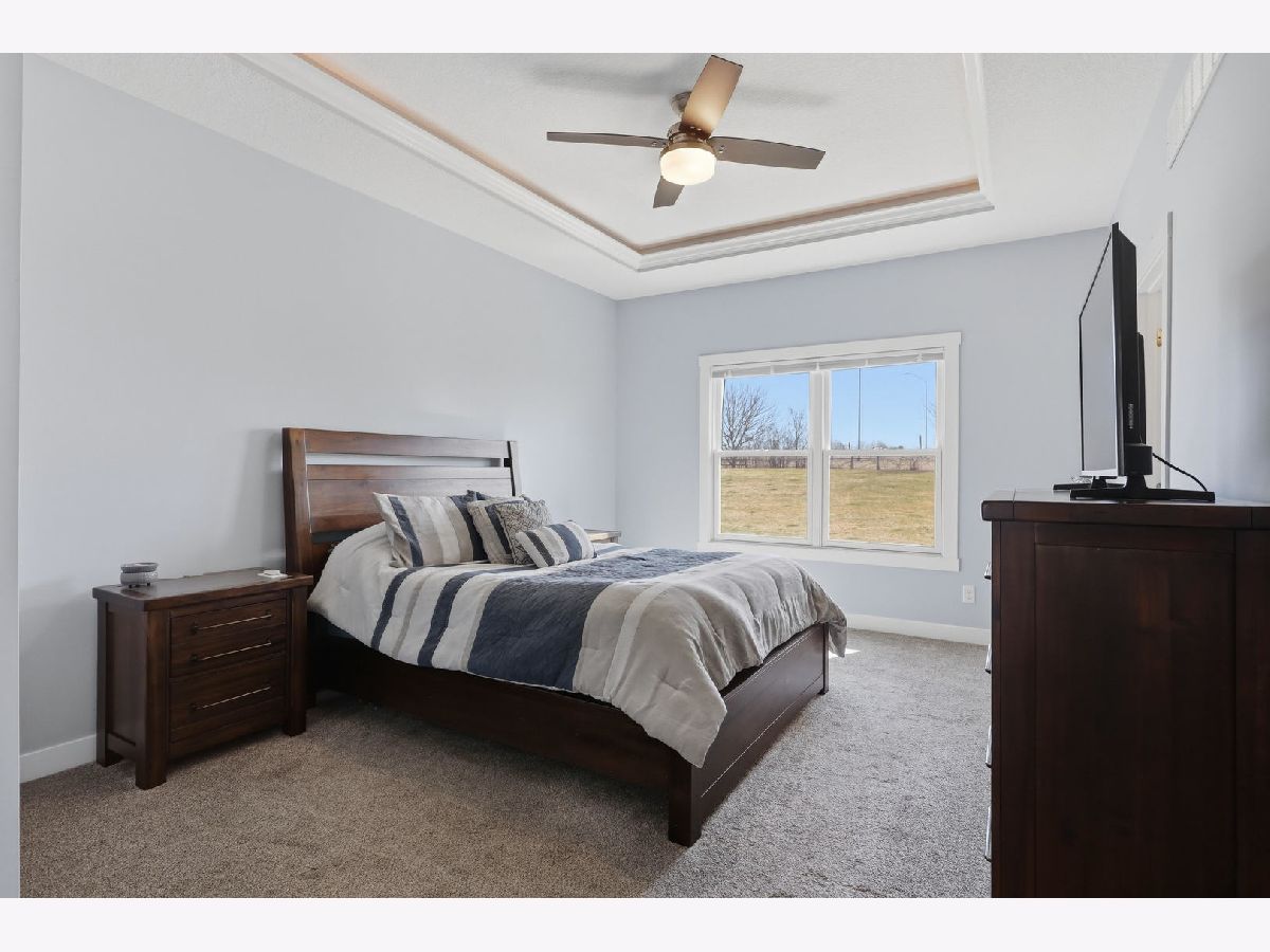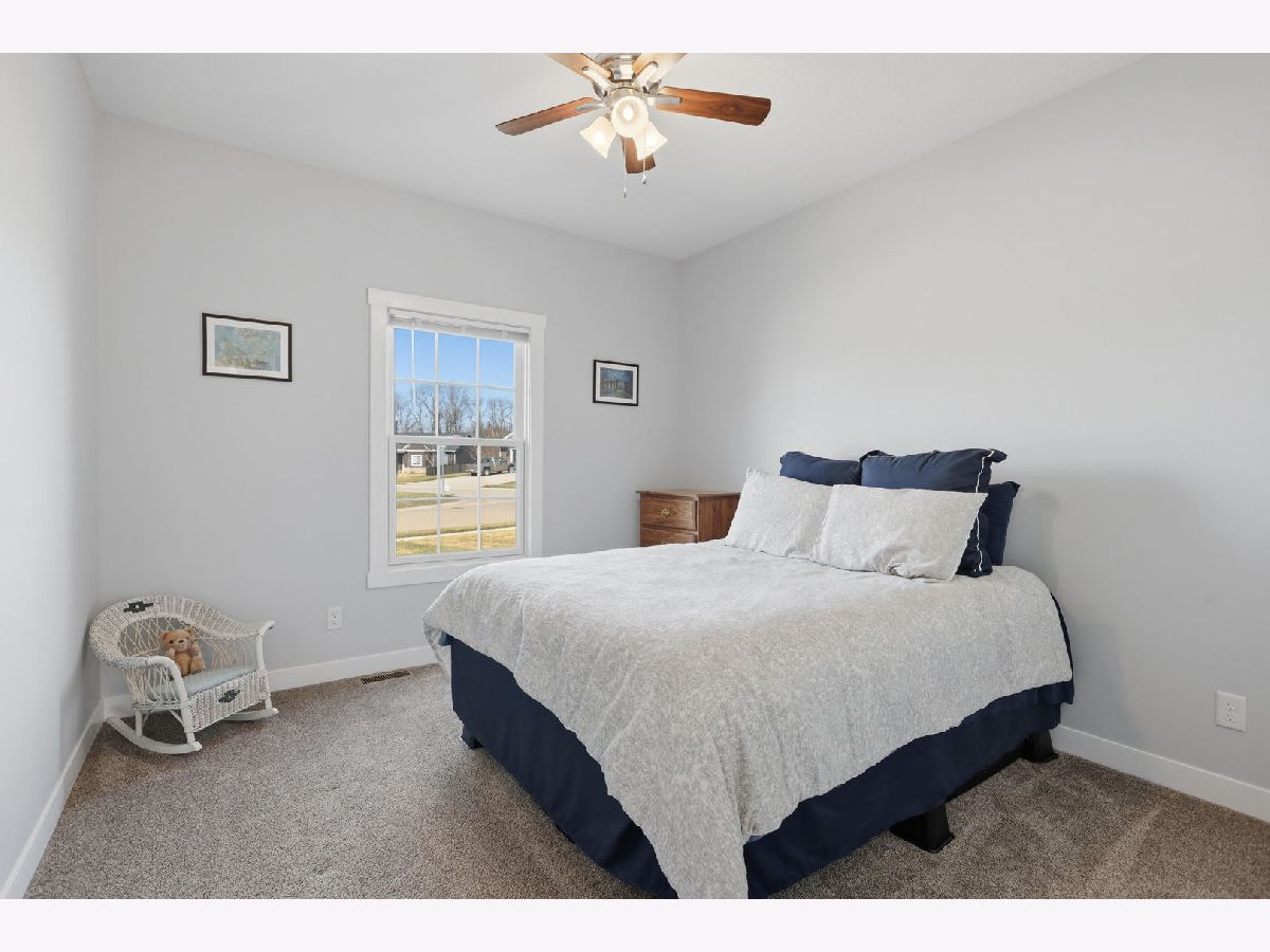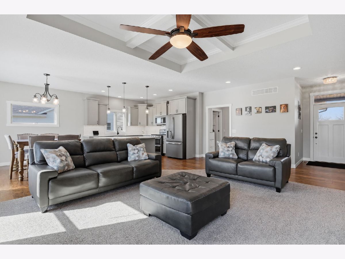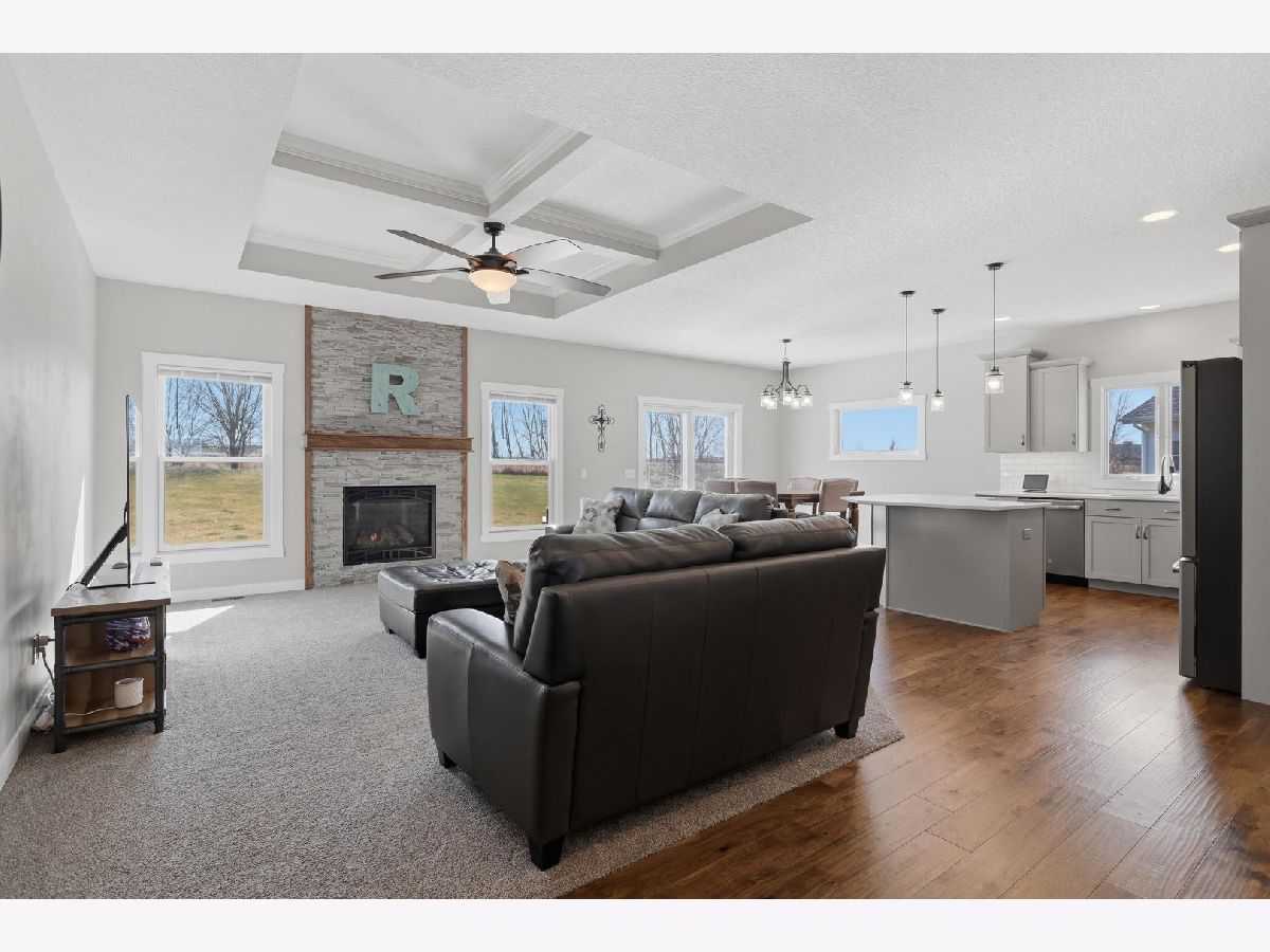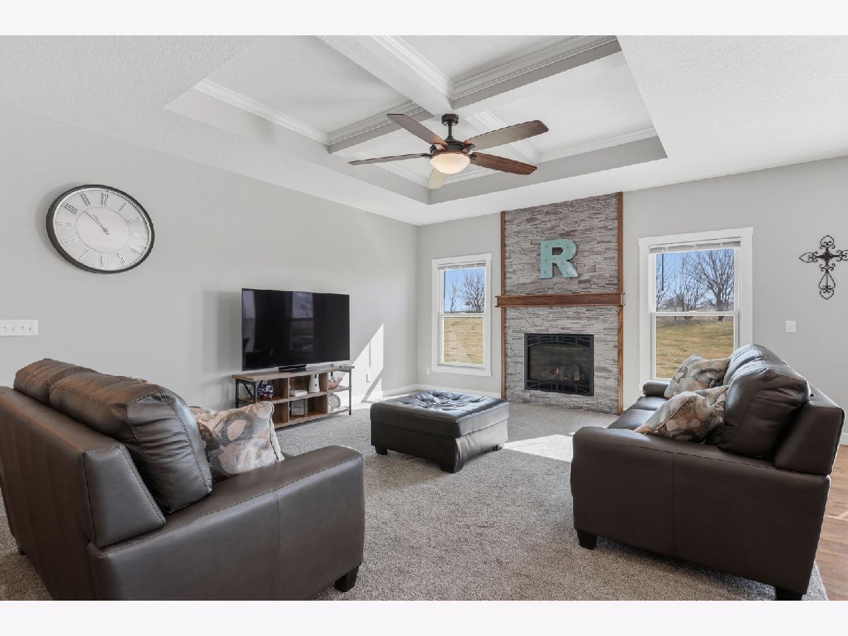 This newer, move-in ready ranch style home offers 4 bedrooms*, 3.5 bathrooms, a 3-car attached garage, and over 2,800 square feet of finished living space on a lot just over half an acre. The open-concept main level features a spacious great room with coffered tray ceilings, a gas fireplace, hardwood flooring, and a curved island that anchors the kitchen and dining areas. A sliding glass door off the dining space leads to a low-maintenance deck and an expansive backyard, providing ample space for outdoor activities. An additional patio on the side of the home connects to the garage service door, offering privacy and added flexibility for outdoor use. You will appreciate the spacious main floor laundry room. Primary suite has a walk-in closet and ensuite bath with dual sinks and a tiled shower. The finished basement expands the living space with a large recreation room, wet bar with refrigerator, a 4th bedroom, and a full bathroom. Additional unfinished areas offer room for storage, a home gym, workshop, or future finishing options. The attached 3-car garage features extra-tall ceilings, a 30-foot deep bay suitable for larger vehicles or equipment, and a floor drain. All appliances are included. Located within the Blue Grass Elementary School district. 4th Bedroom is a legal bedroom in the basement with egress. Special Financing Incentives available on this property from SIRVA Mortgage. Schedule your showing today to explore all this home has to offer.