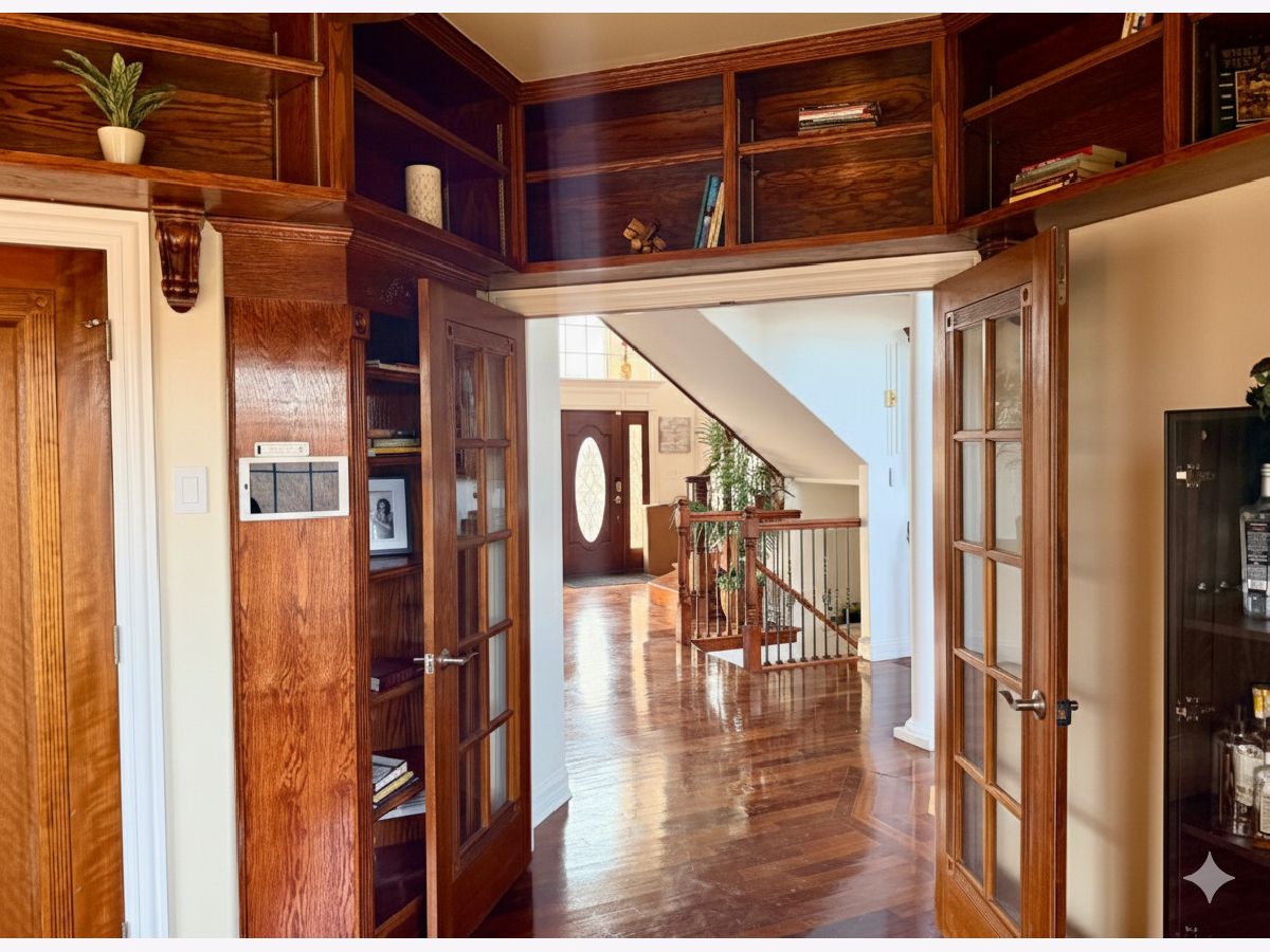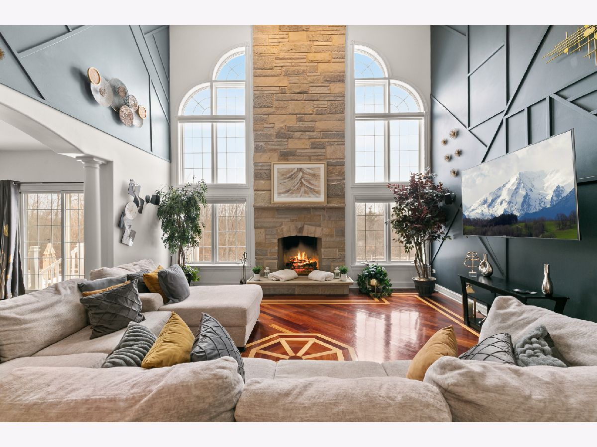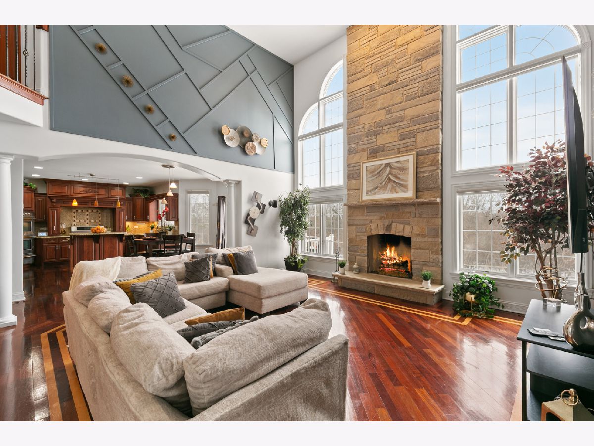 Refined living meets privacy in this executive two-story brick and stone residence, ideally positioned against a serene wooded backdrop. Offering 5 bedrooms and 4 full baths, the home delivers generous room to live, work, and entertain in comfort. A striking two-story entry and rich hardwood flooring set the tone on the main level. The formal living space is accented with crown molding, while the dining room features elegant double-crown detail. The show-stopping great room boasts 18-foot ceilings, a dramatic floor-to-ceiling stone fireplace, custom built-ins with a wine refrigerator, and seamless access to the spacious eat-in kitchen. Designed for both everyday living and gatherings, the kitchen includes custom cabinetry, stainless steel appliances, granite countertops, a modern backsplash, and a center island with breakfast seating. The first floor also offers a quiet library behind French doors with built-ins and hardwood floors, a fifth bedroom with a nearby full bath that works perfectly for guests or related living, and a large laundry/mudroom complete with built-in lockers. Upstairs, the primary retreat impresses with tray ceilings, crown molding, two walk-in closets, and a double-sided fireplace. The luxurious bath provides dual vanities, a whirlpool tub, and an expansive shower with body sprays and a bench. An adjoining flex room is ideal as a dressing area, nursery, lounge, or private escape. Bedroom two enjoys vaulted ceilings, a walk-in closet, and its own en-suite bath, while bedrooms three and four connect via a Jack-and-Jill layout featuring double sinks, a whirlpool tub, and separate shower. The full lookout basement is unfinished but ready for your vision, complete with a bath rough-in, a third fireplace, and access to the attached three-car garage equipped with an electric vehicle charging station. Outdoors, unwind in a tranquil yard with no rear neighbors, a newer deck for grilling or relaxing, and a brand-new concrete patio that expands entertaining possibilities. A park is just a short walk away. Important updates include two new furnaces added 2025, newer air conditioning, a water heater replaced in 2019, a tankless system added in 2022, water softener in 2022, ejector pump in 2023, plus the ease of central vacuum. Lovingly cared for and offered as-is, this exceptional property is ready for its next chapter.