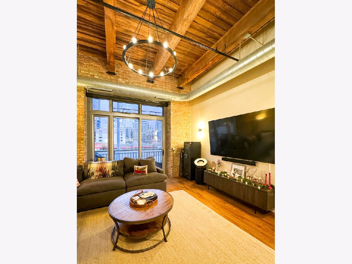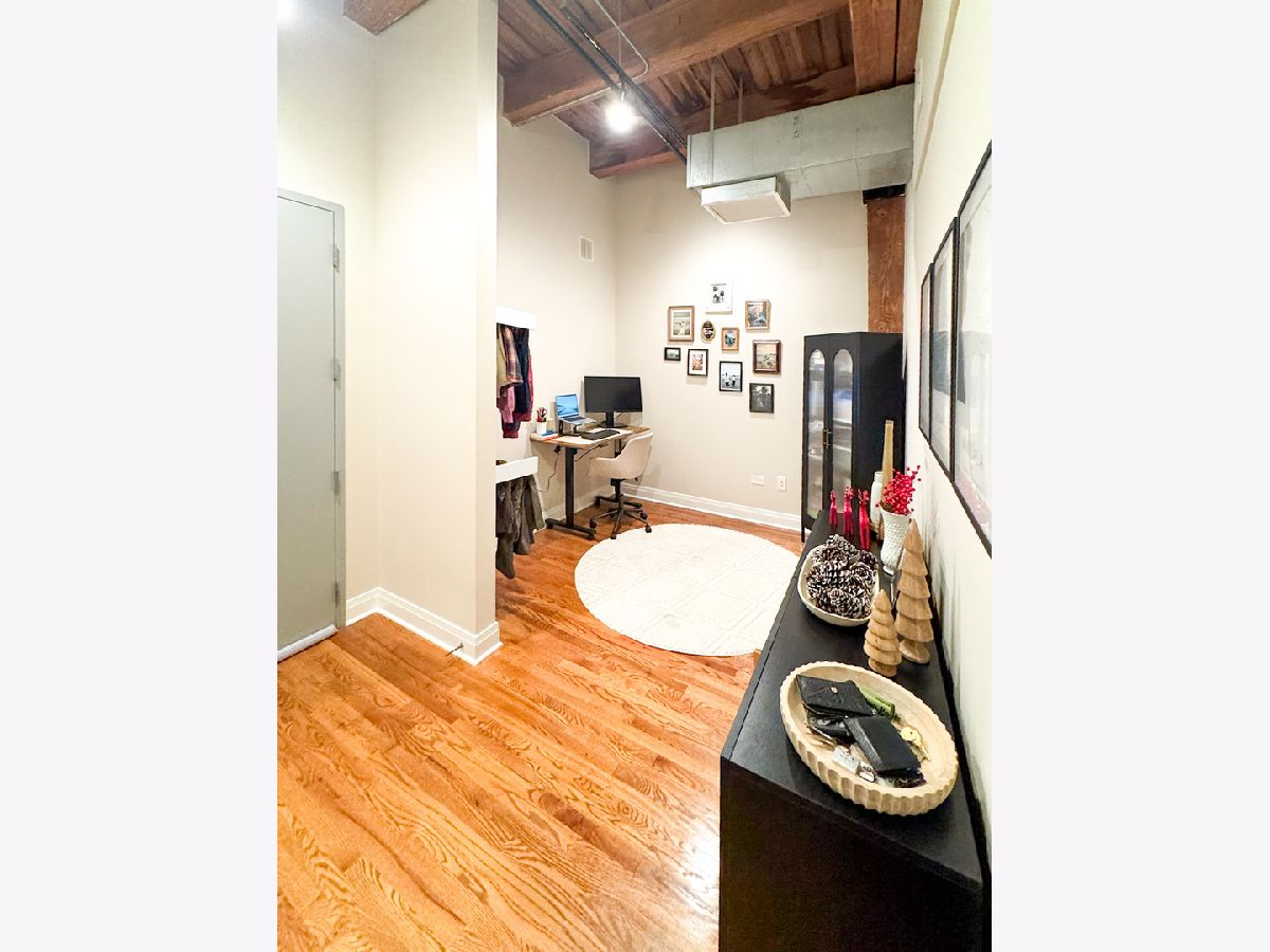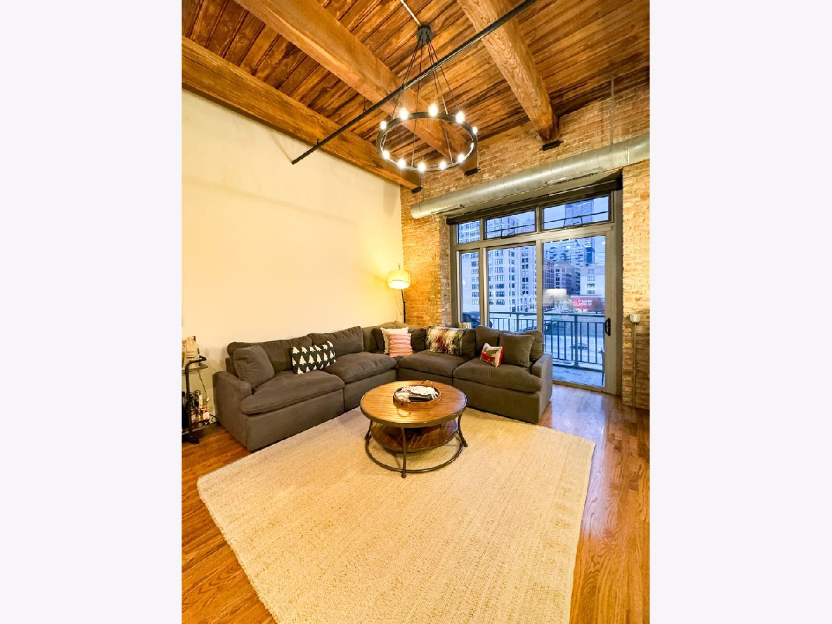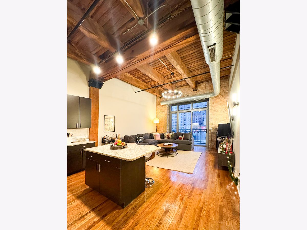 Welcome to Odyssey Lofts in Greek Town/West Loop. This 8-story building offers a unique and spacious one-bedroom plus den that could be converted to an additional bedroom, 1-bath loft featuring oak hardwood floors throughout. The exposed brick and timber detailed ceilings create a warm and rustic charm, with 12' plus timber beam ceilings that give the space character. A generous foyer welcomes you into the unit. The open floor plan concept connects the large living area to the updated kitchen, complete with 42" cabinets, granite countertops, stainless steel appliances, and backsplash, and an island with a breakfast bar. Living room has a floor to ceiling windows with convenient Hunter Douglas roller shade with a remote control. Through this window are unobstructed view of the city skyline and a private balcony. The convenience of an in-unit washer and dryer with new LG 2024 Front Loads adds to the overall ease of living in this incredible space. Additional upgrades include a new KitchenAid Dishwasher, and A/C condenser and furnace from a few years ago, ensuring your comfort and peace of mind. Additionally, a spacious 4' x 4' x 7' storage unit is included, providing you with the extra space you need for your belongings. For your convenience, exterior uncovered rental parking is potentially available on the building premises. Stay active in the building's fitness room. Enjoy the added value of heat, gas, Wi-Fi, and internet included in the monthly assessment. This location is a commuter's dream, with easy access to CTA/Metra trains, buses, and expressways. You'll also love the proximity to great shopping options, including Mariano's and Whole Foods, not to mention the fantastic dining choices in the nearby restaurant row. Don't miss out on this exceptional opportunity.