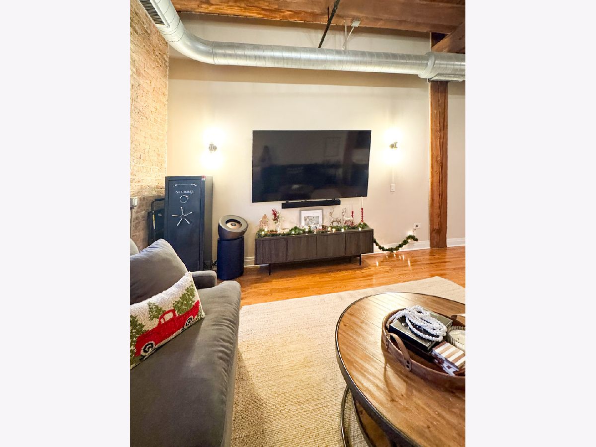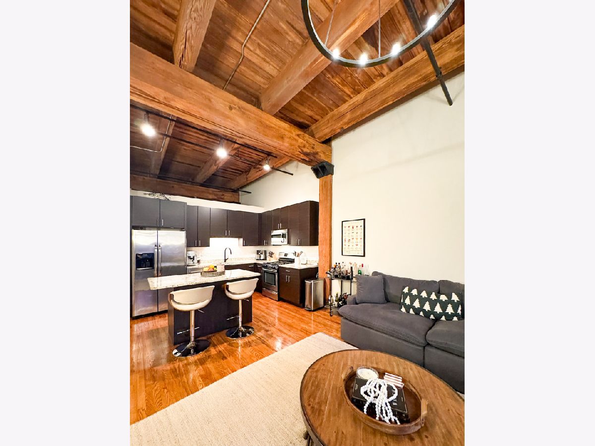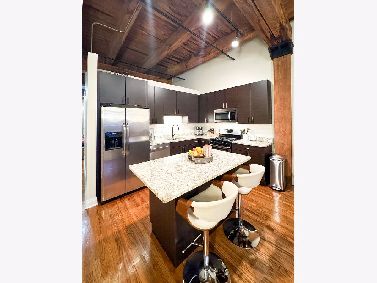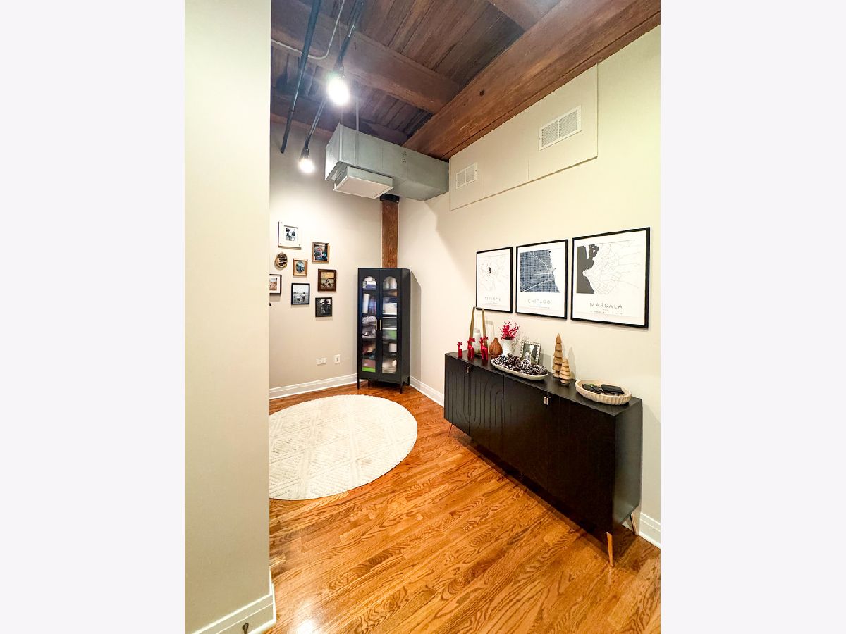 Welcome to Odyssey Lofts in Greek Town/West Loop. This 8-story building offers a unique and spacious one-bedroom plus den that could be converted to an additional bedroom, 1-bath loft featuring oak hardwood floors throughout. The exposed brick and timber detailed ceilings create a warm and rustic charm, with 12' plus timber beam ceilings that give the space character. A generous foyer welcomes you into the unit. The open floor plan concept connects the large living area to the updated kitchen, complete with 42" cabinets, granite countertops, stainless steel appliances, and backsplash, and an island with a breakfast bar. Living room has a floor to ceiling windows with convenient Hunter Douglas roller shade with a remote control. Through this window are unobstructed view of the city skyline and a private balcony. The convenience of an in-unit washer and dryer with new LG 2024 Front Loads adds to the overall ease of living in this incredible space. Additional upgrades include a new KitchenAid Dishwasher, and A/C condenser and furnace from a few years ago, ensuring your comfort and peace of mind. Additionally, a spacious 4' x 4' x 7' storage unit is included, providing you with the extra space you need for your belongings. For your convenience, exterior uncovered rental parking is potentially available on the building premises. Stay active in the building's fitness room. Enjoy the added value of heat, gas, Wi-Fi, and internet included in the monthly assessment. This location is a commuter's dream, with easy access to CTA/Metra trains, buses, and expressways. You'll also love the proximity to great shopping options, including Mariano's and Whole Foods, not to mention the fantastic dining choices in the nearby restaurant row. Don't miss out on this exceptional opportunity.