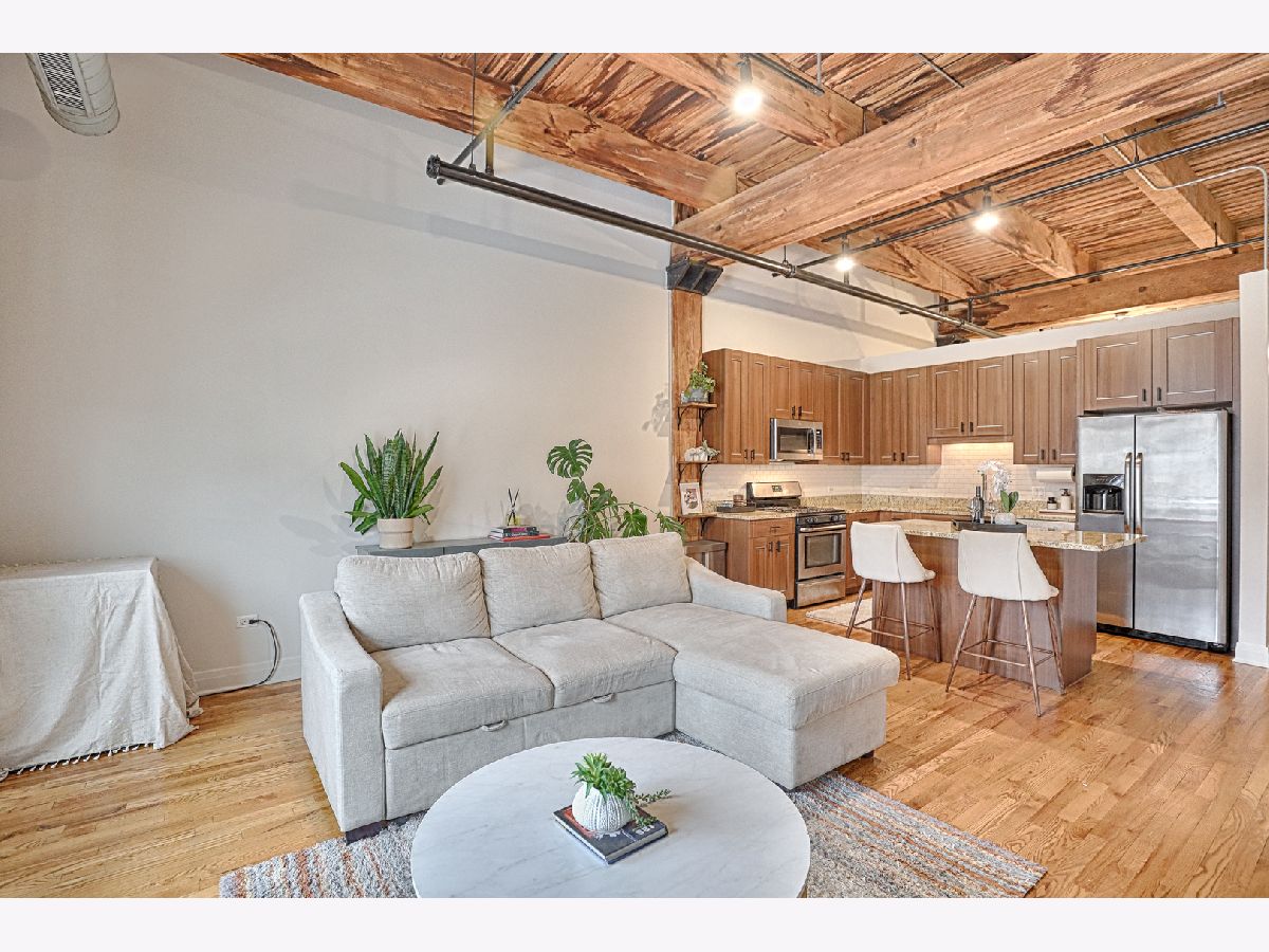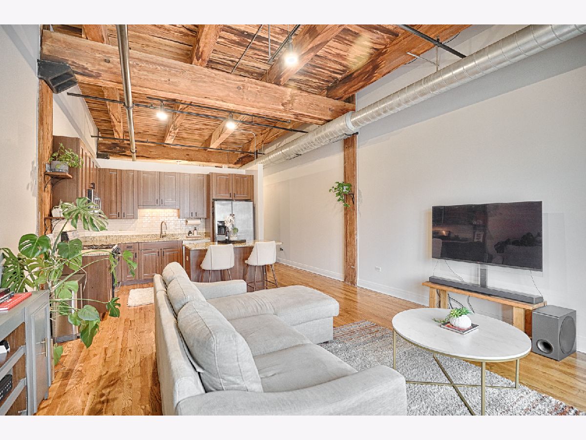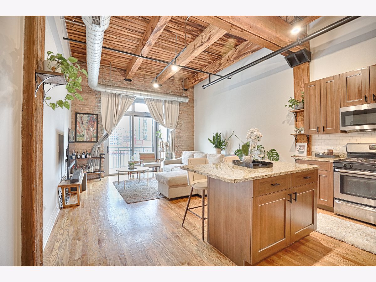 Welcome to Odyssey Lofts in Greektown/West Loop-an 8-story boutique loft building offering authentic character and an unbeatable location. This bright, spacious 1-bedroom + den, 1-bath home features oak hardwood floors throughout, exposed brick, and dramatic timber beam ceilings soaring 12+ feet (up to approximately 14 feet), creating a warm industrial vibe. A generous foyer opens to an inviting, open-concept layout ideal for everyday living and entertaining. The updated kitchen offers 42" cabinetry, granite countertops, stainless steel appliances, and a large island with breakfast-bar seating and ample prep space. The expansive living area is framed by floor-to-ceiling windows with city views and opens to a private balcony. Additional highlights include in-unit laundry (gas washer/dryer), central air, dishwasher, and a large storage unit (approximately 4' x 4' x 7'). Building amenities include a fitness room, Press Box dry cleaning, high-speed internet, and an inviting lobby. Monthly assessments include heat, gas, Wi-Fi, and internet. A commuter's dream with convenient access to CTA/Metra, buses, and expressways (90/94 & 290), plus close proximity to Mariano's, Whole Foods, Restaurant Row, Fulton Market, downtown, and top dining, shopping, and nightlife. Don't miss this exceptional West Loop loft. Rare opportunity: outdoor parking available for an additional $15,000.