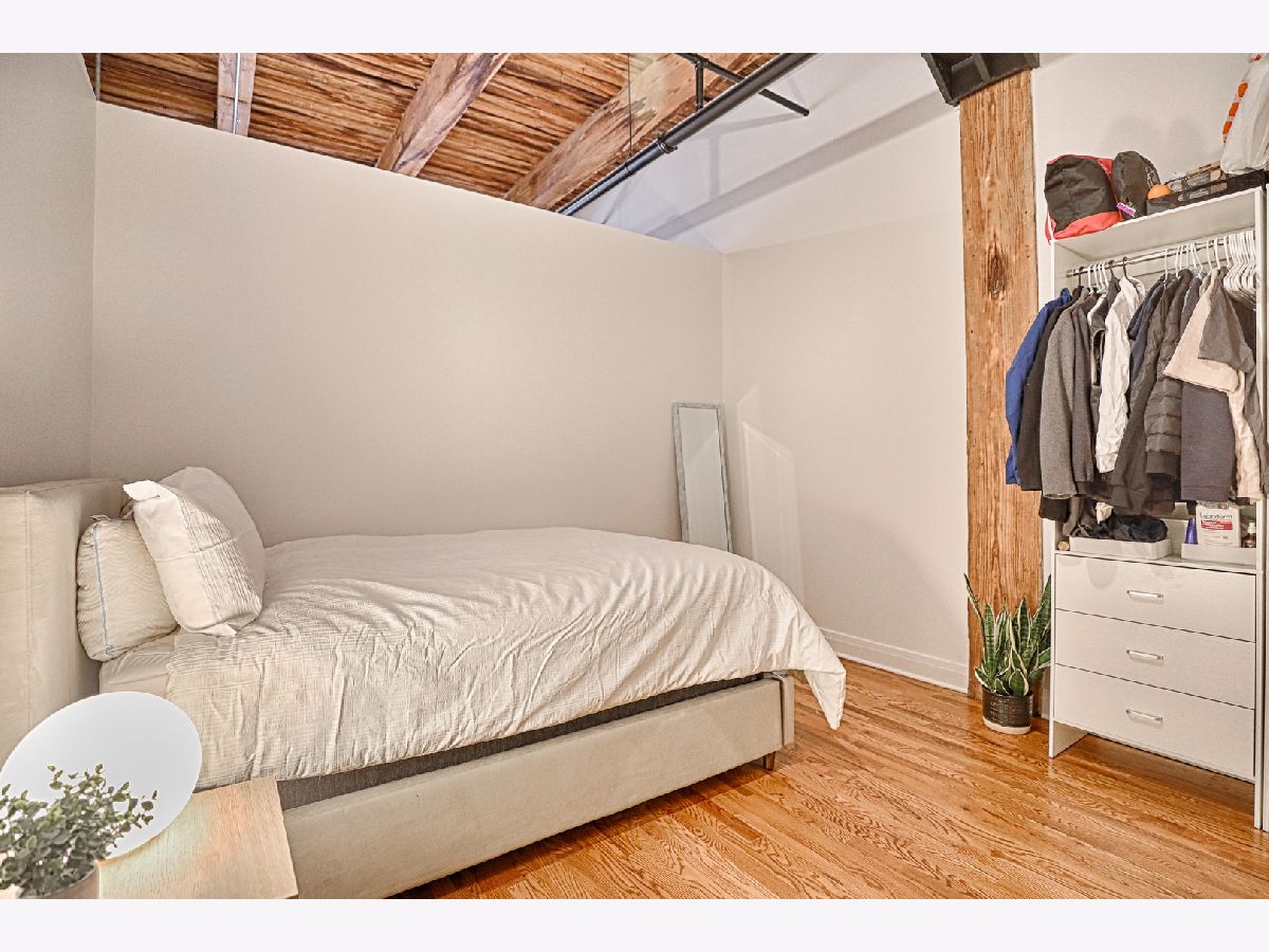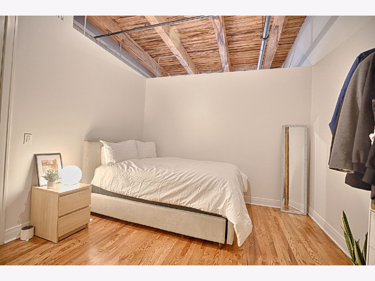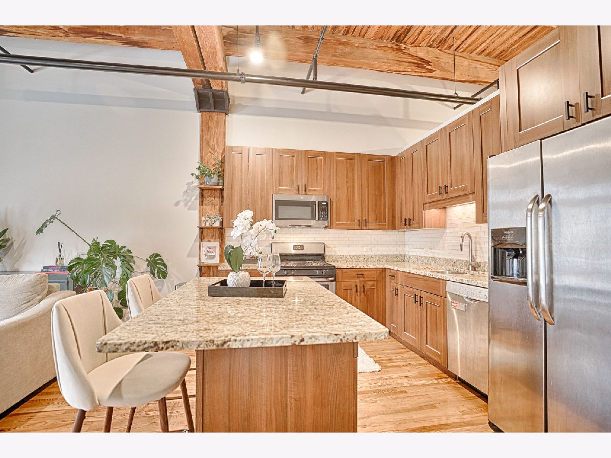 Welcome to Odyssey Lofts in Greektown/West Loop-an 8-story boutique loft building offering authentic character and an unbeatable location. This bright, spacious 1-bedroom + den, 1-bath home features oak hardwood floors throughout, exposed brick, and dramatic timber beam ceilings soaring 12+ feet (up to approximately 14 feet), creating a warm industrial vibe. A generous foyer opens to an inviting, open-concept layout ideal for everyday living and entertaining. The updated kitchen offers 42" cabinetry, granite countertops, stainless steel appliances, and a large island with breakfast-bar seating and ample prep space. The expansive living area is framed by floor-to-ceiling windows with city views and opens to a private balcony. Additional highlights include in-unit laundry (gas washer/dryer), central air, dishwasher, and a large storage unit (approximately 4' x 4' x 7'). Building amenities include a fitness room, Press Box dry cleaning, high-speed internet, and an inviting lobby. Monthly assessments include heat, gas, Wi-Fi, and internet. A commuter's dream with convenient access to CTA/Metra, buses, and expressways (90/94 & 290), plus close proximity to Mariano's, Whole Foods, Restaurant Row, Fulton Market, downtown, and top dining, shopping, and nightlife. Don't miss this exceptional West Loop loft. Rare opportunity: outdoor parking available for an additional $15,000.