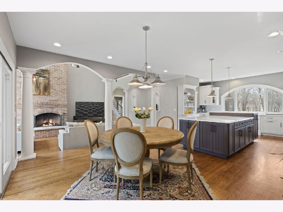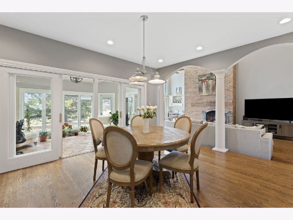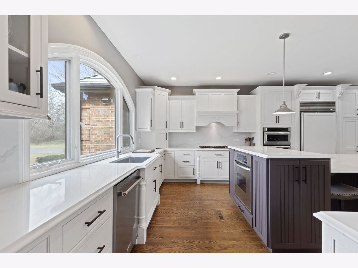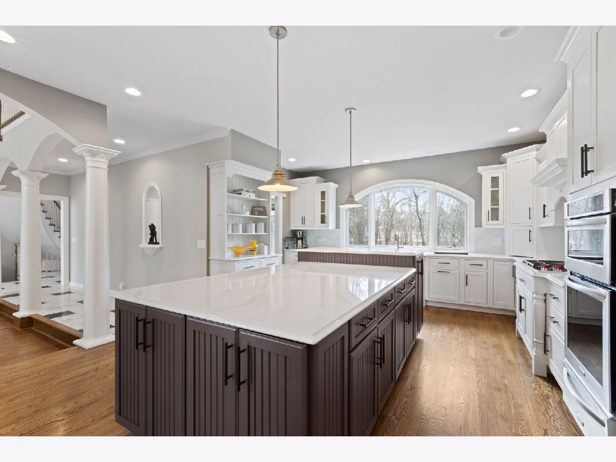 Set back along historic Ridge Road, this elegant brick manor stands with distinction along one of Lake Forest's most coveted residential corridors. A sweeping drive introduces a thoughtfully designed residence of over 4,200 square feet, highlighted by a first-floor primary suite and crowned by a new DaVinci roof in 2024. Framed by expansive, mature grounds spanning 1.38 acres, the home enjoys a serene, estate-like setting that feels both private and deeply rooted in its surroundings. Inside, a dramatic double-height foyer with curved staircase and marble floors introduces light-filled interiors defined by exquisite millwork, volume ceilings, and arched windows and doorways. Formal living and dining rooms provide spacious areas to gather and showcase sweeping views of the property. The soaring two-story family room with clerestory windows, fireplace, and wet bar, opens to a brick paver patio surrounded by mature landscaping. Timelessly renovated in 2024, the kitchen features granite counters, Sub-Zero refrigerator, double ovens, a large island, and sunny breakfast area with seamless entertaining flow to the dining, family, and sun rooms. The main-level primary suite is a true sanctuary with a fireplace, private office/sitting room, two walk-in closets and a large spa bath appointed with a whirlpool tub, walk-in shower, and dual vanities. Upstairs are three additional bedrooms, including one with an ensuite bath and two bedrooms share a very spacious hall bathroom. The finished lower level expands the home's versatility by threading together a large recreation space, a bar area with mini fridge, half bath, cedar closet, and abundant storage options. A first-floor laundry room, formal and informal powder bathrooms, and three-car attached garage, featuring epoxy flooring and EV charging, complete the home's amenities. Centrally located just moments from Lake Forest's historic downtown, lakefront, and nationally recognized schools, this Ridge Road residence represents a rare convergence of architectural character, privacy, and expansive land.