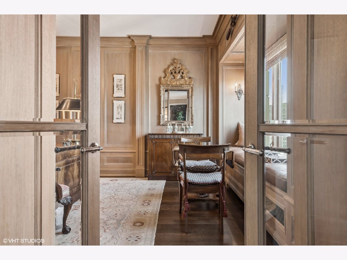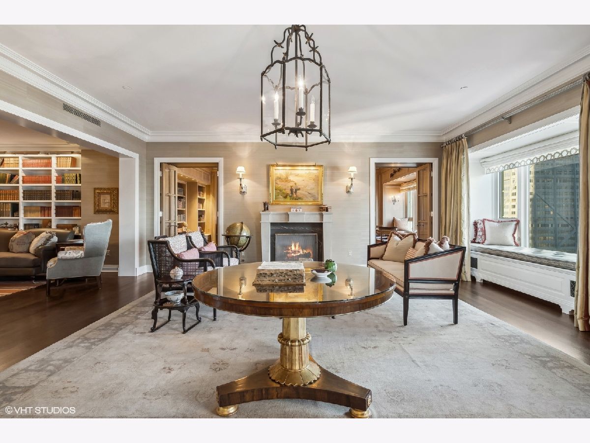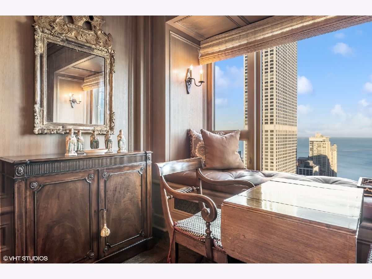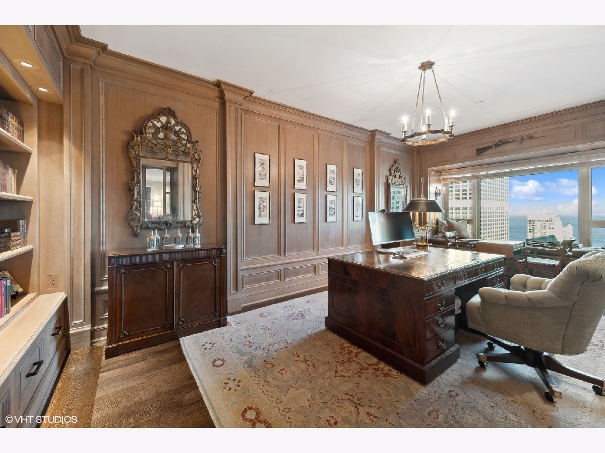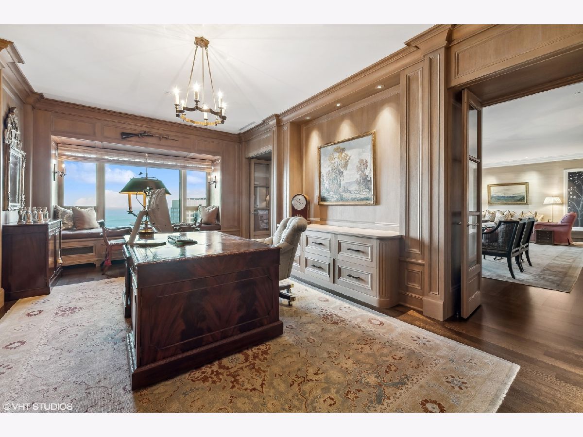 This extraordinary, elegant residence at Park Tower stands as a testament to sophistication and grandeur. Custom designed by Robert Klingel, elegance surrounds you in this expansive 5,250 square foot, 4 bedroom plus paneled library / office. This home has been meticulously crafted using only the finest materials and design. A grand foyer welcomes you into the home, setting the tone for the grandeur that lies beyond. A spectacular 30 x 20' living room is anchored by a fireplace and oversized windows that artfully frame the east-facing views of the lake and city. Two pairs of French doors with beveled glass leads you to the rich wood-paneled office, showcasing the craftsmanship that went into creating this sanctuary. The custom cabinets seamlessly integrate into the paneling, providing both functionality and aesthetic appeal. Each cabinet is a work of art, featuring handcrafted details and ornate handles that add a touch of luxury to the room. These cabinets are not only storage solutions but also contribute to the overall design, adding depth and dimension to the space. As you explore the office, you'll discover hidden gems - a discreetly concealed television and hidden storage. A graceful transition to the formal dining room dressed in embroidered silk wallcoverings by Holly Hunt that creates a backdrop of sophistication that sets the stage for memorable gatherings. The piece de resistance of this dining sanctuary is undoubtedly the crystal chandelier that hangs majestically from above, casting a soft, ambient glow that dances off the wallpaper, creating an atmosphere of intimacy and grace. The dining room flows into the eat-in kitchen offering south and east-facing views. Anchored by an oversized center island, the kitchen features quartzite countertops that complement the custom cabinetry with polished nickel detailing and a center chandelier. The extensive suite of appliances by Wolf and Sub Zero and a discrete butler's pantry that offers additional ovens, wine storage and prep space. The oversized balcony is just off the kitchen providing the perfect amount of space to relax and enjoy the city and lake views. An extension of the kitchen is a cozy breakfast nook that is nestled in the SE corner and flows seamlessly into the comforting embrace of the family room that exudes an atmosphere of casual elegance. The bedroom wing offers 4 bedrooms including a primary suite that is a study in grandeur. Featuring a 29x14 bedroom wrapped in windows to the west, an incredible organized closet, and a spacious ensuite bath with radiant heated floors. Elegantly appointed in marble with polished nickel fixtures throughout, the primary bathroom features two separate custom carved vanities, Rohl plumbing fixtures and a luxurious shower. Three additional bedrooms, South facing bedroom two is wrapped in elegant wallcoverings and is ensuite, while bedrooms three and four enjoy western views and sunsets. Completing the residence are a beautifully appointed powder room, a discreet utility room with side-by-side washer and vented dryer, and a separate service entrance for the ultimate in privacy. No detail has been overlooked, from the custom interior lighting, the luxurious drapery fabrics, the textured wall coverings to the motorized shades throughout and a Control 4 system that automates the home. This five-star dwelling surpasses all expectations. The NoMi Club, offering a state-of-the-art fitness center and an indoor pool, coupled with premium hotel services, elevates the resident experience to unprecedented levels. Two garage spaces and a capacious storage unit are included. Seize the ultimate lifestyle opportunity in this prime location, where every element of luxury living has been meticulously curated. This residence at Park Tower is more than a home; it's a symphony of indulgence in the heart of the city. 2023 Taxes: $68,350.03 (a $13K decrease from 2022).
