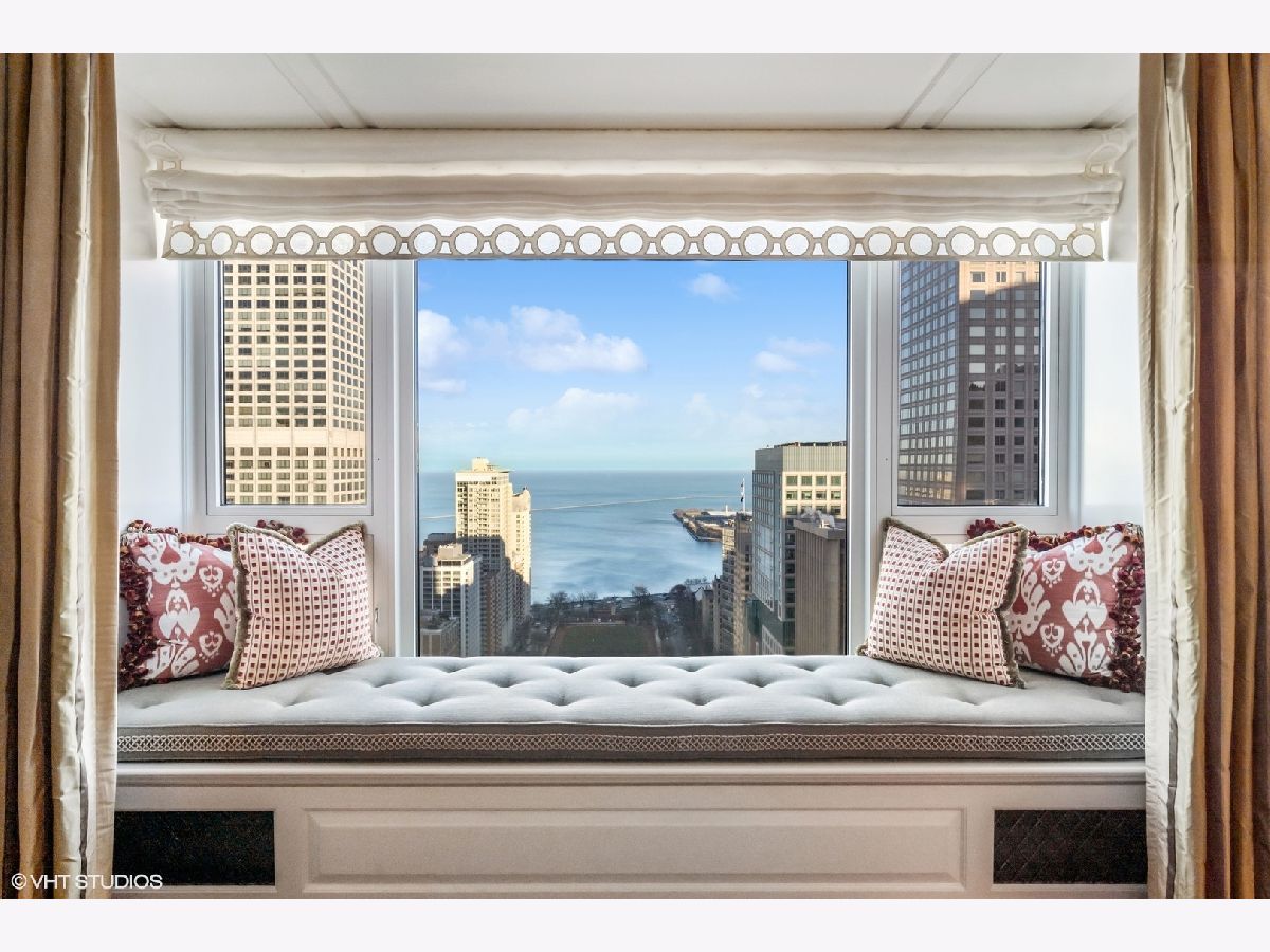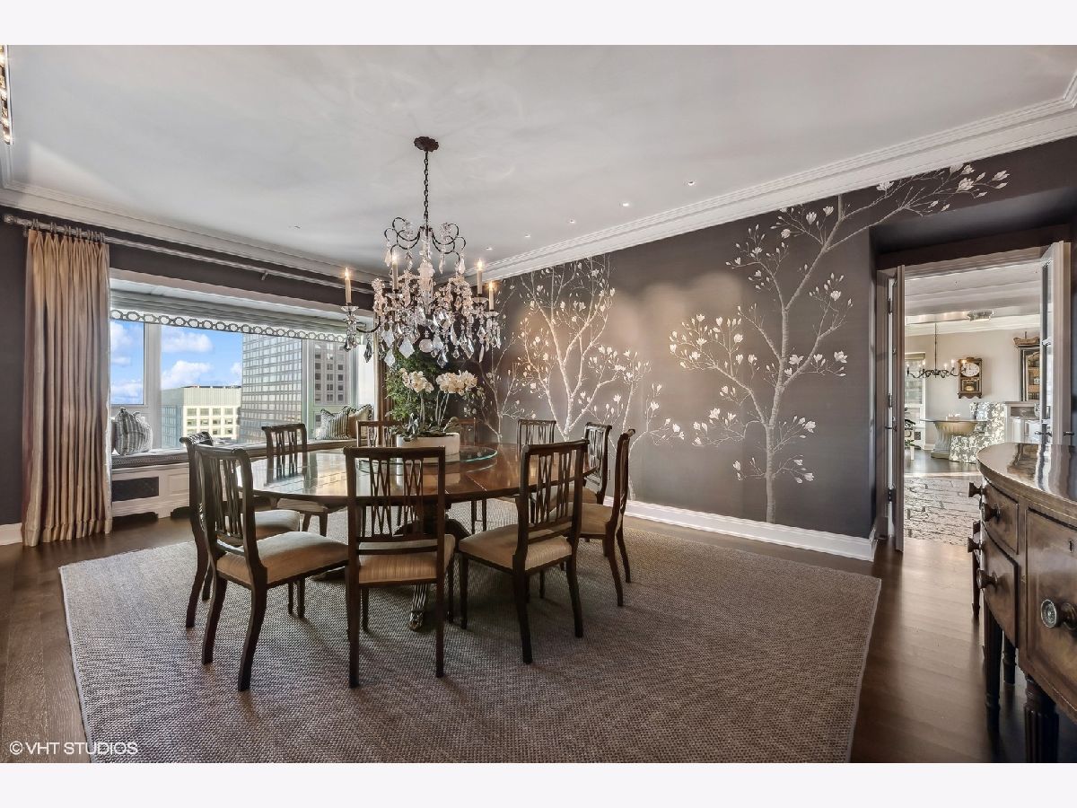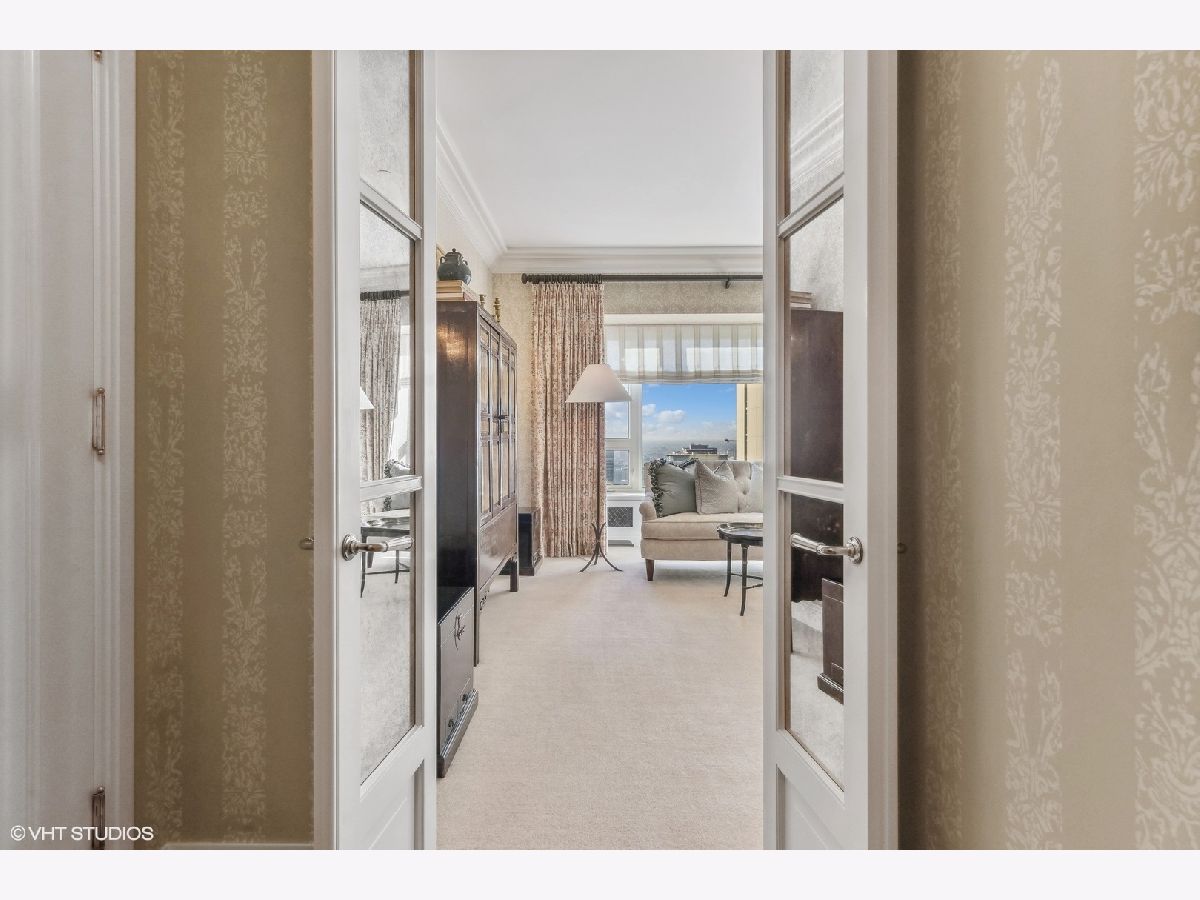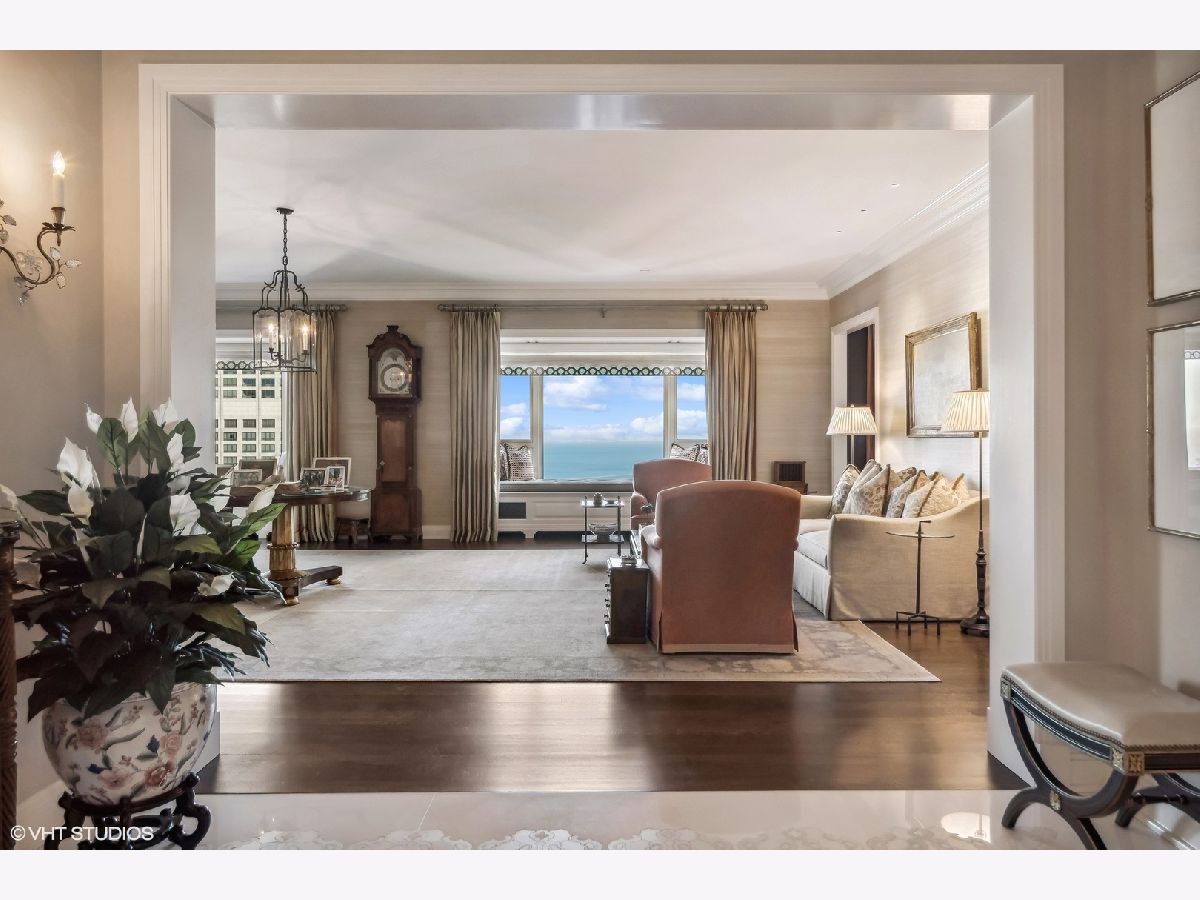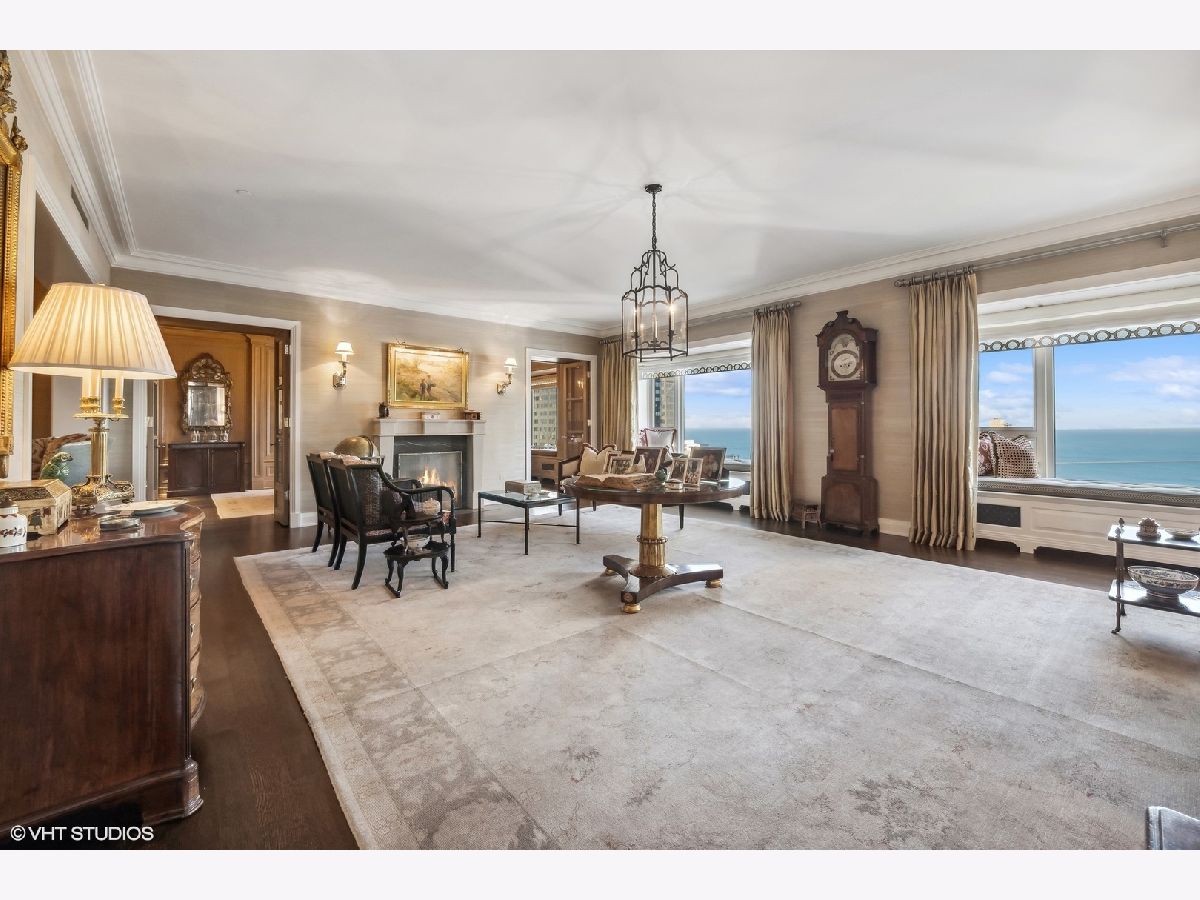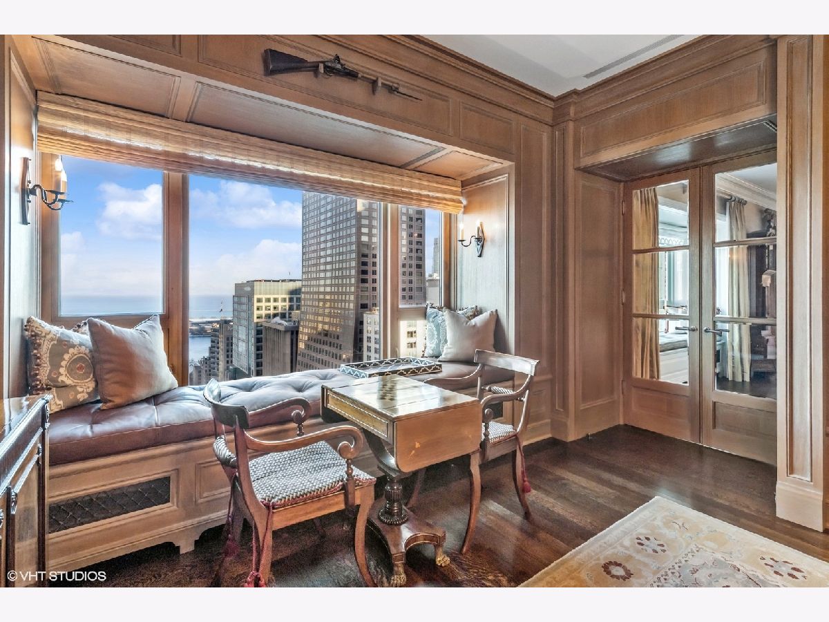 This extraordinary, elegant residence at Park Tower stands as a testament to sophistication and grandeur. Custom designed by Robert Klingel, elegance surrounds you in this expansive 5,250 square foot, 4 bedroom plus paneled library / office. This home has been meticulously crafted using only the finest materials and design. A grand foyer welcomes you into the home, setting the tone for the grandeur that lies beyond. A spectacular 30 x 20' living room is anchored by a fireplace and oversized windows that artfully frame the east-facing views of the lake and city. Two pairs of French doors with beveled glass leads you to the rich wood-paneled office, showcasing the craftsmanship that went into creating this sanctuary. The custom cabinets seamlessly integrate into the paneling, providing both functionality and aesthetic appeal. Each cabinet is a work of art, featuring handcrafted details and ornate handles that add a touch of luxury to the room. These cabinets are not only storage solutions but also contribute to the overall design, adding depth and dimension to the space. As you explore the office, you'll discover hidden gems - a discreetly concealed television and hidden storage. A graceful transition to the formal dining room dressed in embroidered silk wallcoverings by Holly Hunt that creates a backdrop of sophistication that sets the stage for memorable gatherings. The piece de resistance of this dining sanctuary is undoubtedly the crystal chandelier that hangs majestically from above, casting a soft, ambient glow that dances off the wallpaper, creating an atmosphere of intimacy and grace. The dining room flows into the eat-in kitchen offering south and east-facing views. Anchored by an oversized center island, the kitchen features quartzite countertops that complement the custom cabinetry with polished nickel detailing and a center chandelier. The extensive suite of appliances by Wolf and Sub Zero and a discrete butler's pantry that offers additional ovens, wine storage and prep space. The oversized balcony is just off the kitchen providing the perfect amount of space to relax and enjoy the city and lake views. An extension of the kitchen is a cozy breakfast nook that is nestled in the SE corner and flows seamlessly into the comforting embrace of the family room that exudes an atmosphere of casual elegance. The bedroom wing offers 4 bedrooms including a primary suite that is a study in grandeur. Featuring a 29x14 bedroom wrapped in windows to the west, an incredible organized closet, and a spacious ensuite bath with radiant heated floors. Elegantly appointed in marble with polished nickel fixtures throughout, the primary bathroom features two separate custom carved vanities, Rohl plumbing fixtures and a luxurious shower. Three additional bedrooms, South facing bedroom two is wrapped in elegant wallcoverings and is ensuite, while bedrooms three and four enjoy western views and sunsets. Completing the residence are a beautifully appointed powder room, a discreet utility room with side-by-side washer and vented dryer, and a separate service entrance for the ultimate in privacy. No detail has been overlooked, from the custom interior lighting, the luxurious drapery fabrics, the textured wall coverings to the motorized shades throughout and a Control 4 system that automates the home. This five-star dwelling surpasses all expectations. The NoMi Club, offering a state-of-the-art fitness center and an indoor pool, coupled with premium hotel services, elevates the resident experience to unprecedented levels. Two garage spaces and a capacious storage unit are included. Seize the ultimate lifestyle opportunity in this prime location, where every element of luxury living has been meticulously curated. This residence at Park Tower is more than a home; it's a symphony of indulgence in the heart of the city. 2023 Taxes: $68,350.03 (a $13K decrease from 2022).