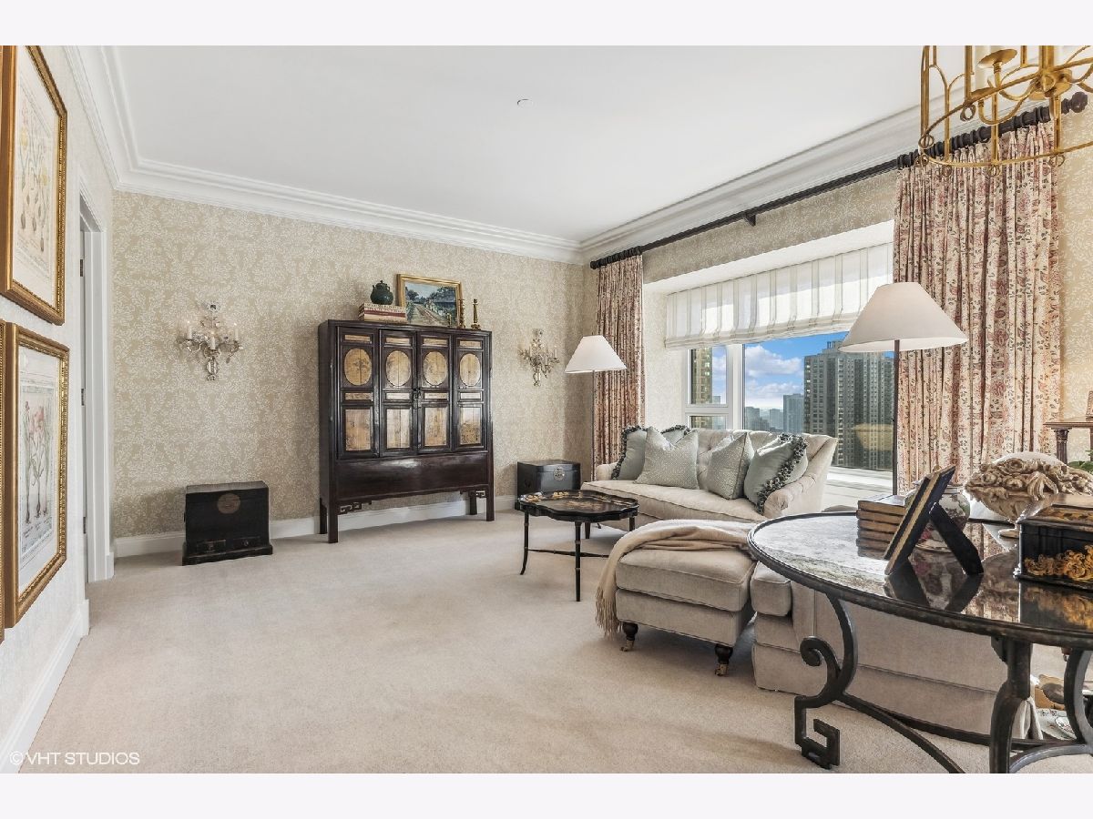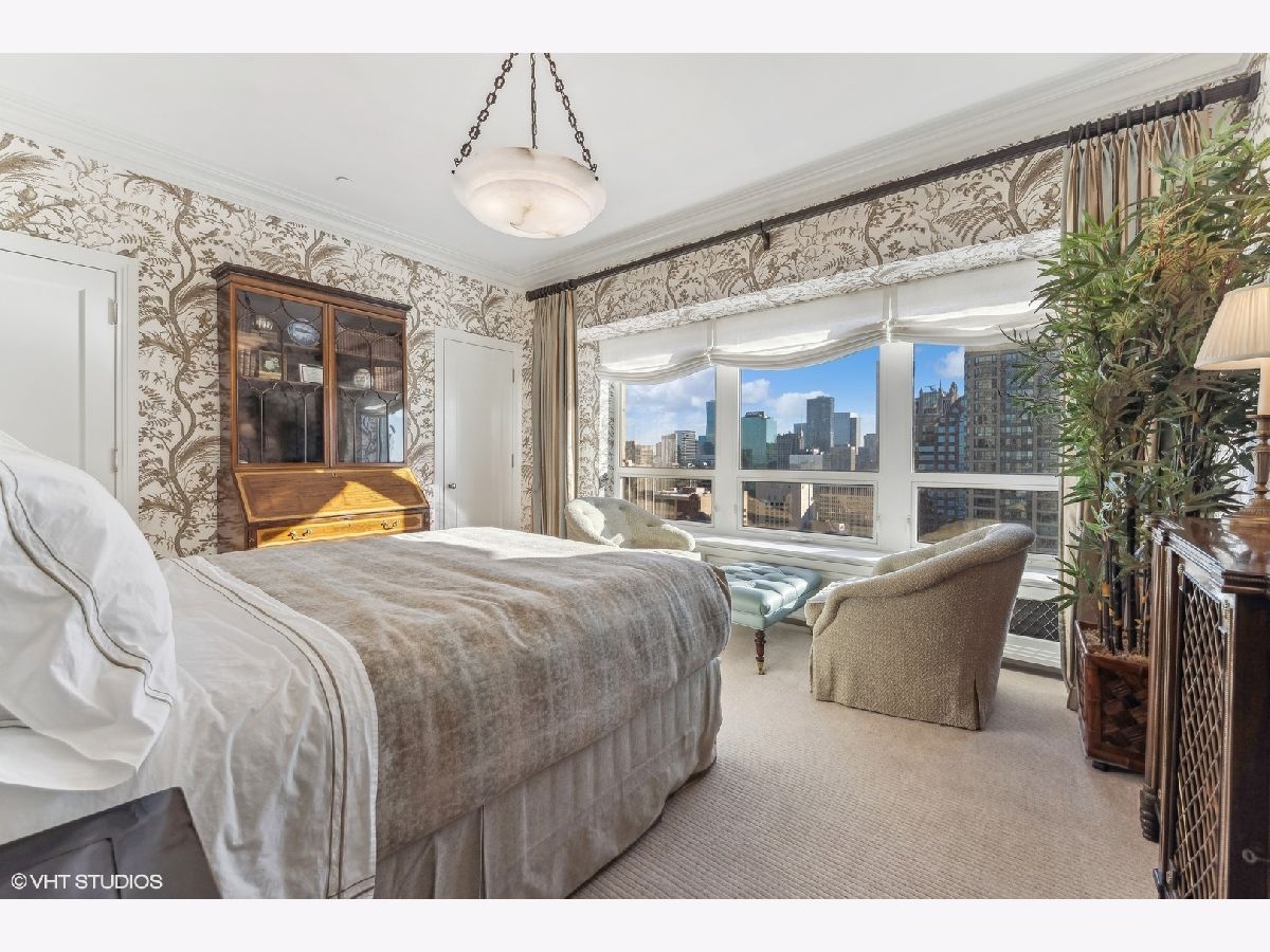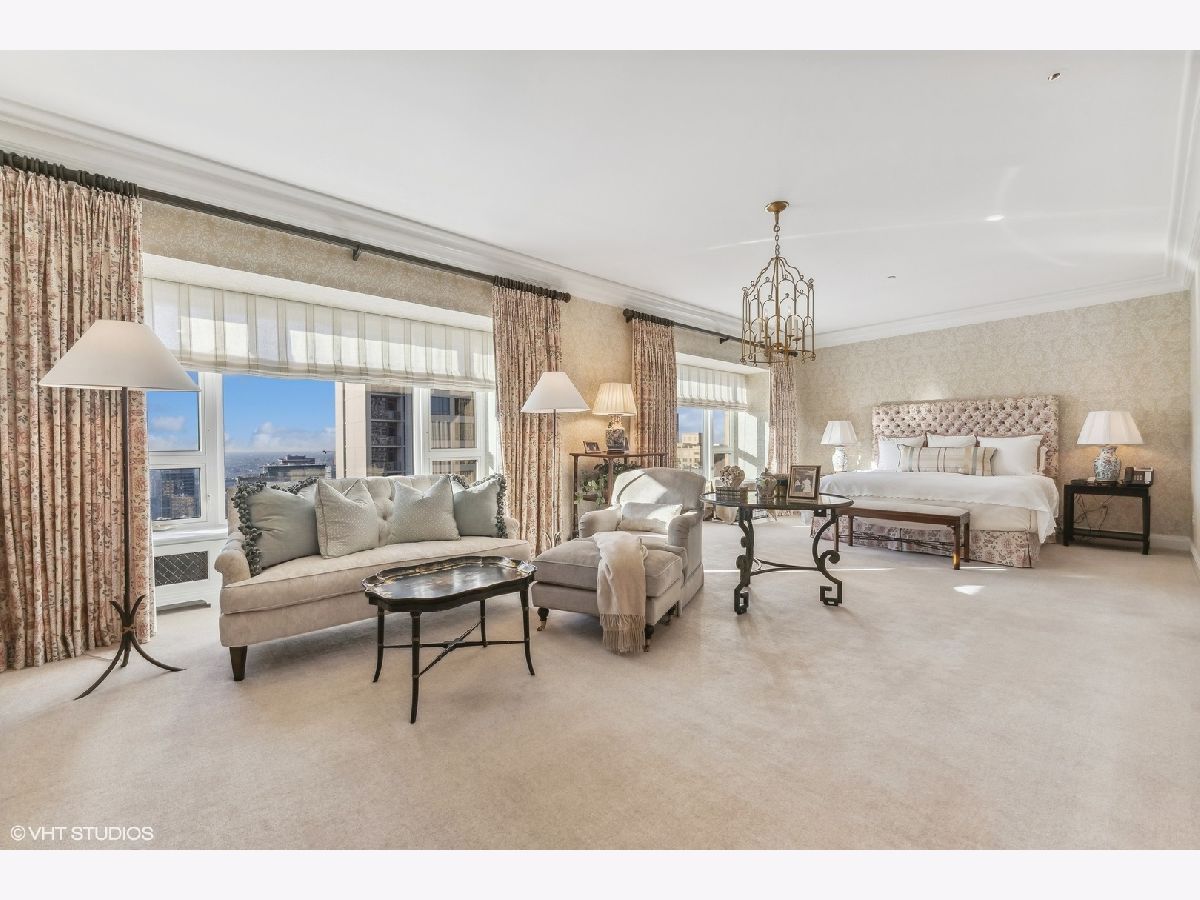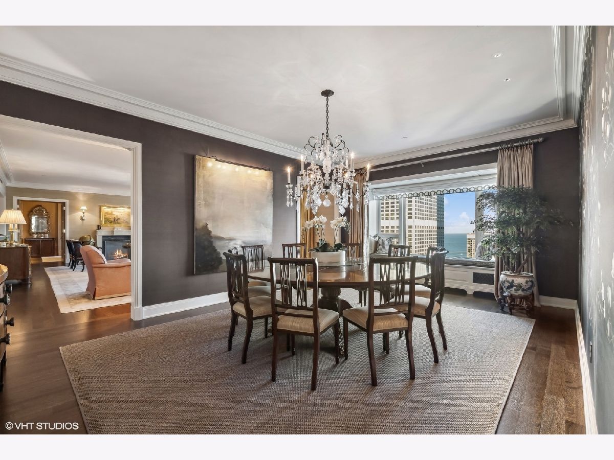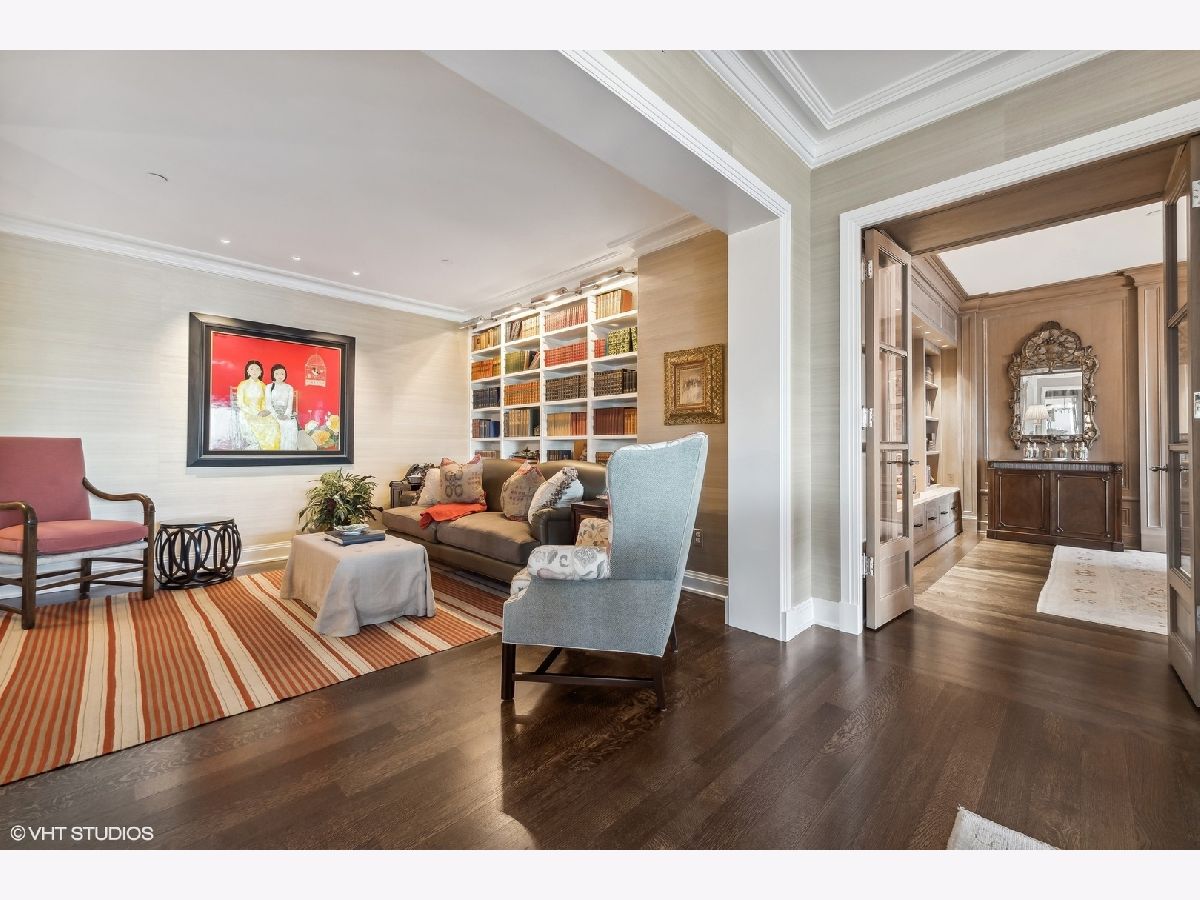 This extraordinary, elegant residence at Park Tower stands as a testament to sophistication and grandeur. Custom designed by Robert Klingel, elegance surrounds you in this expansive 5,250 square foot, 4 bedroom plus paneled library / office. This home has been meticulously crafted using only the finest materials and design. A grand foyer welcomes you into the home, setting the tone for the grandeur that lies beyond. A spectacular 30 x 20' living room is anchored by a fireplace and oversized windows that artfully frame the east-facing views of the lake and city. Two pairs of French doors with beveled glass leads you to the rich wood-paneled office, showcasing the craftsmanship that went into creating this sanctuary. The custom cabinets seamlessly integrate into the paneling, providing both functionality and aesthetic appeal. Each cabinet is a work of art, featuring handcrafted details and ornate handles that add a touch of luxury to the room. These cabinets are not only storage solutions but also contribute to the overall design, adding depth and dimension to the space. As you explore the office, you'll discover hidden gems - a discreetly concealed television and hidden storage. A graceful transition to the formal dining room dressed in embroidered silk wallcoverings by Holly Hunt that creates a backdrop of sophistication that sets the stage for memorable gatherings. The piece de resistance of this dining sanctuary is undoubtedly the crystal chandelier that hangs majestically from above, casting a soft, ambient glow that dances off the wallpaper, creating an atmosphere of intimacy and grace. The dining room flows into the eat-in kitchen offering south and east-facing views. Anchored by an oversized center island, the kitchen features quartzite countertops that complement the custom cabinetry with polished nickel detailing and a center chandelier. The extensive suite of appliances by Wolf and Sub Zero and a discrete butler's pantry that offers additional ovens, wine storage and prep space. The oversized balcony is just off the kitchen providing the perfect amount of space to relax and enjoy the city and lake views. An extension of the kitchen is a cozy breakfast nook that is nestled in the SE corner and flows seamlessly into the comforting embrace of the family room that exudes an atmosphere of casual elegance. The bedroom wing offers 4 bedrooms including a primary suite that is a study in grandeur. Featuring a 29x14 bedroom wrapped in windows to the west, an incredible organized closet, and a spacious ensuite bath with radiant heated floors. Elegantly appointed in marble with polished nickel fixtures throughout, the primary bathroom features two separate custom carved vanities, Rohl plumbing fixtures and a luxurious shower. Three additional bedrooms, South facing bedroom two is wrapped in elegant wallcoverings and is ensuite, while bedrooms three and four enjoy western views and sunsets. Completing the residence are a beautifully appointed powder room, a discreet utility room with side-by-side washer and vented dryer, and a separate service entrance for the ultimate in privacy. No detail has been overlooked, from the custom interior lighting, the luxurious drapery fabrics, the textured wall coverings to the motorized shades throughout and a Control 4 system that automates the home. This five-star dwelling surpasses all expectations. The NoMi Club, offering a state-of-the-art fitness center and an indoor pool, coupled with premium hotel services, elevates the resident experience to unprecedented levels. Two garage spaces and a capacious storage unit are included. Seize the ultimate lifestyle opportunity in this prime location, where every element of luxury living has been meticulously curated. This residence at Park Tower is more than a home; it's a symphony of indulgence in the heart of the city. 2023 Taxes: $68,350.03 (a $13K decrease from 2022).