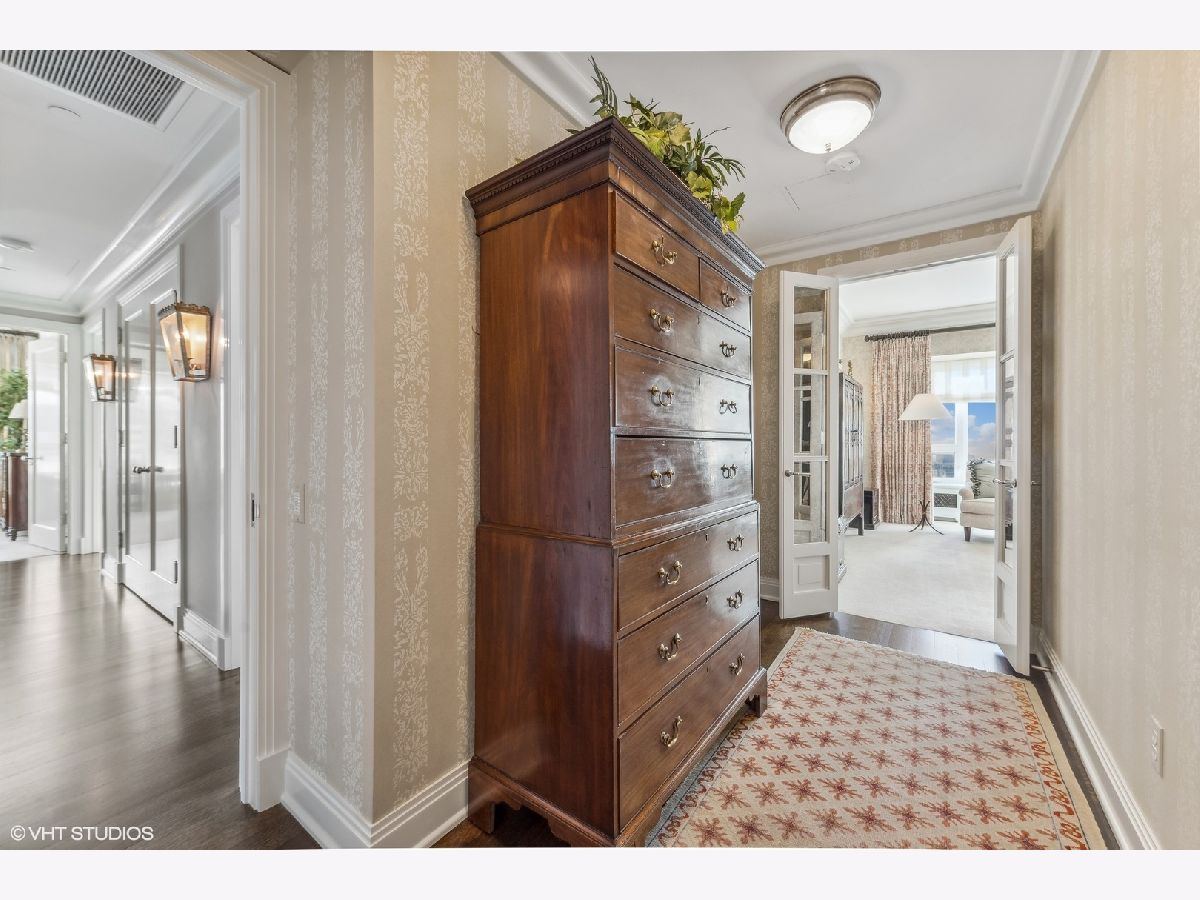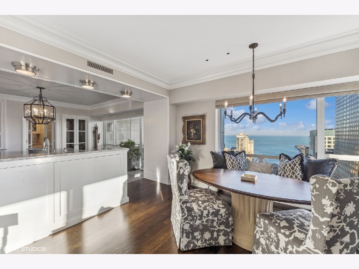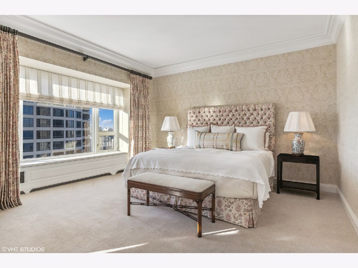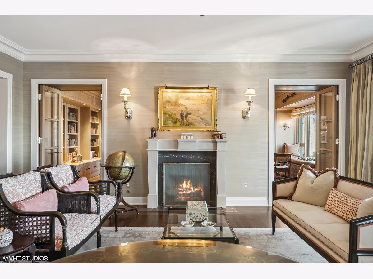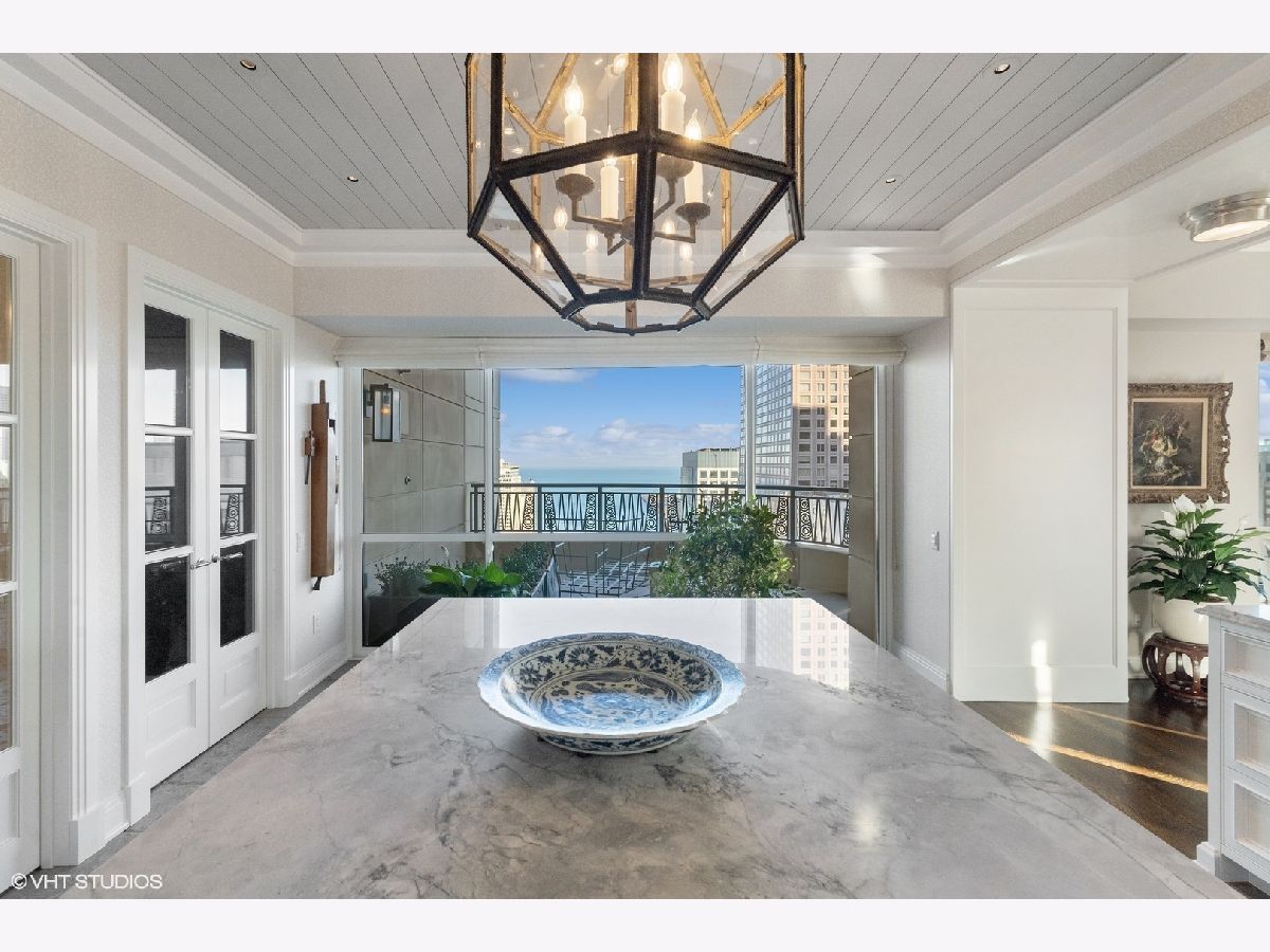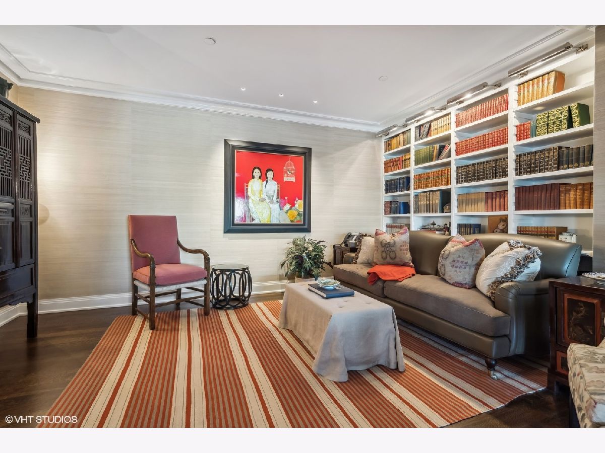 This extraordinary, elegant residence at Park Tower stands as a testament to sophistication and grandeur. Custom designed by Robert Klingel, elegance surrounds you in this expansive 5,250 square foot, 4 bedroom plus paneled library / office. This home has been meticulously crafted using only the finest materials and design. A grand foyer welcomes you into the home, setting the tone for the grandeur that lies beyond. A spectacular 30 x 20' living room is anchored by a fireplace and oversized windows that artfully frame the east-facing views of the lake and city. Two pairs of French doors with beveled glass leads you to the rich wood-paneled office, showcasing the craftsmanship that went into creating this sanctuary. The custom cabinets seamlessly integrate into the paneling, providing both functionality and aesthetic appeal. Each cabinet is a work of art, featuring handcrafted details and ornate handles that add a touch of luxury to the room. These cabinets are not only storage solutions but also contribute to the overall design, adding depth and dimension to the space. As you explore the office, you'll discover hidden gems - a discreetly concealed television and hidden storage. A graceful transition to the formal dining room dressed in embroidered silk wallcoverings by Holly Hunt that creates a backdrop of sophistication that sets the stage for memorable gatherings. The piece de resistance of this dining sanctuary is undoubtedly the crystal chandelier that hangs majestically from above, casting a soft, ambient glow that dances off the wallpaper, creating an atmosphere of intimacy and grace. The dining room flows into the eat-in kitchen offering south and east-facing views. Anchored by an oversized center island, the kitchen features quartzite countertops that complement the custom cabinetry with polished nickel detailing and a center chandelier. The extensive suite of appliances by Wolf and Sub Zero and a discrete butler's pantry that offers additional ovens, wine storage and prep space. The oversized balcony is just off the kitchen providing the perfect amount of space to relax and enjoy the city and lake views. An extension of the kitchen is a cozy breakfast nook that is nestled in the SE corner and flows seamlessly into the comforting embrace of the family room that exudes an atmosphere of casual elegance. The bedroom wing offers 4 bedrooms including a primary suite that is a study in grandeur. Featuring a 29x14 bedroom wrapped in windows to the west, an incredible organized closet, and a spacious ensuite bath with radiant heated floors. Elegantly appointed in marble with polished nickel fixtures throughout, the primary bathroom features two separate custom carved vanities, Rohl plumbing fixtures and a luxurious shower. Three additional bedrooms, South facing bedroom two is wrapped in elegant wallcoverings and is ensuite, while bedrooms three and four enjoy western views and sunsets. Completing the residence are a beautifully appointed powder room, a discreet utility room with side-by-side washer and vented dryer, and a separate service entrance for the ultimate in privacy. No detail has been overlooked, from the custom interior lighting, the luxurious drapery fabrics, the textured wall coverings to the motorized shades throughout and a Control 4 system that automates the home. This five-star dwelling surpasses all expectations. The NoMi Club, offering a state-of-the-art fitness center and an indoor pool, coupled with premium hotel services, elevates the resident experience to unprecedented levels. Two garage spaces and a capacious storage unit are included. Seize the ultimate lifestyle opportunity in this prime location, where every element of luxury living has been meticulously curated. This residence at Park Tower is more than a home; it's a symphony of indulgence in the heart of the city. 2023 Taxes: $68,350.03 (a $13K decrease from 2022).