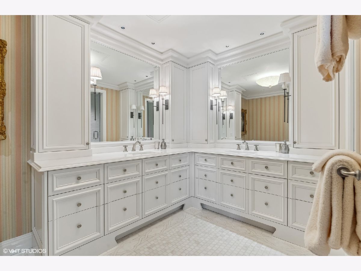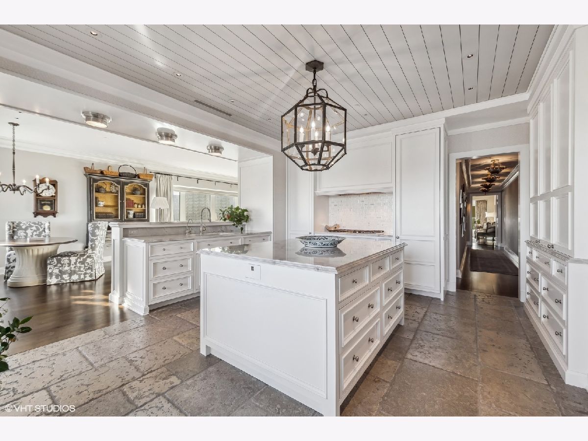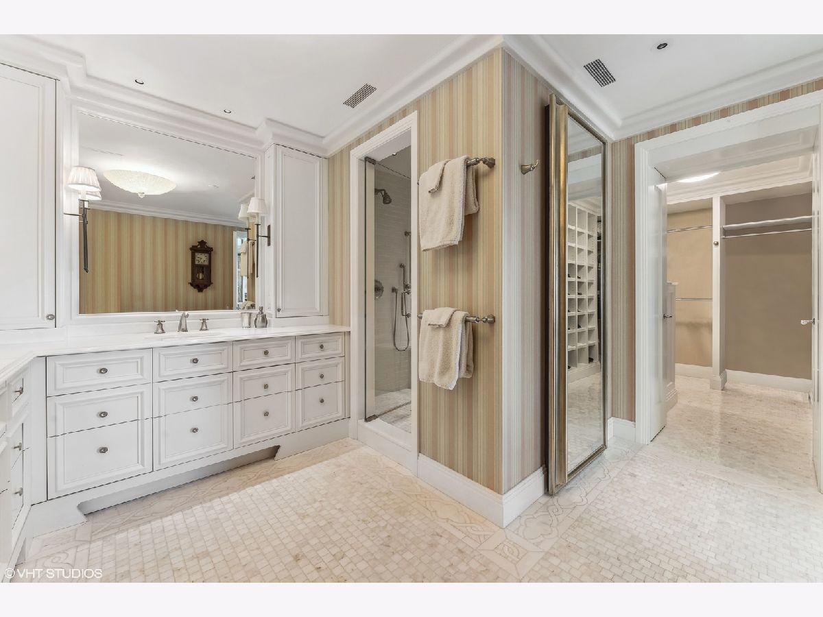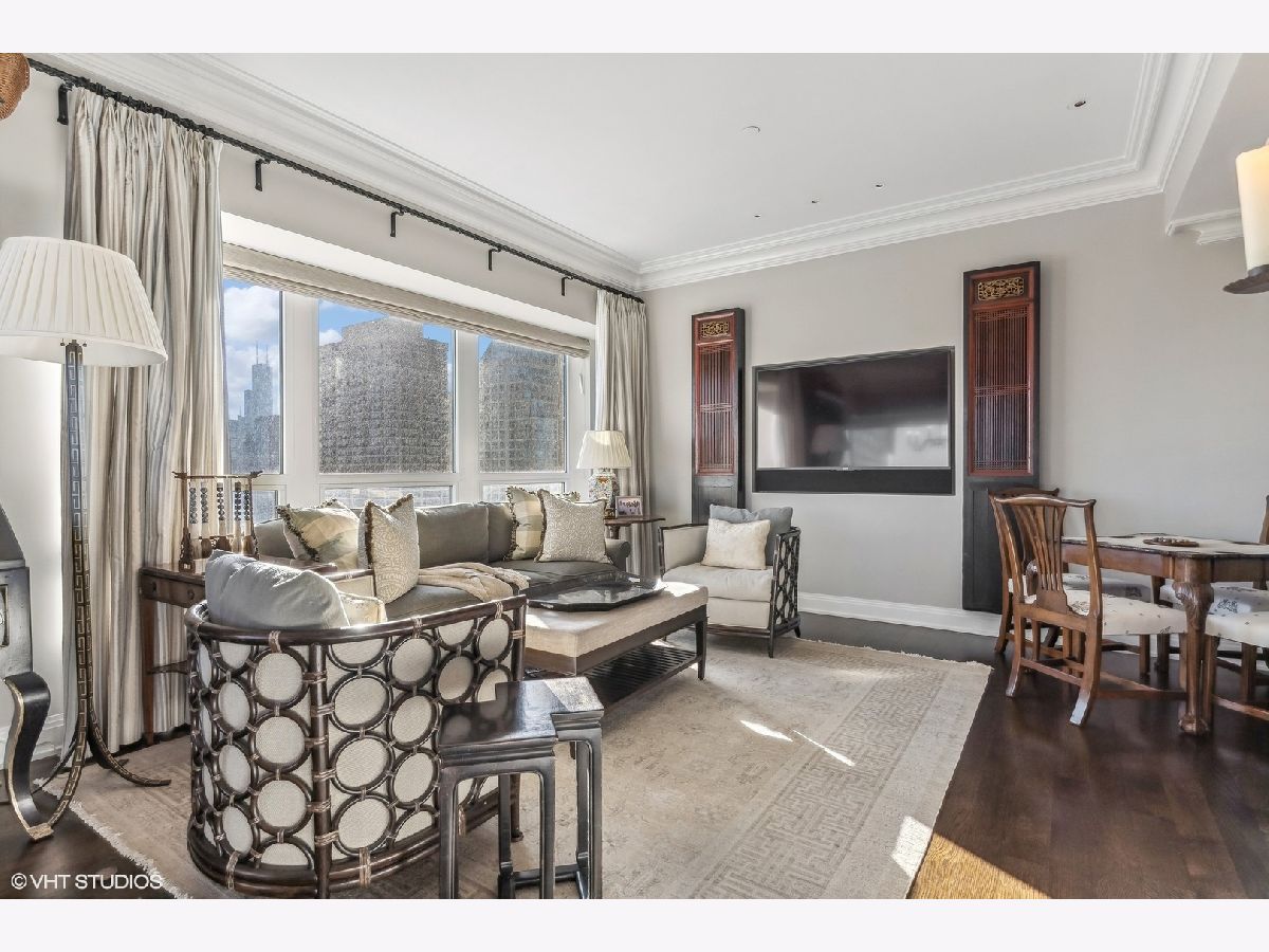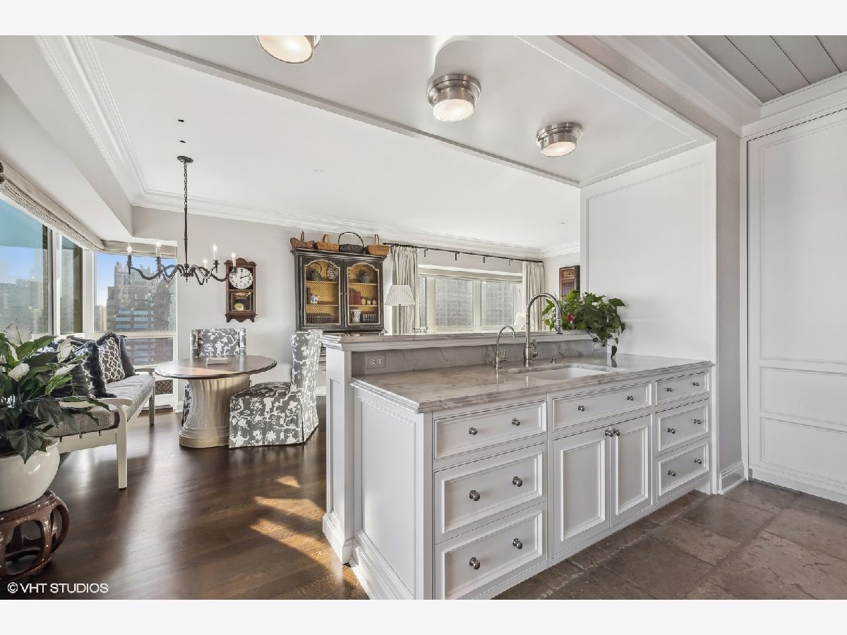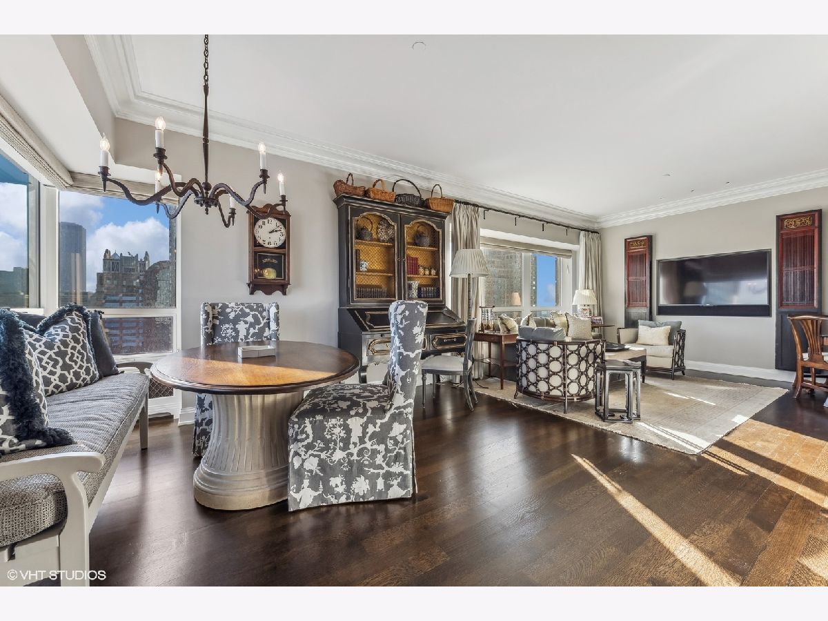 This extraordinary, elegant residence at Park Tower stands as a testament to sophistication and grandeur. Custom designed by Robert Klingel, elegance surrounds you in this expansive 5,250 square foot, 4 bedroom plus paneled library / office. This home has been meticulously crafted using only the finest materials and design. A grand foyer welcomes you into the home, setting the tone for the grandeur that lies beyond. A spectacular 30 x 20' living room is anchored by a fireplace and oversized windows that artfully frame the east-facing views of the lake and city. Two pairs of French doors with beveled glass leads you to the rich wood-paneled office, showcasing the craftsmanship that went into creating this sanctuary. The custom cabinets seamlessly integrate into the paneling, providing both functionality and aesthetic appeal. Each cabinet is a work of art, featuring handcrafted details and ornate handles that add a touch of luxury to the room. These cabinets are not only storage solutions but also contribute to the overall design, adding depth and dimension to the space. As you explore the office, you'll discover hidden gems - a discreetly concealed television and hidden storage. A graceful transition to the formal dining room dressed in embroidered silk wallcoverings by Holly Hunt that creates a backdrop of sophistication that sets the stage for memorable gatherings. The piece de resistance of this dining sanctuary is undoubtedly the crystal chandelier that hangs majestically from above, casting a soft, ambient glow that dances off the wallpaper, creating an atmosphere of intimacy and grace. The dining room flows into the eat-in kitchen offering south and east-facing views. Anchored by an oversized center island, the kitchen features quartzite countertops that complement the custom cabinetry with polished nickel detailing and a center chandelier. The extensive suite of appliances by Wolf and Sub Zero and a discrete butler's pantry that offers additional ovens, wine storage and prep space. The oversized balcony is just off the kitchen providing the perfect amount of space to relax and enjoy the city and lake views. An extension of the kitchen is a cozy breakfast nook that is nestled in the SE corner and flows seamlessly into the comforting embrace of the family room that exudes an atmosphere of casual elegance. The bedroom wing offers 4 bedrooms including a primary suite that is a study in grandeur. Featuring a 29x14 bedroom wrapped in windows to the west, an incredible organized closet, and a spacious ensuite bath with radiant heated floors. Elegantly appointed in marble with polished nickel fixtures throughout, the primary bathroom features two separate custom carved vanities, Rohl plumbing fixtures and a luxurious shower. Three additional bedrooms, South facing bedroom two is wrapped in elegant wallcoverings and is ensuite, while bedrooms three and four enjoy western views and sunsets. Completing the residence are a beautifully appointed powder room, a discreet utility room with side-by-side washer and vented dryer, and a separate service entrance for the ultimate in privacy. No detail has been overlooked, from the custom interior lighting, the luxurious drapery fabrics, the textured wall coverings to the motorized shades throughout and a Control 4 system that automates the home. This five-star dwelling surpasses all expectations. The NoMi Club, offering a state-of-the-art fitness center and an indoor pool, coupled with premium hotel services, elevates the resident experience to unprecedented levels. Two garage spaces and a capacious storage unit are included. Seize the ultimate lifestyle opportunity in this prime location, where every element of luxury living has been meticulously curated. This residence at Park Tower is more than a home; it's a symphony of indulgence in the heart of the city. 2023 Taxes: $68,350.03 (a $13K decrease from 2022).