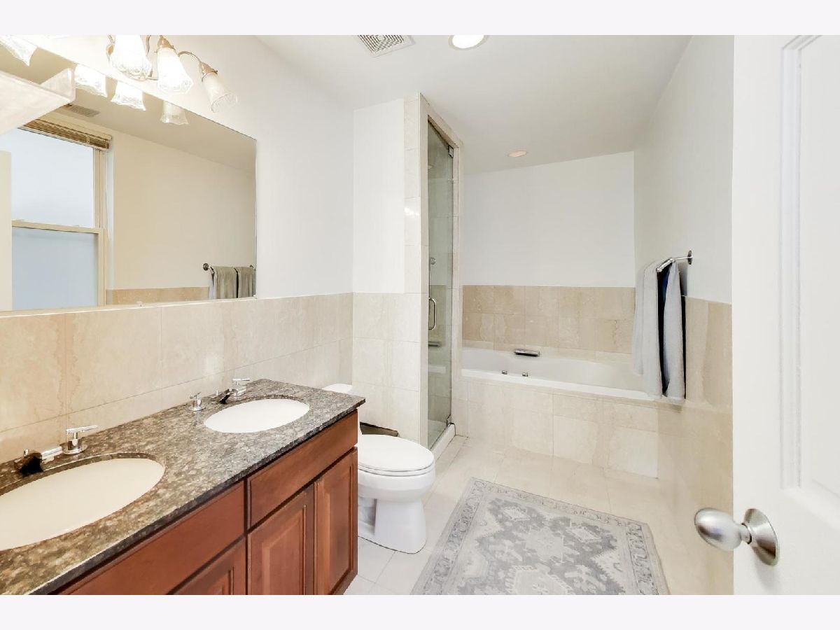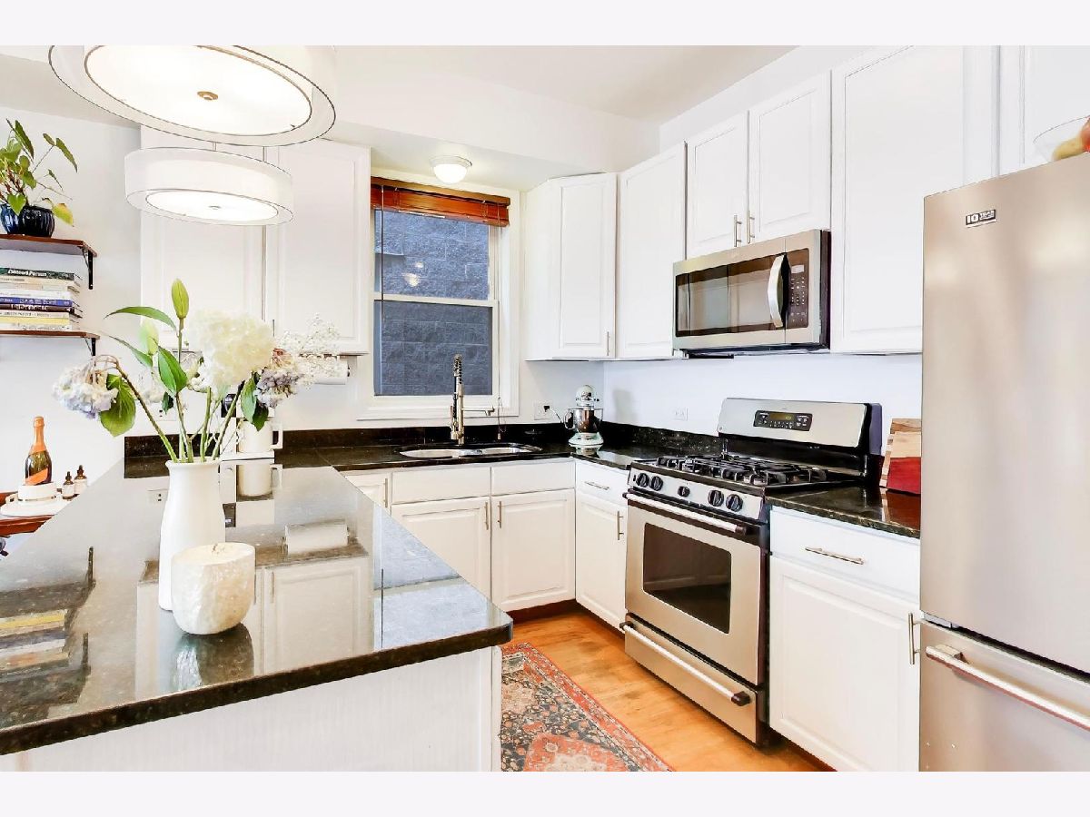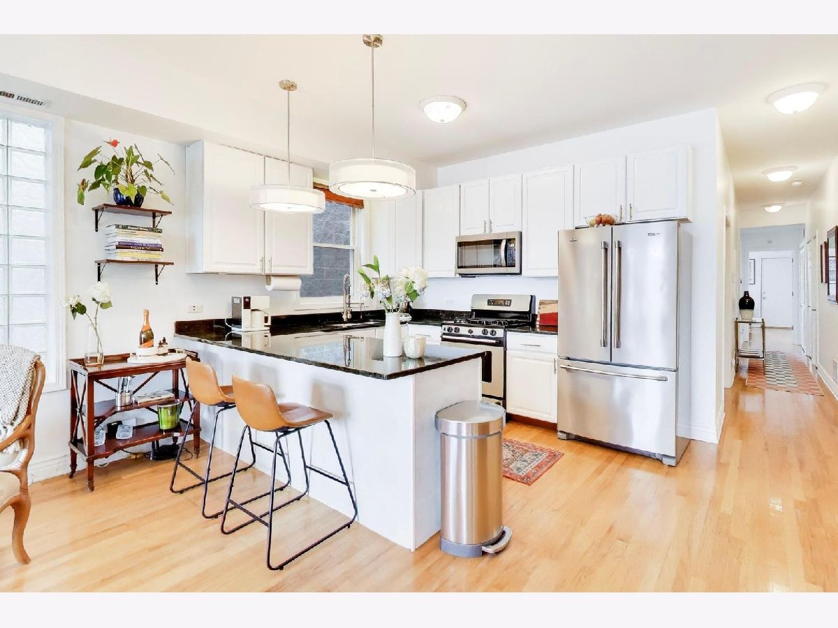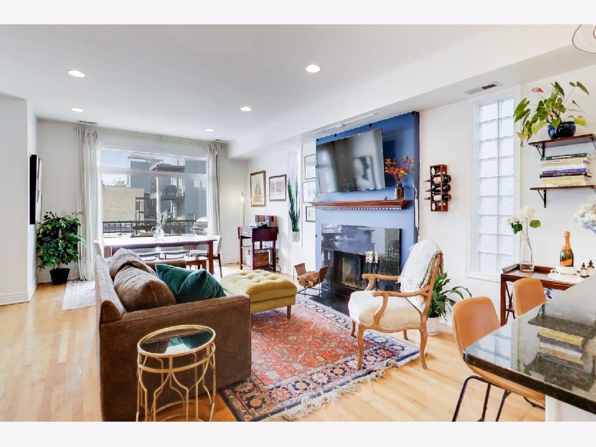 Enjoy the best of Noble Square from this 2 bed/2 bath gem, tucked away just off bustling Chicago Ave.! The wide, sunny open-concept layout features a wood-burning fireplace, front balcony, and plenty of space for dedicated dining. An oversized granite peninsula offers plenty of food prep space and seating, accented by newly-refreshed white cabinetry and a stainless steel appliance package. A split floor plan offers privacy for guests, and your serene primary suite opens to a private rear deck. Primary bath features a luxurious soaking tub, separate shower, and dual vanities. In-unit laundry and garage parking make for convenient city living, and with the Blue line and 90/94 close by, you'll get everywhere you want to go with ease. Welcome home!
