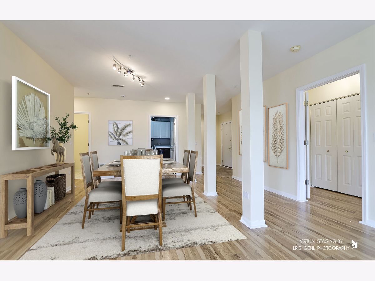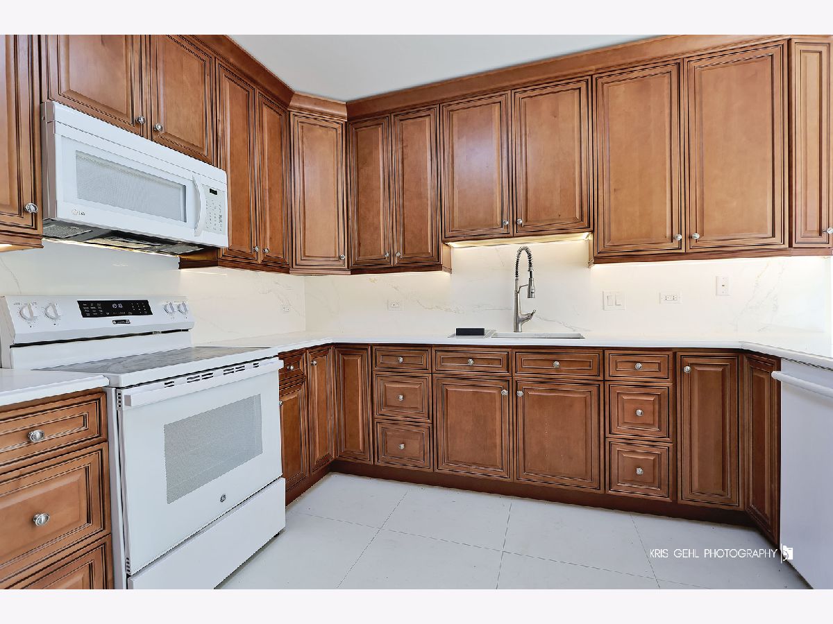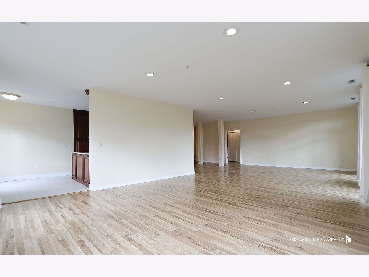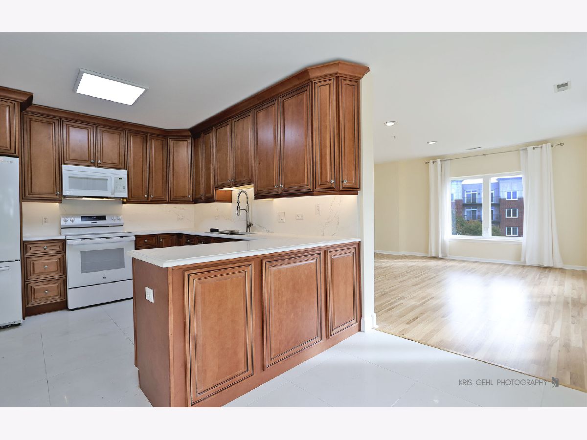 Rare corner end unit with spacious layout, starting right from the open foyer and continuing throughout the great room and out onto the private balcony, overlooking the pond with fountain and elegant swans, accessible from any of the wall of sliders with transom windows that brings forth wonderful natural light throughout this unit. Your brand new remodeled kitchen with beautiful quartz countertops, lovely backsplash, Bosch Silence Plus dishwasher, new stove, new tile floors with cement board underlayment, and under cabinet lighting as well as inner pantry lighting will be a dream to create your meals in or entertain from. Gorgeous wood flooring throughout. Dimmable canned lighting throughout. Main bedroom has a walk-in closet and bathroom with separate shower and double vanity. In-unit side-by-side laundry. Enjoy peace of mind with built-in fire sprinkler system throughout. Your garage space and adjacent storage unit are conveniently in the attached heated garage. Sellers have enjoyed the wonderful neighbors. Great location near shopping, schools, restaurants, parks, & walking paths, yet tucked away in a quiet residential neighborhood. Being offered in As Is condition, but is in terrific condition.