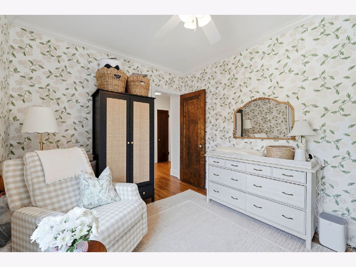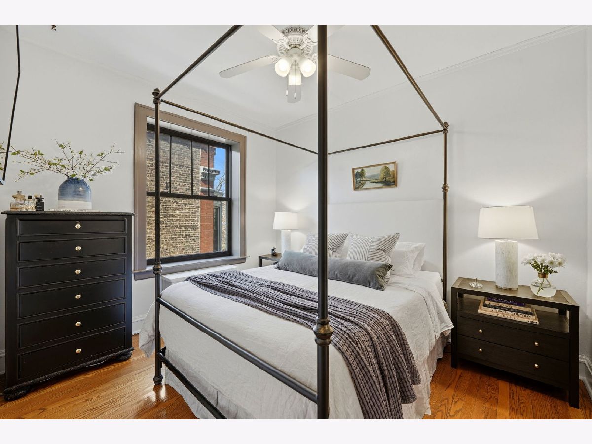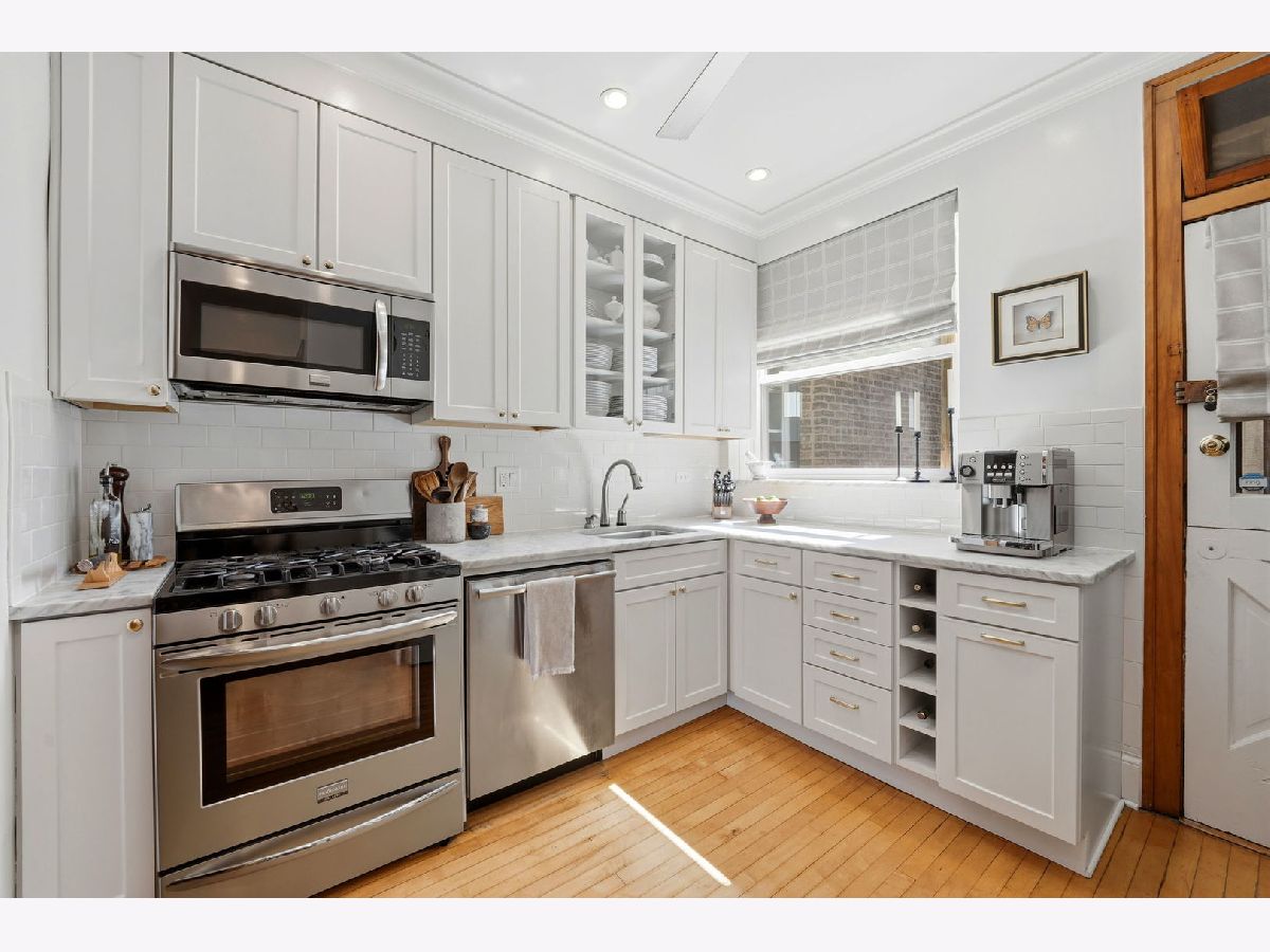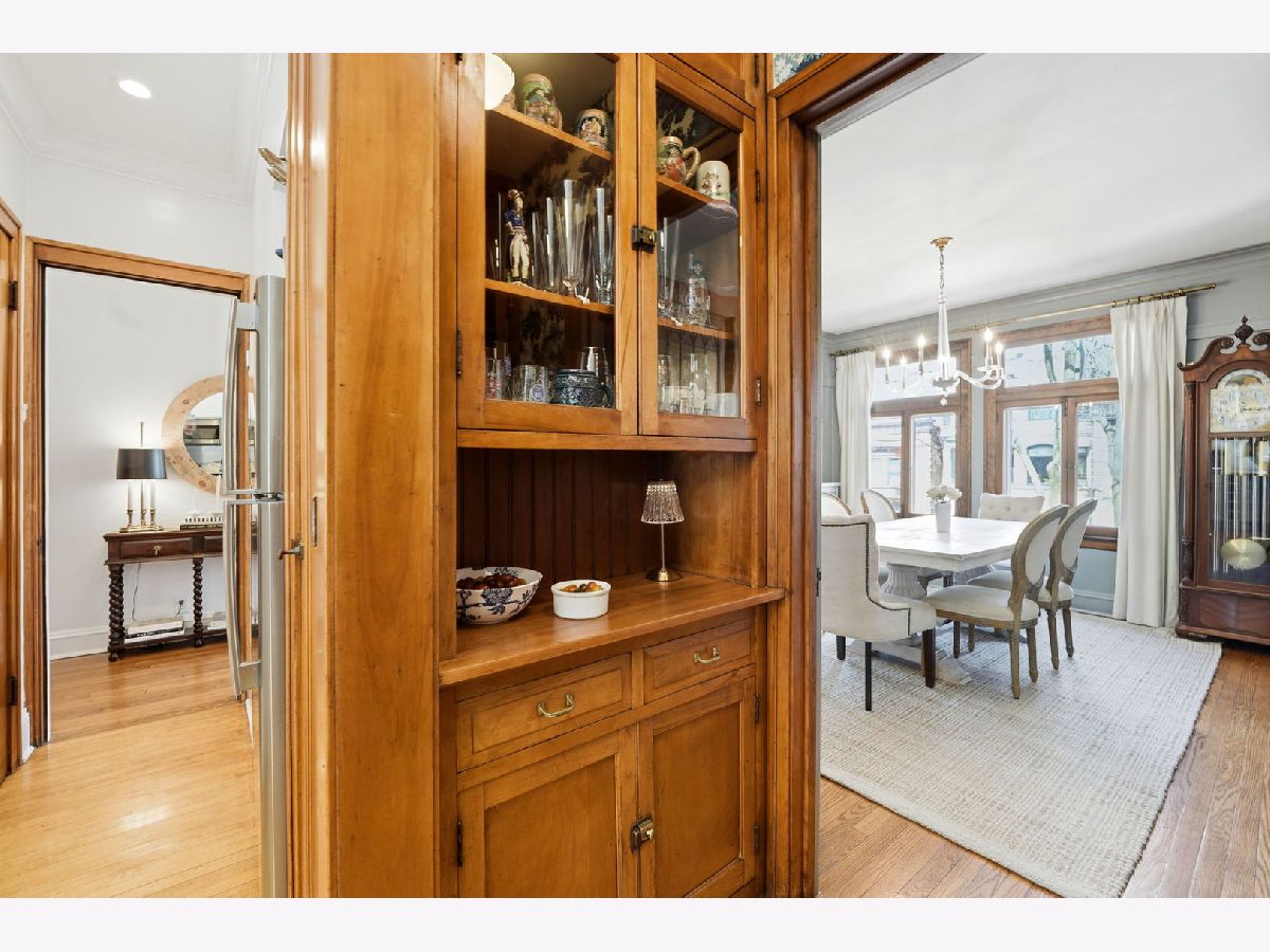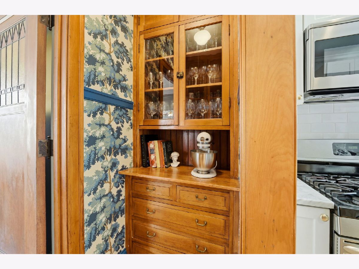 Vintage charm meets elevated design in this beautifully curated 2 bed, 1.5 bath corner residence in the heart of Lakeview. Bathed in natural light, this home showcases gleaming hardwood floors, leaded glass windows, timeless original millwork, and soaring 9-foot ceilings. The thoughtfully designed layout features a formal dining room and a stunning butler's pantry transition, enhanced with designer wallpaper and custom finishes. The kitchen is both classic and refined with marble countertops, white cabinetry, subway tile backsplash, updated appliances, and a new in-unit washer and dryer discreetly tucked away. Throughout the home, every detail has been carefully selected - from Visual Comfort designer lighting fixtures and custom brass hardware to curated wallpaper installations by Scalamandre, Ralph Lauren, and Rifle Paper Co. Custom window treatments and antique-inspired crystal door hardware further elevate the space, blending historic character with modern sophistication. A fully replaced A/C system adds modern comfort, while brand new bedroom windows with a transferred warranty offer peace of mind. Spring, summer, and fall bring lush tree coverage that creates exceptional privacy when in full bloom, adding to the home's serene feel. Additional highlights include abundant built-in storage, organized closets, and a large private storage unit in the basement labeled 2A. The building also offers bike and stroller storage, plus a communal washer/dryer if needed. Enjoy the convenience of one communal rear parking space, easy street parking on permit-only Oakdale (Zone 383, 24/7), and an unbeatable location just 3 blocks from the Brown and Purple Line for easy commuting, yet quiet enough that you don't hear a thing. Located in a well-maintained, community-oriented building with gated front and rear access, this home offers both security and a true neighborhood feel, all just steps from the best dining, shopping, and entertainment Lakeview has to offer.
