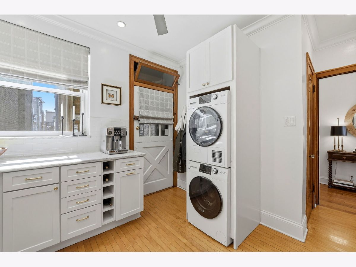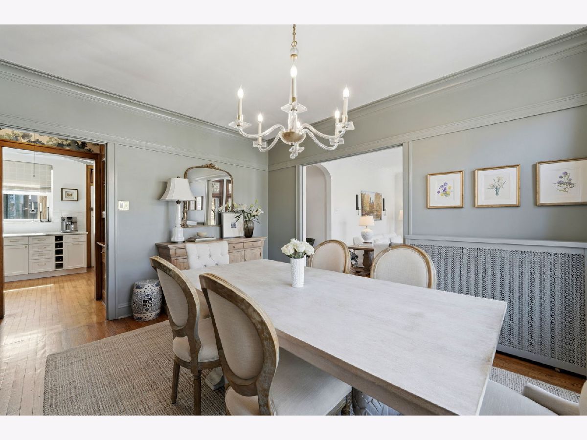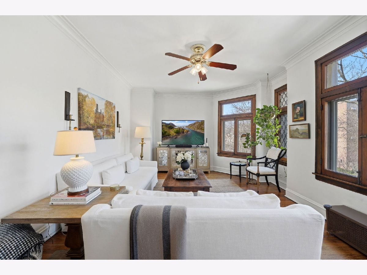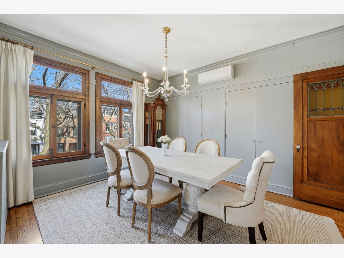 Vintage charm meets elevated design in this beautifully curated 2 bed, 1.5 bath corner residence in the heart of Lakeview. Bathed in natural light, this home showcases gleaming hardwood floors, leaded glass windows, timeless original millwork, and soaring 9-foot ceilings. The thoughtfully designed layout features a formal dining room and a stunning butler's pantry transition, enhanced with designer wallpaper and custom finishes. The kitchen is both classic and refined with marble countertops, white cabinetry, subway tile backsplash, updated appliances, and a new in-unit washer and dryer discreetly tucked away. Throughout the home, every detail has been carefully selected - from Visual Comfort designer lighting fixtures and custom brass hardware to curated wallpaper installations by Scalamandre, Ralph Lauren, and Rifle Paper Co. Custom window treatments and antique-inspired crystal door hardware further elevate the space, blending historic character with modern sophistication. A fully replaced A/C system adds modern comfort, while brand new bedroom windows with a transferred warranty offer peace of mind. Spring, summer, and fall bring lush tree coverage that creates exceptional privacy when in full bloom, adding to the home's serene feel. Additional highlights include abundant built-in storage, organized closets, and a large private storage unit in the basement labeled 2A. The building also offers bike and stroller storage, plus a communal washer/dryer if needed. Enjoy the convenience of one communal rear parking space, easy street parking on permit-only Oakdale (Zone 383, 24/7), and an unbeatable location just 3 blocks from the Brown and Purple Line for easy commuting, yet quiet enough that you don't hear a thing. Located in a well-maintained, community-oriented building with gated front and rear access, this home offers both security and a true neighborhood feel, all just steps from the best dining, shopping, and entertainment Lakeview has to offer.