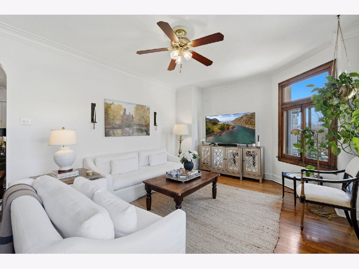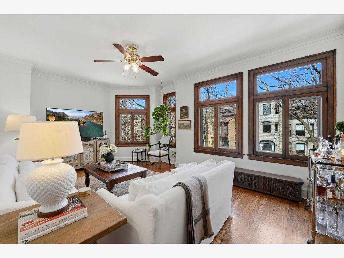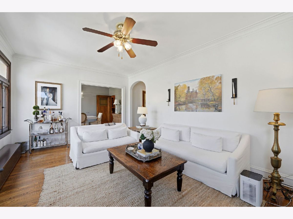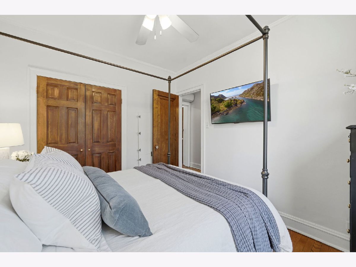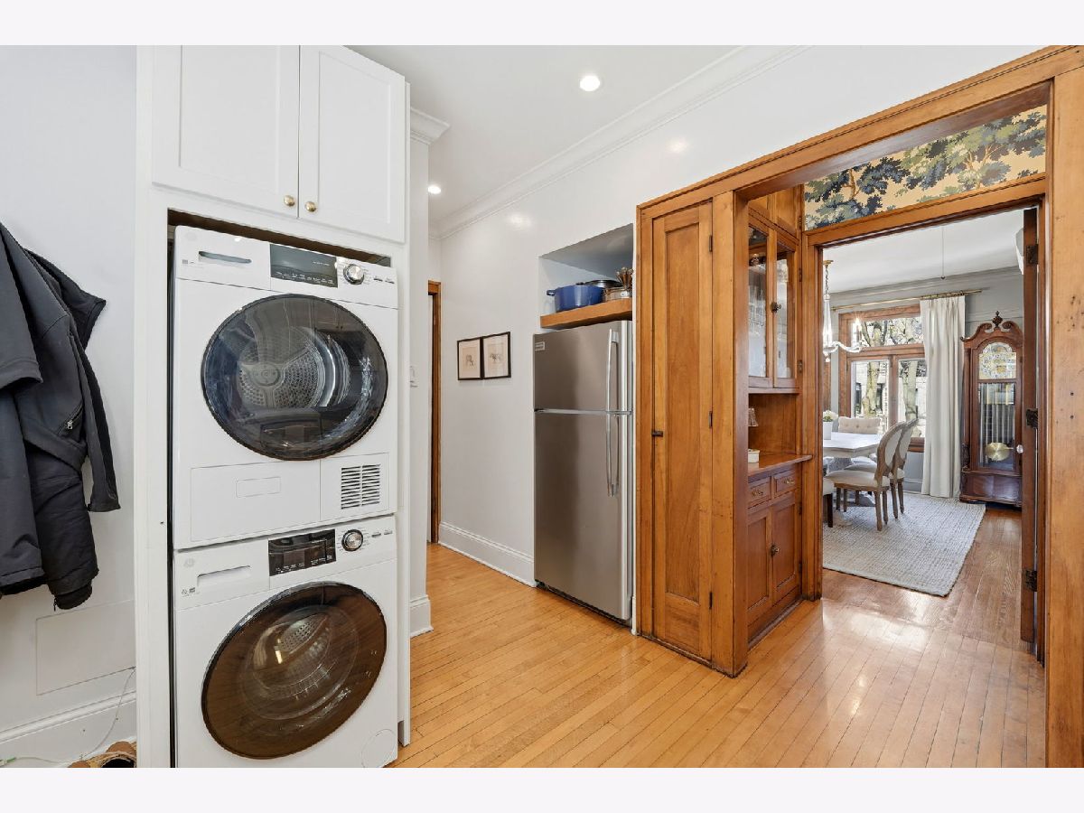 Vintage charm meets elevated design in this beautifully curated 2 bed, 1.5 bath corner residence in the heart of Lakeview. Bathed in natural light, this home showcases gleaming hardwood floors, leaded glass windows, timeless original millwork, and soaring 9-foot ceilings. The thoughtfully designed layout features a formal dining room and a stunning butler's pantry transition, enhanced with designer wallpaper and custom finishes. The kitchen is both classic and refined with marble countertops, white cabinetry, subway tile backsplash, updated appliances, and a new in-unit washer and dryer discreetly tucked away. Throughout the home, every detail has been carefully selected - from Visual Comfort designer lighting fixtures and custom brass hardware to curated wallpaper installations by Scalamandre, Ralph Lauren, and Rifle Paper Co. Custom window treatments and antique-inspired crystal door hardware further elevate the space, blending historic character with modern sophistication. A fully replaced A/C system adds modern comfort, while brand new bedroom windows with a transferred warranty offer peace of mind. Spring, summer, and fall bring lush tree coverage that creates exceptional privacy when in full bloom, adding to the home's serene feel. Additional highlights include abundant built-in storage, organized closets, and a large private storage unit in the basement labeled 2A. The building also offers bike and stroller storage, plus a communal washer/dryer if needed. Enjoy the convenience of one communal rear parking space, easy street parking on permit-only Oakdale (Zone 383, 24/7), and an unbeatable location just 3 blocks from the Brown and Purple Line for easy commuting, yet quiet enough that you don't hear a thing. Located in a well-maintained, community-oriented building with gated front and rear access, this home offers both security and a true neighborhood feel, all just steps from the best dining, shopping, and entertainment Lakeview has to offer.