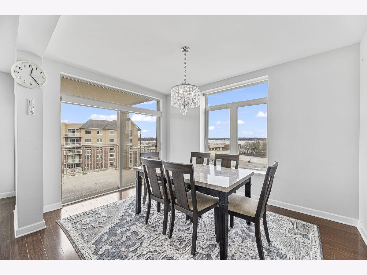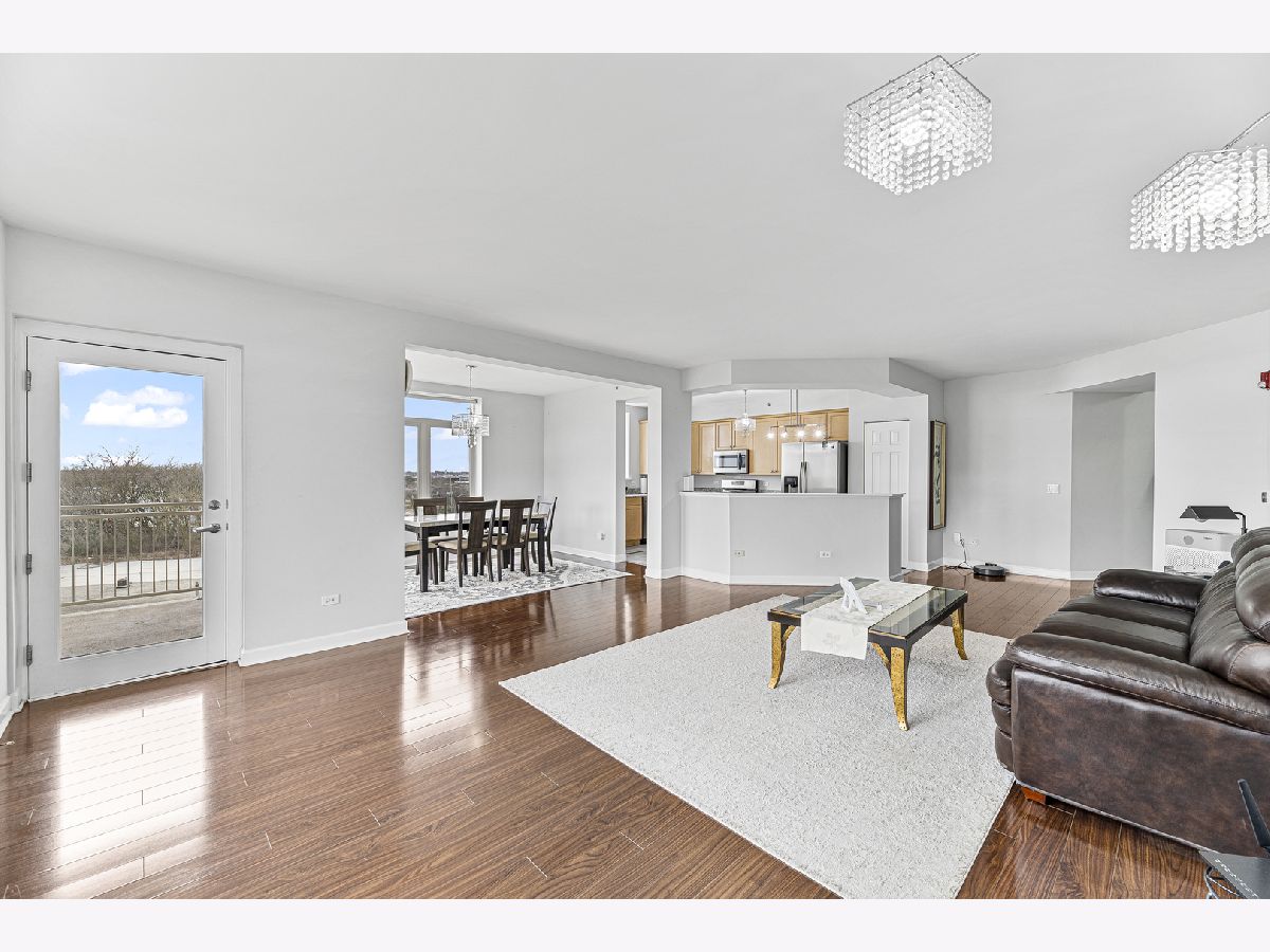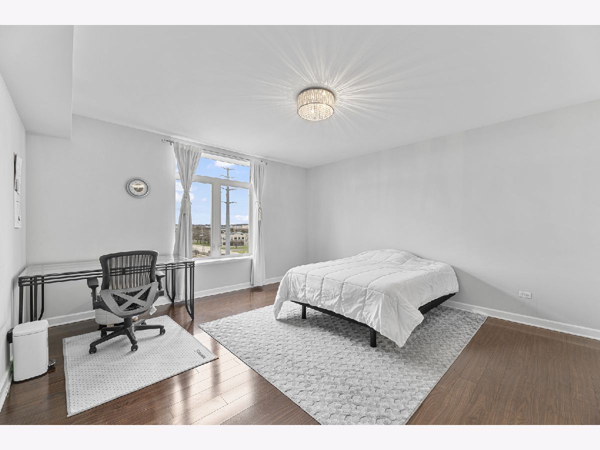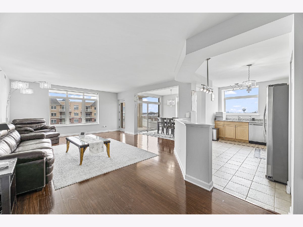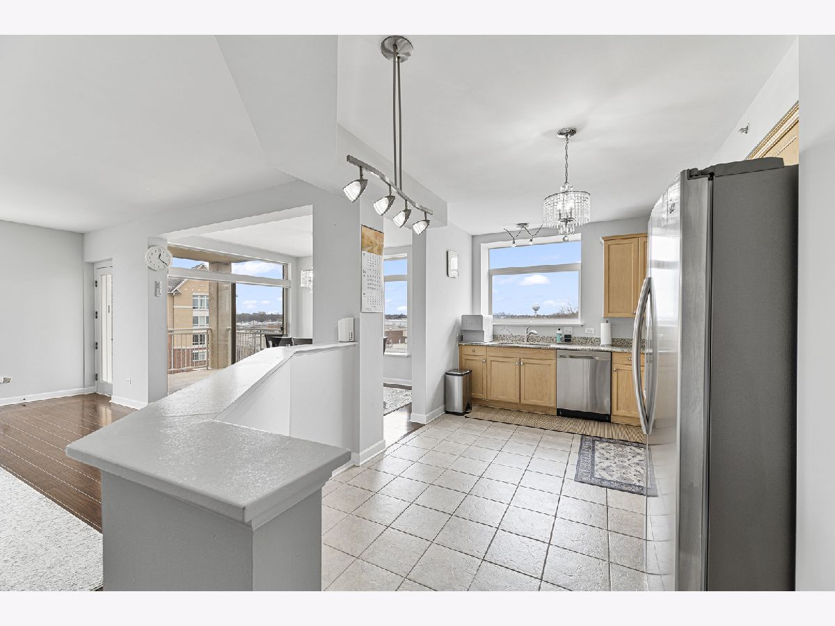 Welcome to this bright and spacious 2-bedroom, 2-bathroom condo in the highly sought-after Woodlands of Morton Grove. This rarely available end-unit features laminate wood floors throughout and an abundance of natural light. The open-concept layout seamlessly connects the living, dining, and kitchen areas-perfect for both everyday living and entertaining. The kitchen includes granite countertops, ample cabinet space, and stainless steel appliances. Heated flooring throughout as well as separate HVAC system. Step out onto your private oversized balcony and enjoy peaceful courtyard views with glimpses of the Chicago skyline. The expansive primary suite offers a large walk-in closet and a private bath with a double vanity, soaking tub, and separate shower. A generously sized second bedroom and full bath provide flexibility for guests, or office space. Additional highlights include a full-size in-unit laundry room, plenty of storage, and a well-designed layout. This well-maintained elevator building features heated indoor garage parking, a car wash area, fitness room, and extra storage. Ideally located just steps from the Metra, forest preserves, bike trails, library, and shopping, with easy access to major expressways. A perfect combination of space, location, and convenience-don't miss this one!