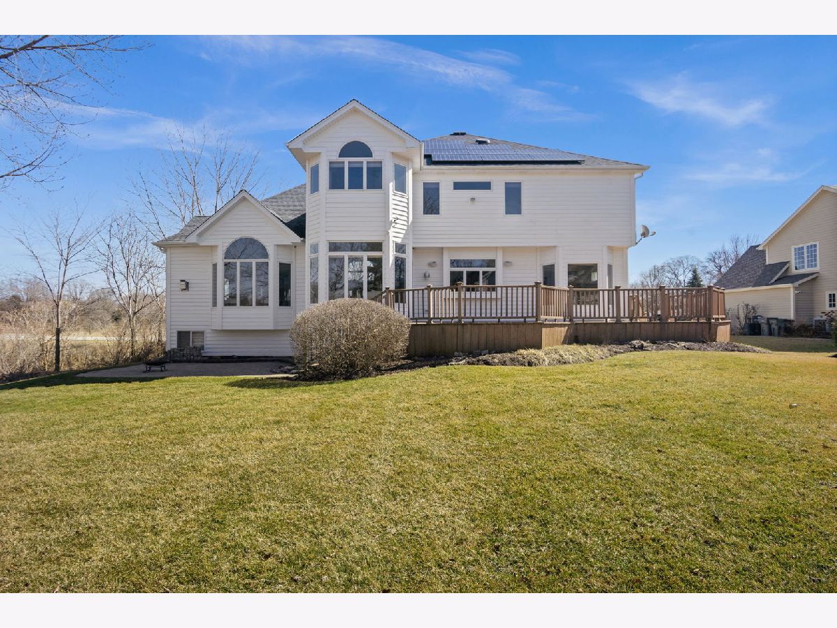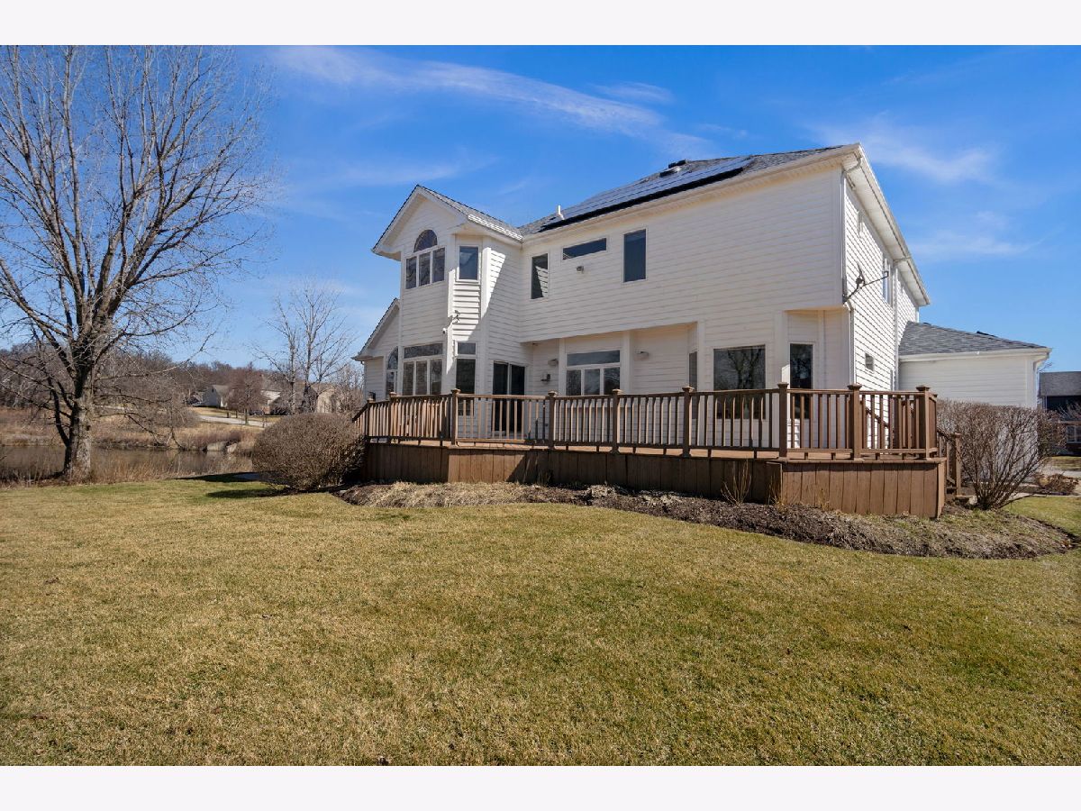 This custom built 4 bedroom, 4.5 bath two story home in the sought after Black Walnut Trails neighborhood of Sugar Grove offers over 3,600 square feet of beautifully designed living space on a beautifully landscaped lot with mature trees and peaceful pond views. A paver patio and maintenance free deck provide great outdoor living space, while the 3 car garage features durable lifetime epoxy flooring and a 240v, 40 amp outlet ready for electric vehicles. Inside, you'll find fresh interior paint, brand new carpet, hardwood flooring, vaulted and volume ceilings, and an open floor plan filled with natural light. The main level includes a bright living room, formal dining room, and a dramatic two story family room with a gas log fireplace. The gourmet eat in kitchen is perfect for cooking and entertaining with granite countertops, stainless steel appliances including a double oven, and a large island with cooktop and breakfast bar. A sunroom offers relaxing backyard and pond views, while the first floor home office with built in bookcases creates an ideal work from home space. Upstairs you'll find four spacious bedrooms including the primary suite with tray ceiling, walk in closet with custom storage system, and a deluxe bath with skylights, separate vanities, jetted soaking tub with pillars, and separate shower. Bedrooms two and three share a Jack and Jill bath, while bedroom four has its own private bath. The full basement with 9 foot ceilings and a full bathroom provides excellent additional living or recreation space. The home also includes an owned 11 kW solar system, video doorbell, and surround sound system. Black Walnut Trails offers neighborhood ponds, tennis courts, a park, and walking paths, all just minutes from Bliss Forest Preserve, golf, dining, shopping, and easy interstate access.
