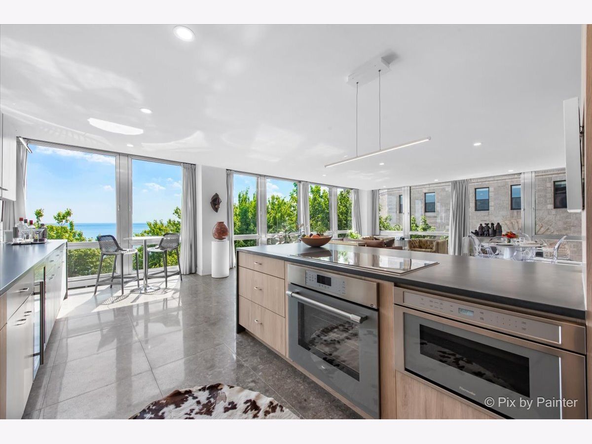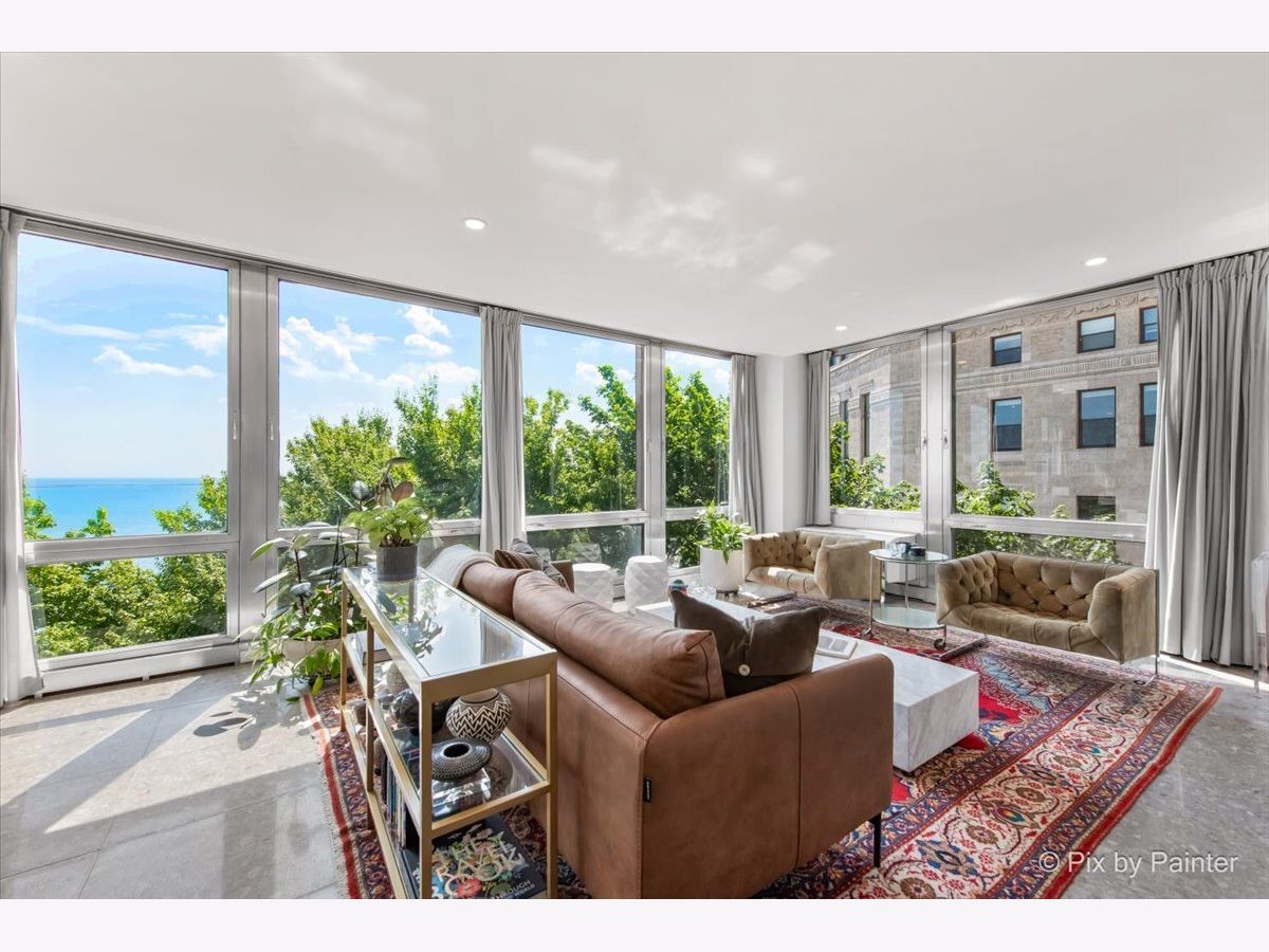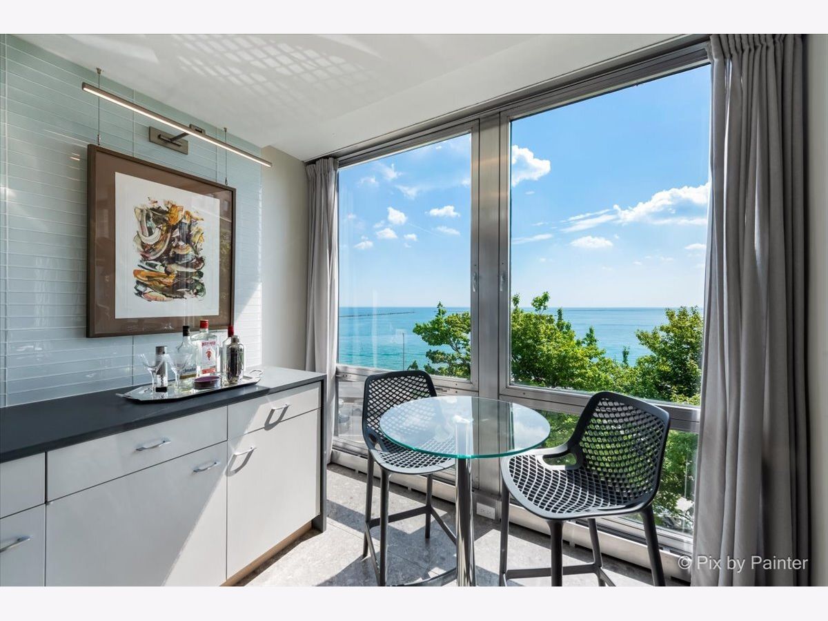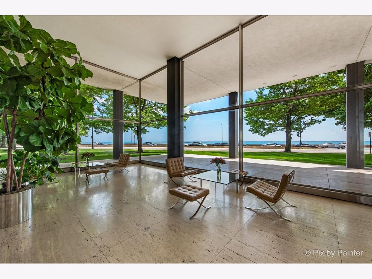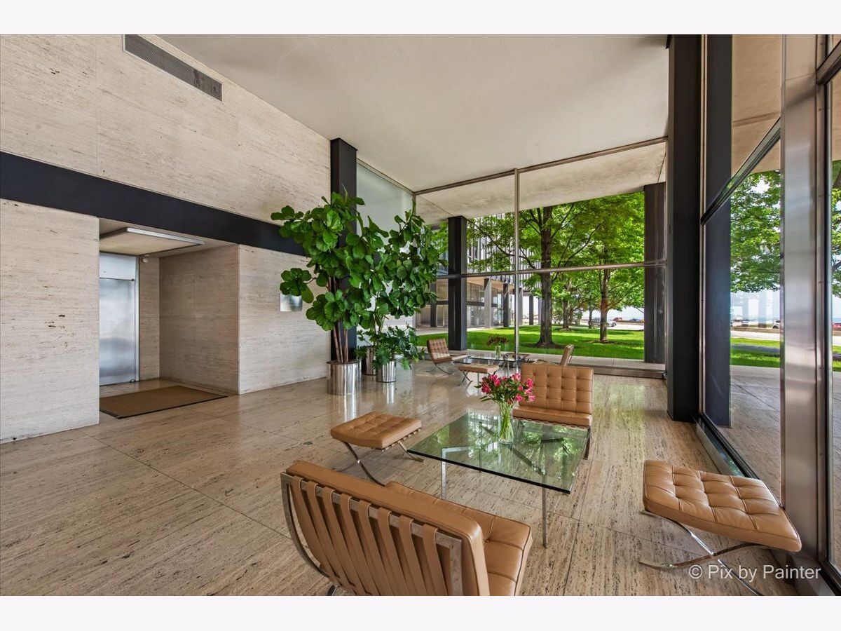 Sweeping views of Lake Michigan and iconic architecture come together in this completely renovated southeast corner residence in Mies van der Rohe's landmark building at 860 N Lake Shore Drive. With panoramic vistas of the lake, treetops, and Navy Pier's "Play Pen," this elevated home offers breathtaking sunrises and a front-row seat to Chicago's ever-changing lakefront. Originally a 3-bedroom layout, the home was gut-renovated from slab to ceiling in 2022 and redesigned to embrace open, modern living while honoring the building's timeless mid-century design. One of the original bedrooms has been thoughtfully transformed into a private home office and a second custom walk-in closet. The second bedroom, currently used as a den/media room, offers flexible living space to suit your needs. The kitchen features custom cabinetry, top-of-the-line Thermador appliances including a built-in beverage center, and sleek quartz countertops. Both bathrooms were fully updated with refined finishes, including a soaking tub in the larger bath and custom vanities in each. The primary bedroom's en-suite bath is compact but highly functional, featuring custom-built cabinetry that offers exceptional storage. Additional highlights include all new electrical and plumbing systems, terrazzo tile flooring throughout, recessed and gallery-style picture lighting, soffit accents, and freshly painted interiors. The living, dining, and kitchen spaces flow together seamlessly for everyday comfort and entertaining, all wrapped in wall-to-wall windows that showcase postcard-worthy lake views. This rarely available southeast corner unit includes deeded garage parking (space #11) for an additional $50,000. The building's signature architecture is enhanced by a travertine plaza, professionally landscaped grounds, and an intimate layout of just four homes per floor. 860 N Lake Shore Drive is a historic co-op, and monthly assessments include all utilities, internet, cable-and property taxes. Ideally located across from the lakefront path, beaches, parks, and close to world-class shopping and dining, this home offers the best of Chicago living in one of its most architecturally significant addresses.