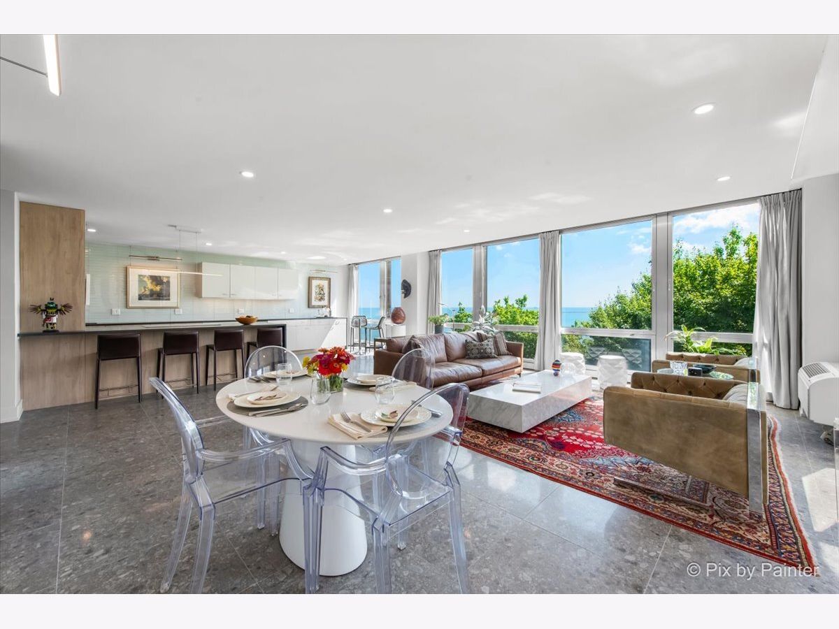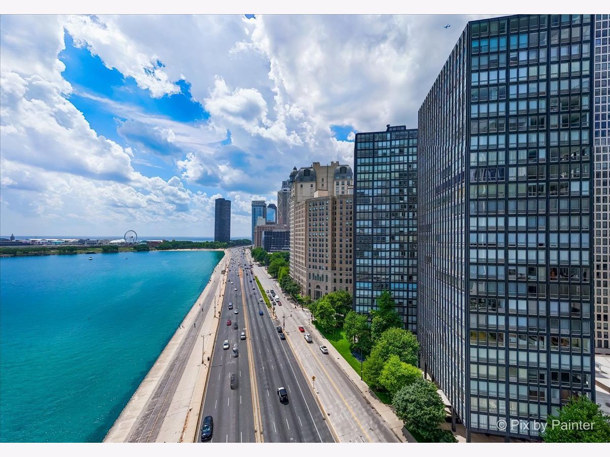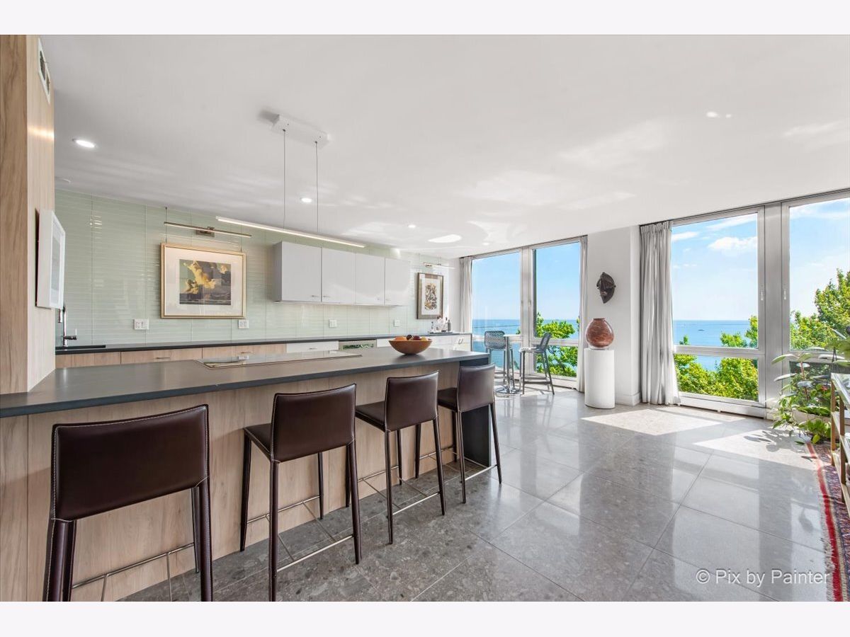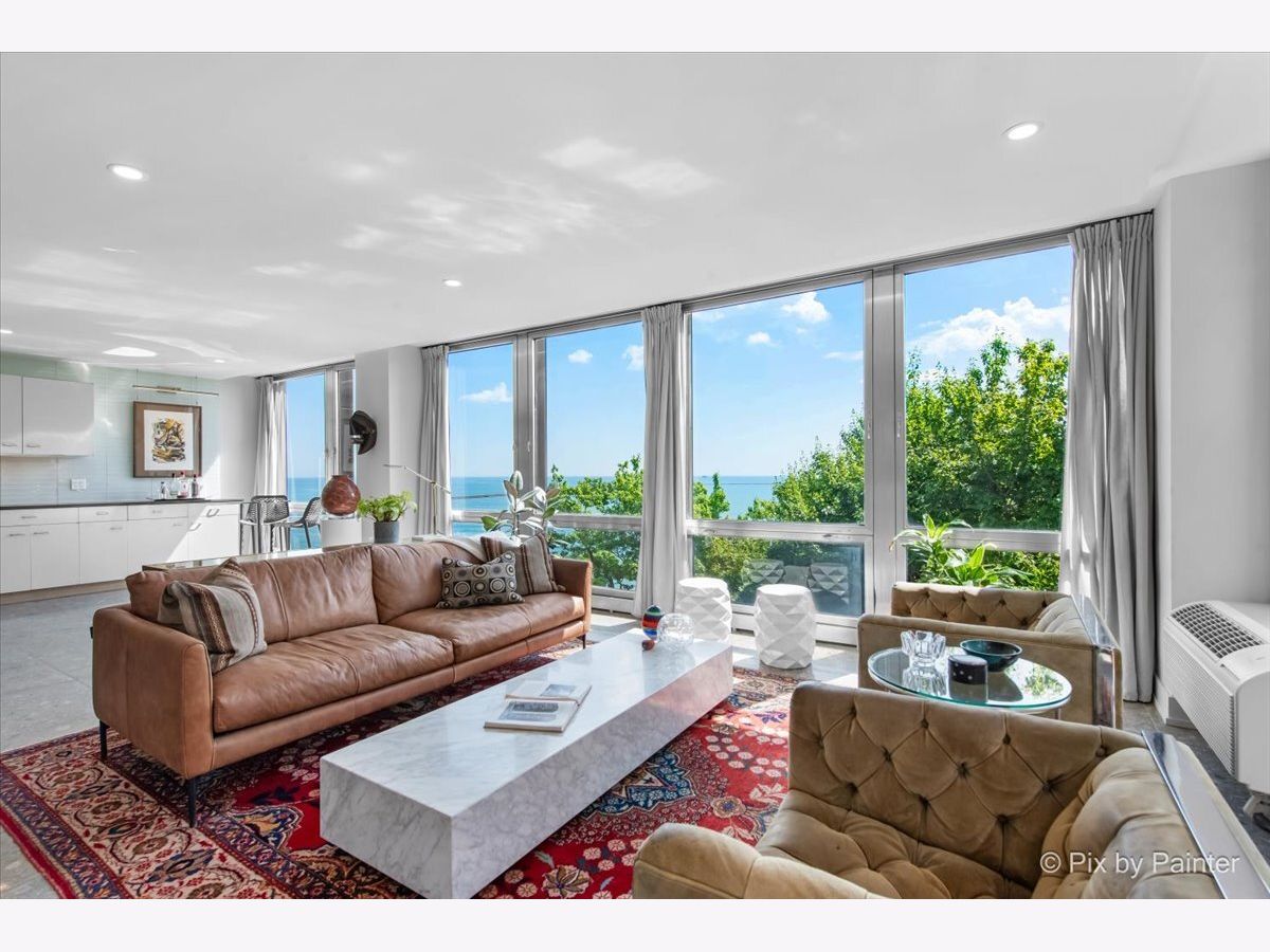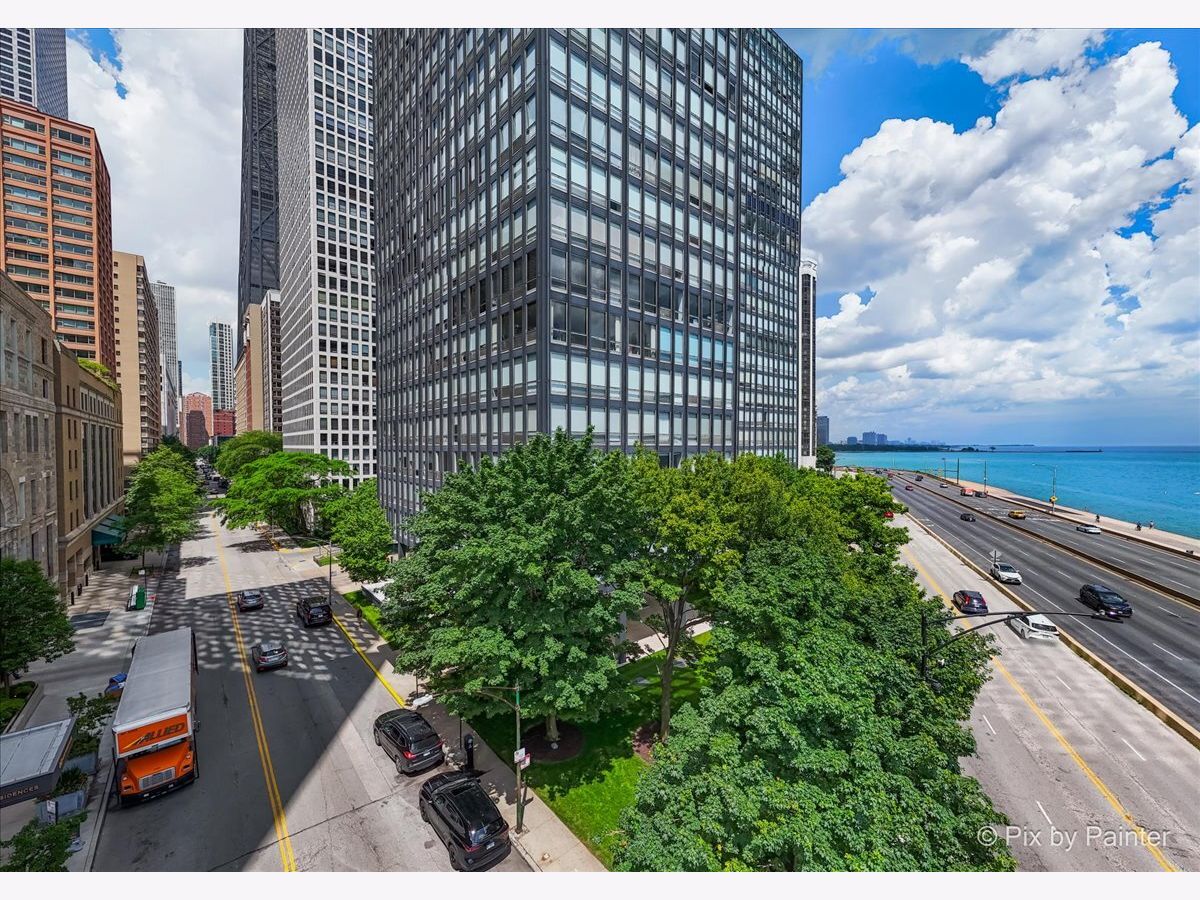 Sweeping views of Lake Michigan and iconic architecture come together in this completely renovated southeast corner residence in Mies van der Rohe's landmark building at 860 N Lake Shore Drive. With panoramic vistas of the lake, treetops, and Navy Pier's "Play Pen," this elevated home offers breathtaking sunrises and a front-row seat to Chicago's ever-changing lakefront. Originally a 3-bedroom layout, the home was gut-renovated from slab to ceiling in 2022 and redesigned to embrace open, modern living while honoring the building's timeless mid-century design. One of the original bedrooms has been thoughtfully transformed into a private home office and a second custom walk-in closet. The second bedroom, currently used as a den/media room, offers flexible living space to suit your needs. The kitchen features custom cabinetry, top-of-the-line Thermador appliances including a built-in beverage center, and sleek quartz countertops. Both bathrooms were fully updated with refined finishes, including a soaking tub in the larger bath and custom vanities in each. The primary bedroom's en-suite bath is compact but highly functional, featuring custom-built cabinetry that offers exceptional storage. Additional highlights include all new electrical and plumbing systems, terrazzo tile flooring throughout, recessed and gallery-style picture lighting, soffit accents, and freshly painted interiors. The living, dining, and kitchen spaces flow together seamlessly for everyday comfort and entertaining, all wrapped in wall-to-wall windows that showcase postcard-worthy lake views. This rarely available southeast corner unit includes deeded garage parking (space #11) for an additional $50,000. The building's signature architecture is enhanced by a travertine plaza, professionally landscaped grounds, and an intimate layout of just four homes per floor. 860 N Lake Shore Drive is a historic co-op, and monthly assessments include all utilities, internet, cable-and property taxes. Ideally located across from the lakefront path, beaches, parks, and close to world-class shopping and dining, this home offers the best of Chicago living in one of its most architecturally significant addresses.