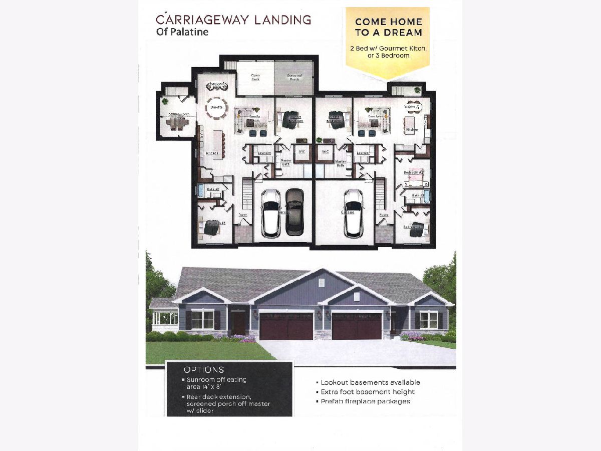 Discover the perfect blend of luxury and convenience in our new construction RANCH townhomes at Carriageway Landing. With a total of thirteen exclusive duplex homes, these thoughtfully designed residences range from 1600 to 1750 square feet, offering spacious layouts ideal for modern living. Each home is crafted with the entertainer in mind. Experience the joy of cooking in a designer kitchen featuring shaker cabinets, ample counter space, a large island with seating, and a walk-in pantry that makes hosting a breeze. The open concept design seamlessly connects the kitchen to the inviting living room, creating a warm and welcoming atmosphere for gatherings with family and friends. Enjoy the ease of main level living, complete with a practical mud room/laundry area just off the attached two car garage, designed for your everyday convenience. Retreat to your serene primary suite adorned with elegant trey ceilings, a spa-like bathroom equipped with a double vanity, and a spacious walk-in shower. You'll also appreciate the generous walk-in closet that offers plenty of storage. Need extra space? This flexible floor plan allows for the addition of one or two extra bedrooms and another full bath on the main level, accommodating your unique lifestyle needs. This stunning home features a spacious full English basement, complete with a roughed-in bathroom, offering you the perfect canvas to create the space of your dreams! Whether you envision a family room, home gym, personal office, or an entertainment area, the potential here is limited only by your imagination. This versatile area provides ample square footage for customization, allowing you to tailor it to fit your lifestyle. Located just moments away from downtown Palatine, Carriageway Landing gives you easy access to a vibrant scene filled with restaurants, nightlife, shopping, and Metra access for effortless commuting.