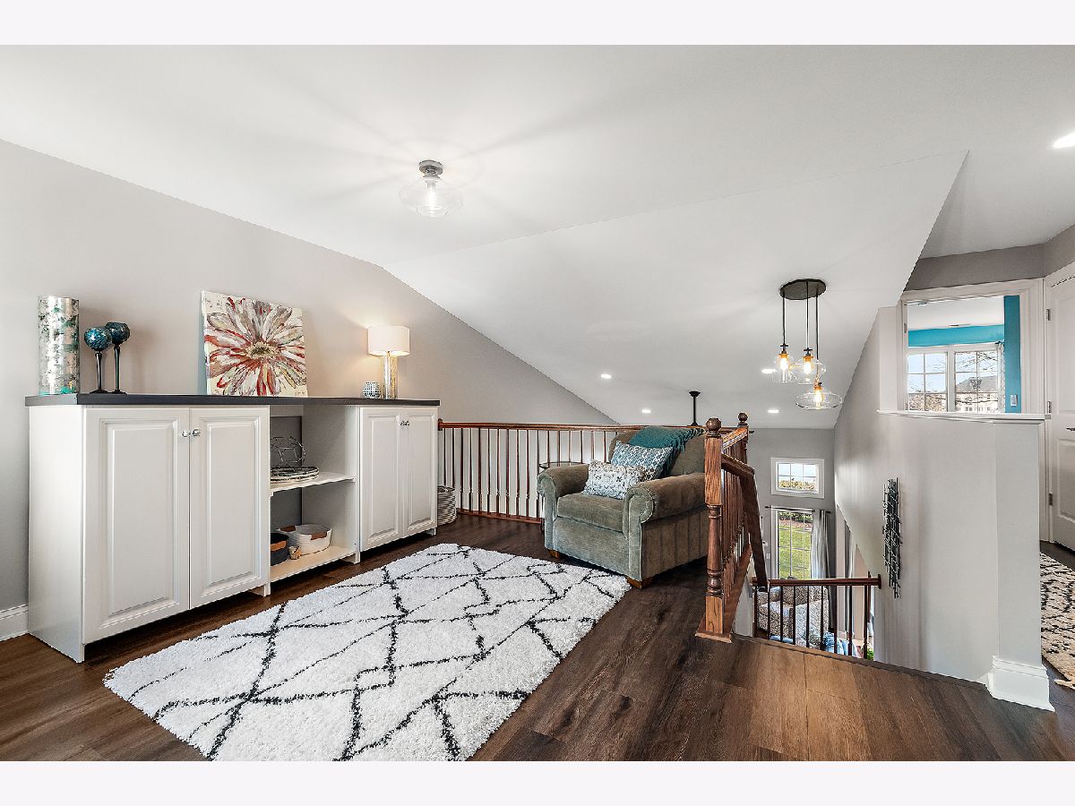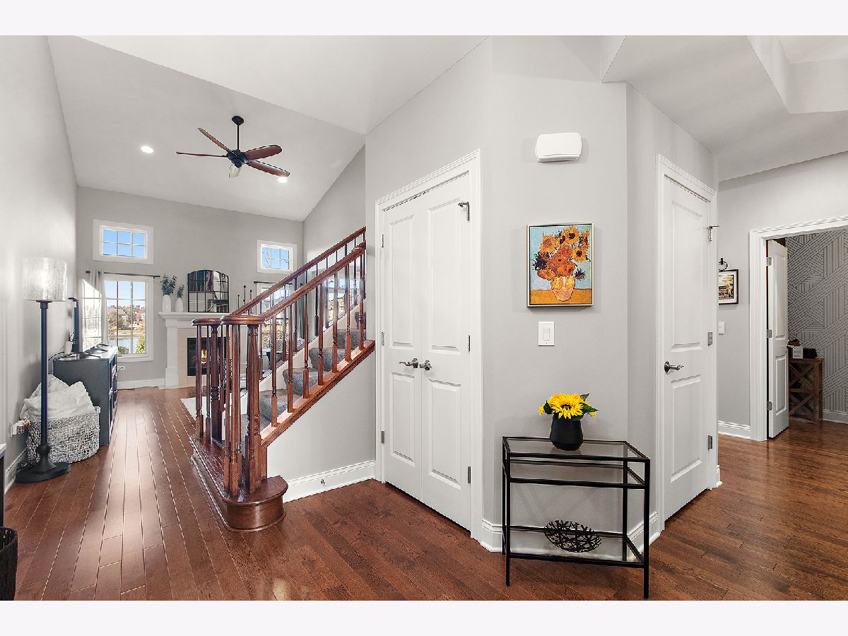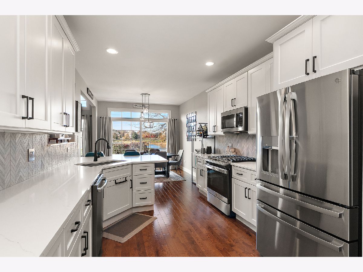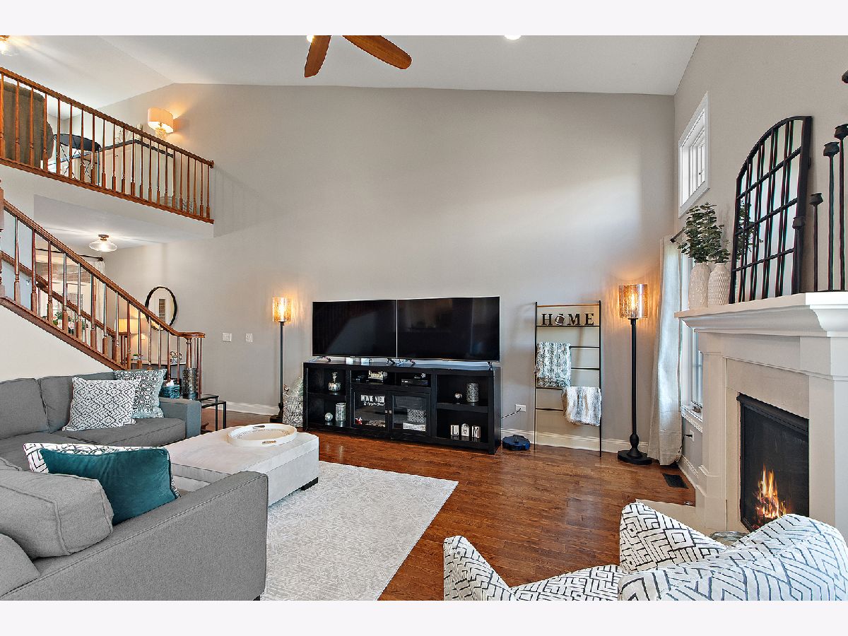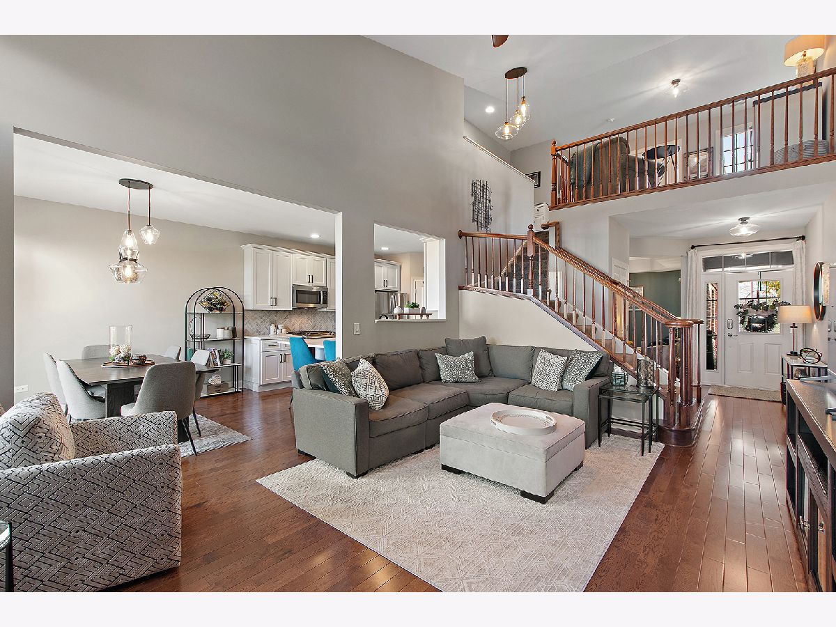 Impeccably maintained and truly turn-key, this beautifully updated 2-bedroom plus loft, 3.5-bath townhome in Lighthouse Pointe offers a like-new living experience on a premium waterfront lot. Thoughtfully improved with high-end finishes throughout, the home combines modern design, functional upgrades, and tranquil water views, allowing you to move in with confidence and ease. The two-story living room is filled with natural light and showcases hardwood floors, a granite-surround fireplace, and expansive windows framing peaceful water views. The custom kitchen rivals new construction, featuring quartz countertops, a striking herringbone stone backsplash, stainless steel appliances, a composite sink, pantry closet, and soft-close cabinetry, designed for both everyday living and entertaining. The adjoining dining area opens to the patio through oversized sliding glass doors with a transom window, creating a seamless indoor-outdoor connection. A formal dining room, currently styled as a sitting area, adds versatility and refinement with hardwood floors and a tray ceiling. A main-level laundry room with sink and cabinetry enhances convenience. Upstairs, the primary suite delivers a private retreat, complete with vaulted ceilings, dual walk-in closets with custom organizers, and a spa-inspired bath featuring a whirlpool tub, separate shower, and granite double vanity. The loft provides flexible space ideal for a home office, reading nook, or lounge, while the second bedroom enjoys morning light and calming water views. The finished basement significantly expands the living space, offering a recreation or fitness area, a full bath with heated floors and a double walk-in shower, plus a utility room and additional unfinished space for future expansion or storage. This home has been meticulously cared for and offers maintenance-free living, with landscaping and snow removal included, ideal for buyers seeking a low-maintenance, high-quality lifestyle. Outdoors, the concrete patio overlooks the water and provides a private setting for morning coffee, entertaining, or relaxing at the end of the day. Ideally located near Starbucks, scenic walking paths, and direct access to the Old Plank Trail, with convenient proximity to major expressways, this residence delivers the condition and ease of new construction paired with the rarity of a premium waterfront setting.