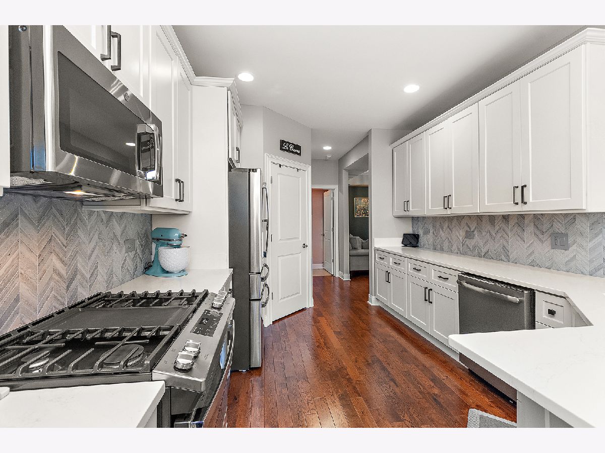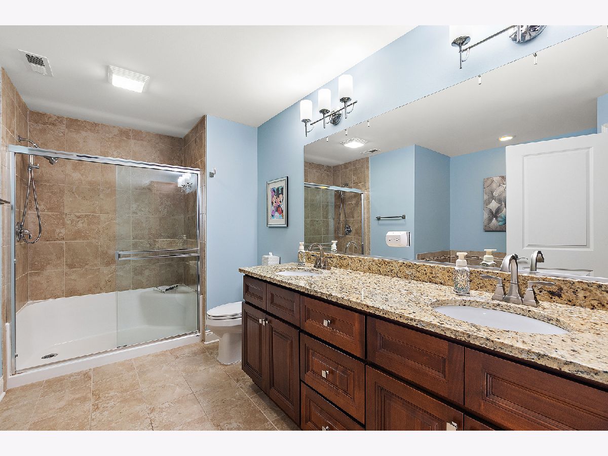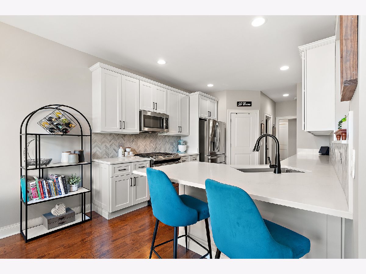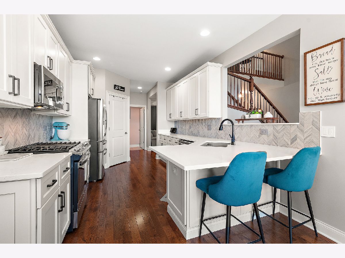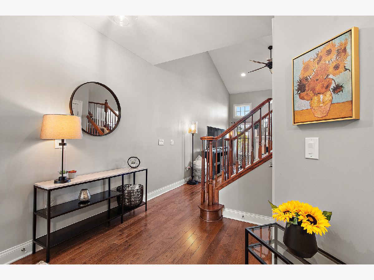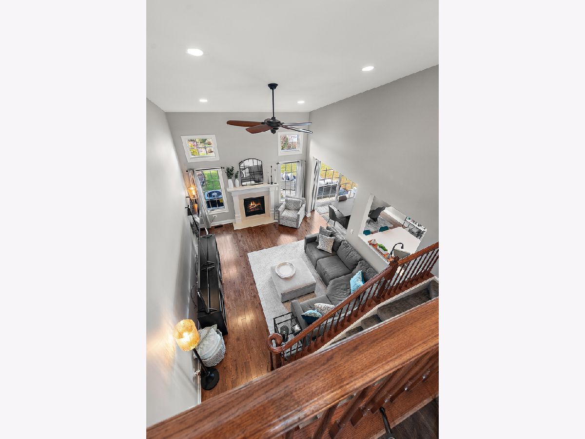 Impeccably maintained and truly turn-key, this beautifully updated 2-bedroom plus loft, 3.5-bath townhome in Lighthouse Pointe offers a like-new living experience on a premium waterfront lot. Thoughtfully improved with high-end finishes throughout, the home combines modern design, functional upgrades, and tranquil water views, allowing you to move in with confidence and ease. The two-story living room is filled with natural light and showcases hardwood floors, a granite-surround fireplace, and expansive windows framing peaceful water views. The custom kitchen rivals new construction, featuring quartz countertops, a striking herringbone stone backsplash, stainless steel appliances, a composite sink, pantry closet, and soft-close cabinetry, designed for both everyday living and entertaining. The adjoining dining area opens to the patio through oversized sliding glass doors with a transom window, creating a seamless indoor-outdoor connection. A formal dining room, currently styled as a sitting area, adds versatility and refinement with hardwood floors and a tray ceiling. A main-level laundry room with sink and cabinetry enhances convenience. Upstairs, the primary suite delivers a private retreat, complete with vaulted ceilings, dual walk-in closets with custom organizers, and a spa-inspired bath featuring a whirlpool tub, separate shower, and granite double vanity. The loft provides flexible space ideal for a home office, reading nook, or lounge, while the second bedroom enjoys morning light and calming water views. The finished basement significantly expands the living space, offering a recreation or fitness area, a full bath with heated floors and a double walk-in shower, plus a utility room and additional unfinished space for future expansion or storage. This home has been meticulously cared for and offers maintenance-free living, with landscaping and snow removal included, ideal for buyers seeking a low-maintenance, high-quality lifestyle. Outdoors, the concrete patio overlooks the water and provides a private setting for morning coffee, entertaining, or relaxing at the end of the day. Ideally located near Starbucks, scenic walking paths, and direct access to the Old Plank Trail, with convenient proximity to major expressways, this residence delivers the condition and ease of new construction paired with the rarity of a premium waterfront setting.