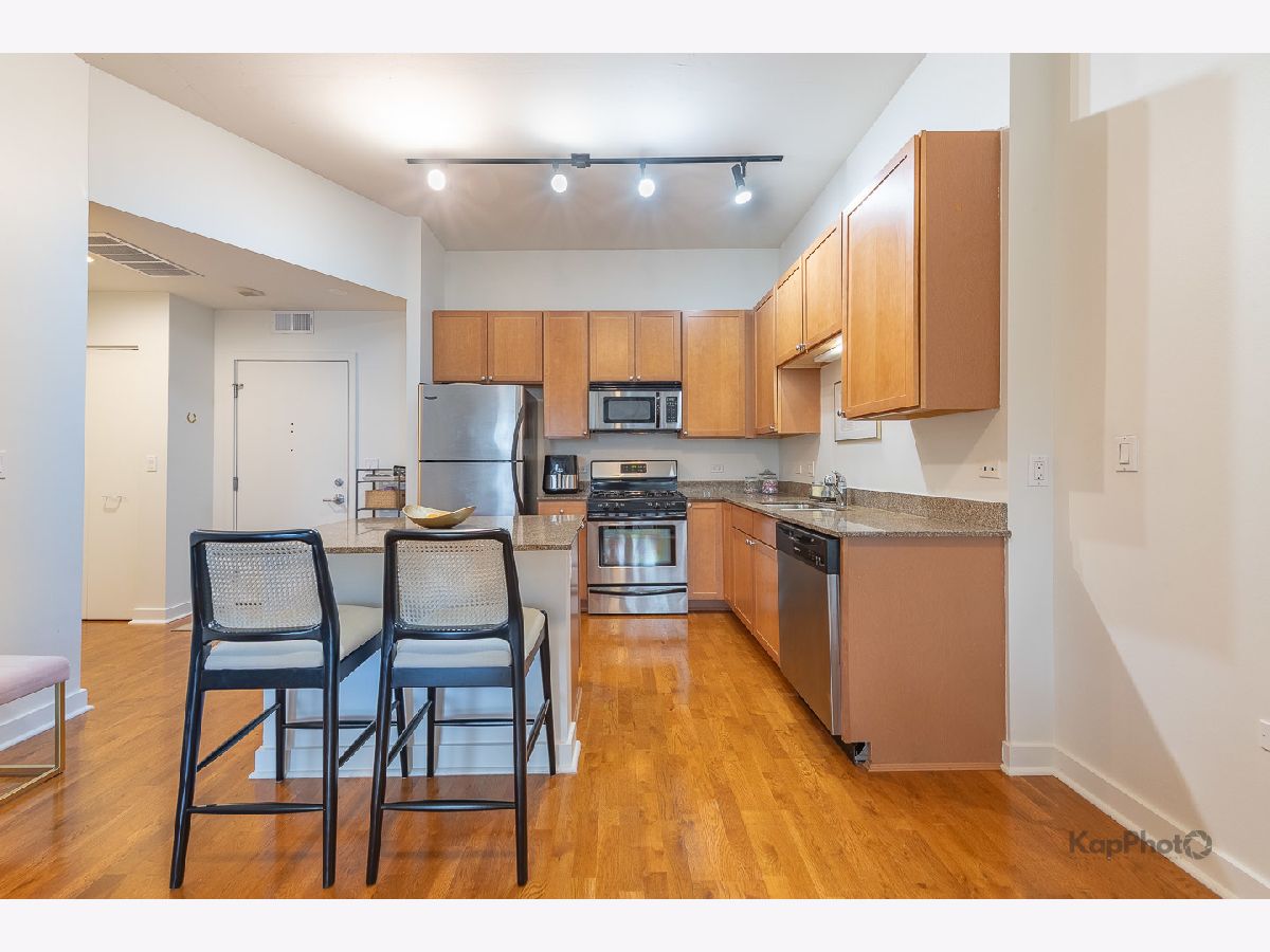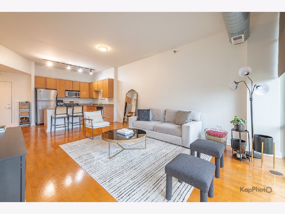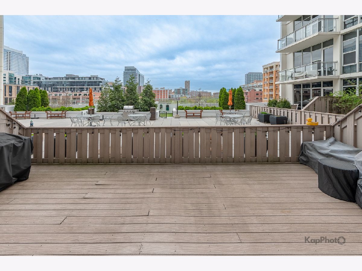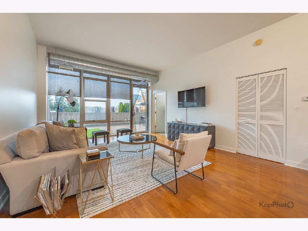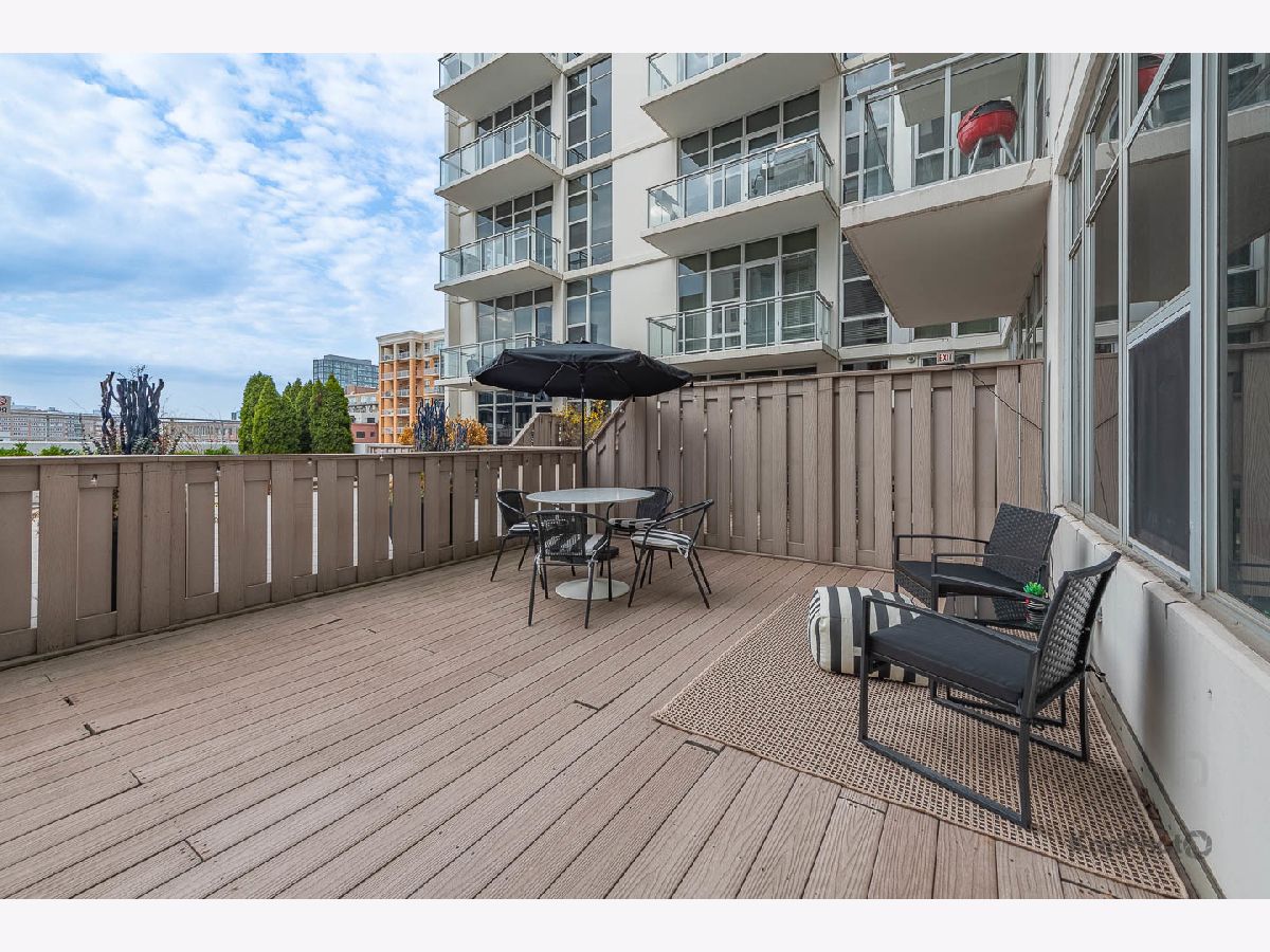 Spacious and pristine south facing 1 bed/1 bath with huge private terrace and best parking space in high amenity building and outstanding West Loop location. Exceptional bright and recently painted, this unit is appointed with hardwood floors, tall ceilings, large windows, and in-unit washer/dryer. Kitchen features plenty of cabinet space, stainless steel appliances, granite countertops, and large island. Fully enclosed bedroom with access to bathroom that also serves as a powder room. Highly inclusive monthly assessment includes heat, gas, internet, and water. Amenities include door staff, gym, 4th floor courtyard, dog run, top floor sundeck, recreation/party room, storage cage, and bike storage. Prime heated end parking space an additional $35,000. Situated on Madison Row only a block to Mary Bartelme Park and steps to Whole Foods, Mariano's, shops, restaurants, the loop, public transportation, Greektown, and the Fulton Market District.