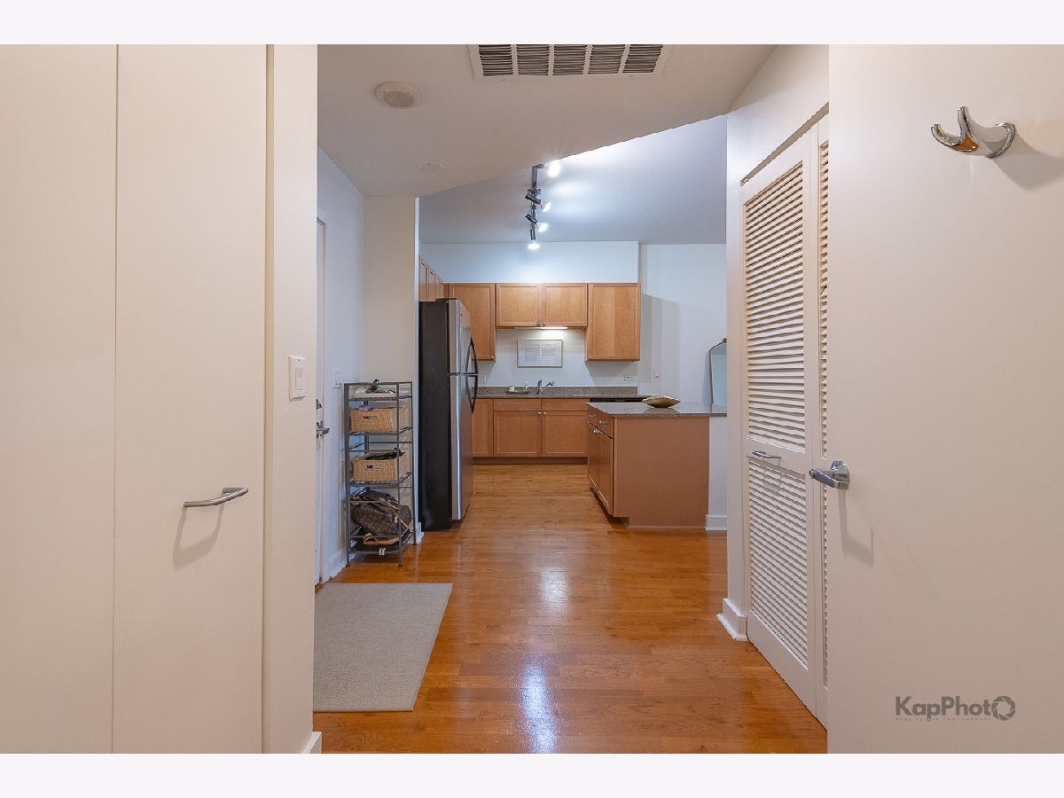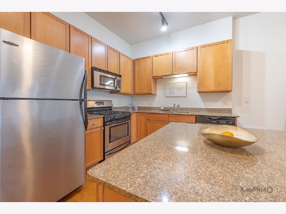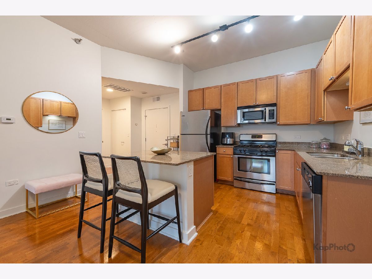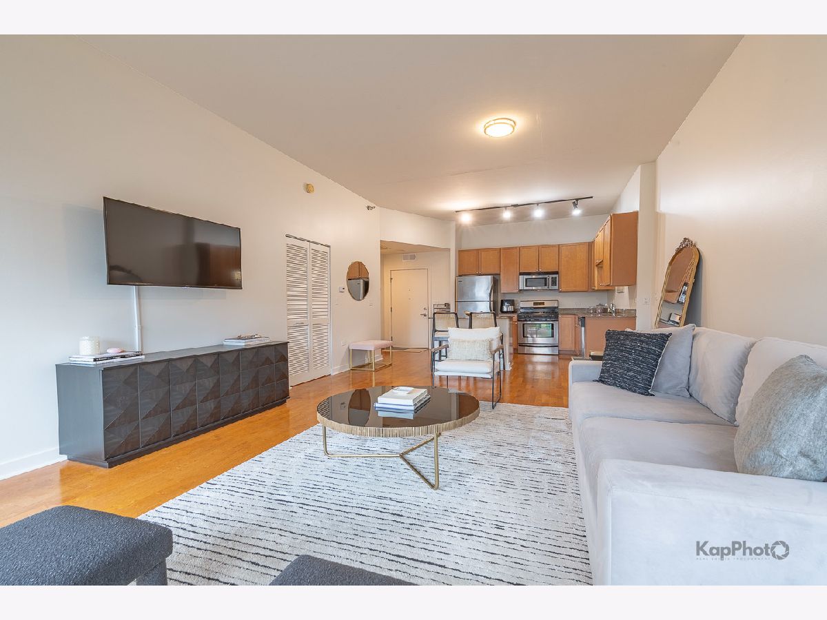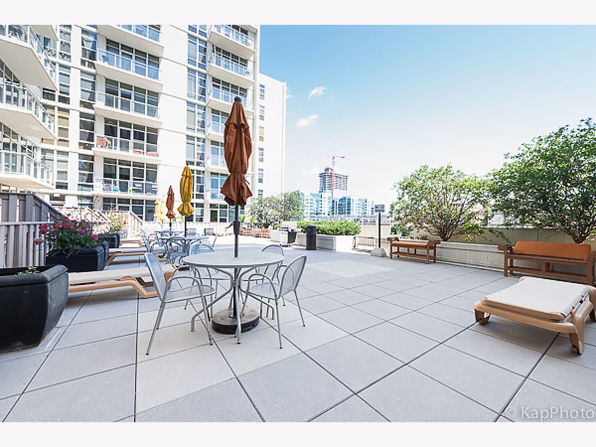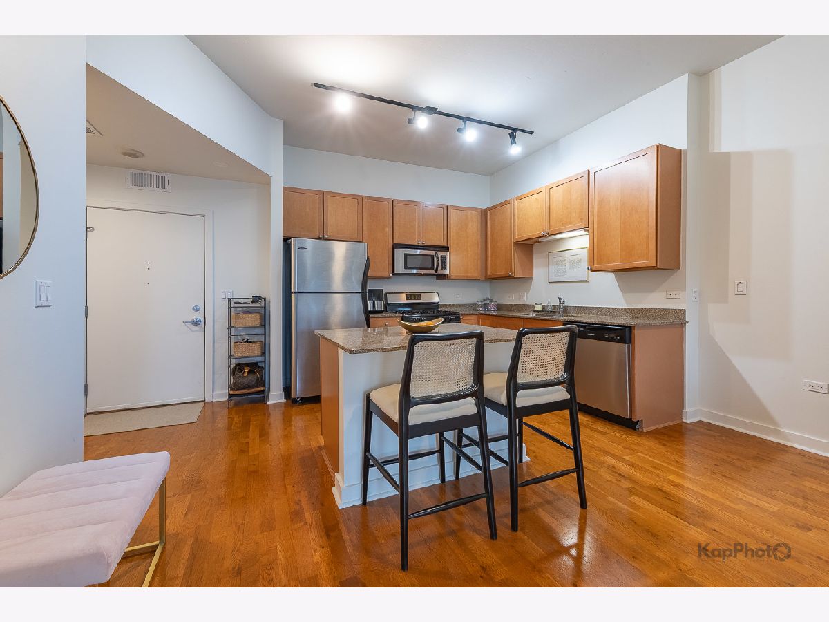 Spacious and pristine south facing 1 bed/1 bath with huge private terrace and best parking space in high amenity building and outstanding West Loop location. Exceptional bright and recently painted, this unit is appointed with hardwood floors, tall ceilings, large windows, and in-unit washer/dryer. Kitchen features plenty of cabinet space, stainless steel appliances, granite countertops, and large island. Fully enclosed bedroom with access to bathroom that also serves as a powder room. Highly inclusive monthly assessment includes heat, gas, internet, and water. Amenities include door staff, gym, 4th floor courtyard, dog run, top floor sundeck, recreation/party room, storage cage, and bike storage. Prime heated end parking space an additional $35,000. Situated on Madison Row only a block to Mary Bartelme Park and steps to Whole Foods, Mariano's, shops, restaurants, the loop, public transportation, Greektown, and the Fulton Market District.