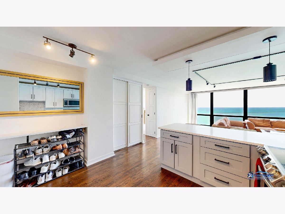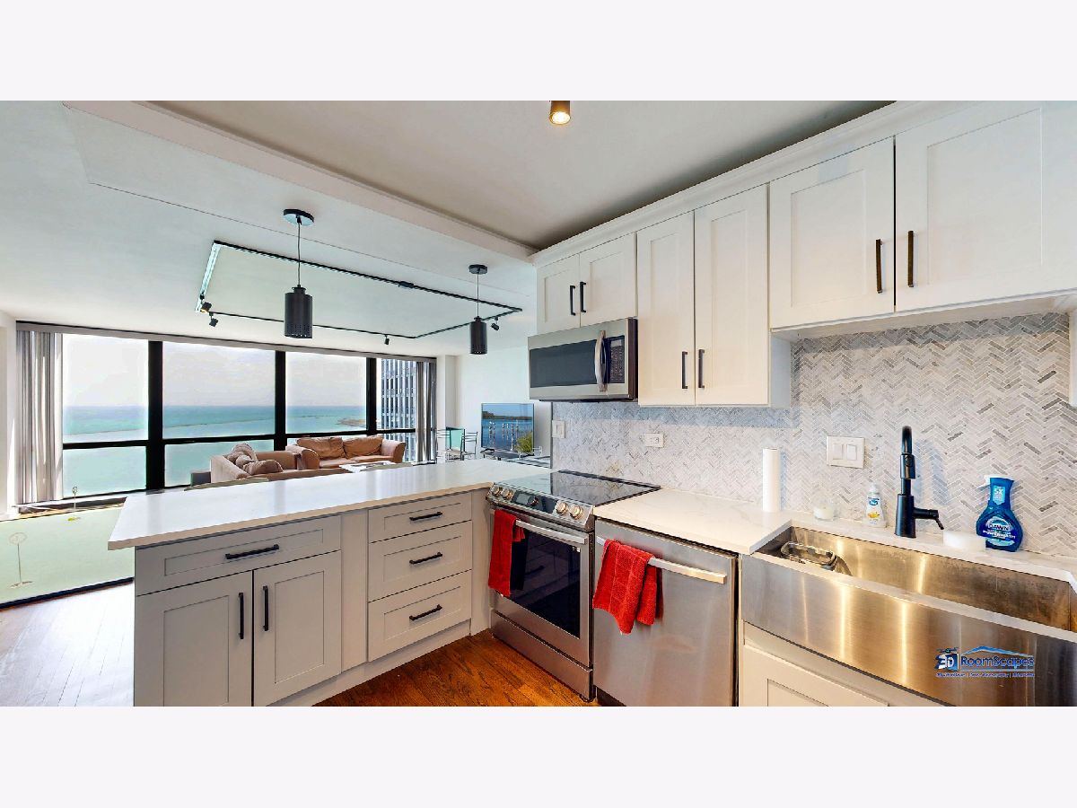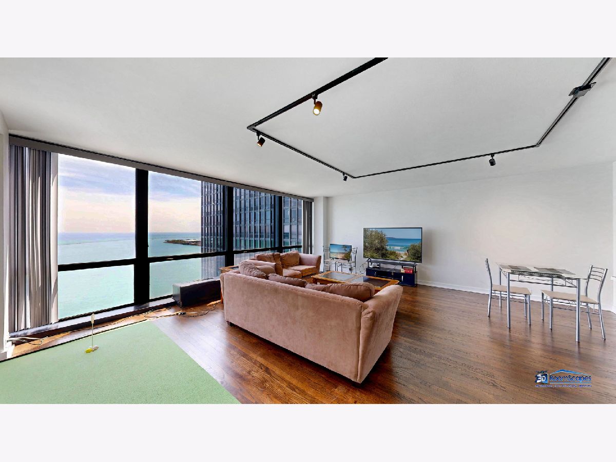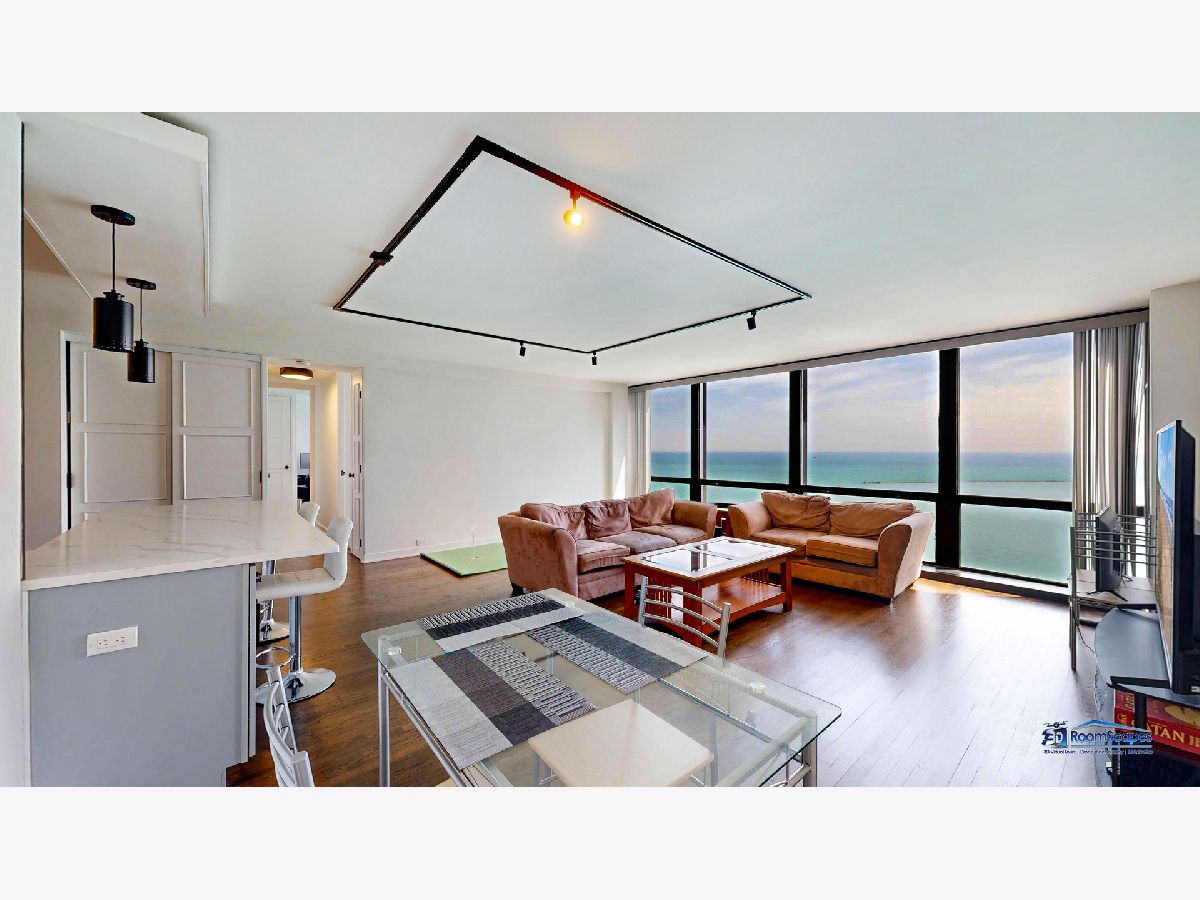 Experience unparalleled lake views from this elegantly renovated 2-bedroom, 2-bathroom condo, ideally situated in the heart of Streeterville. This fabulous unit offers a sophisticated living experience with a beautifully appointed kitchen featuring custom shaker cabinets, quartz countertops, and high-end stainless-steel appliances. Rich dark walnut hardwood floors flow through the bright, open concept living space, illuminated by expansive windows that frame the lake. Two generous bedrooms provide comfort, while the primary suite offers a luxurious escape with a roomy walk-in closet. Both bathrooms are a testament to meticulous design, boasting premium finishes, custom vanities, and elegant fixtures. Beyond the modern luxury and breathtaking views from every room, you'll enjoy building amenities like a 24-hour doorman, on-site management, laundry, and a spacious sundeck. This unbeatable location puts you steps from Oak Street Beach, The Mag Mile, Chicago's finest restaurants, and cultural attractions, offering the quintessential city lifestyle. The building leases parking spaces in the attached garage for $300/space.