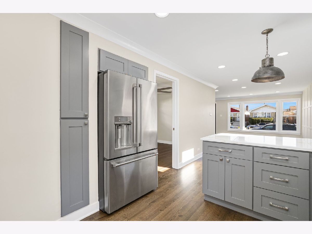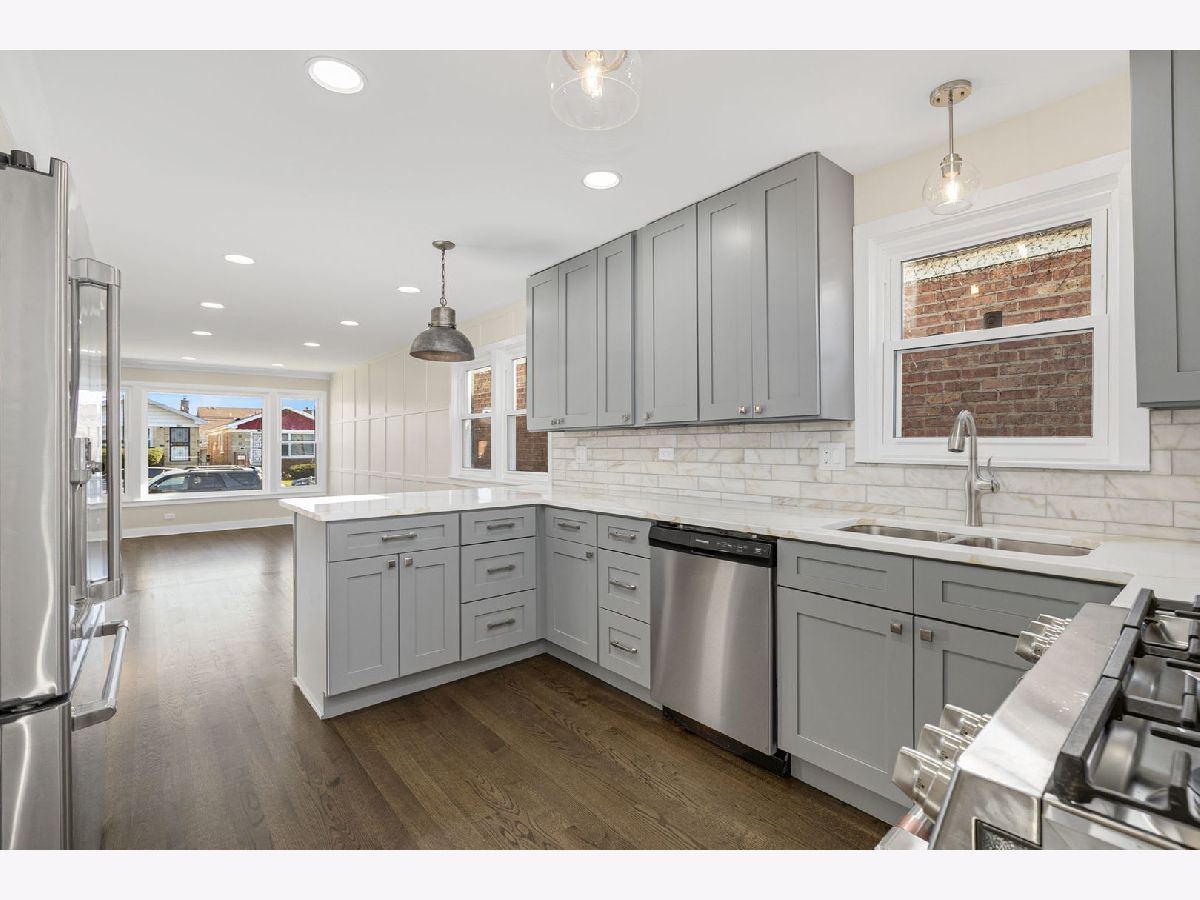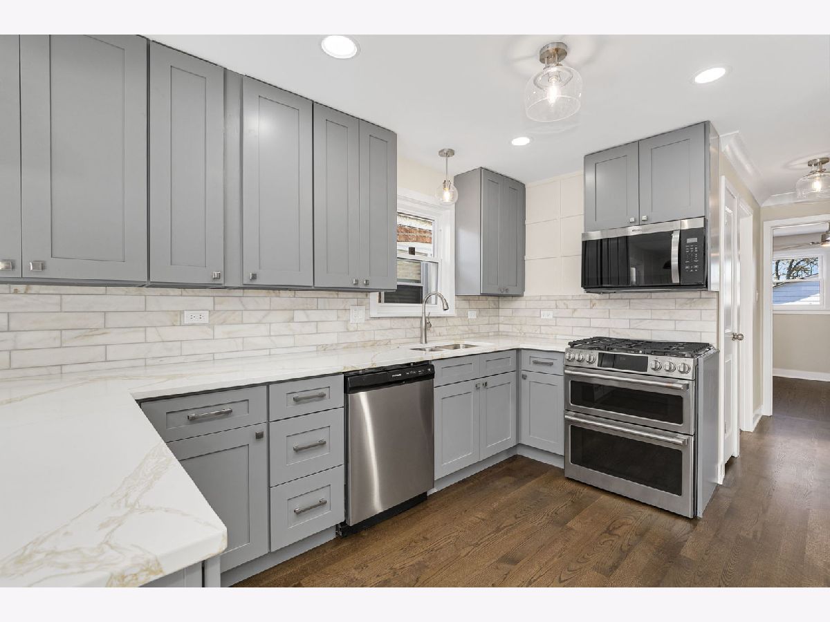 Beautifully updated, 4 bedroom, 2 bath solid brick ranch home. Open the door and enter your spacious living room with a stone fireplace. The open concept has a full dining area with beautiful new oak hardwood flooring throughout. The chef's kitchen, with quartz countertops pulls out all the stops. Full stainless steel appliance package, custom pendant lighting, subway tile backsplash and a spacious island on hardwood flooring makes this kitchen a show stopper. Three main level bedrooms with new oak hardwood flooring and 1 full bath completes the first floor. The perfectly finished full basement includes a 4th bedroom with a full connecting bathroom, large family area, separate laundry room and great storage spaces. The enclosed backyard with a full sized deck is an ideal space to grill or relax with family or friends. A two-car garage completes this perfectly renovated home. The location is convenient to public transportation, 90/94 expressway is within minutes of your home. The previous deal fell through because of buyer's financing.