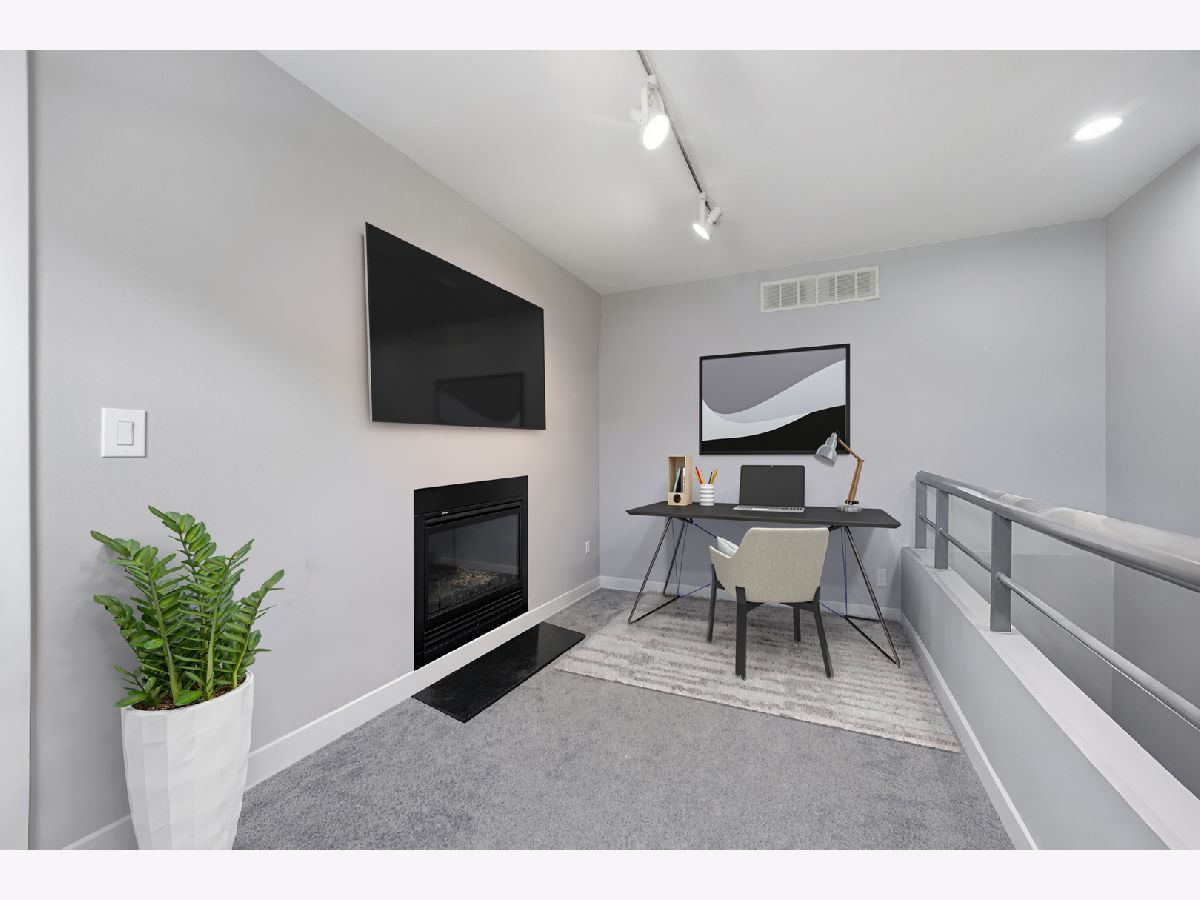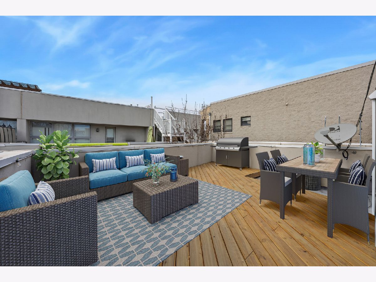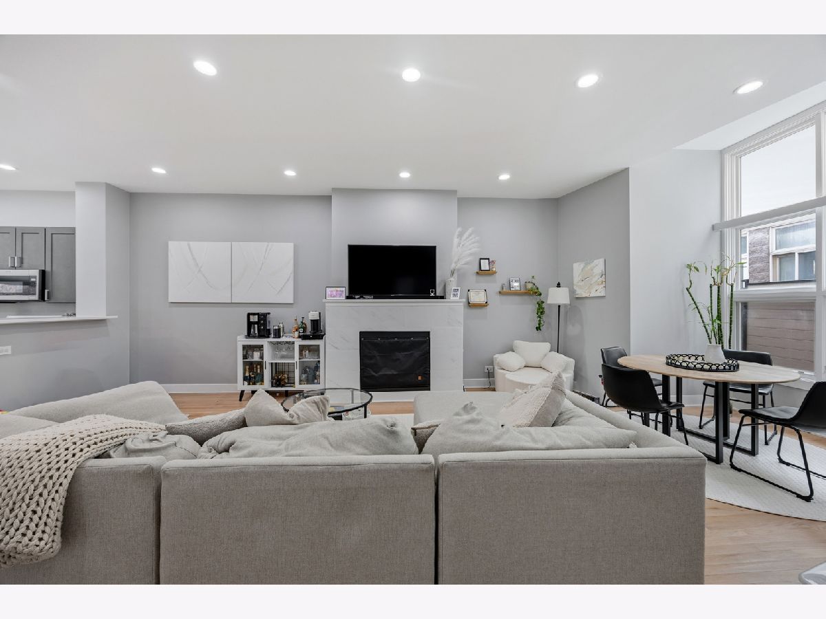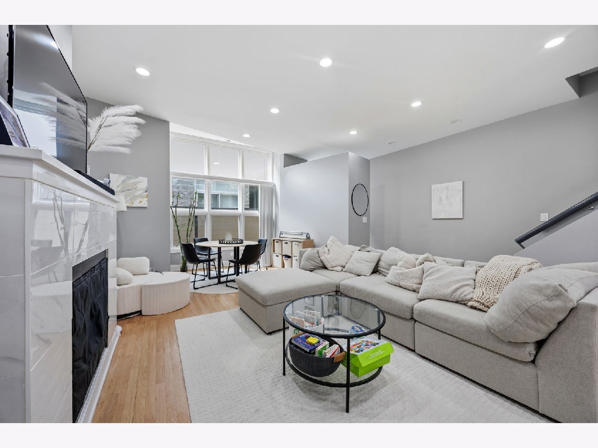 HOT West Town's River West stunning three-level townhouse style 2-bed+den 2-bath condo. This 2024 renovation boasts a spacious open floor plan featuring beautiful oak floors on main level, a large kitchen with quartz countertops including large breakfast bar, custom cabinetry, LG, Whirlpool, and Samsung appliances. Relax or entertain in the huge living room with fireplace. Spacious master bedroom ensuite with double vanity bath, marble tile and a huge walk-in shower. Yes, the second bedroom is large!!!... with attached terrace! Third level den is perfect for a loft bedroom or home office. Entertain on your spacious rooftop deck (2024). TWO PARKING SPACES!-ONE garage parking space PLUS a 2nd exterior parking pad spot. Low HOA. Steps to vibrant restaurants, nightlife, boutiques, and the nearby music venue, The Salt Shed. Tremendous location with easy access to I94 and proximity to the CTA Blue Line!