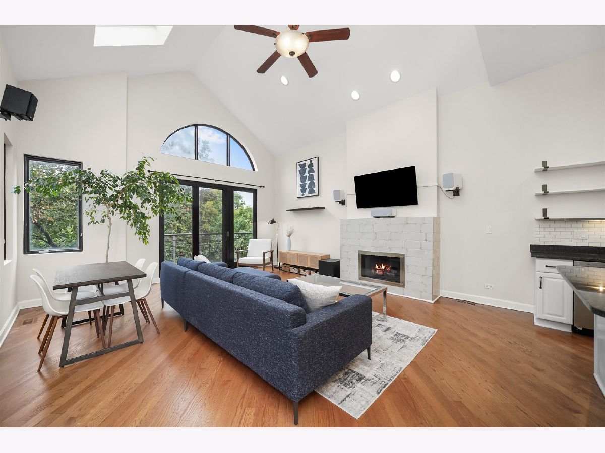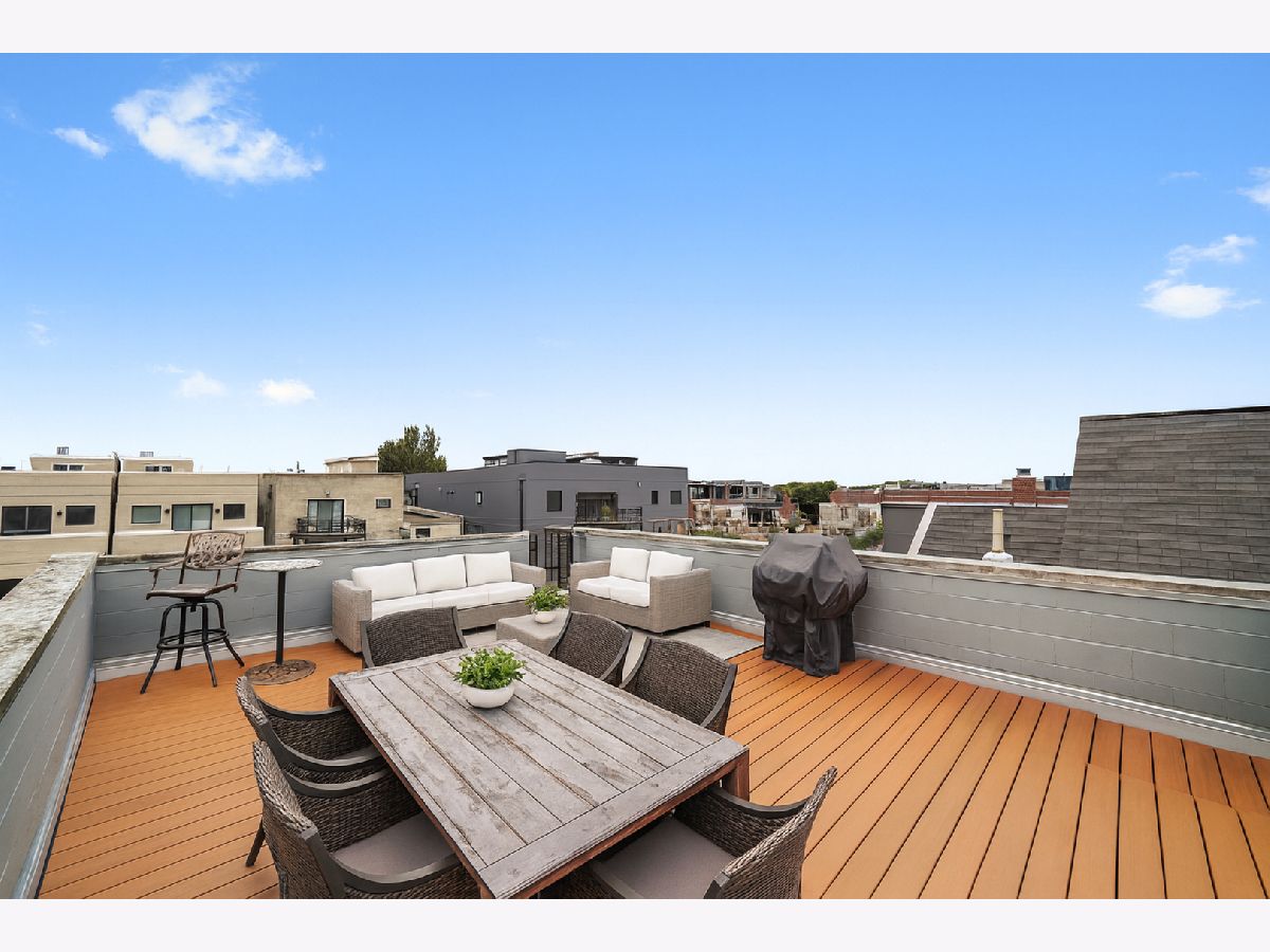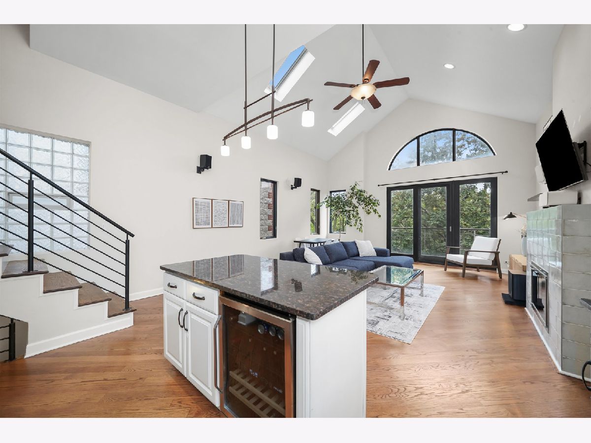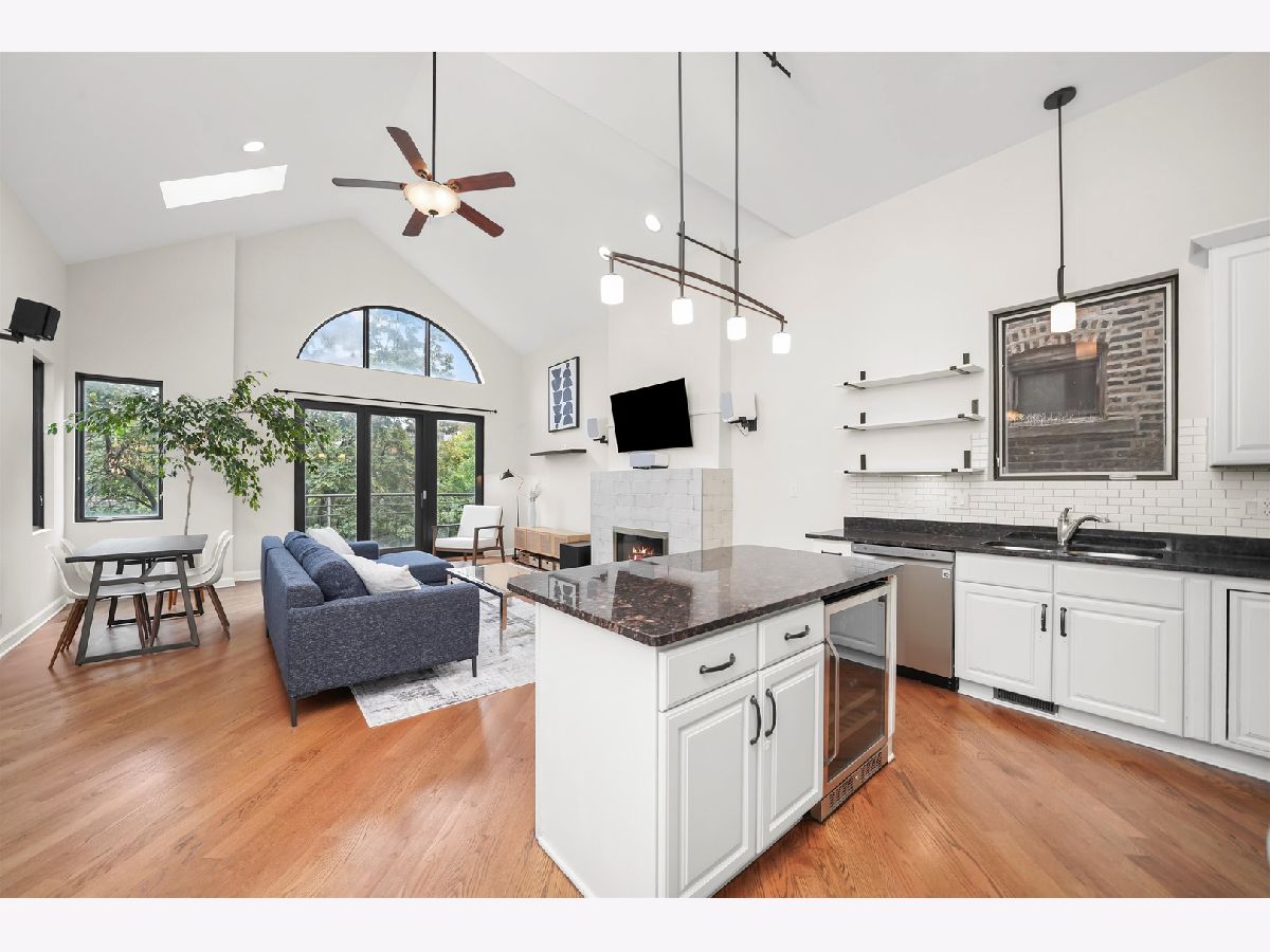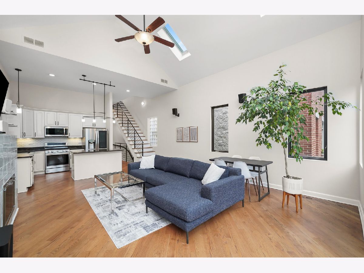 Penthouse 2BD/2BA Condo in the Heart of West Town! Experience contemporary living in this stunning penthouse featuring soaring 11-18 ft cathedral ceilings, skylights, and abundant natural light from every direction - plus your very own private rooftop deck! The open-concept living and dining area showcases a modern gas/wood-burning fireplace, hardwood floors, and built-in sound wiring, perfect for entertaining. The updated kitchen boasts stainless steel LG appliances, a beverage fridge, granite countertops, subway tile backsplash, white cabinetry, and a functional island with seating. The primary suite offers a walk-in closet with custom built-ins, a completely remodeled en suite bath (2019), and direct access to a private deck. The second bath features a jetted tub and heated floors. Additional highlights include in-unit laundry, central air and heat with a smart thermostat, freshly painted interiors, and modern finishes throughout. A dramatic staircase leads to the private rooftop deck with breathtaking skyline views - perfect for relaxing or entertaining. Garage parking and additional storage are included in the price, with easy street parking available on Winchester. Ideally located on a quiet, tree-lined street just steps from Ukrainian Village, Wicker Park, River West, and Noble Square. Low assessments and taxes make this a standout opportunity. Explore the property in 3D - click the 3D button to take a virtual tour and experience every detail!