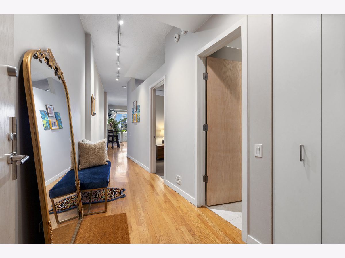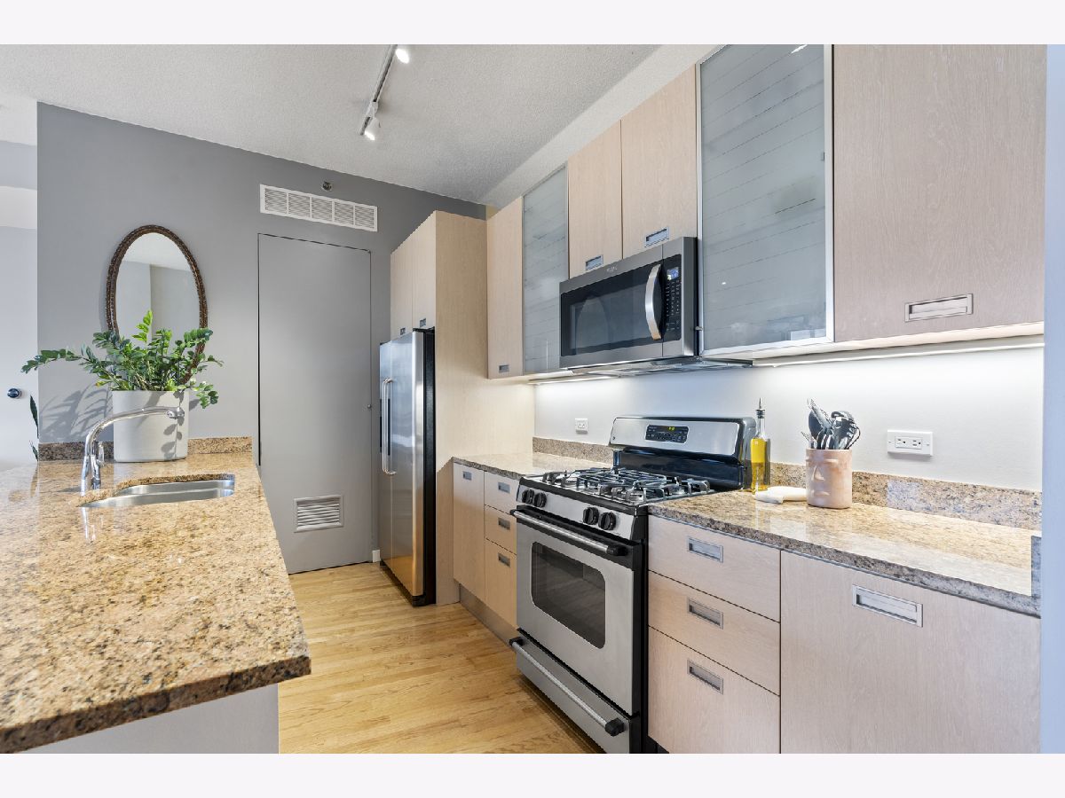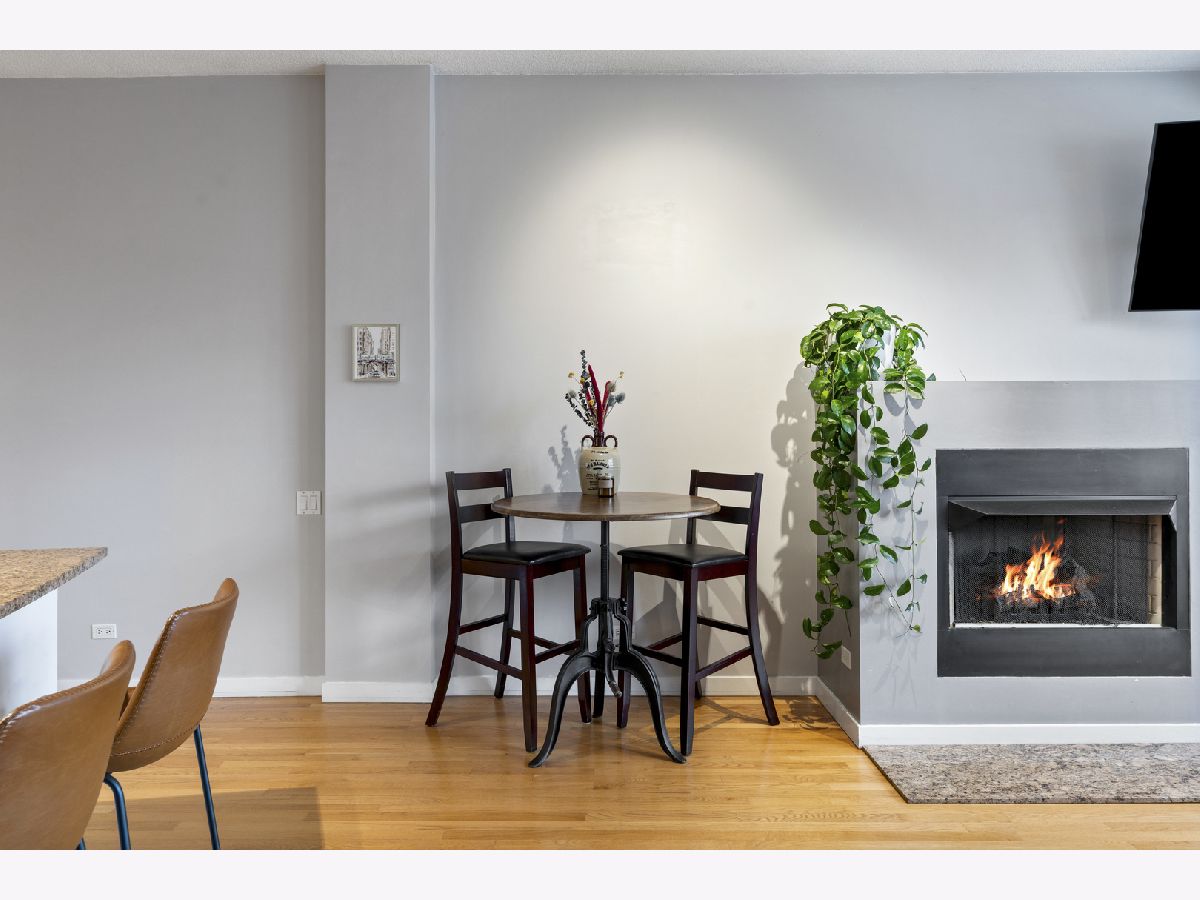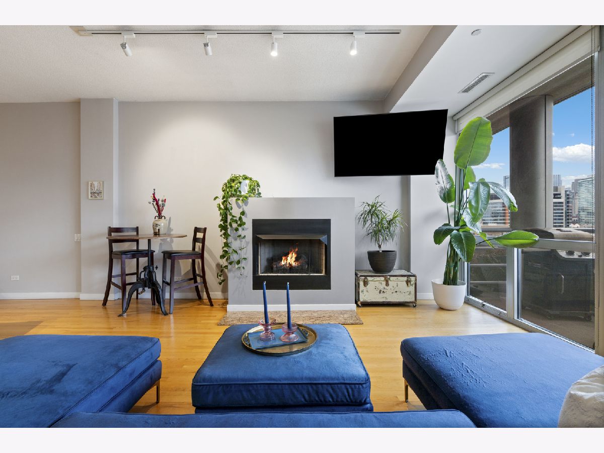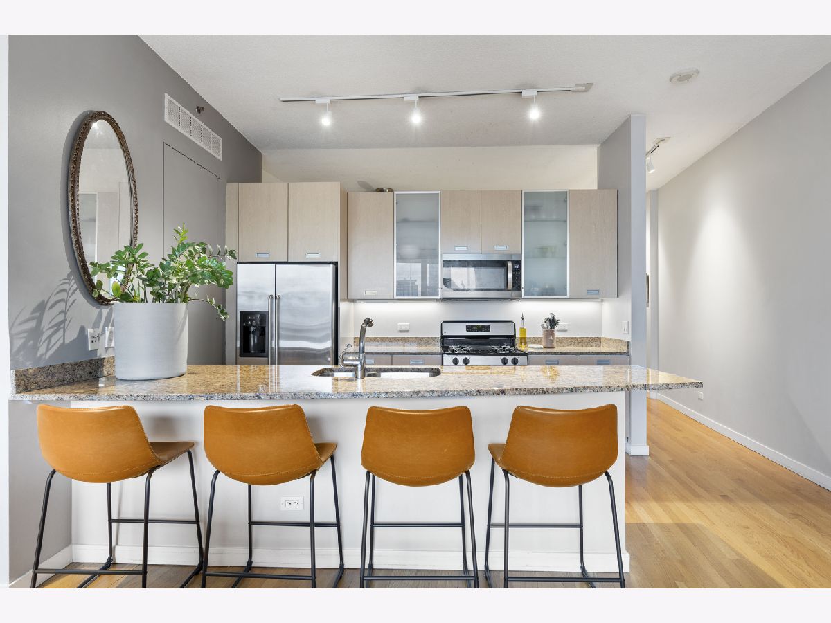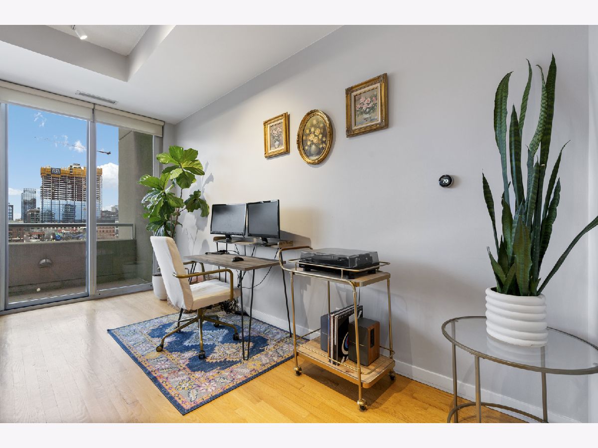 Enjoy stunning, unobstructed and protected skyline views from this oversized 1-bedroom condo in a boutique elevator building in the heart of River West. The updated kitchen features granite countertops, stainless steel appliances, sleek flat-panel cabinetry, and a peninsula that opens to an extra-wide living room with a cozy gas fireplace and a full wall of south-facing windows, filling the space with natural light and complemented by impressive 10' ceilings. Step out onto your private covered balcony spanning the full width of the unit, perfect for morning coffee, grilling, or unwinding with skyline views at the end of the day. The spacious bedroom comfortably fits king-sized furniture and offers a full wall of professionally organized closets. Spa-like bathroom with elegant Crema Marfil stone, oversized vanity, and glass-enclosed whirlpool tub/shower combo. Additional features include in-unit laundry, oak hardwood floors, and upgraded Traco windows providing excellent sound insulation for a quiet, serene home. Professionally managed, pet- and investor-friendly building with Butterfly access and new security camera system; high-speed internet included in HOA. Unbeatable location near the Blue Line, 90/94, and all the dining, shopping, and nightlife River West, Fulton Market, West Loop, River North, and Wicker Park have to offer. Heated attached garage parking available for $25K.