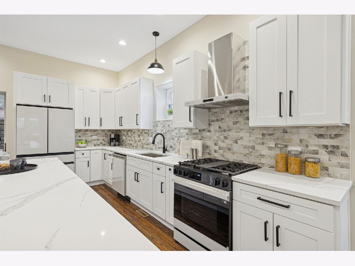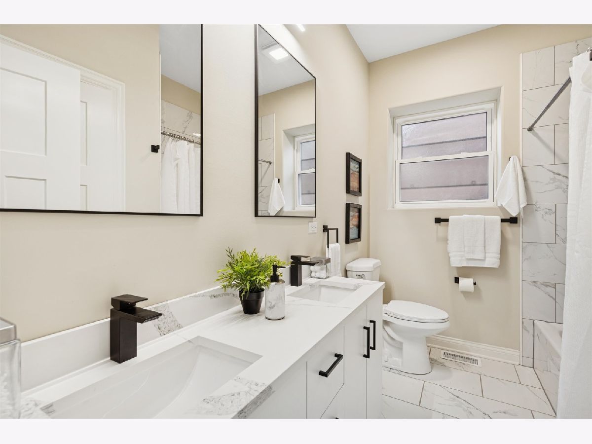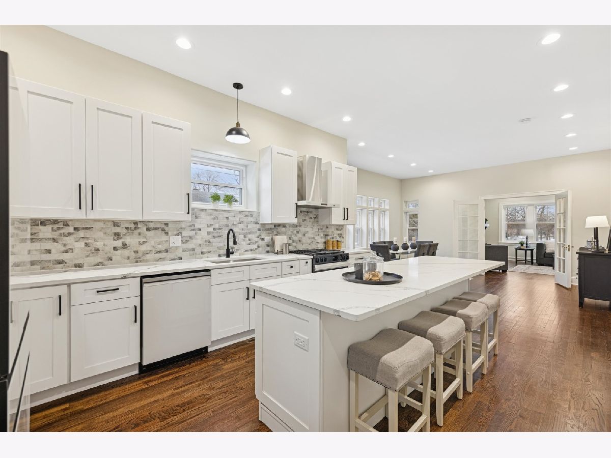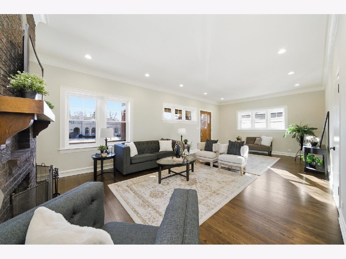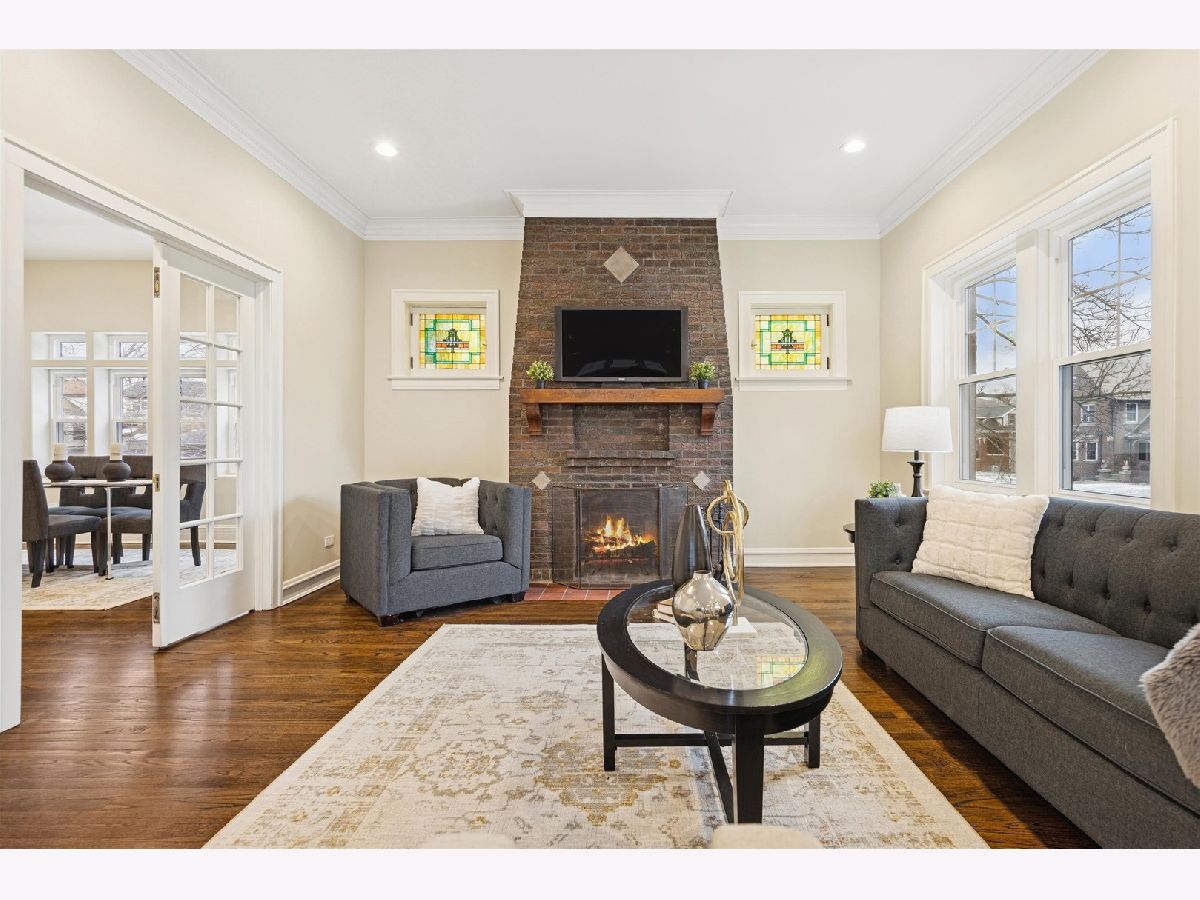 Meticulously Renovated 1920's Craftsman 5 Bedrm 4 Bath Bungalow located in prime Beverly location surrounded by a rich mix of architectural styles. It includes timeless home designs such as a 30-foot covered Front Porch, long overhanging eaves, and a broad band of windows across the front. Step into the Grand Living Room. featuring an original fireplace flanked by 2 original stained-glass windows. 10-foot ceilings and hardwood floors span the main level, highlighted by a first-floor primary ensuite offering a spa-like bath with dual sinks, Carrara marble shower, and an expansive walk-in closet. The inviting custom kitchen showcases 42" white Shaker cabinetry, quartz countertops, Samsung Bespoke appliances, a striking recycled-glass backsplash, and an impressive 10-foot center island-perfect for everyday living and entertaining. A refined staircase leads to the second level featuring two additional bedrooms with walk-in closets and a beautifully designed third bath with dual sinks and a soaking tub. The fully finished 1,600-sq-ft basement expands your living space with an enormous family room, fifth bedroom, and a generous flex room ideal for a home office, gym, or playroom. Updates include: windows, roof, high-efficiency HVAC, plumbing, electrical, doors, trim, hardware, carpeting, recessed lighting, and a basement check valve. The restored and tuck-pointed brick exterior is complemented by an updated front walkway, professional landscaping, and a picture-perfect backyard with a privacy fence a brick paver patio.& a refreshed brick two-car garage. Unbeatable location near top-rated schools, parks, and shopping, with a short walk to the Metra for easy commuting. A true gem-welcome home. Additional Photos being Posted 1/26