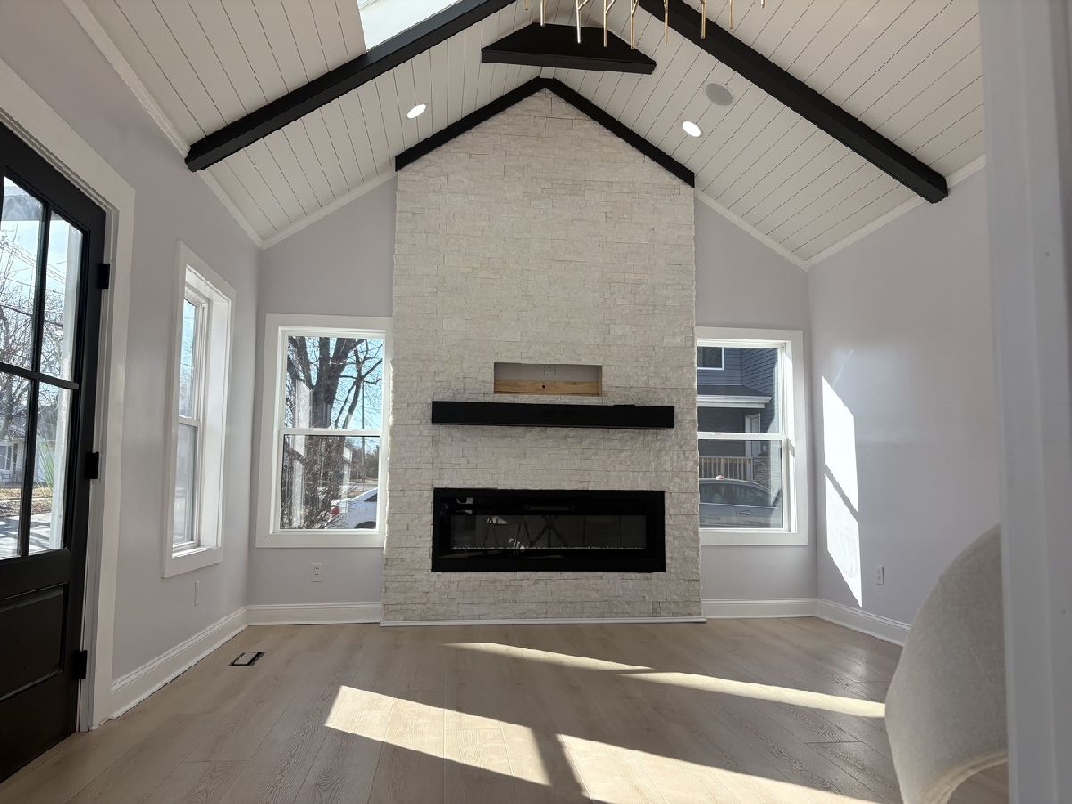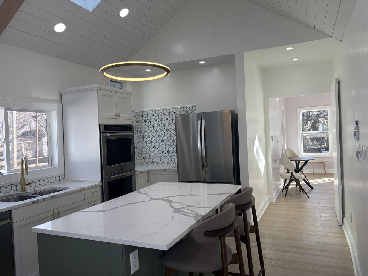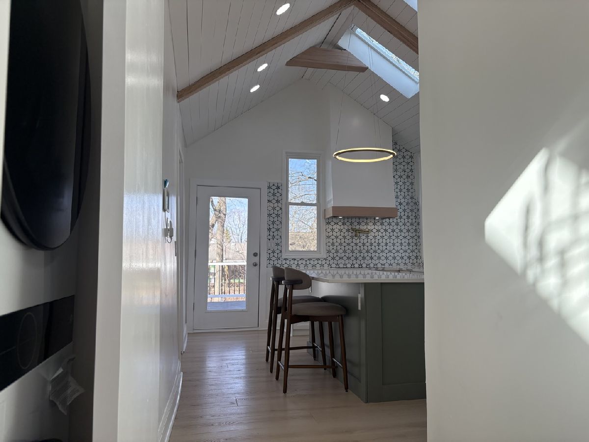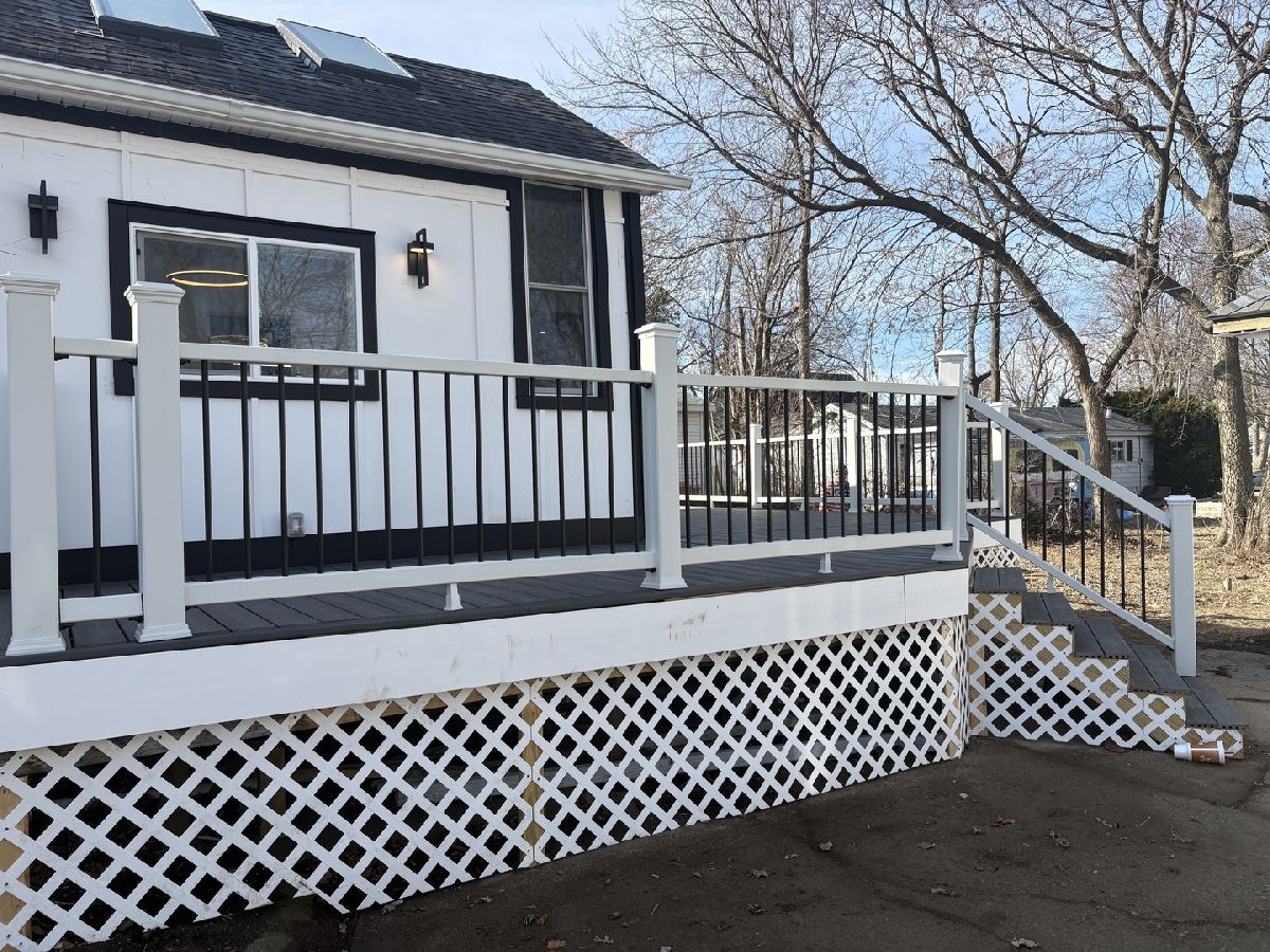 Redesigned, updated. Vaulted ceilings, 60" decorative fireplace, luxury vinyl, unique lighting . Bedroom has huge bath with electronic stool and walk in closet. 2nd Bedroom freestanding stool, tile floor, towel warmer. Laundry closet.Incredible kitchen with quartz counter tops. Kitchen aid 30" double oven, (appx $ 3,000) flat top stove, pot filler, LG refrigerator and dishwasher. New Pella and United windows. Trex fenced deck about 512 square feet, 5 speakers.Garage has new concrete floor . 4 skylights with blinds.