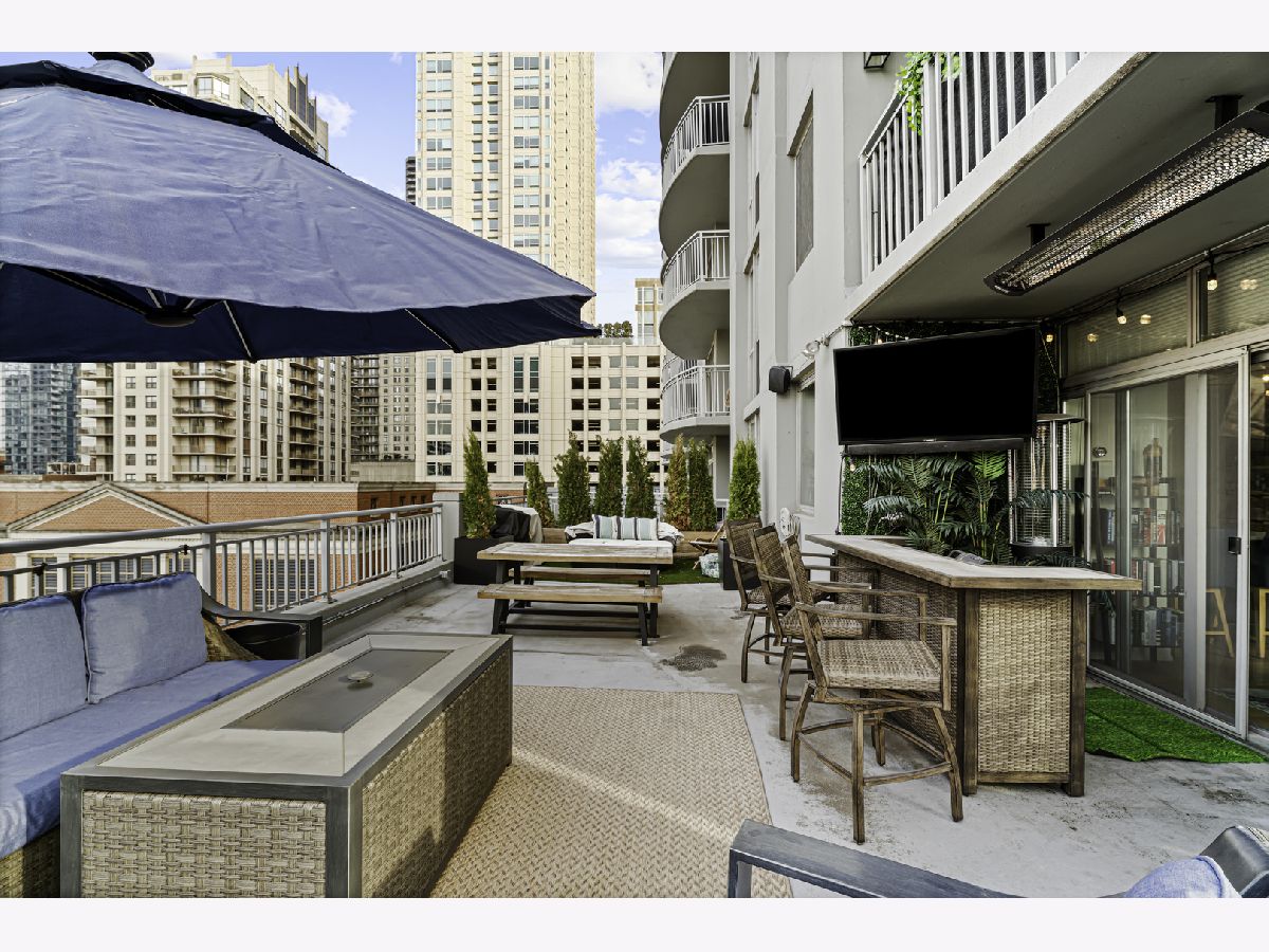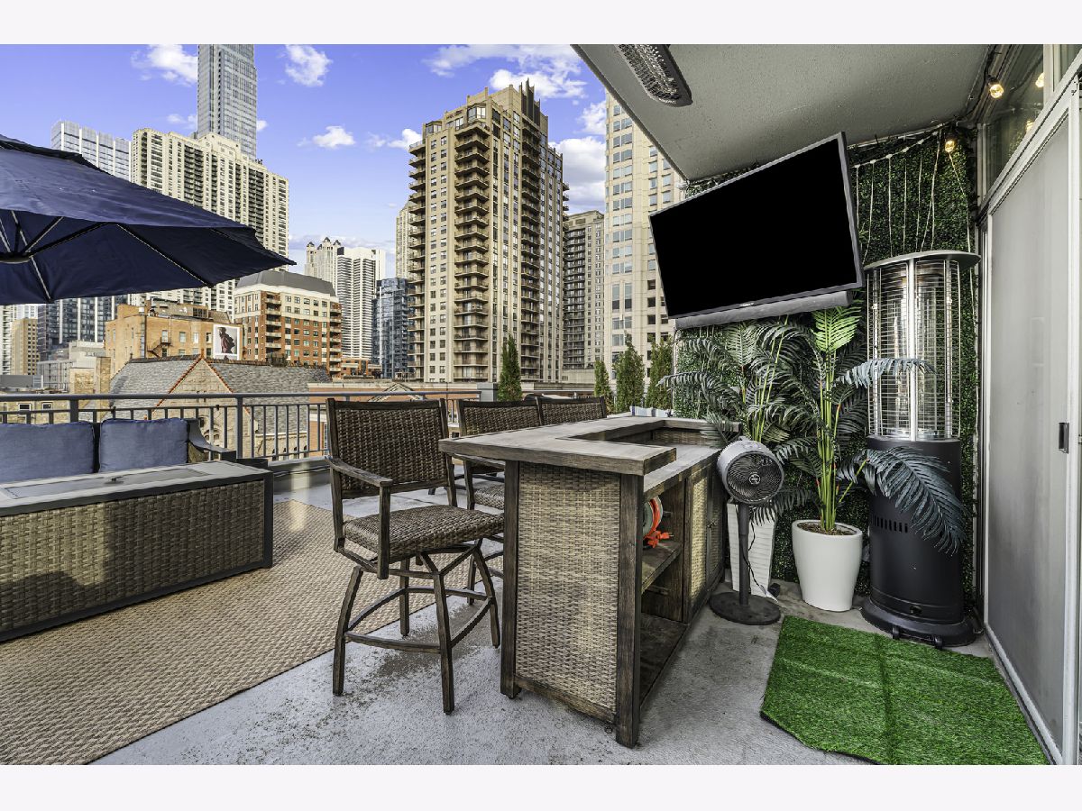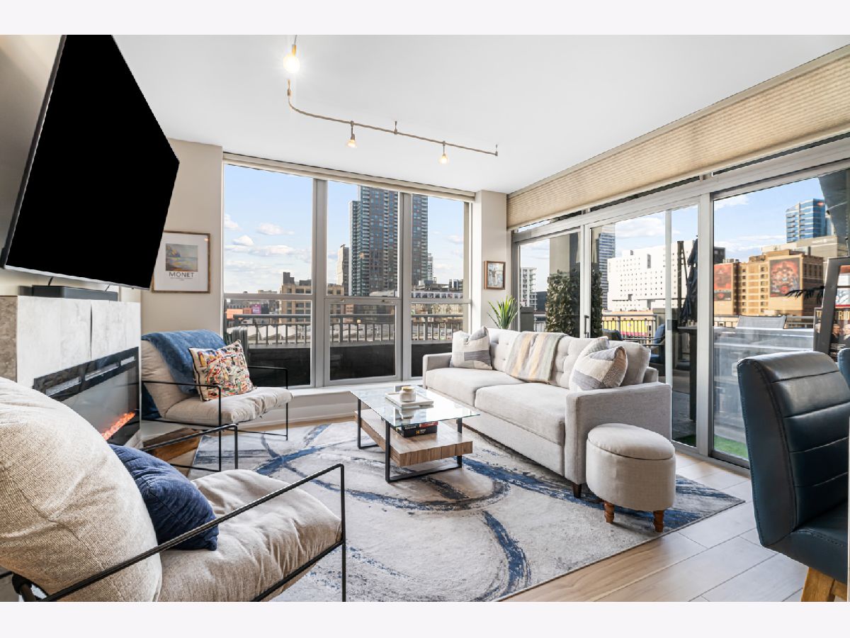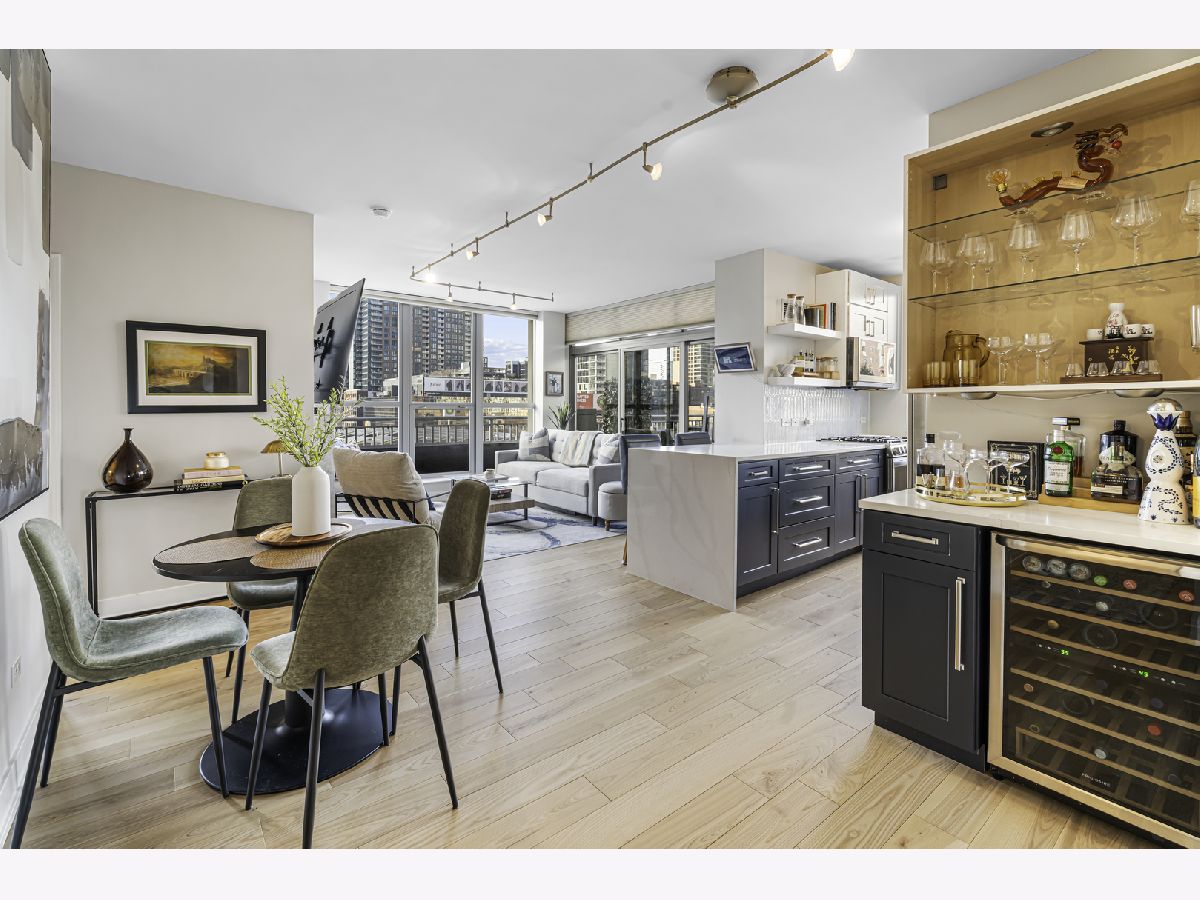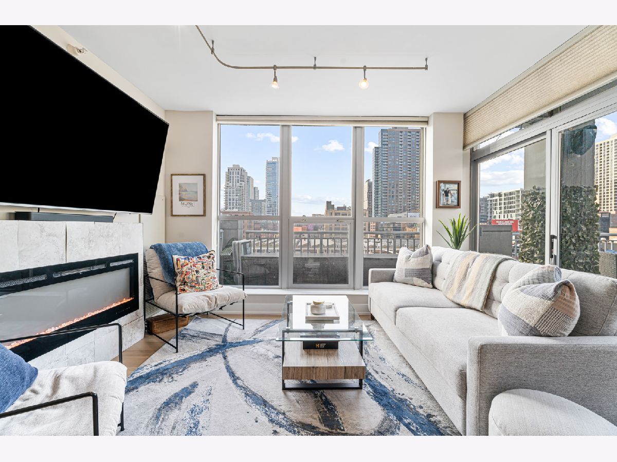 Experience elevated city living in this stunning 2 bedrooms/2-bathroom corner residence in the heart of River North. Floor-to-ceiling windows wrap the home in natural light while delivering dramatic skyline and sunset views. The open-concept living and dining areas flow seamlessly into a sleek, newly renovated kitchen featuring new cabinetry, waterfall stone countertops, a built-in wine fridge and bar, and all new stainless-steel appliances. A true standout is the expansive private terrace, fully upgraded with new electrical, lighting, TV hookup, heater (2024), and outdoor bar, creating an incredible extension of your living space for all seasons. The serene primary bedroom includes a walk-through custom closet and a spa-like bath with heated floors, dual vanities, and a walk-in shower. A split-bedroom layout provides privacy for guests or home office needs. Additional features include in-unit laundry, storage, and a deeded garage parking space. Enjoy full-service living in a well-managed building offering 24-hour door staff, fitness center, sundeck, hospitality suite, party room, dry-clean lockers, and on-site management. Monthly assessments include heat, gas, cable, and internet. All of this only steps from the Riverwalk, Ohio Street Beach, the CTA, premier shopping, dining, and nightlife.