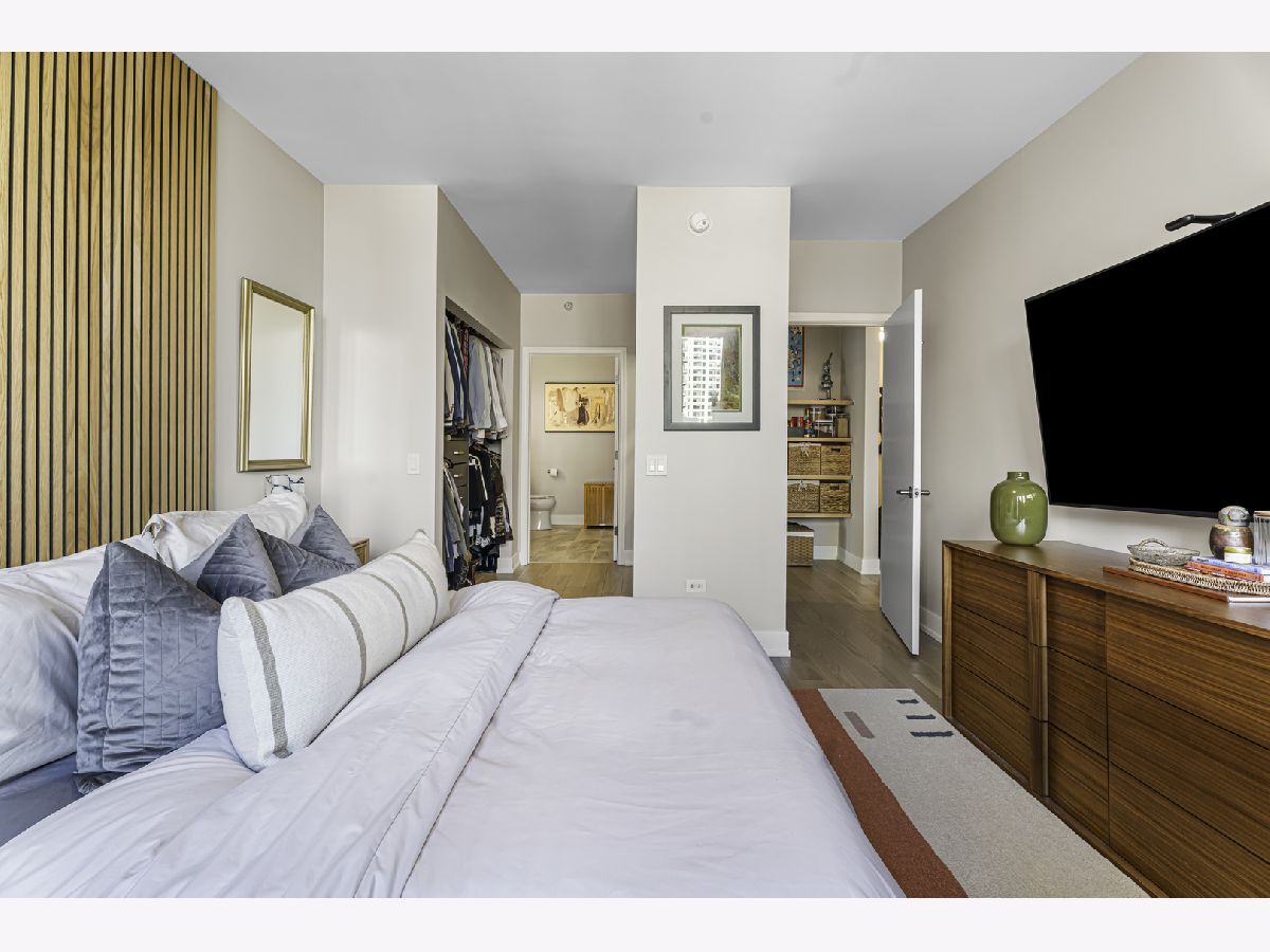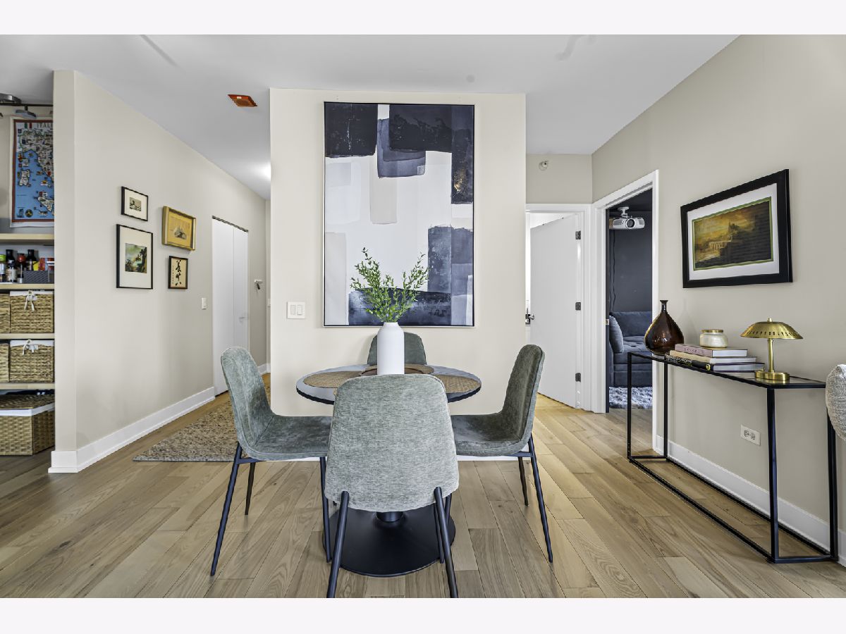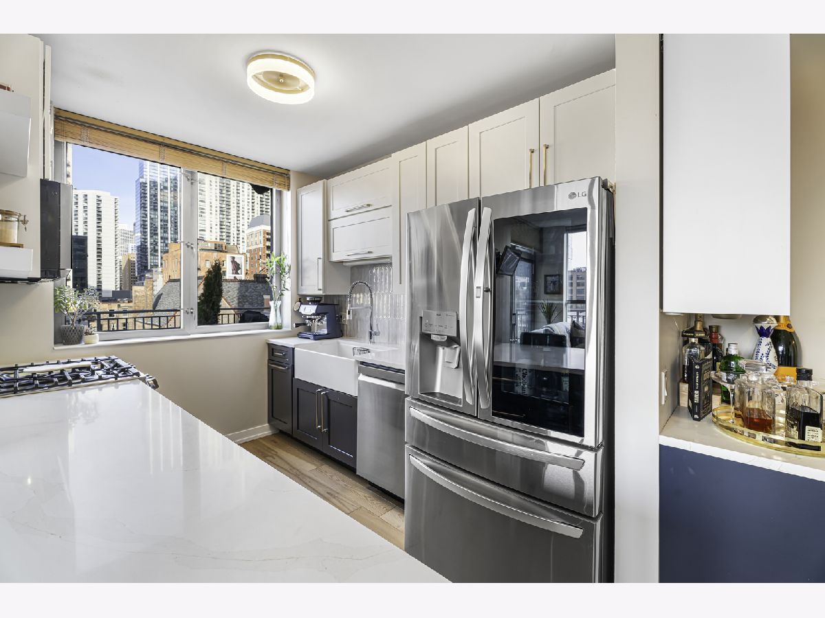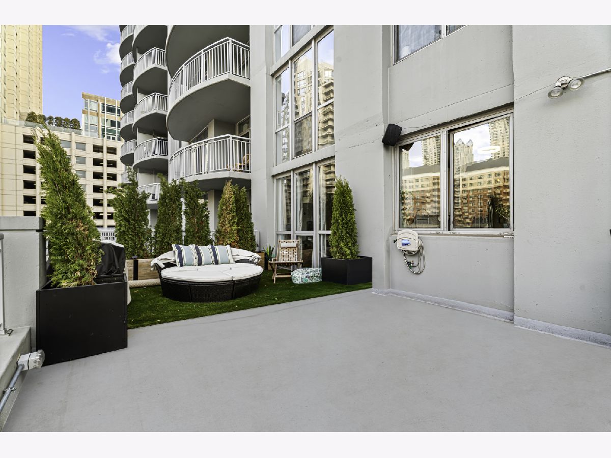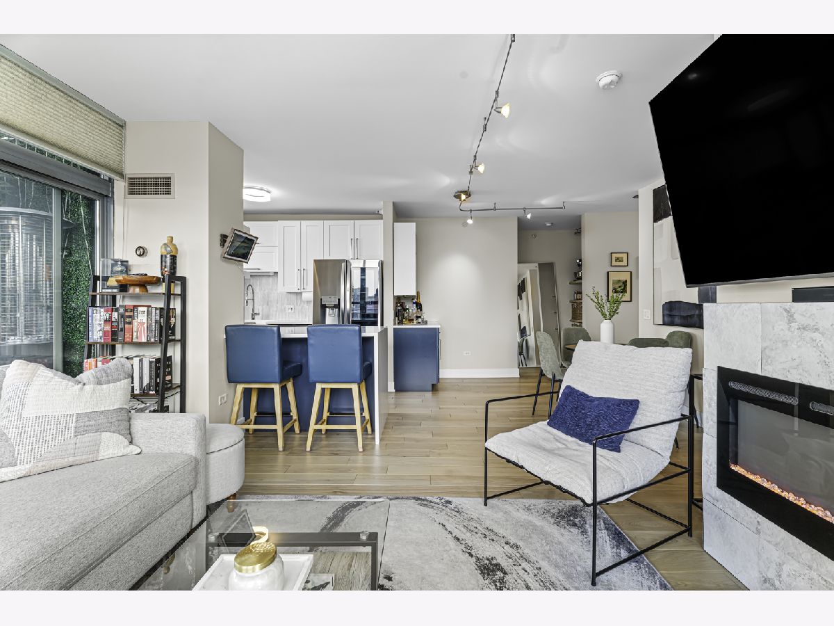 Experience elevated city living in this stunning 2 bedrooms/2-bathroom corner residence in the heart of River North. Floor-to-ceiling windows wrap the home in natural light while delivering dramatic skyline and sunset views. The open-concept living and dining areas flow seamlessly into a sleek, newly renovated kitchen featuring new cabinetry, waterfall stone countertops, a built-in wine fridge and bar, and all new stainless-steel appliances. A true standout is the expansive private terrace, fully upgraded with new electrical, lighting, TV hookup, heater (2024), and outdoor bar, creating an incredible extension of your living space for all seasons. The serene primary bedroom includes a walk-through custom closet and a spa-like bath with heated floors, dual vanities, and a walk-in shower. A split-bedroom layout provides privacy for guests or home office needs. Additional features include in-unit laundry, storage, and a deeded garage parking space. Enjoy full-service living in a well-managed building offering 24-hour door staff, fitness center, sundeck, hospitality suite, party room, dry-clean lockers, and on-site management. Monthly assessments include heat, gas, cable, and internet. All of this only steps from the Riverwalk, Ohio Street Beach, the CTA, premier shopping, dining, and nightlife.